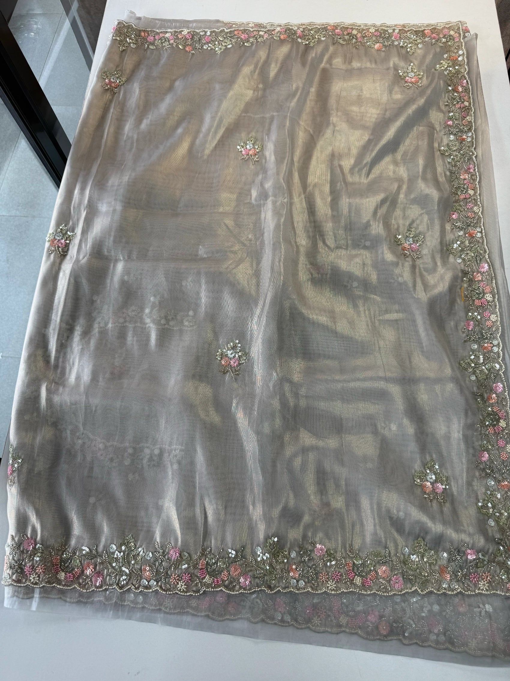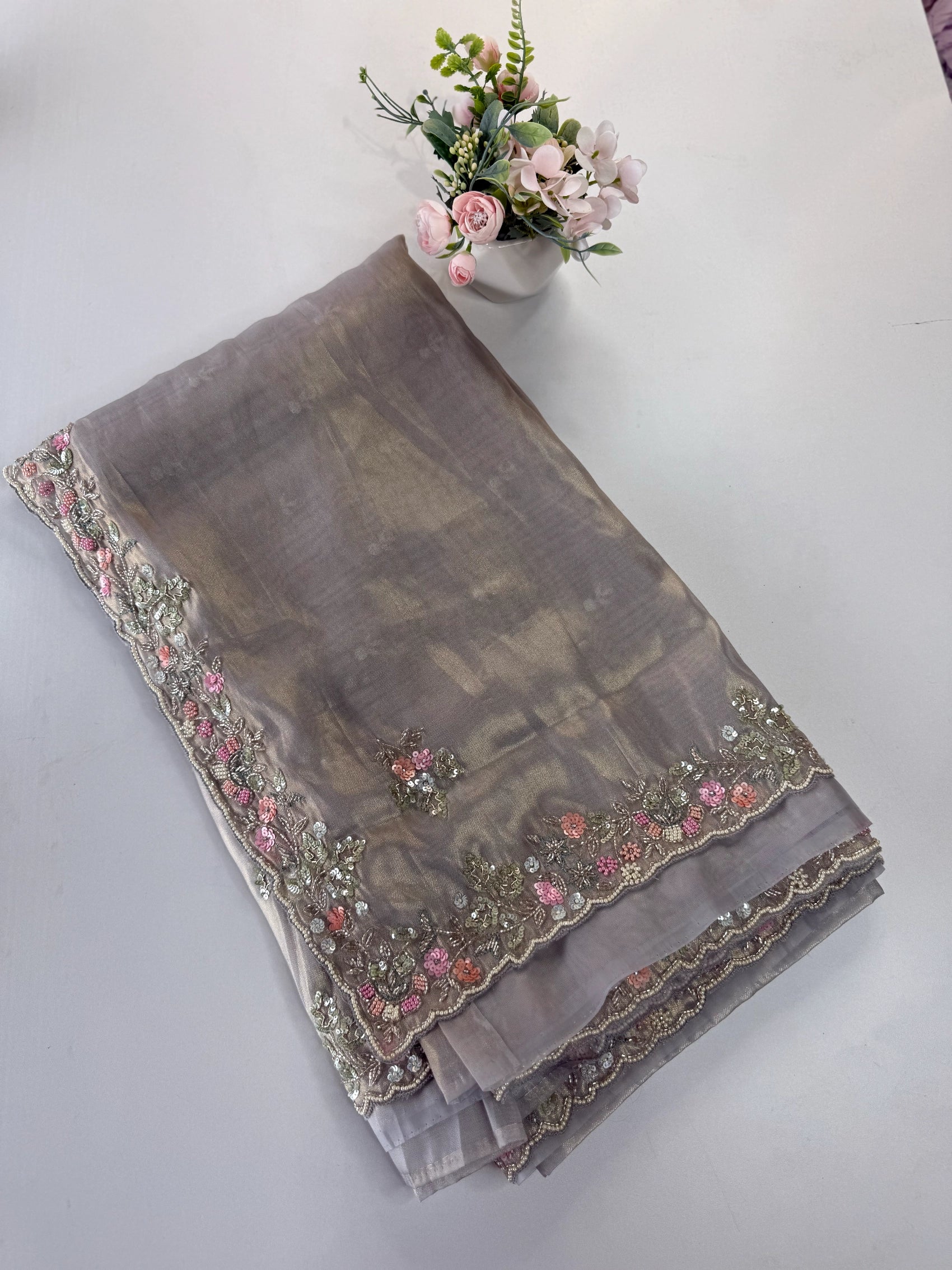 An ethereal tissue organza saree in a serene pastel hue, adorned with a delicately handworked border featuring pearl and sequin embellishments. The elegant craftsmanship continues on the sleeve ends and back side of the blouse, creating a cohesive, luxurious finish. Lightweight and slightly sheer, this saree drapes beautifully—perfect for both day and evening occasions that call for timeless elegance.