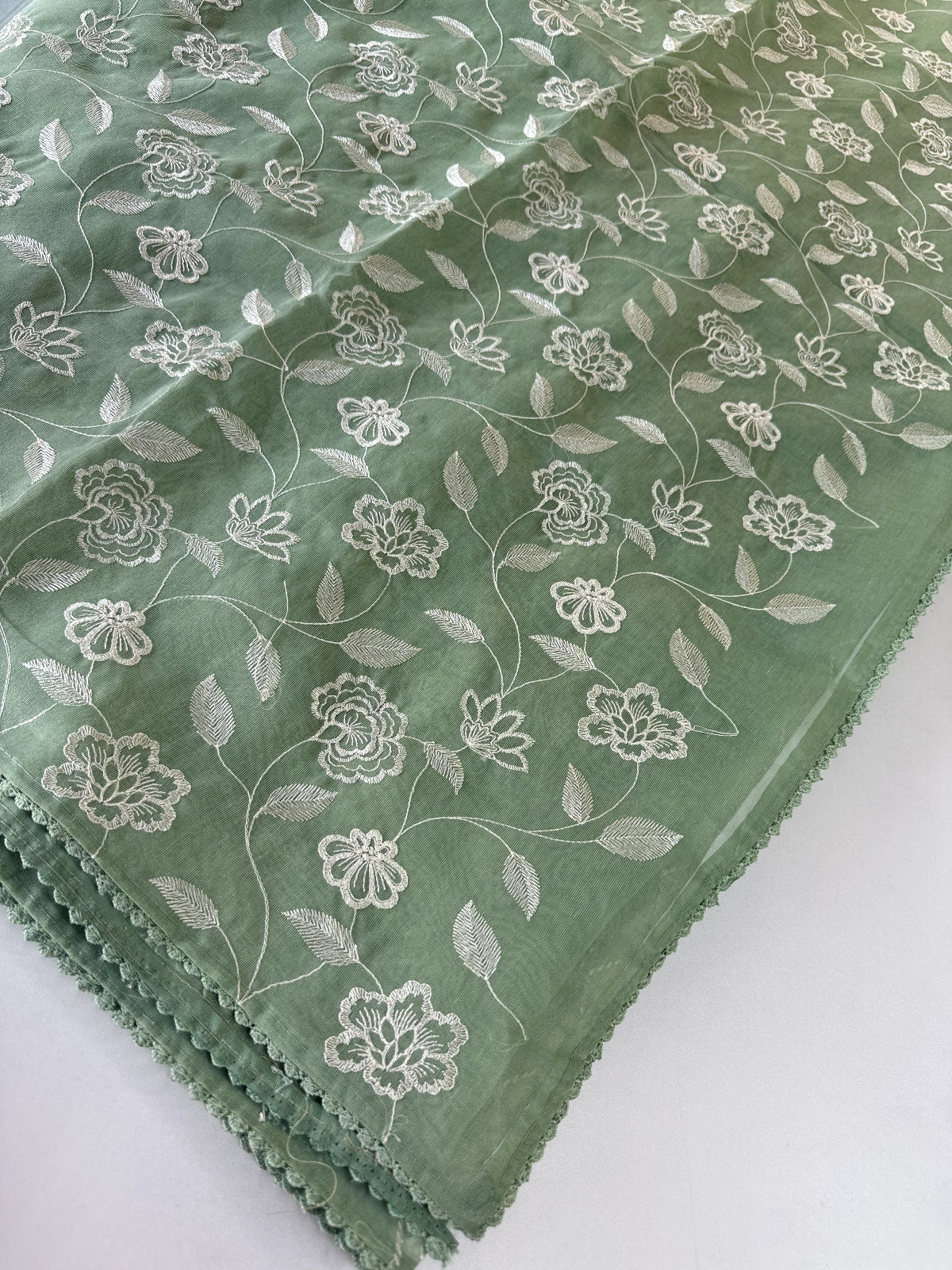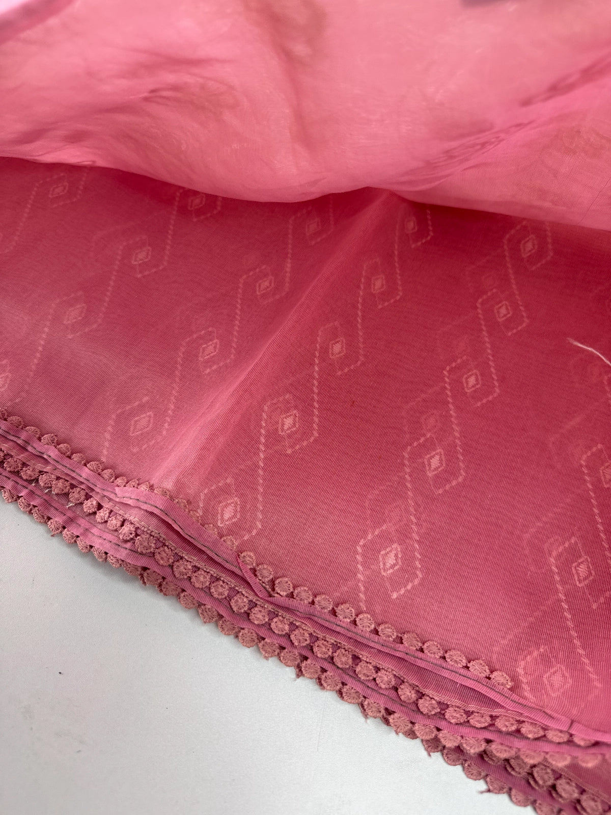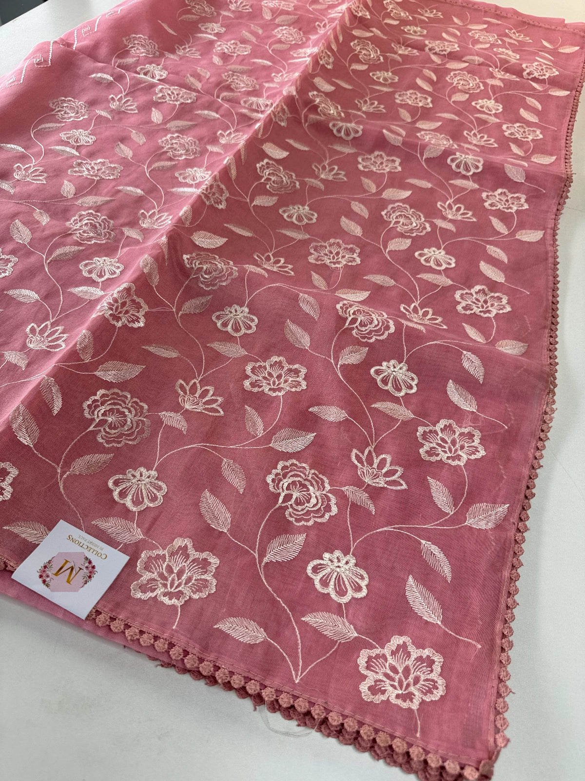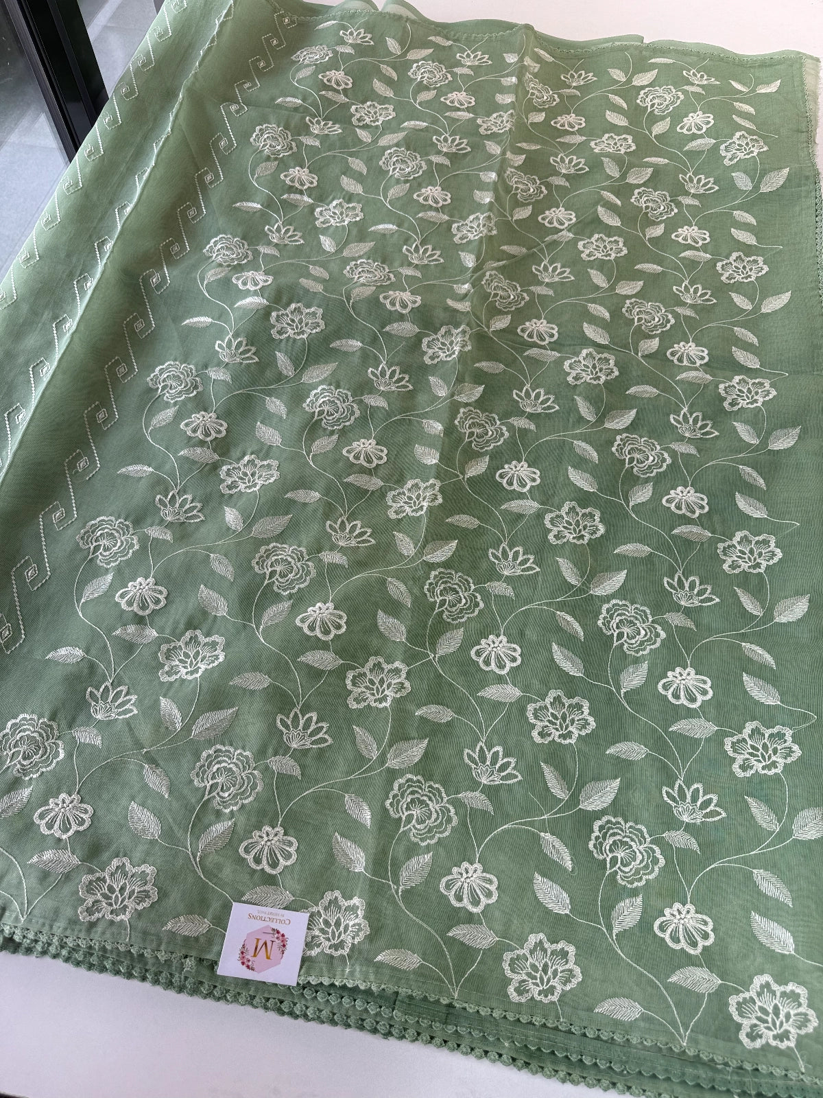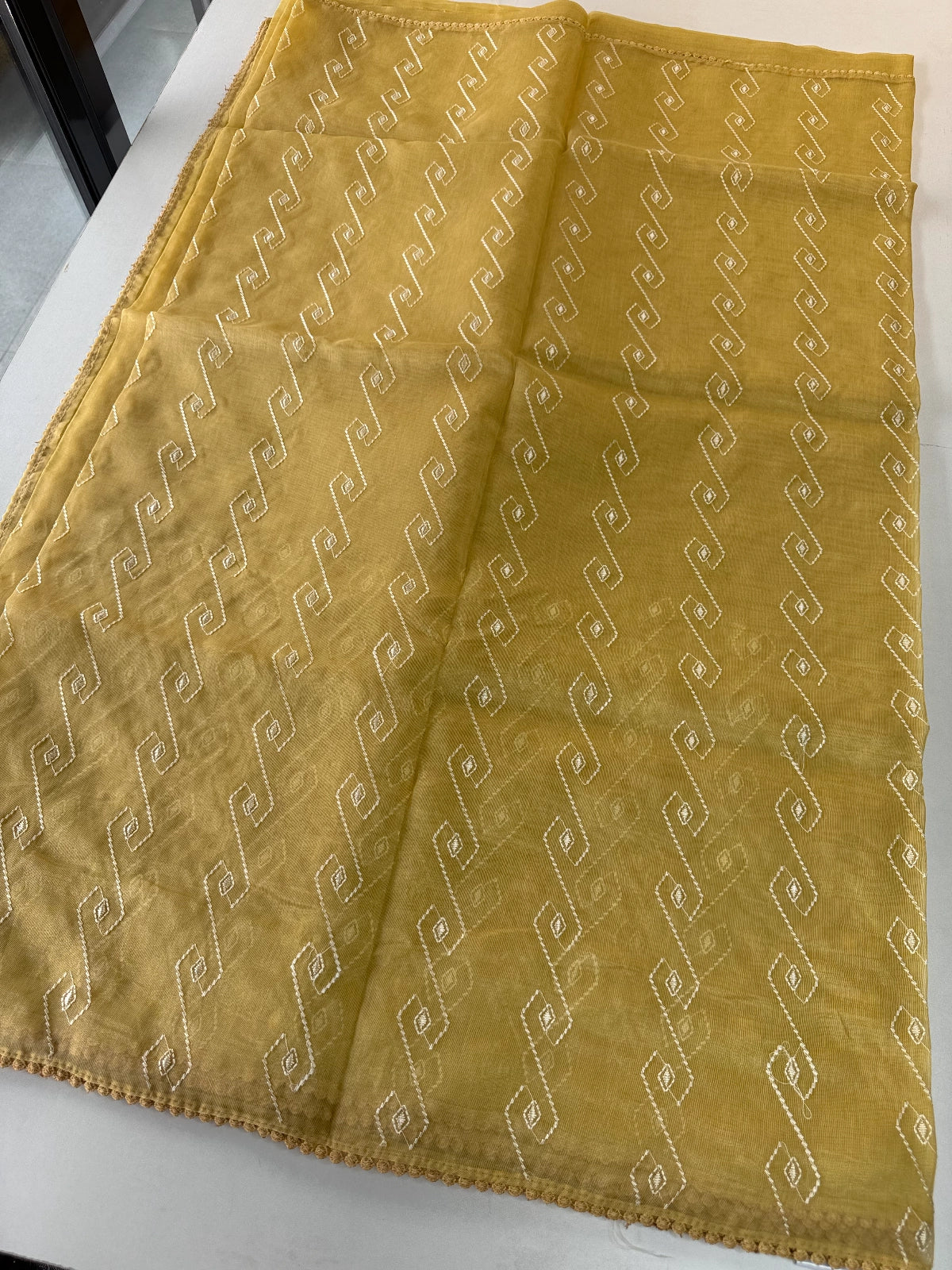 A stunning Tissue Chanderi blend saree adorned with fine thread work throughout, offering a soft shimmer and a graceful festive charm. The delicate lace border adds a refined finish, enhancing the saree’s premium look while keeping it beautifully lightweight and easy to drape.