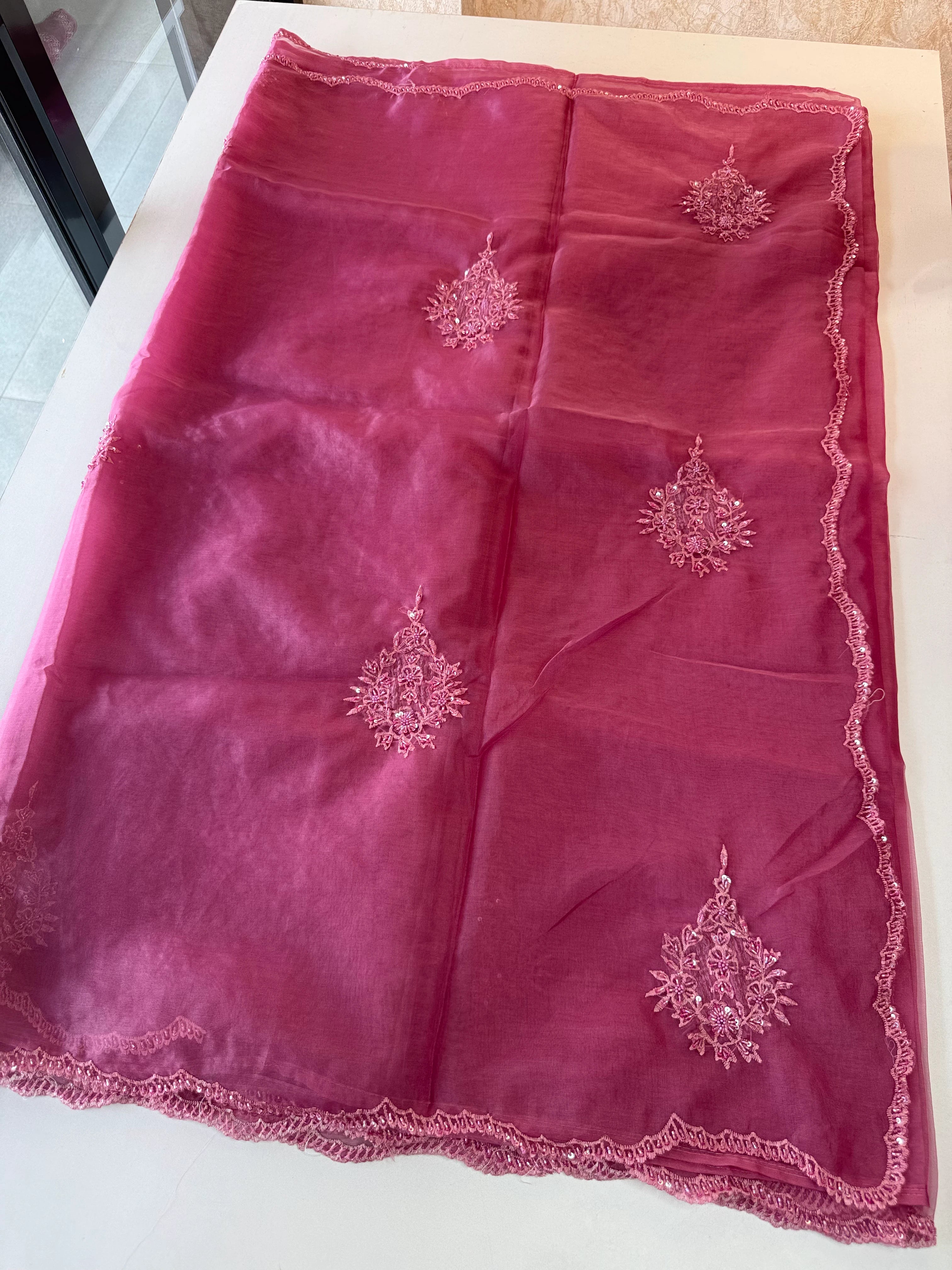 A stunning soft organza saree in a rich, elegant hue featuring a delicately scalloped border adorned with fine threadwork and hand-highlighted cut beads. The saree is enhanced with appliqué floral buttas, each beautifully detailed with thread and sequin embellishments, adding a subtle sparkle to its sheer, graceful drape.