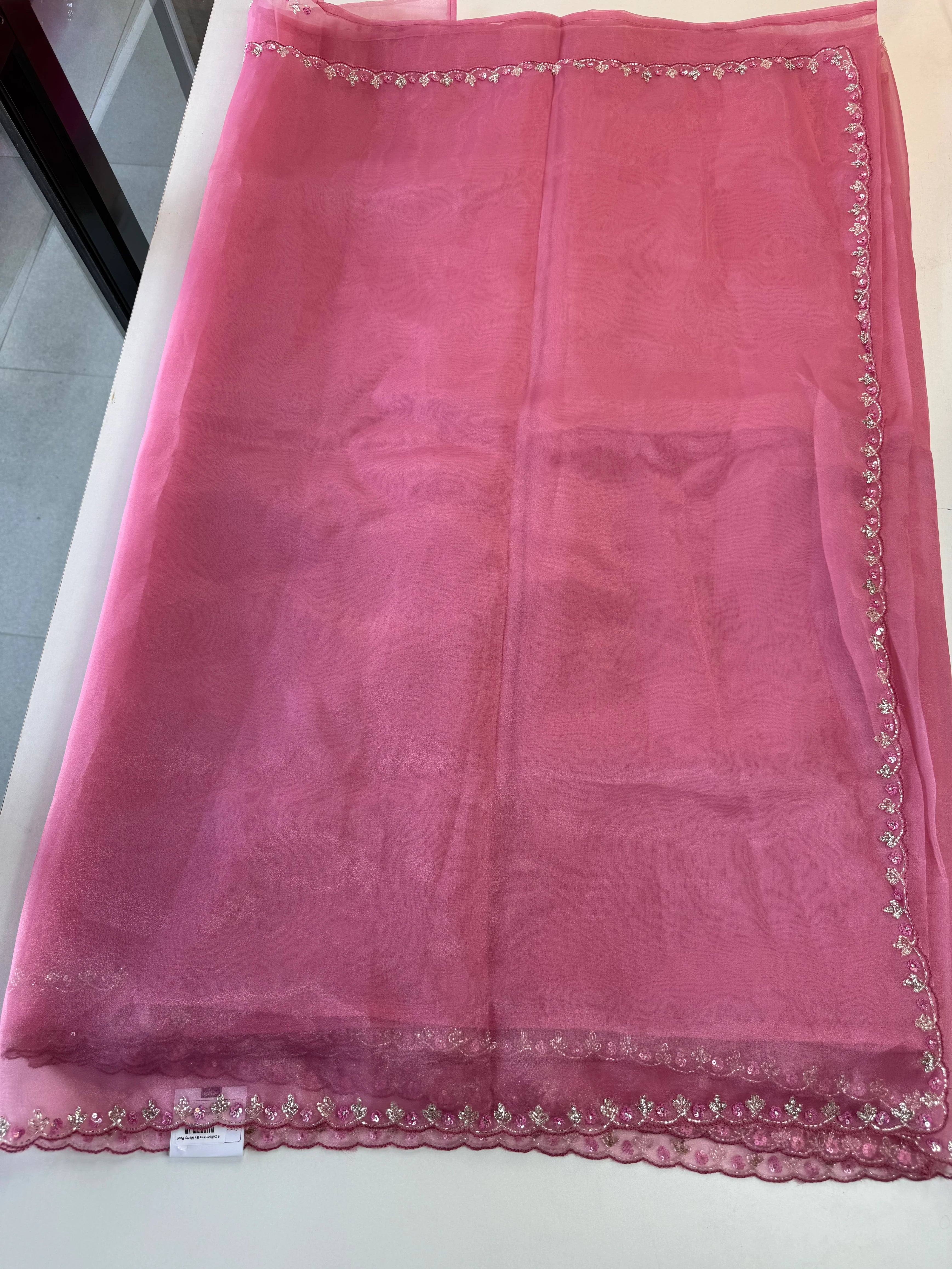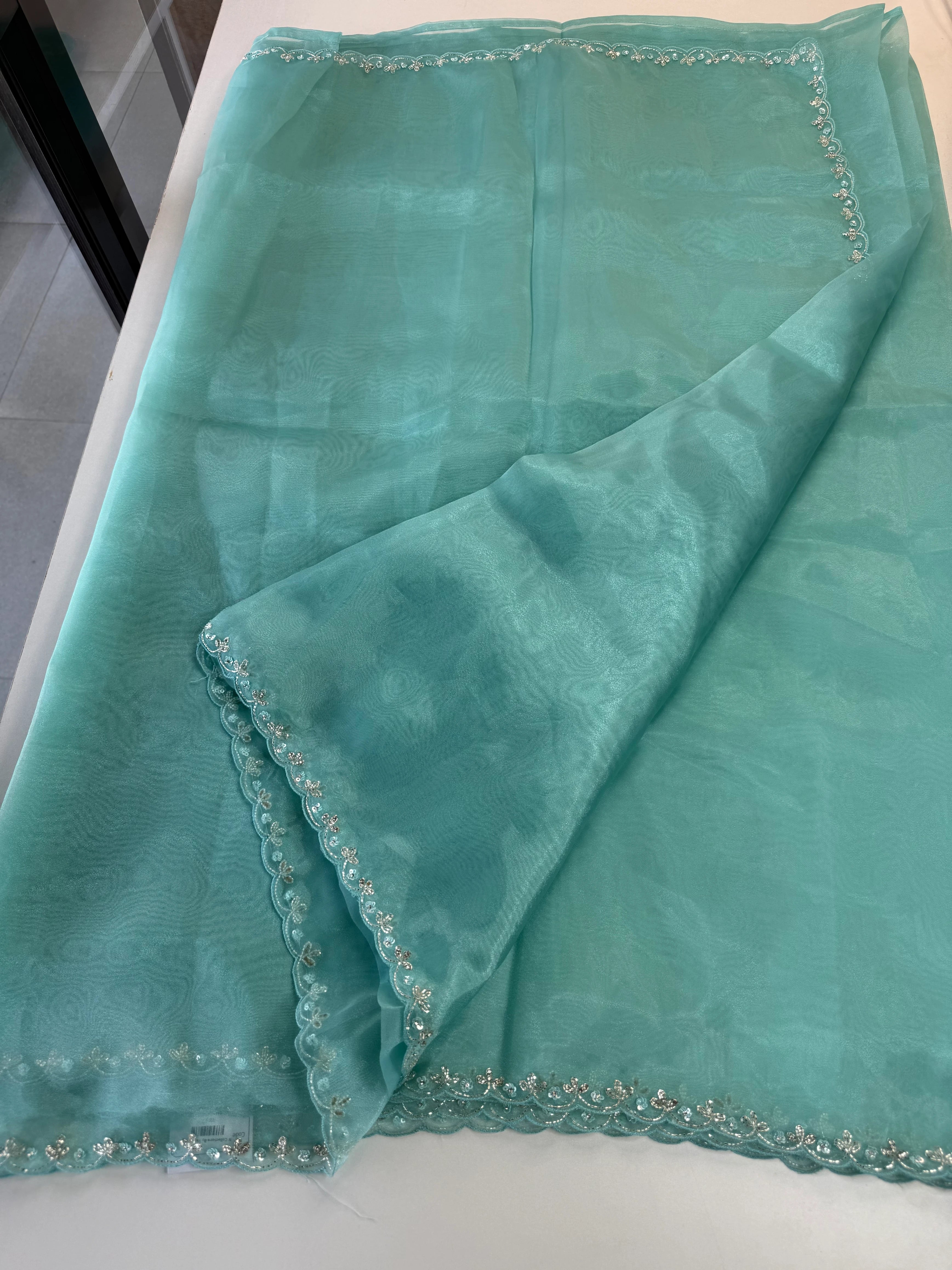 Elegant glass organza saree highlighted with minimal handwork on the border, giving it a refined and graceful look. The saree comes with a running blouse piece, featuring subtle handwork on the sleeve ends for a coordinated finish.