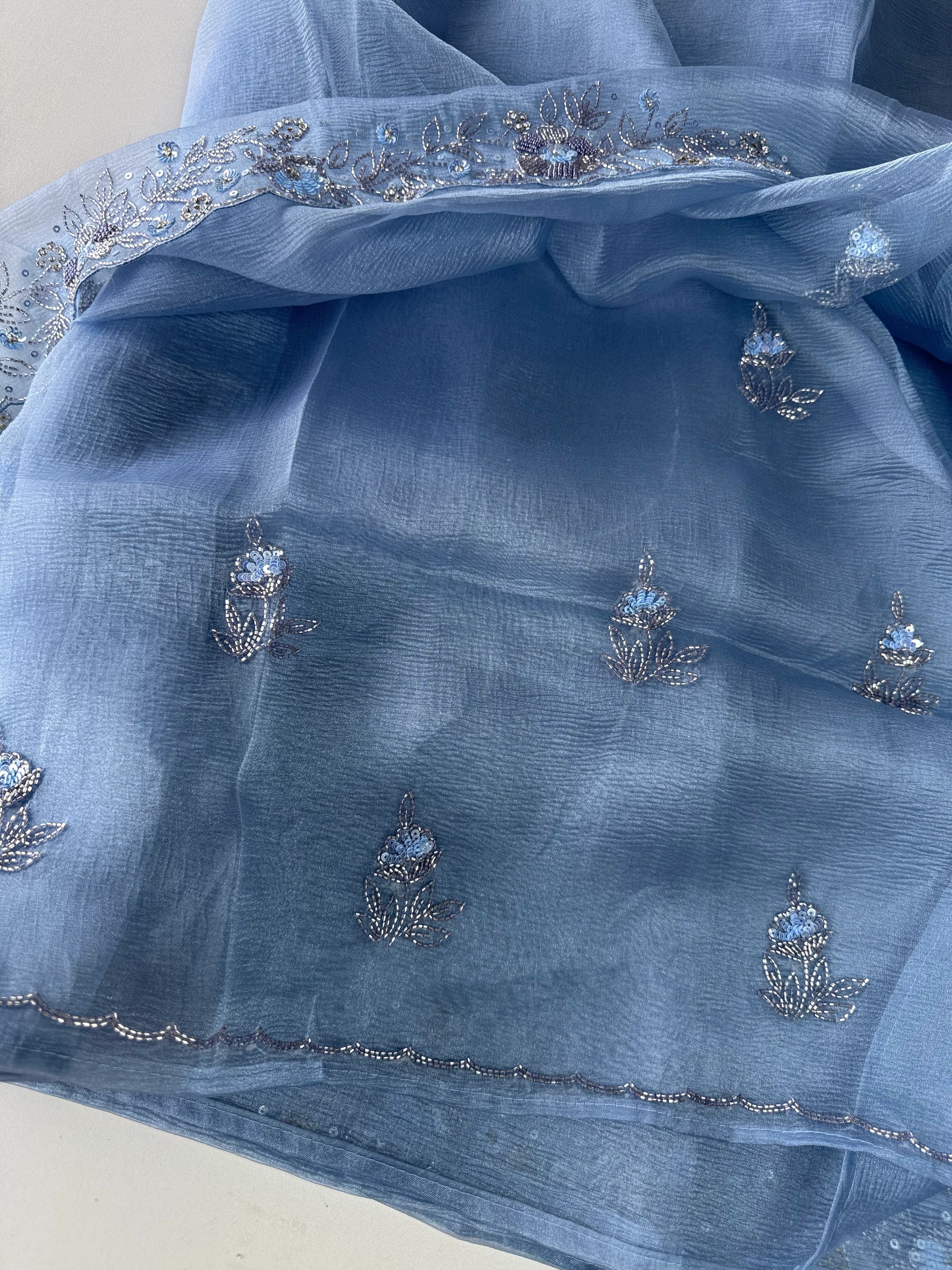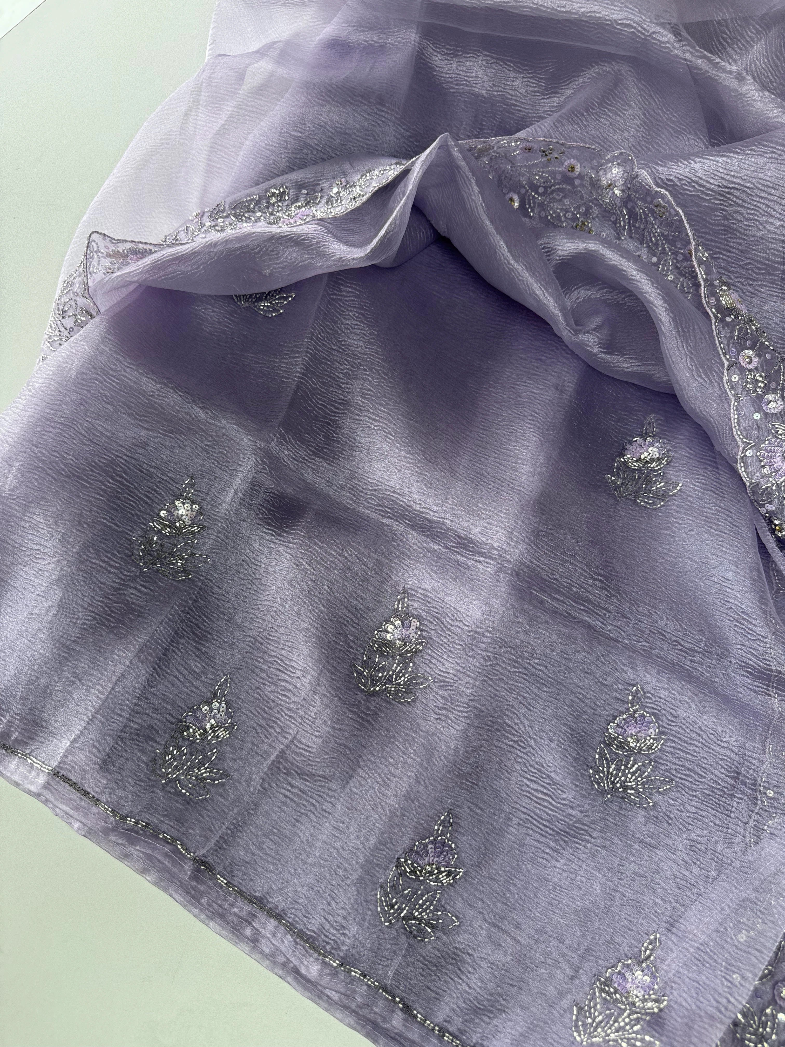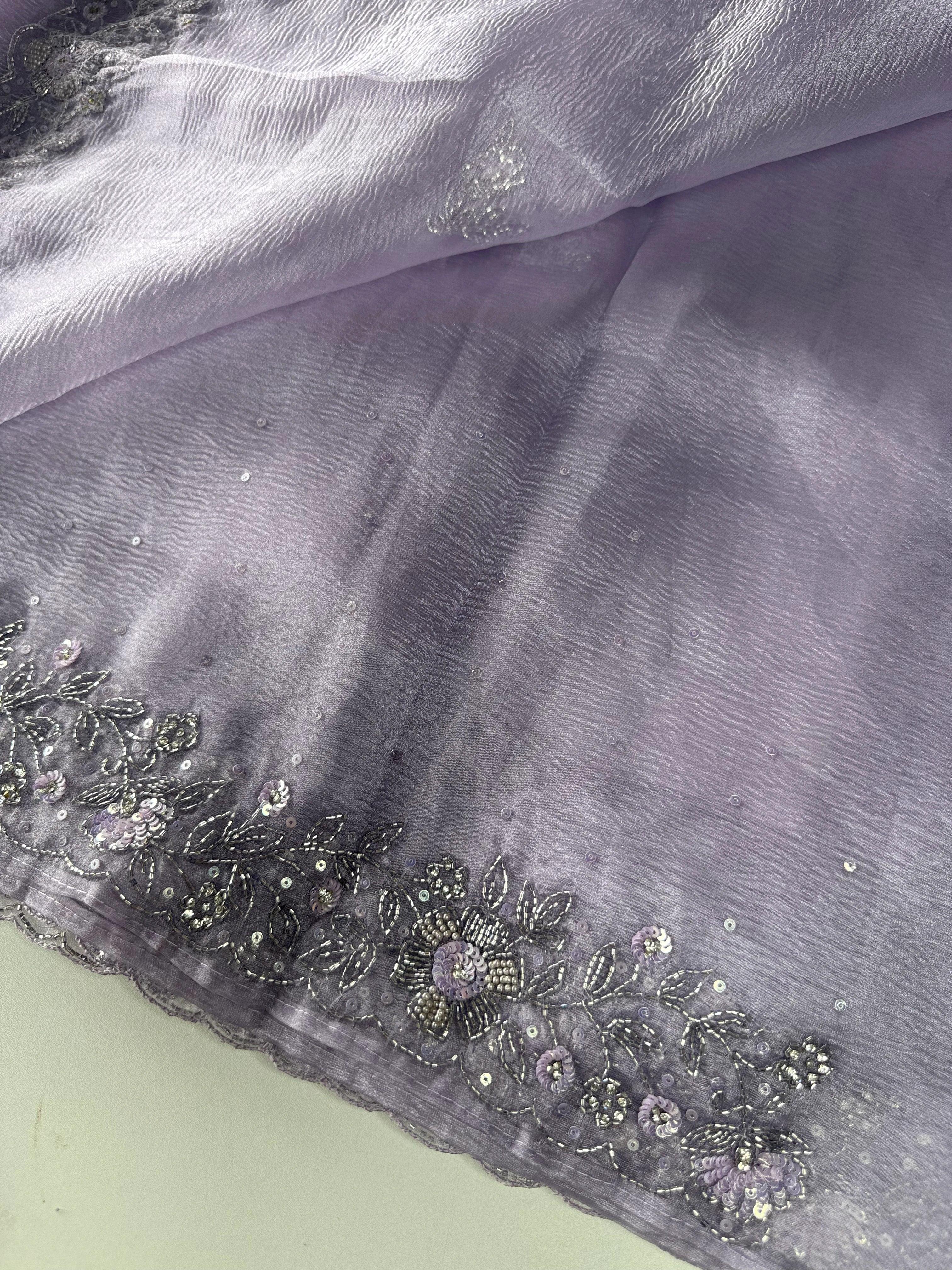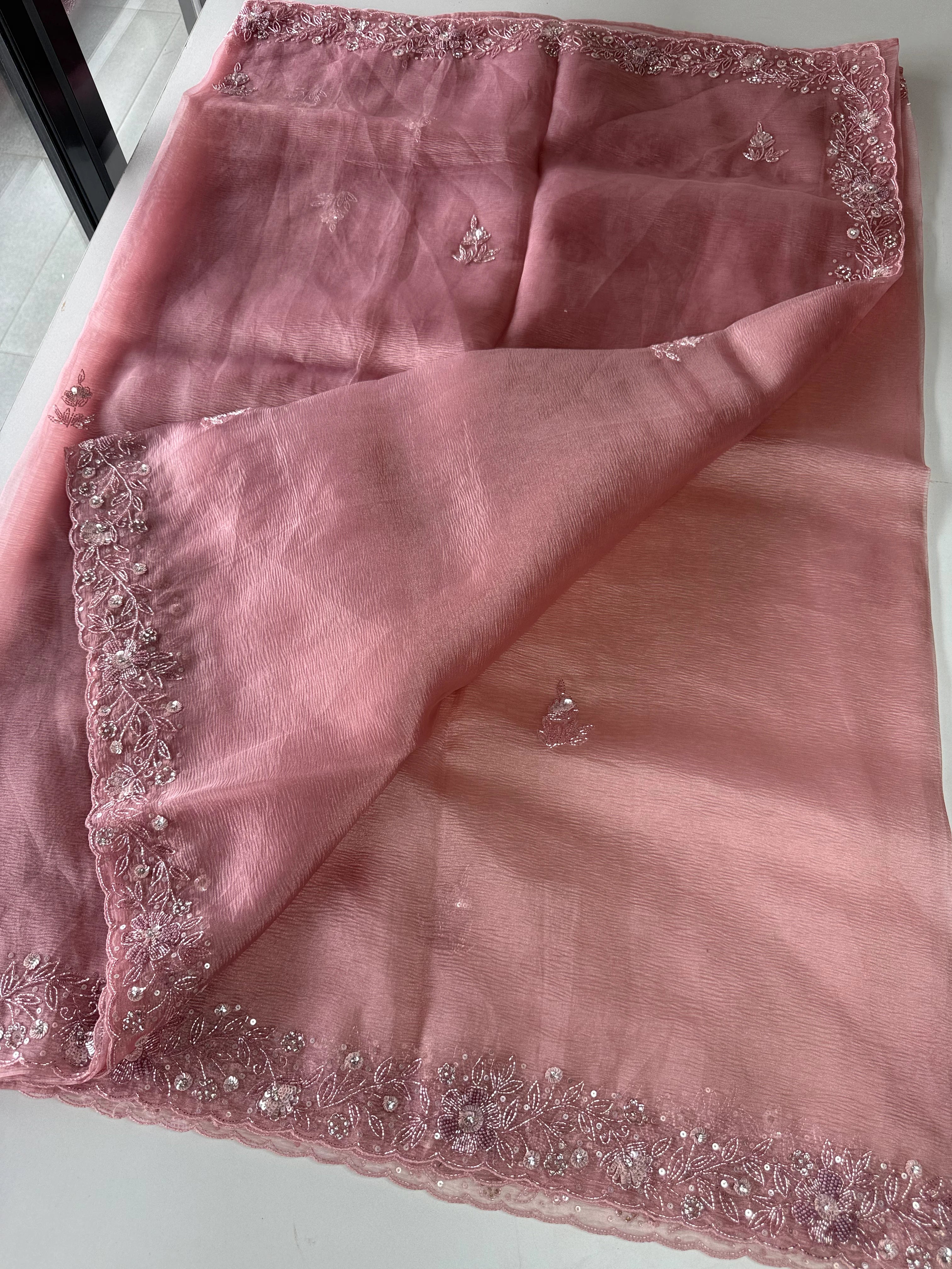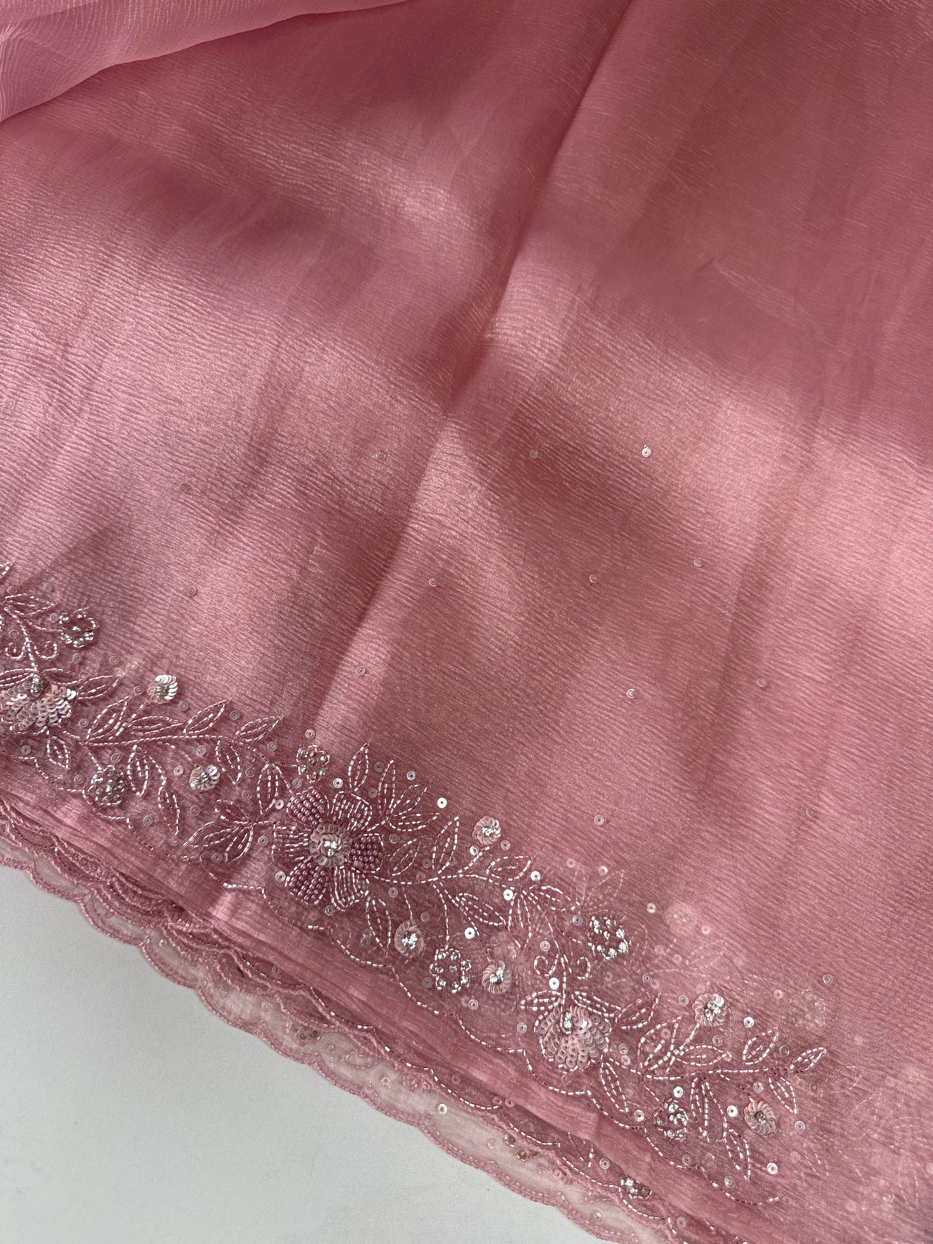 Crushed Tissue Saree – A stunning saree in rich crushed tissue fabric, highlighted with a beautifully hand-worked border. The blouse piece comes with intricate handwork on the sleeve ends and back neckline, adding a touch of elegance and exclusivity. A graceful choice for parties and special occasions.