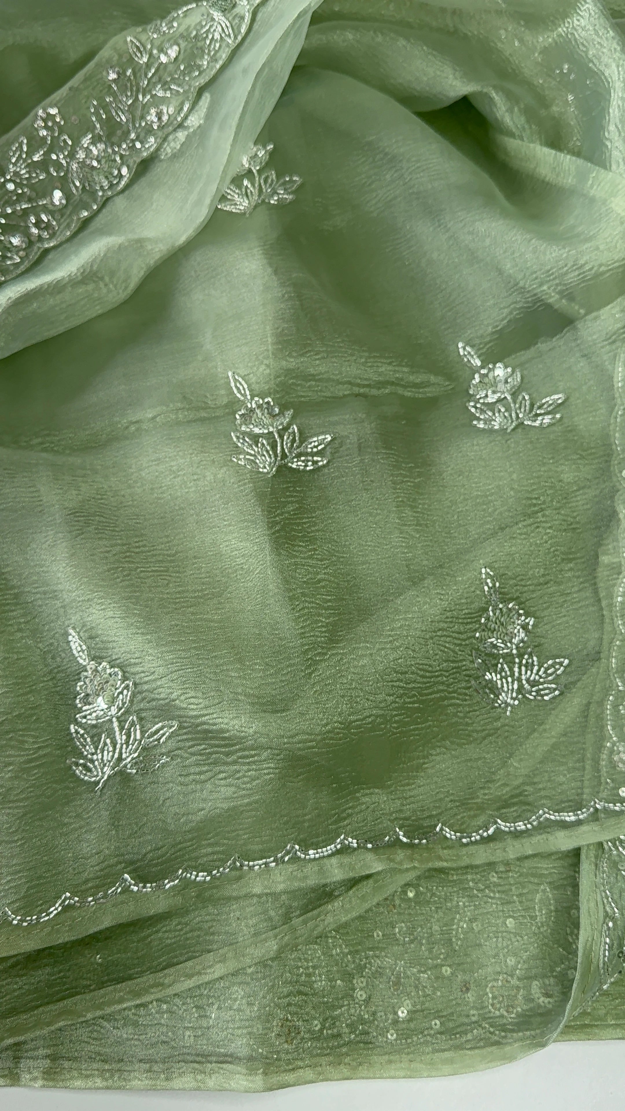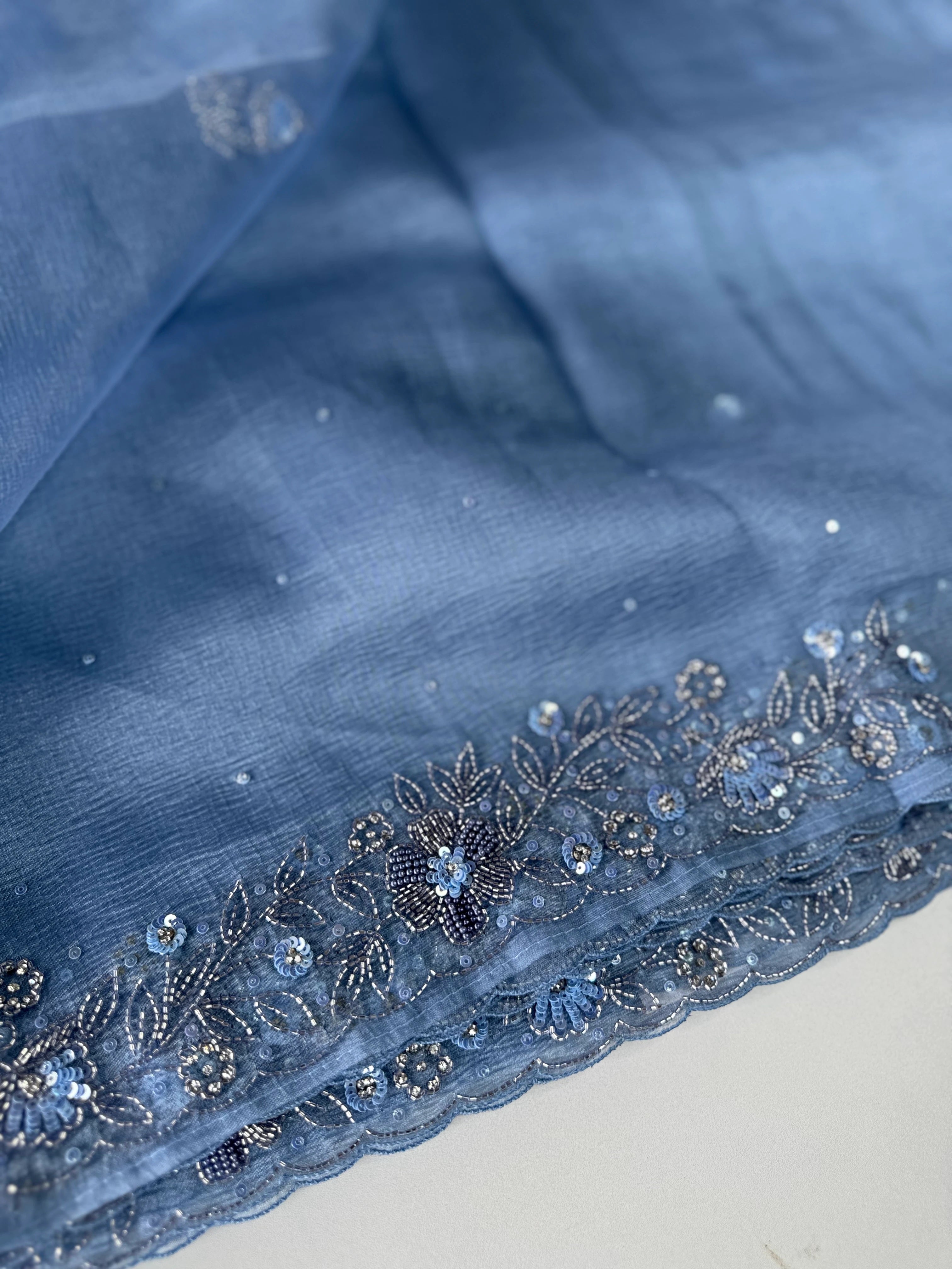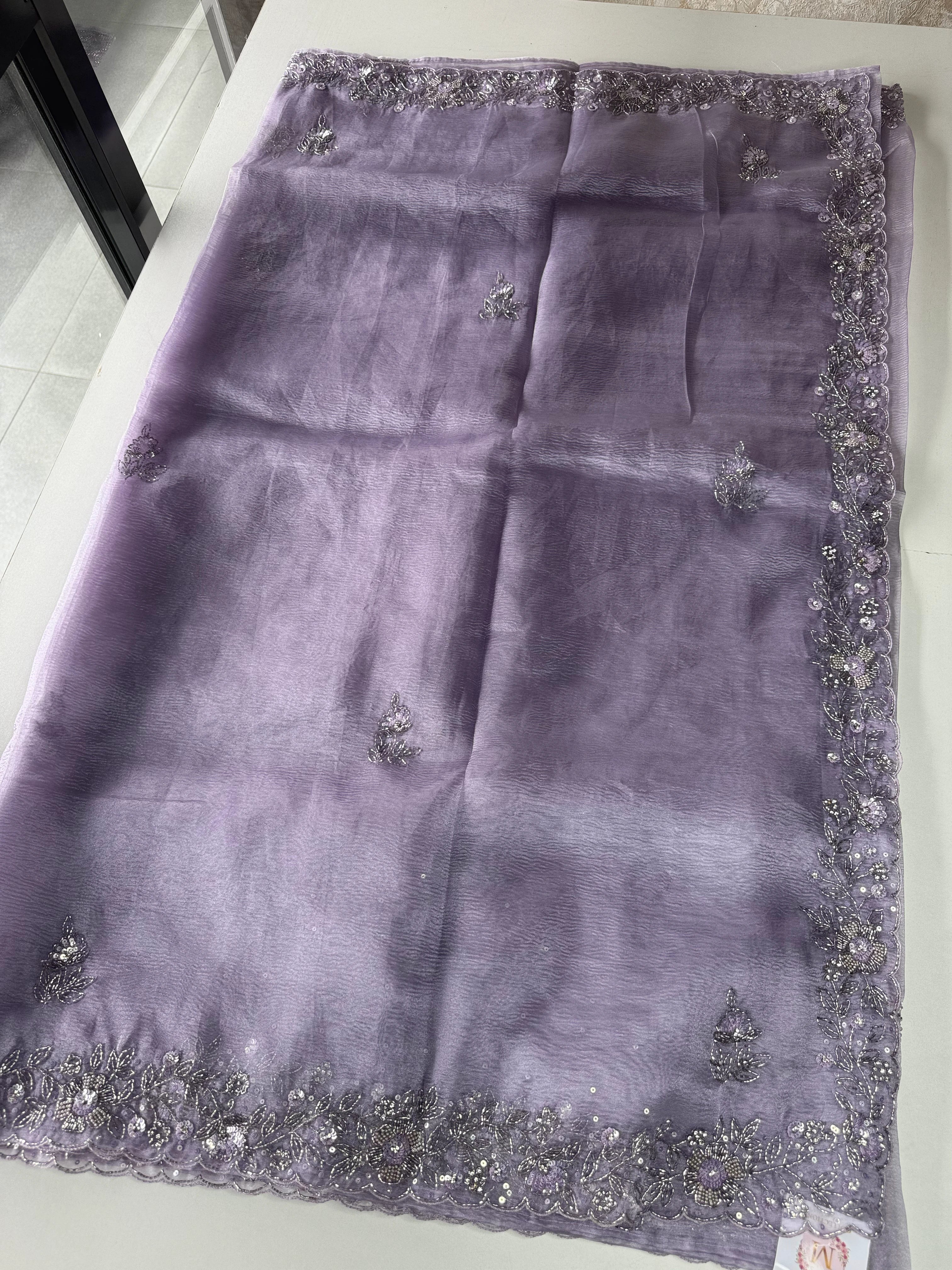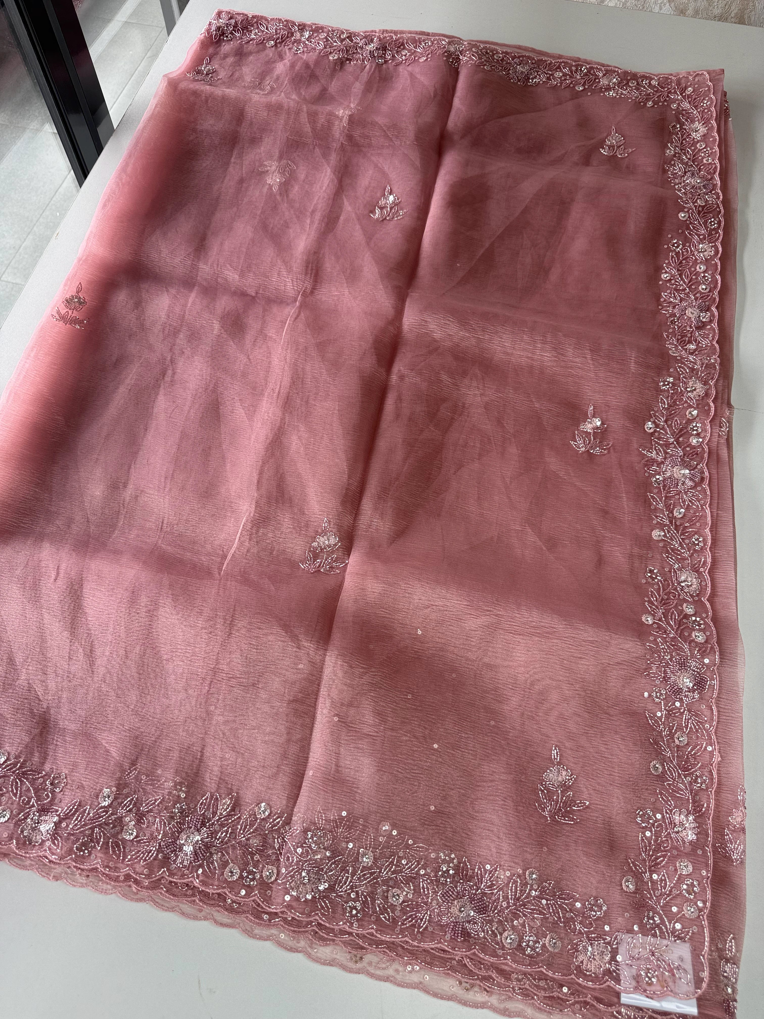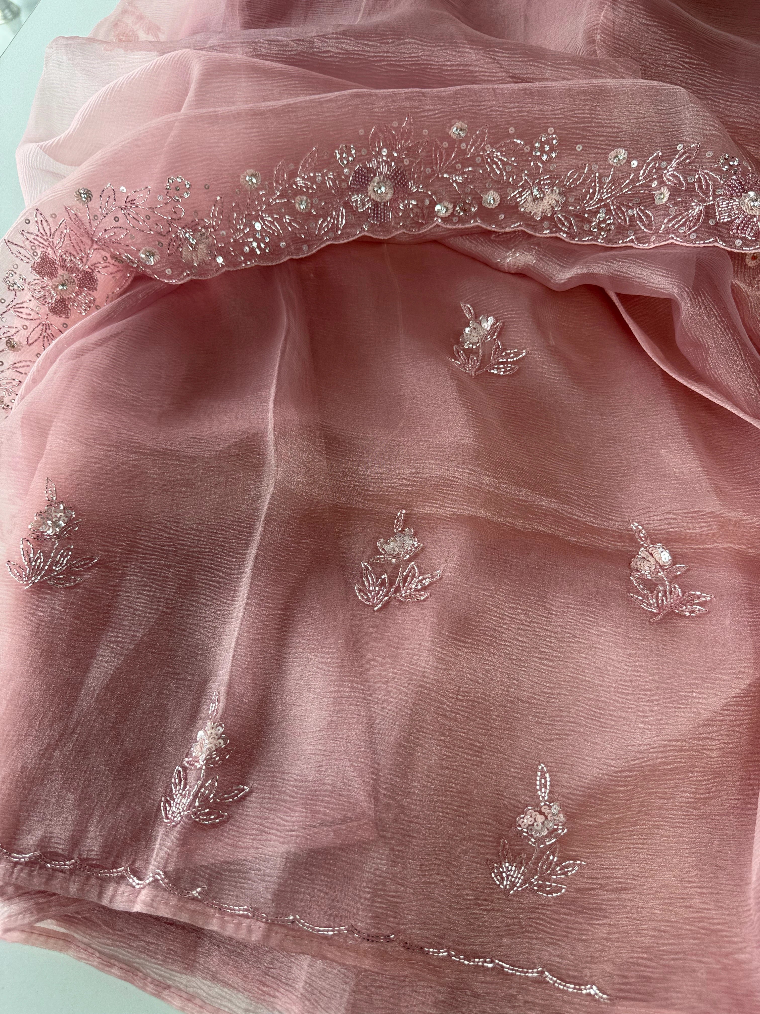 Crushed Tissue Saree – A stunning saree in rich crushed tissue fabric, highlighted with a beautifully hand-worked border. The blouse piece comes with intricate handwork on the sleeve ends and back neckline, adding a touch of elegance and exclusivity. A graceful choice for parties and special occasions.