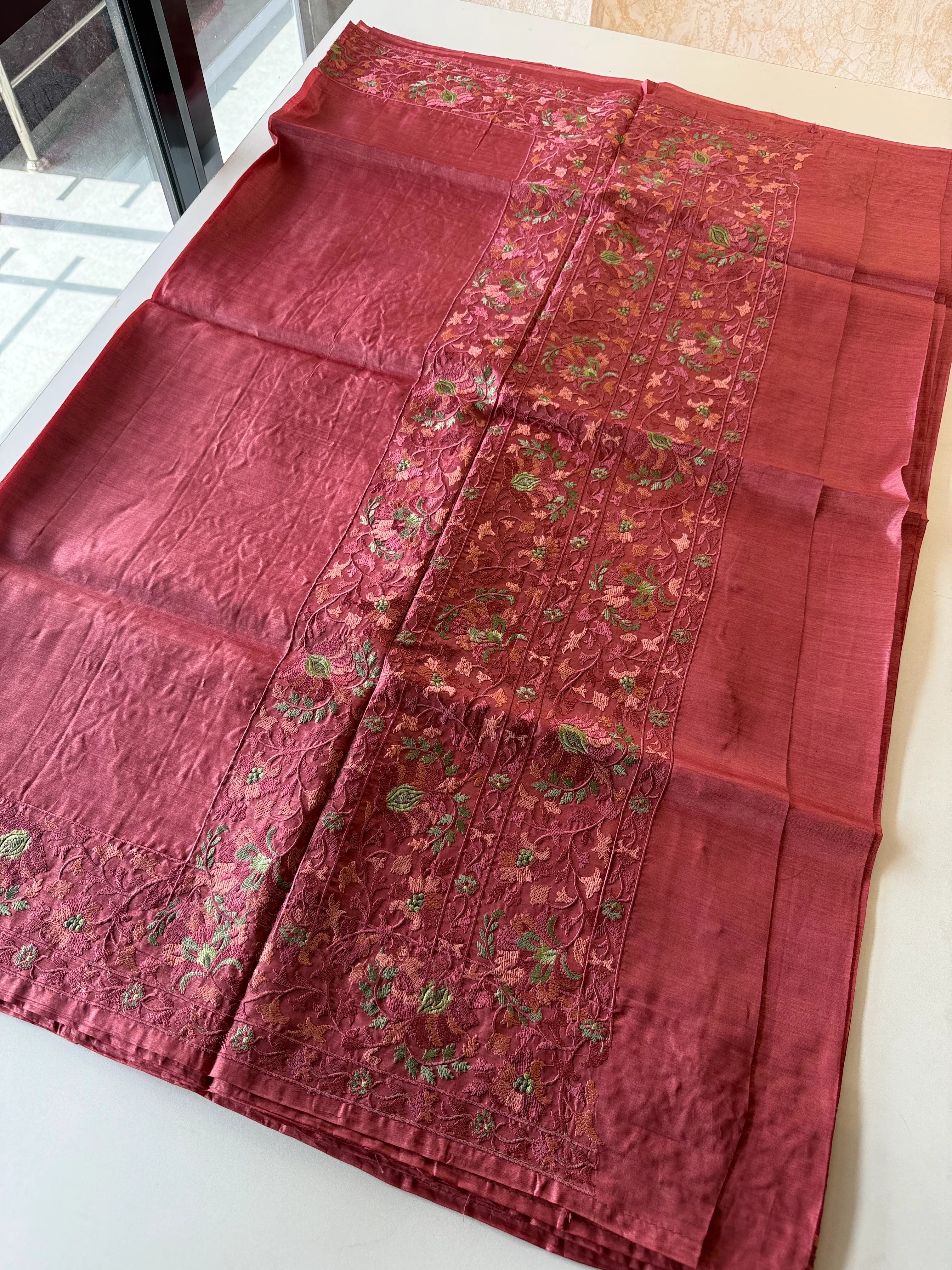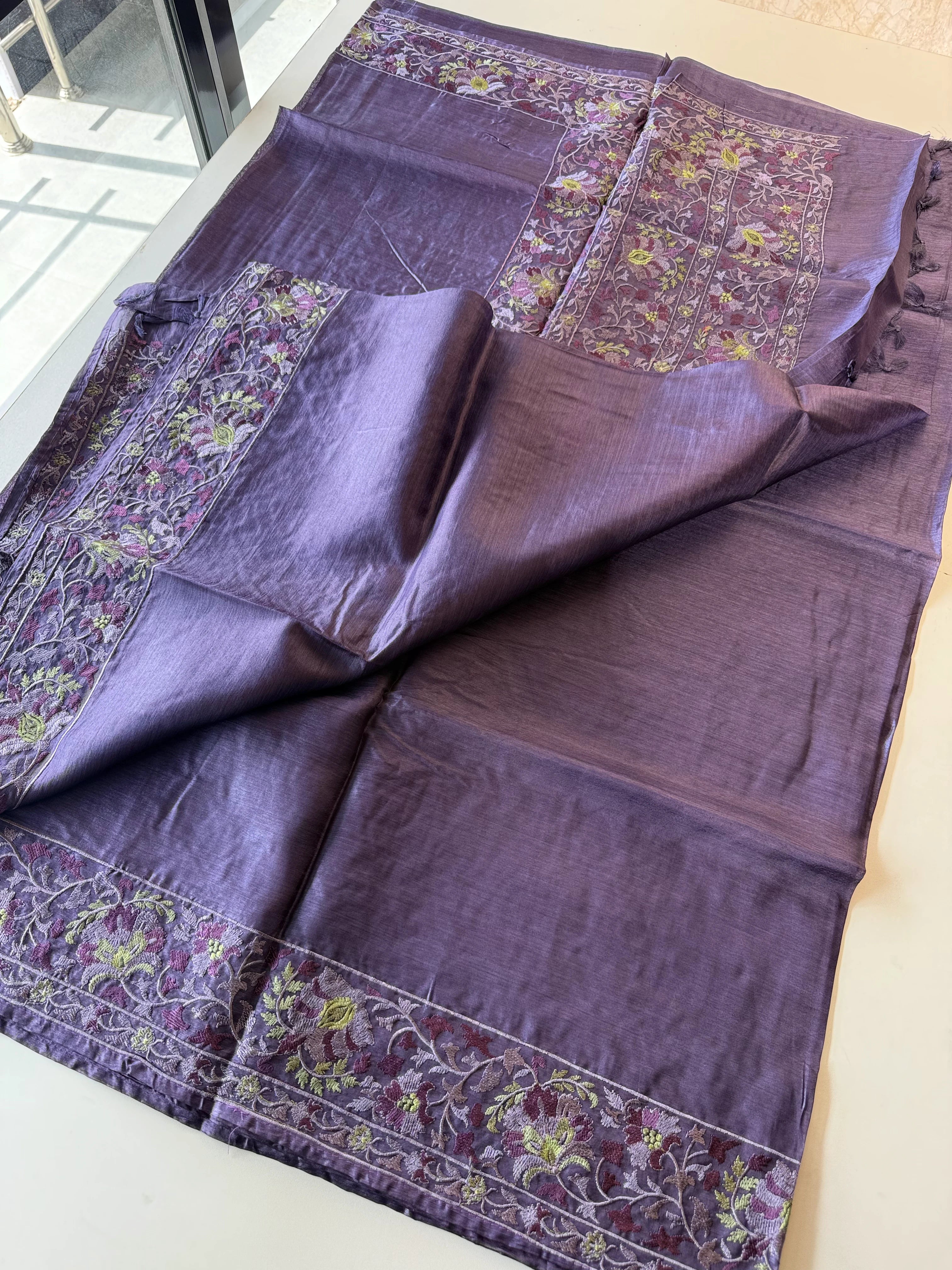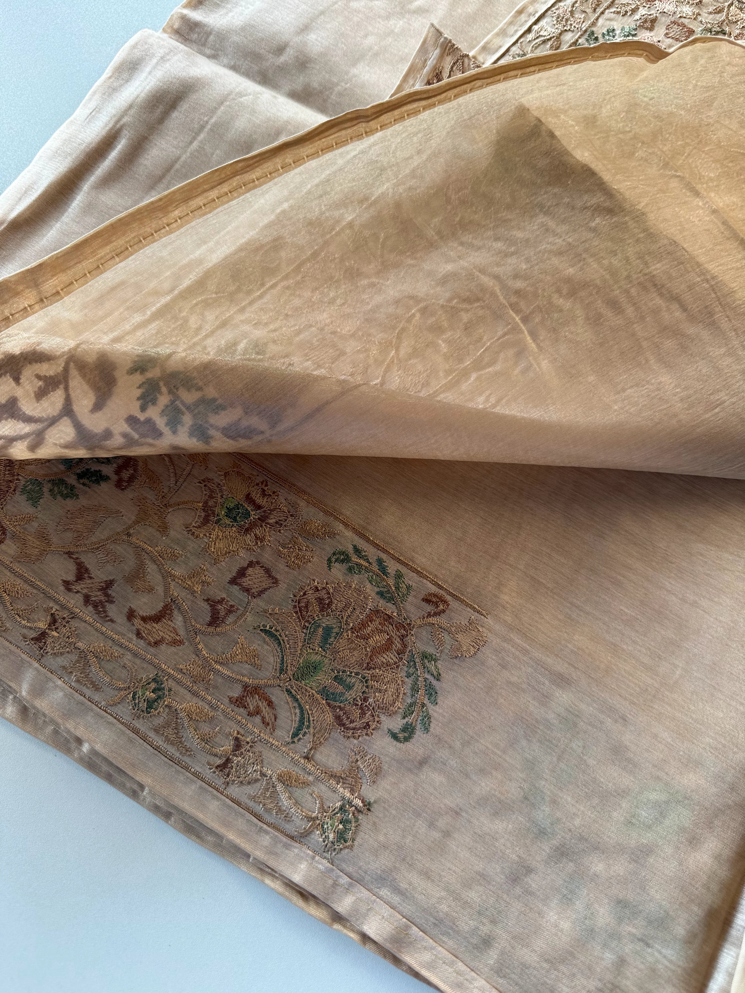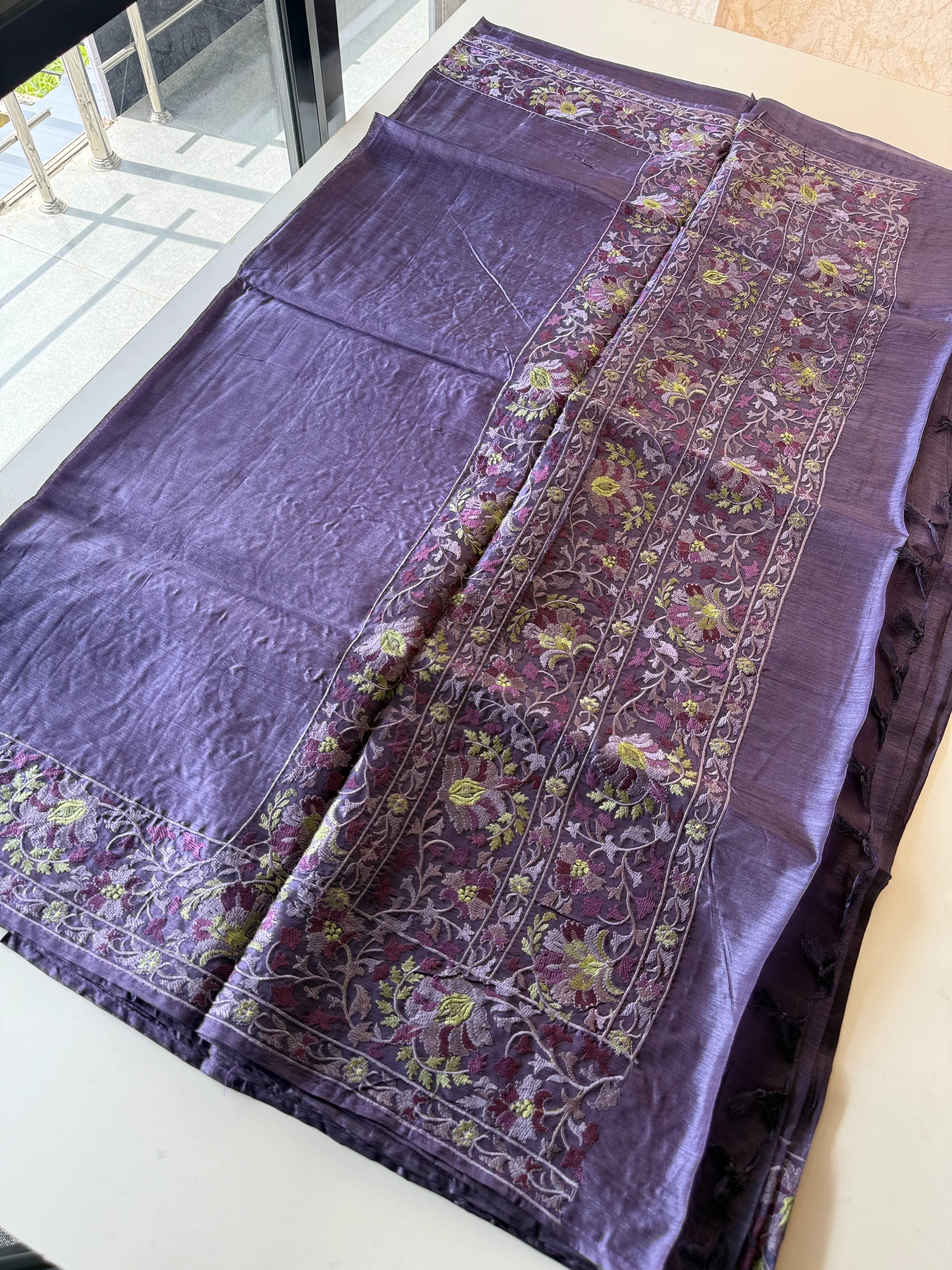Semi-tussar saree featuring intricate threadwork on the pallu and borders, paired with a matching running blouse piece with tailored sleeve and seam accents. Crisp, semi-structured drape, non-transparent — an elegant choice for refined occasions.