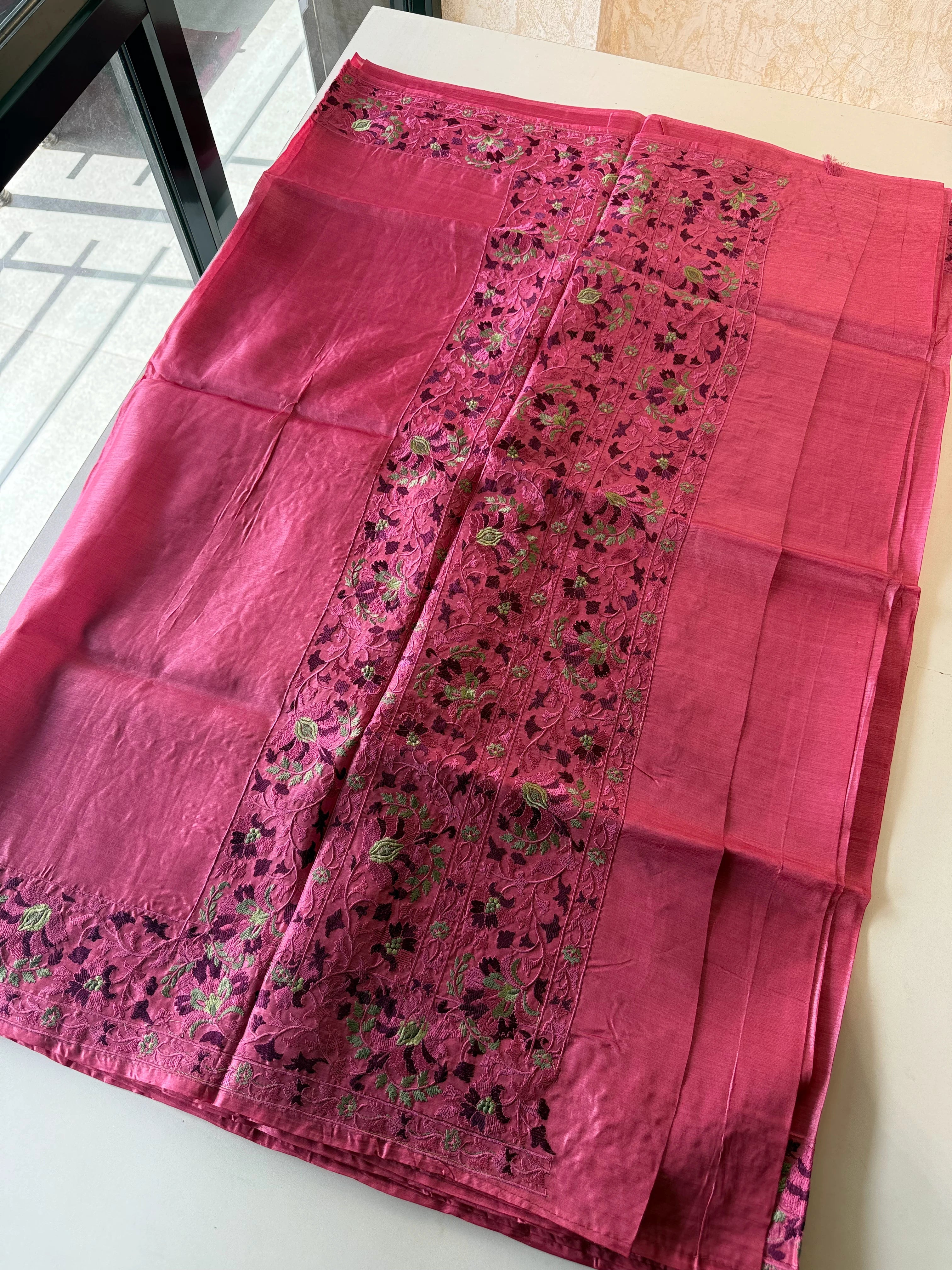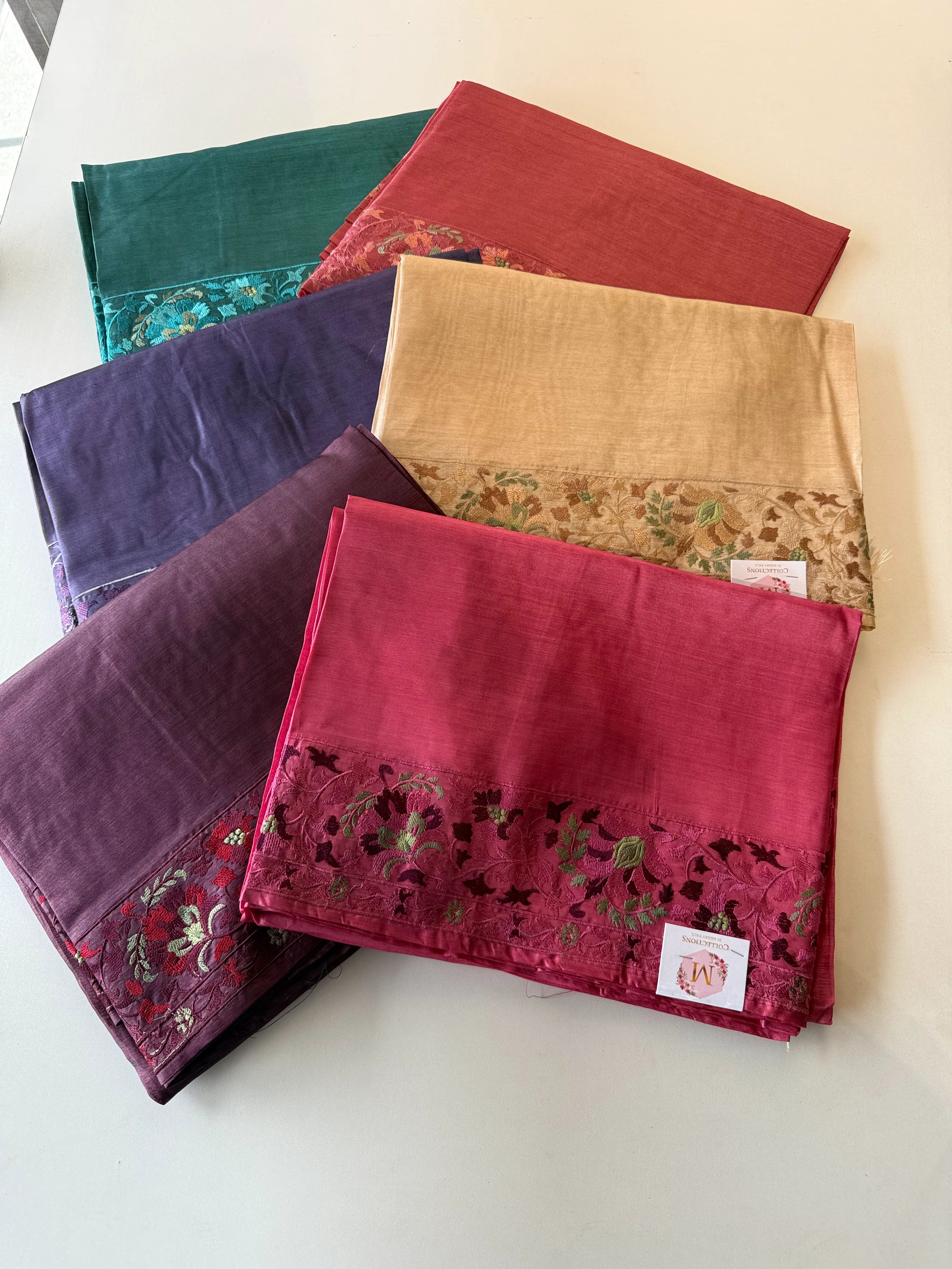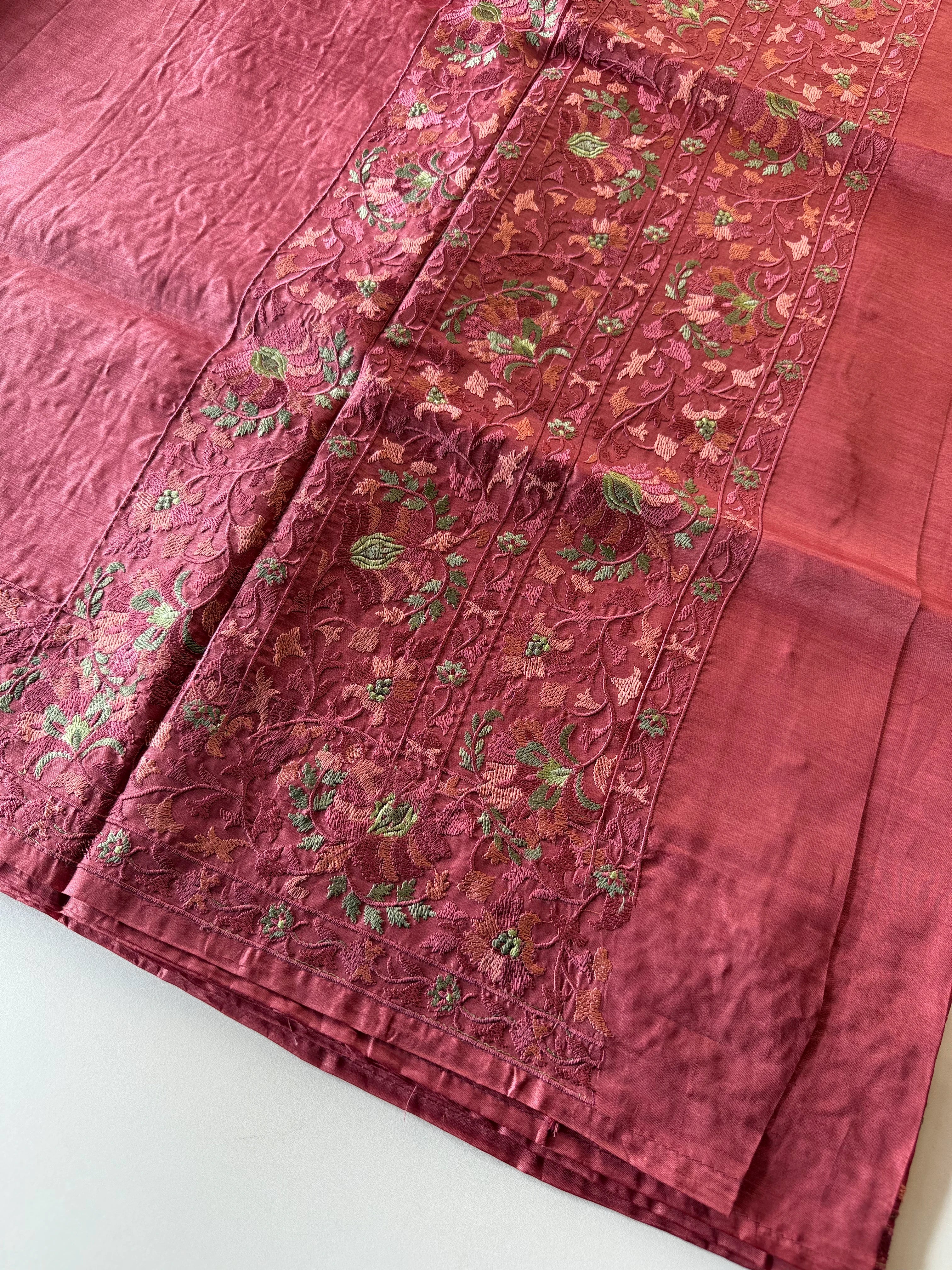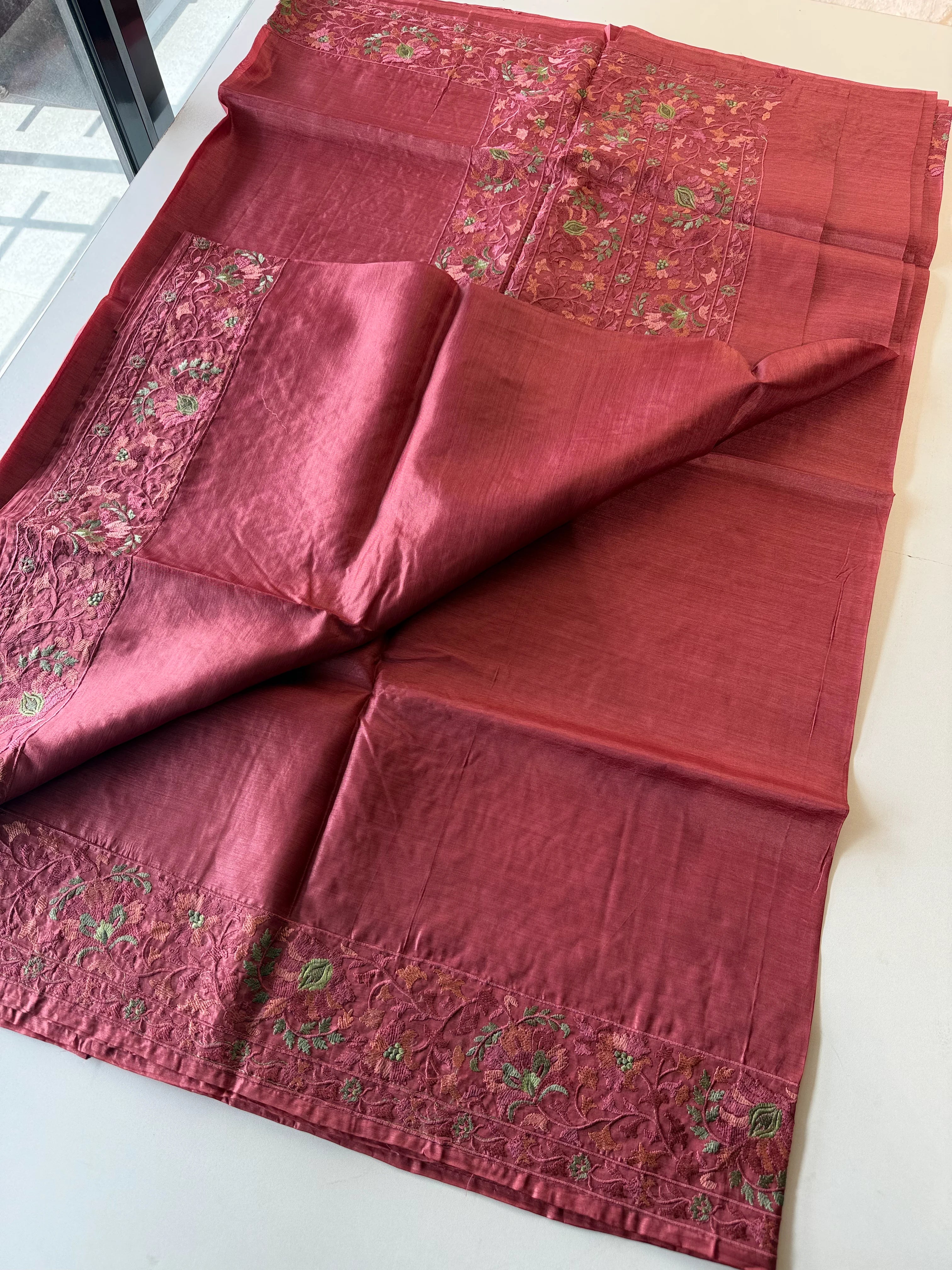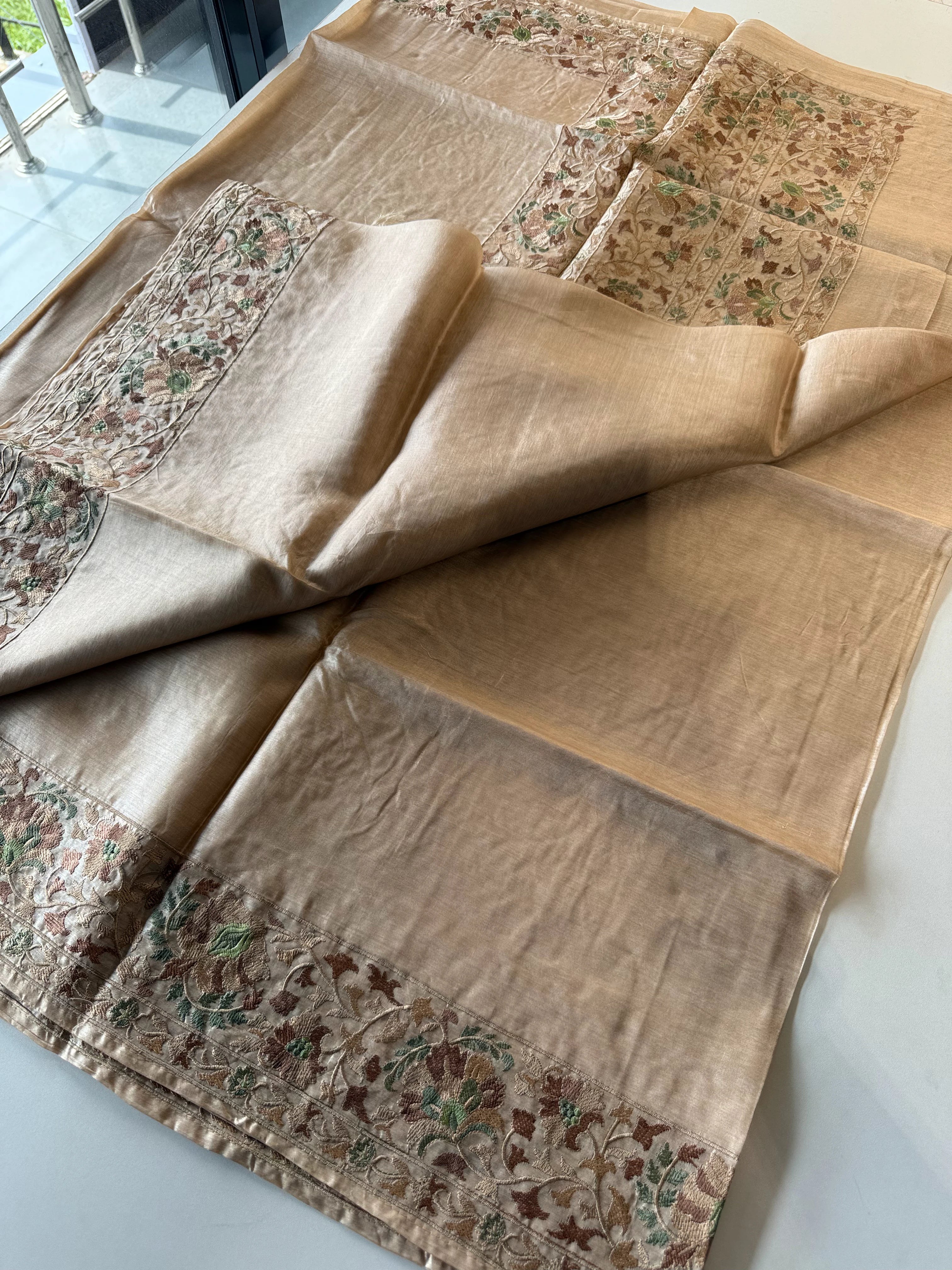 Semi-tussar saree featuring intricate threadwork on the pallu and borders, paired with a matching running blouse piece with tailored sleeve and seam accents. Crisp, semi-structured drape, non-transparent — an elegant choice for refined occasions.