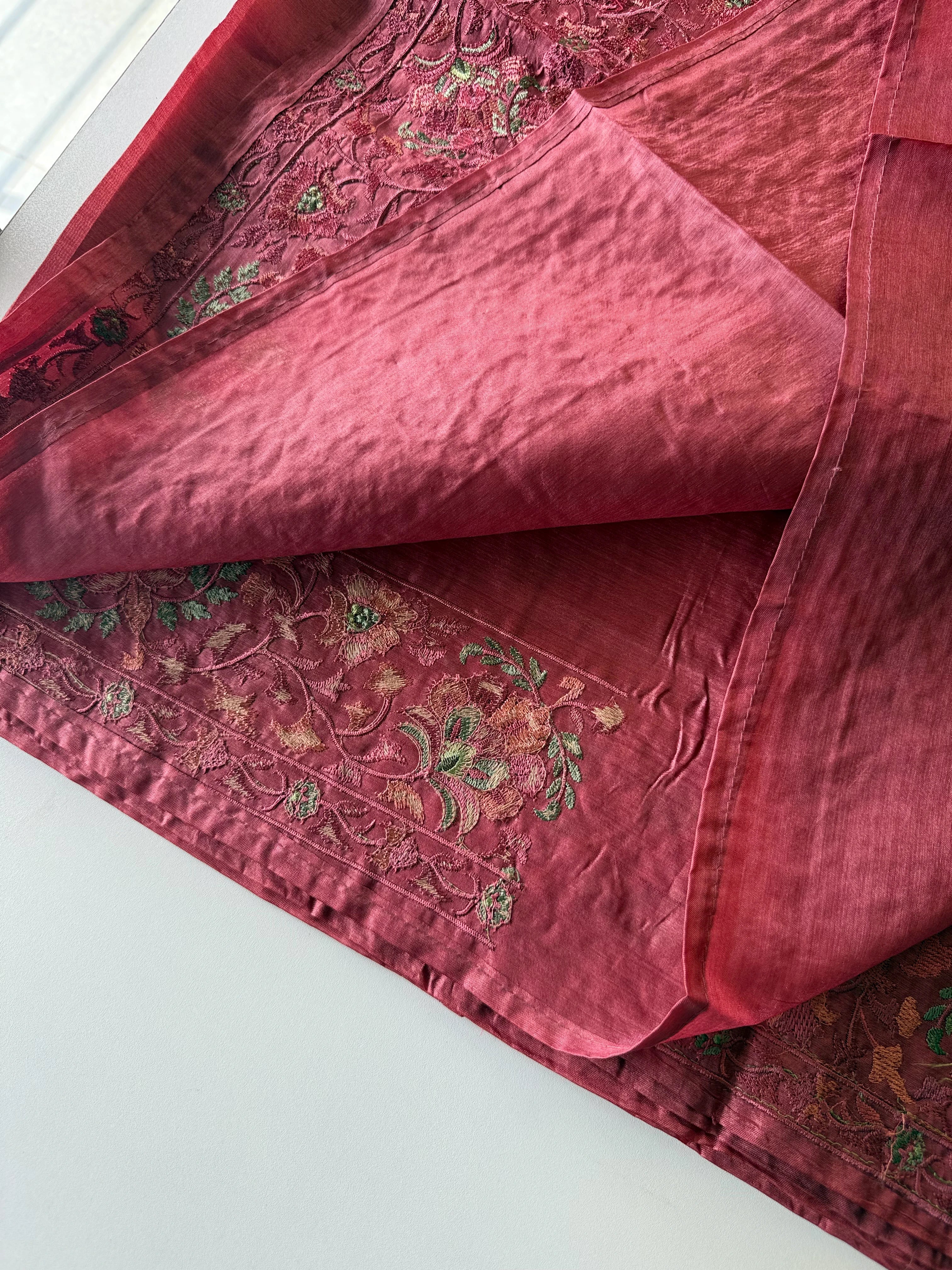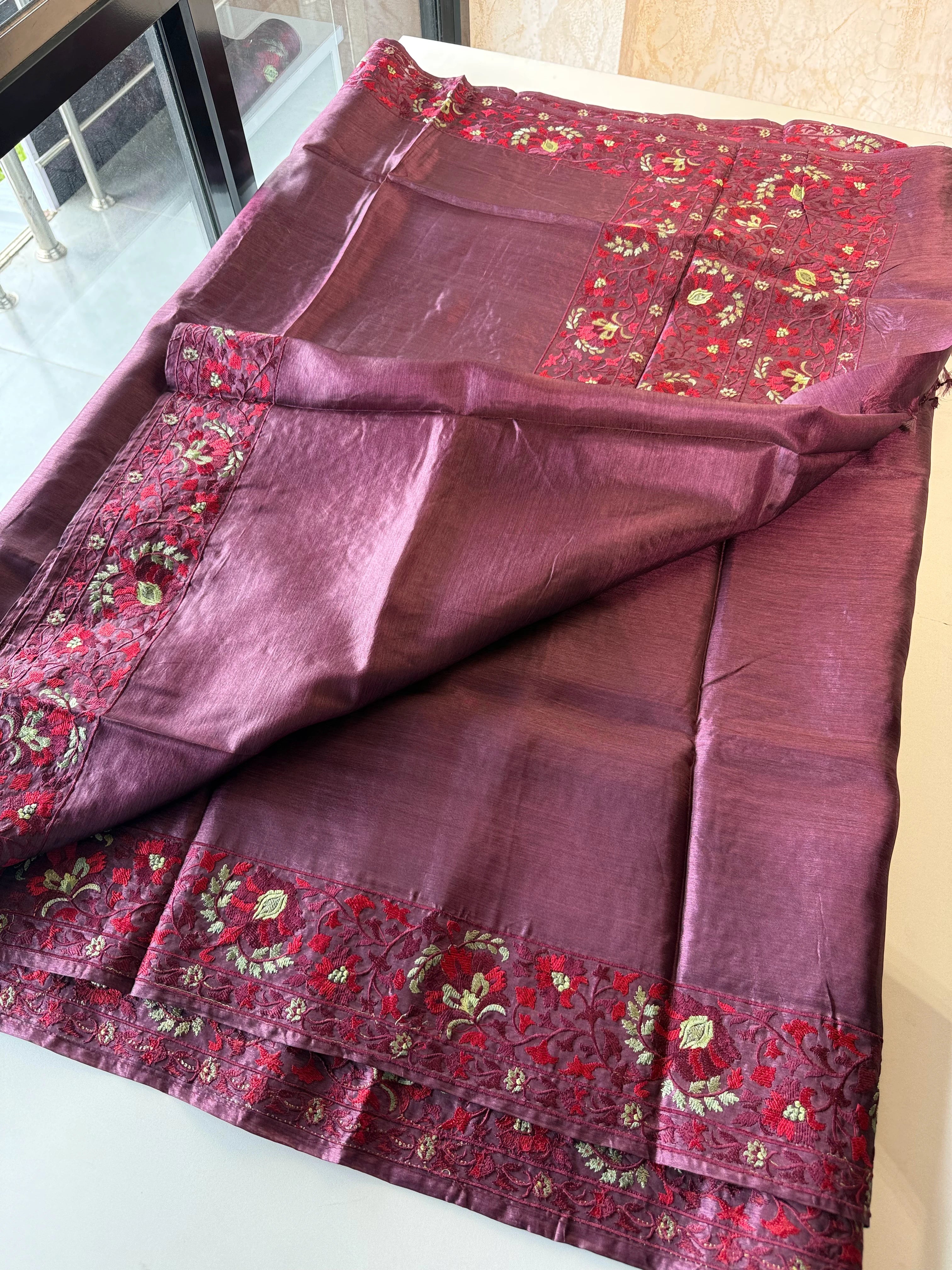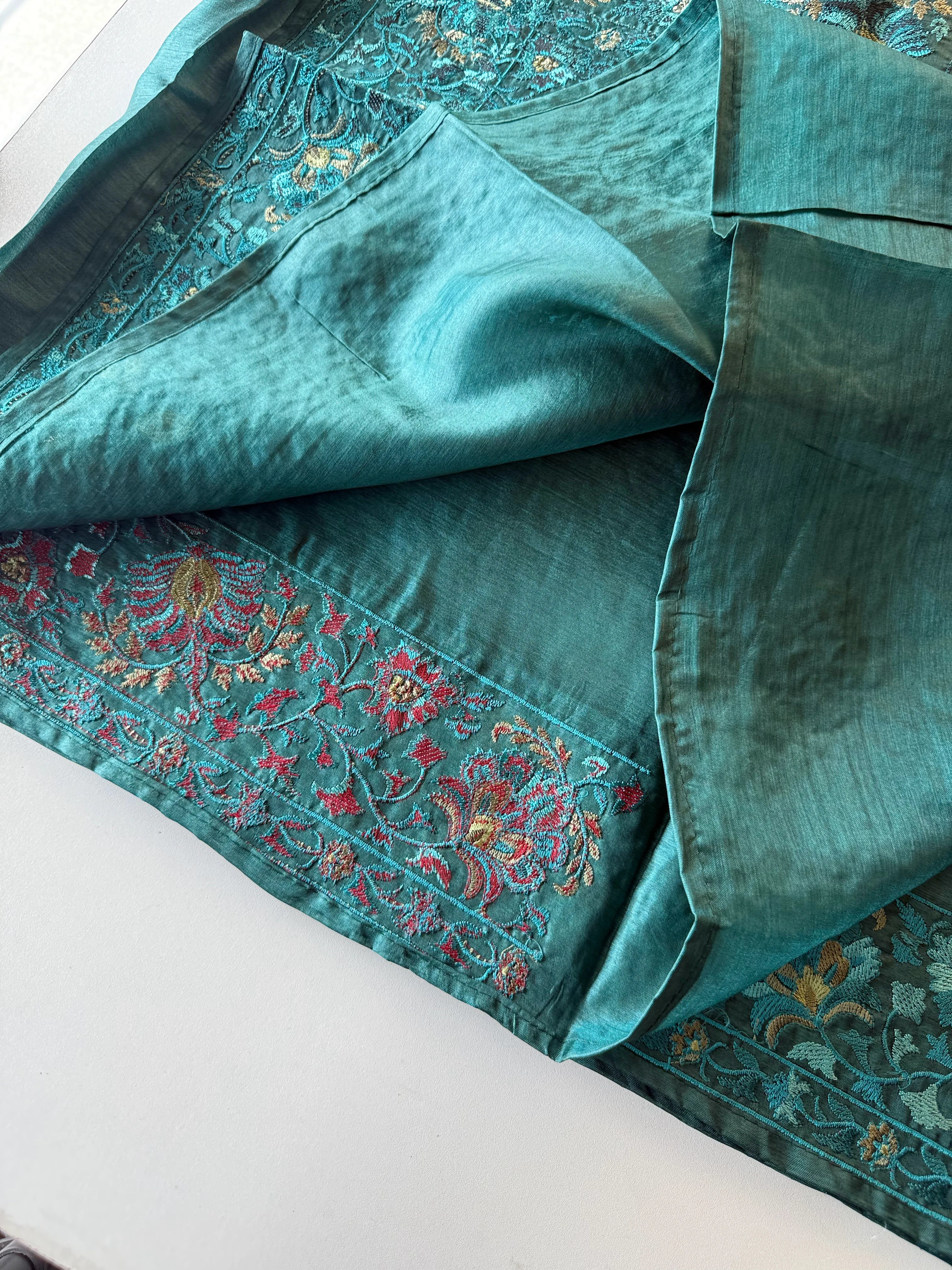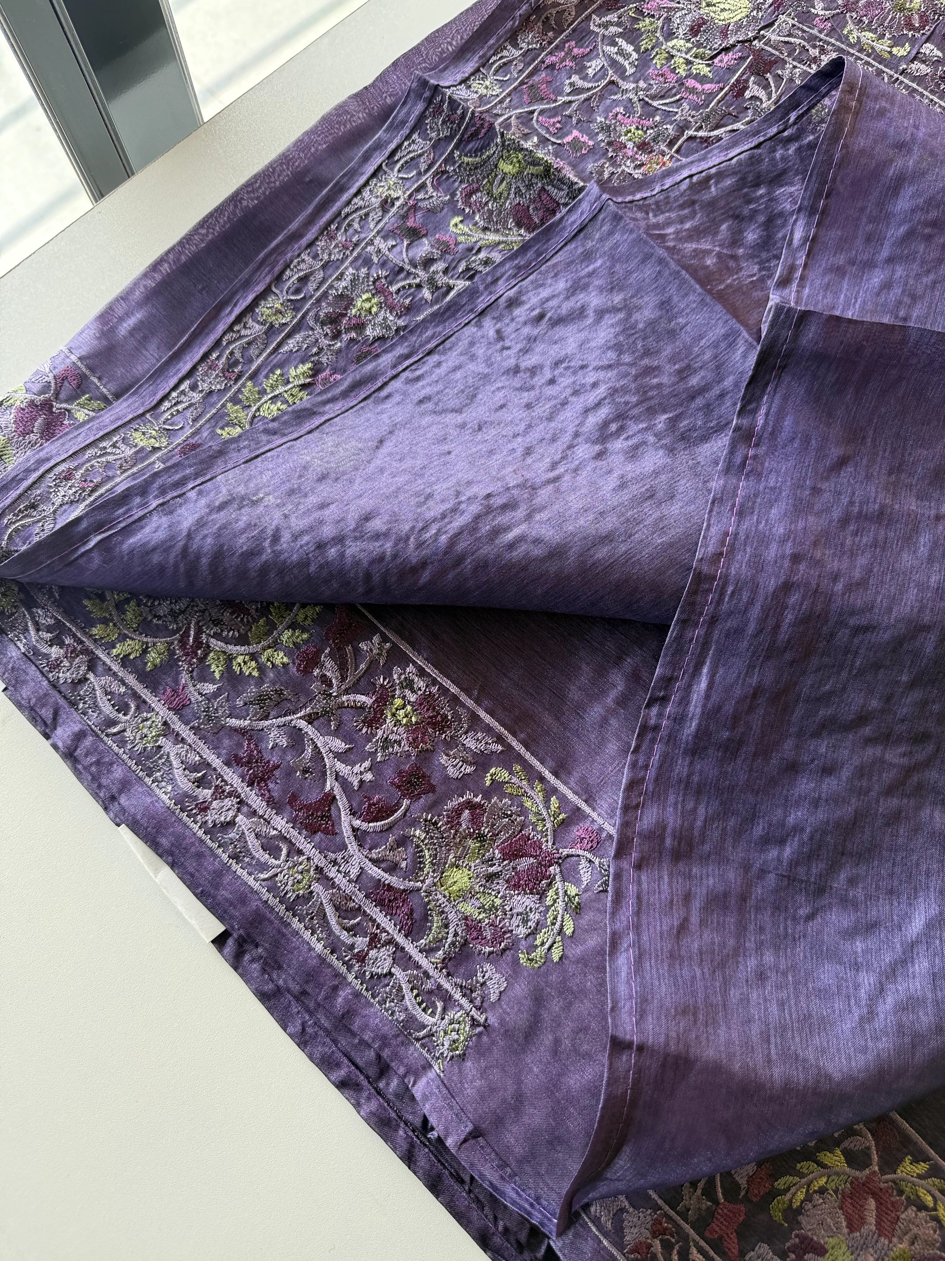 Semi-tussar saree featuring intricate threadwork on the pallu and borders, paired with a matching running blouse piece with tailored sleeve and seam accents. Crisp, semi-structured drape, non-transparent — an elegant choice for refined occasions.