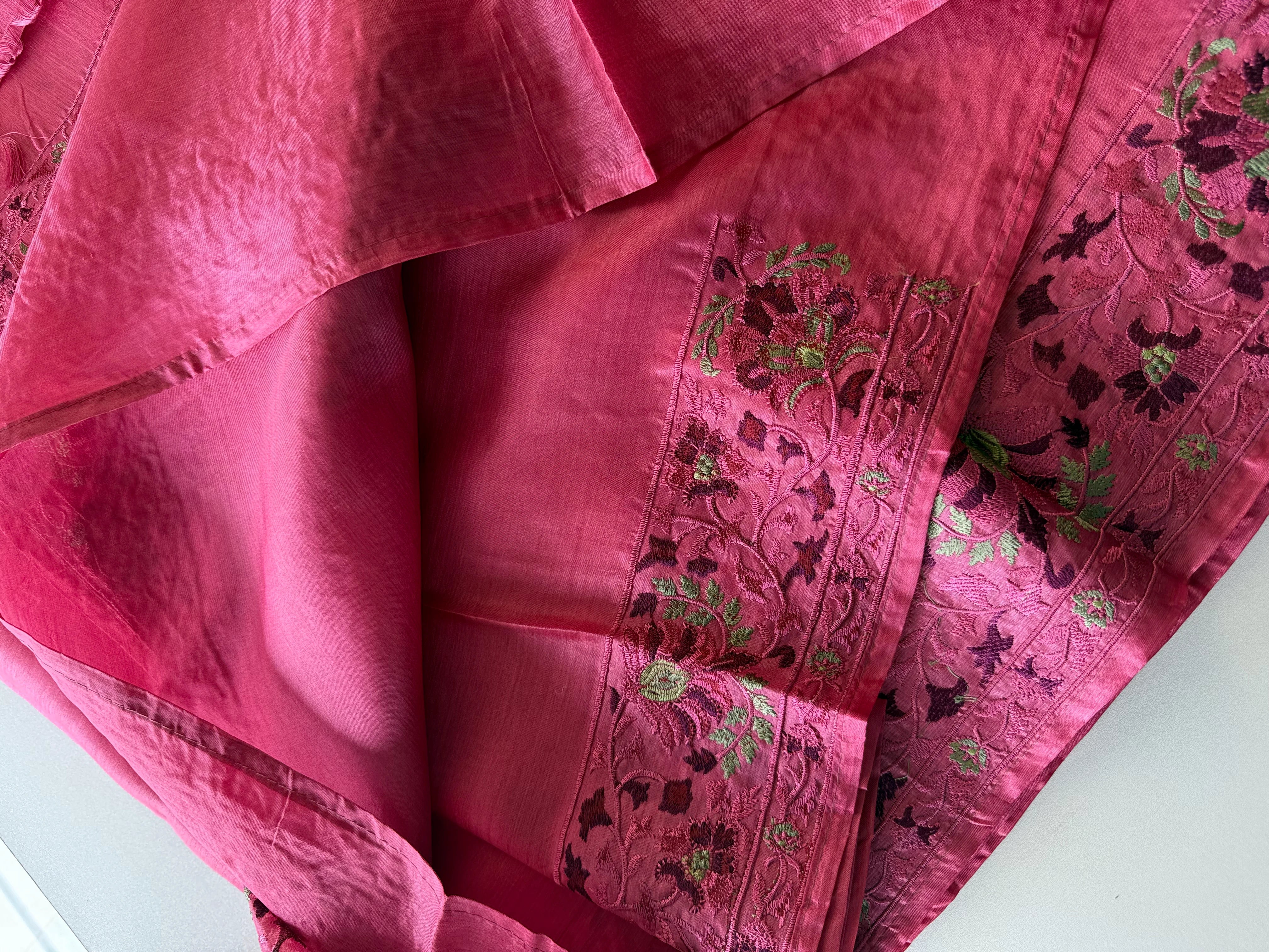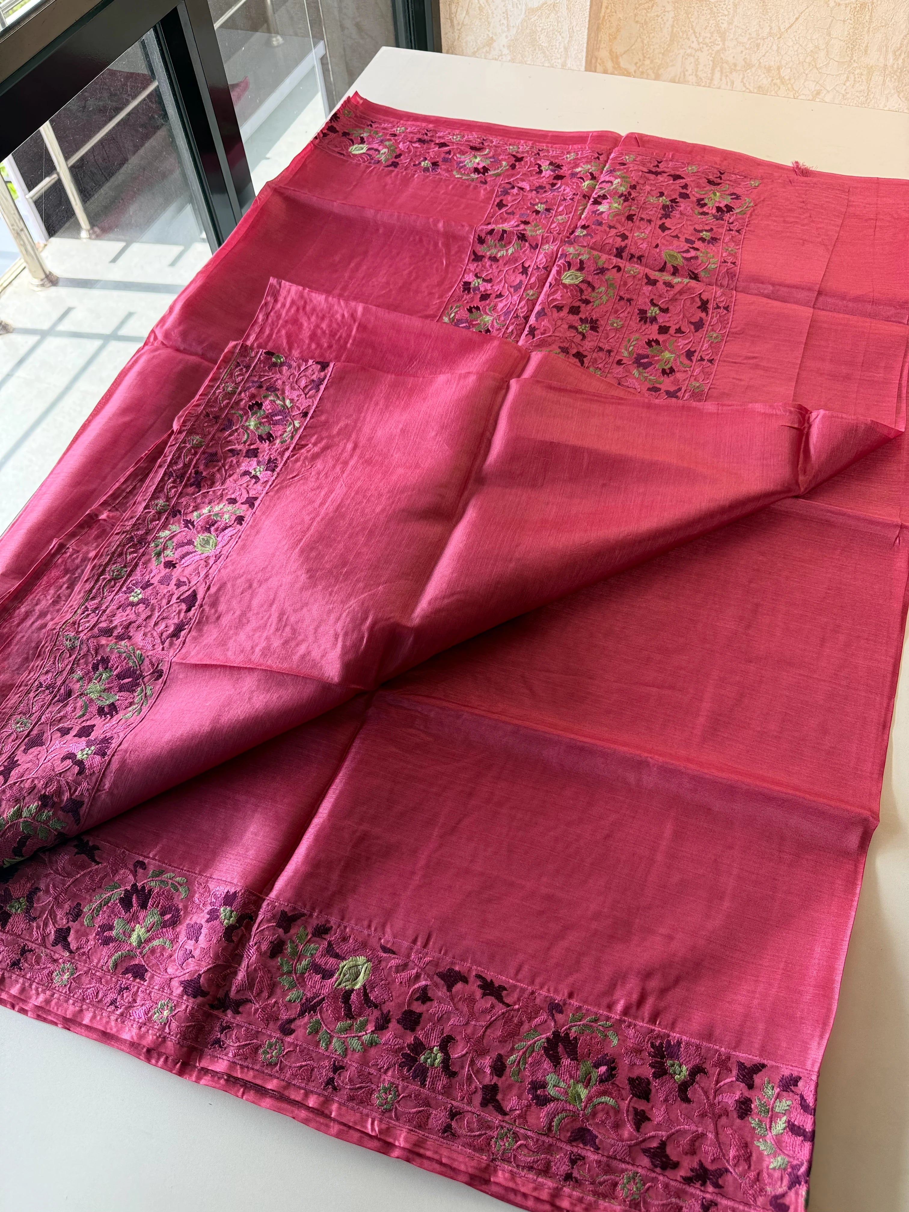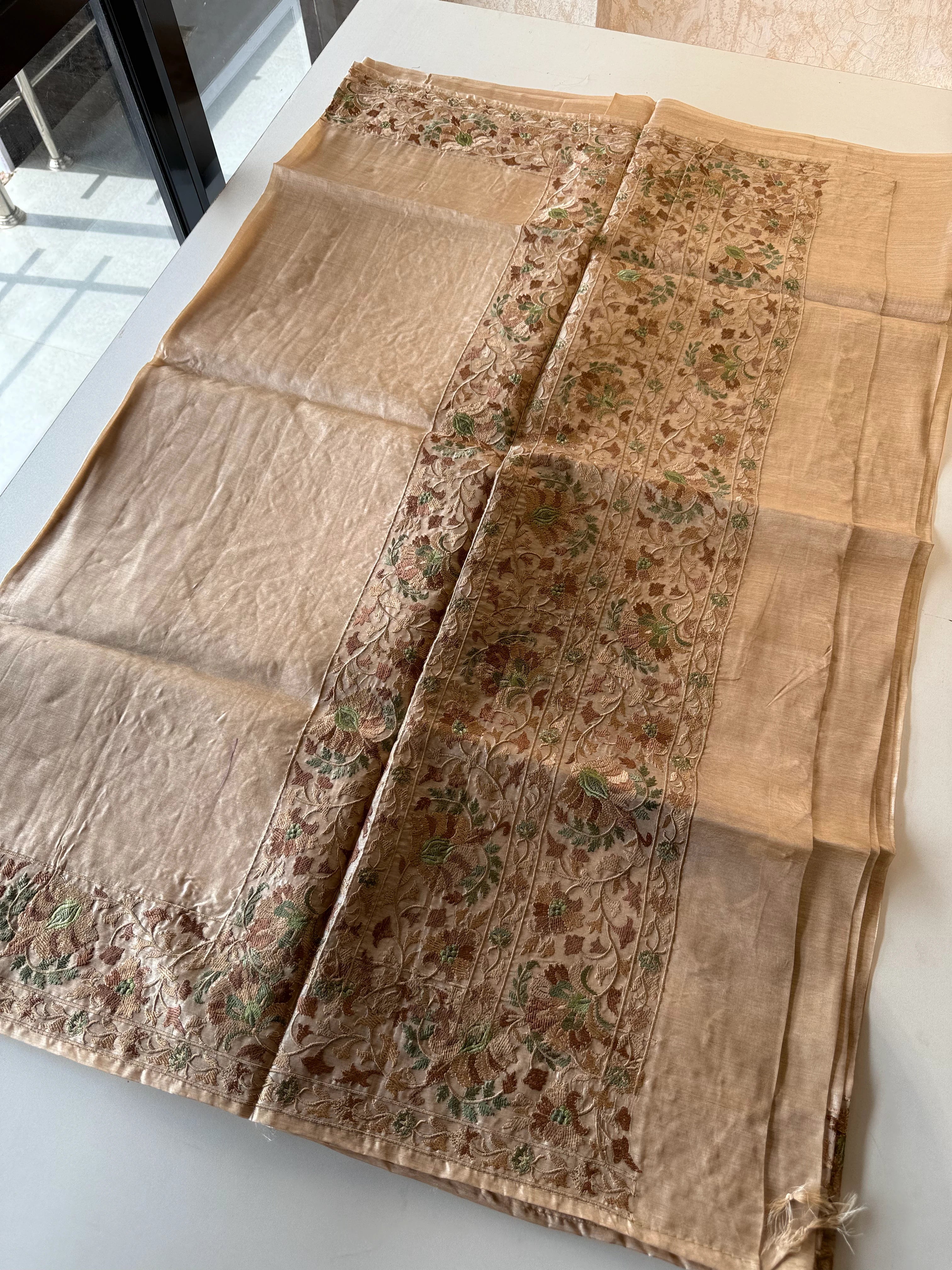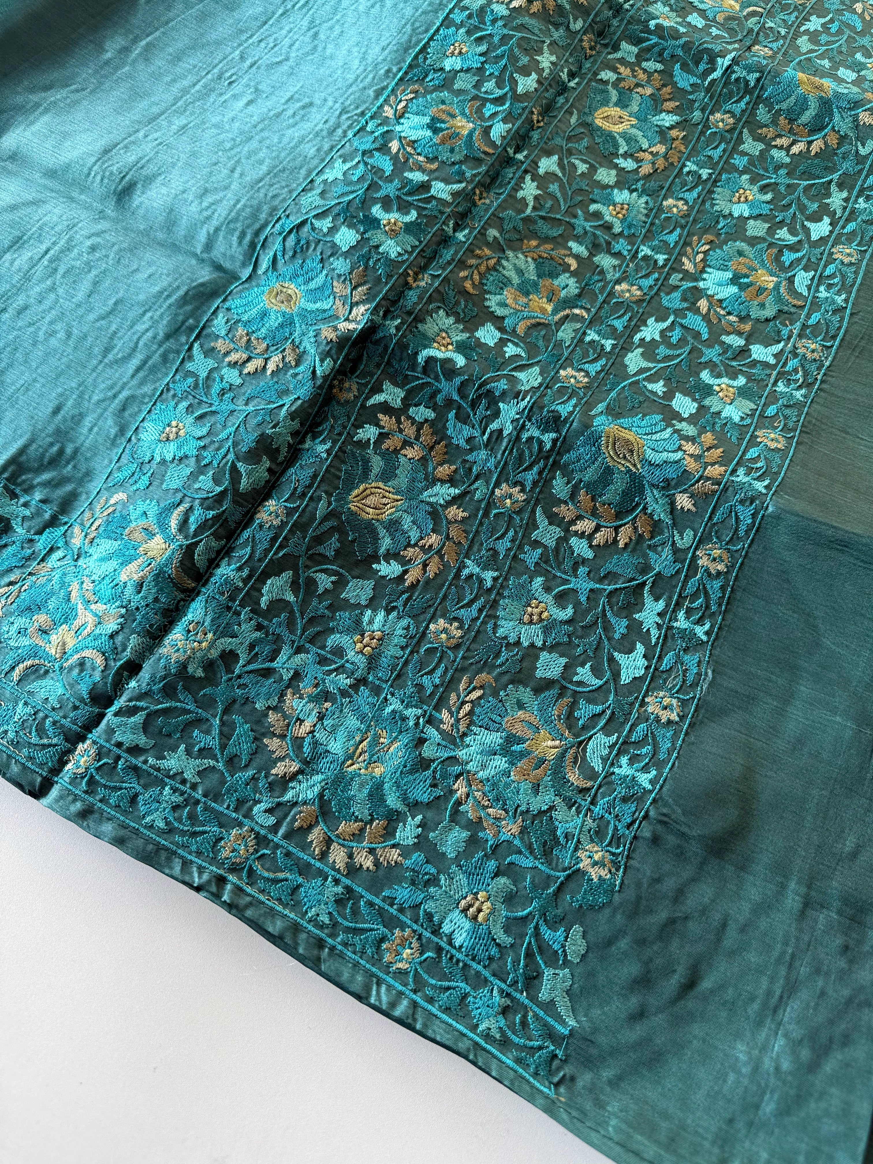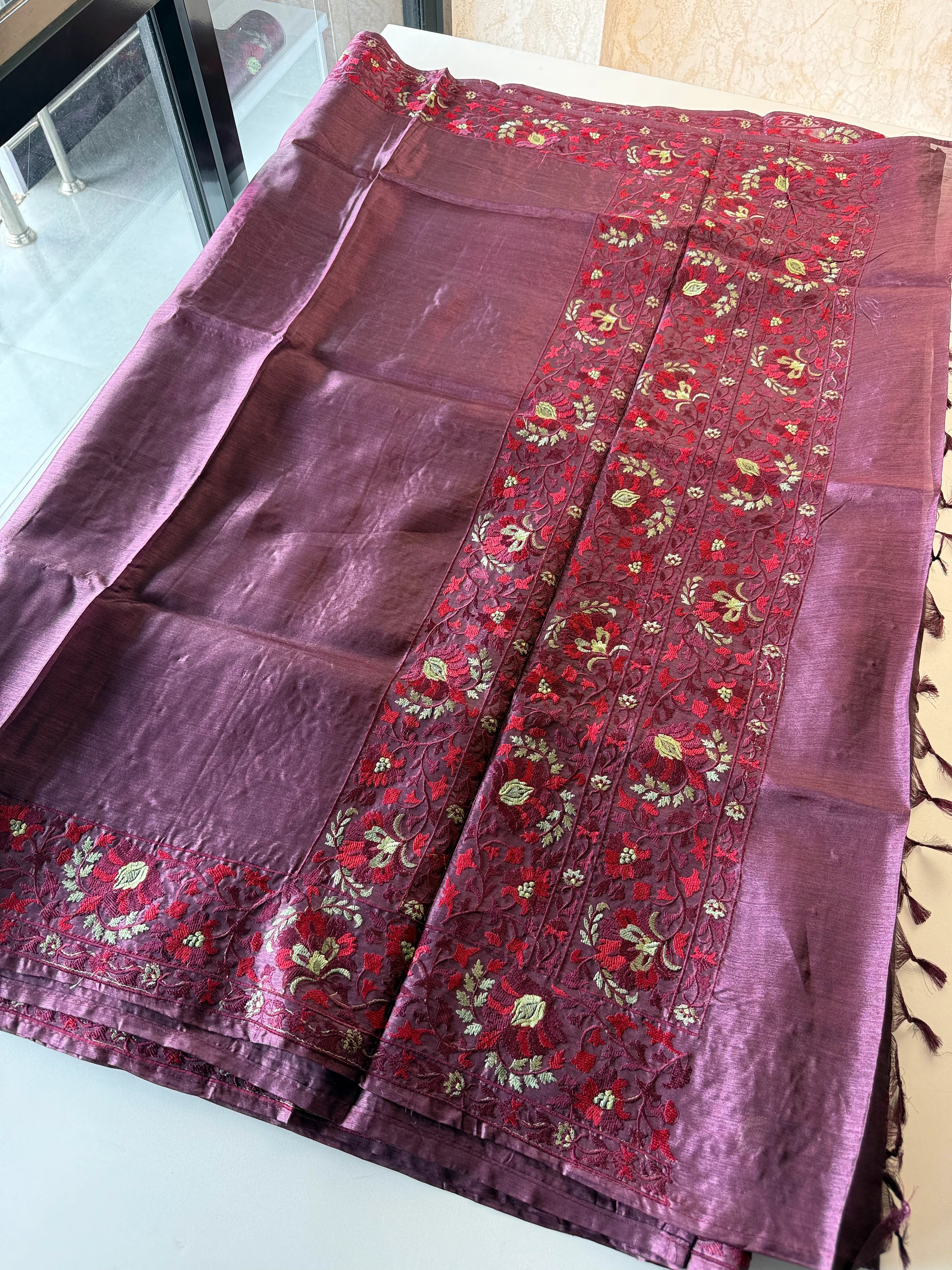 Semi-tussar saree featuring intricate threadwork on the pallu and borders, paired with a matching running blouse piece with tailored sleeve and seam accents. Crisp, semi-structured drape, non-transparent — an elegant choice for refined occasions.