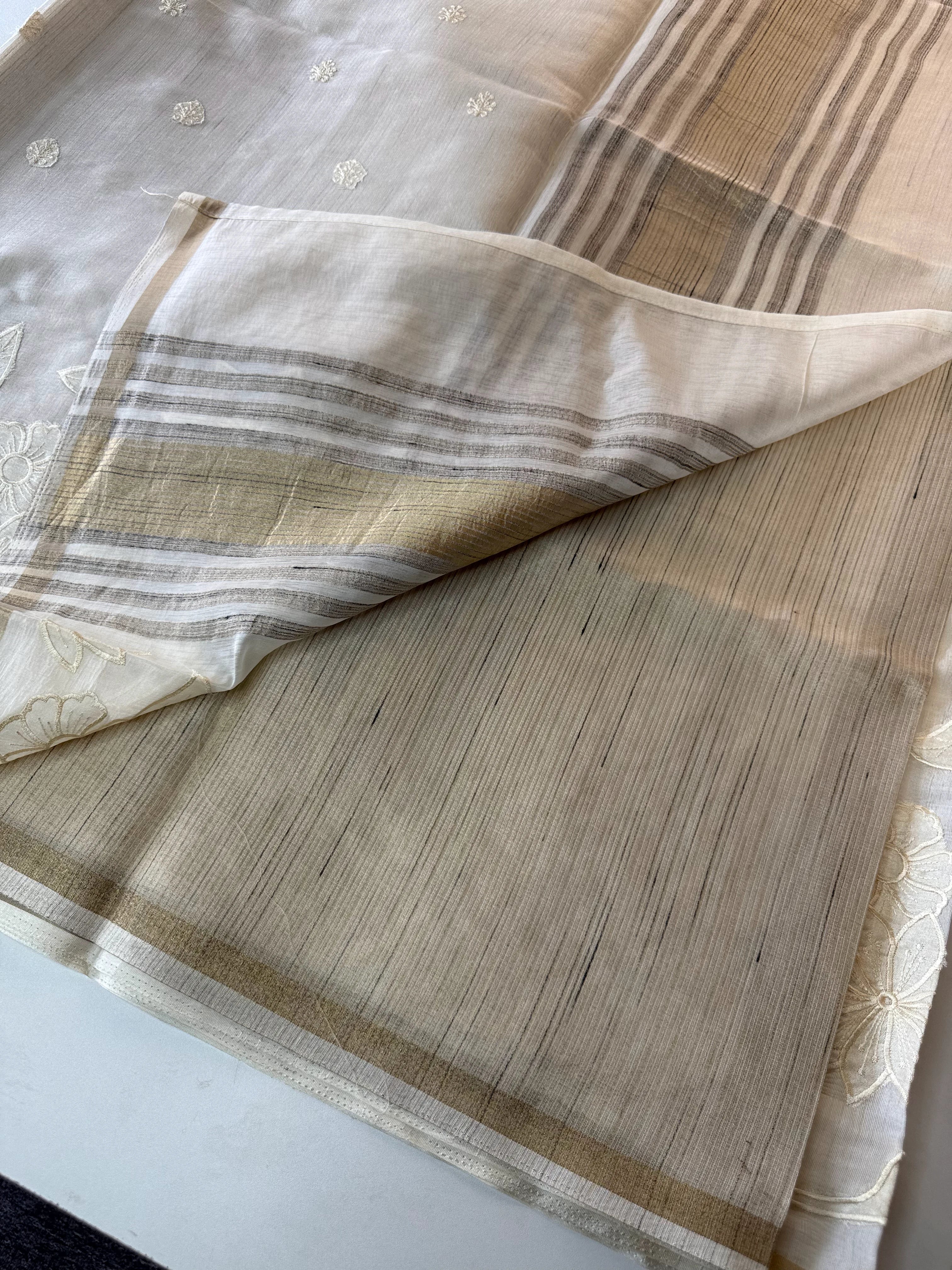 Chanderi–Organza Blend Saree – An elegant drape crafted in a chanderi–organza blend, featuring a semi-jute pallu for a unique textured touch. The bottom pleats portion is adorned with delicate appliqué work, and it comes with a matching blouse piece. A graceful mix of subtle sheen and artistic detailing, perfect for festive and occasion wear.