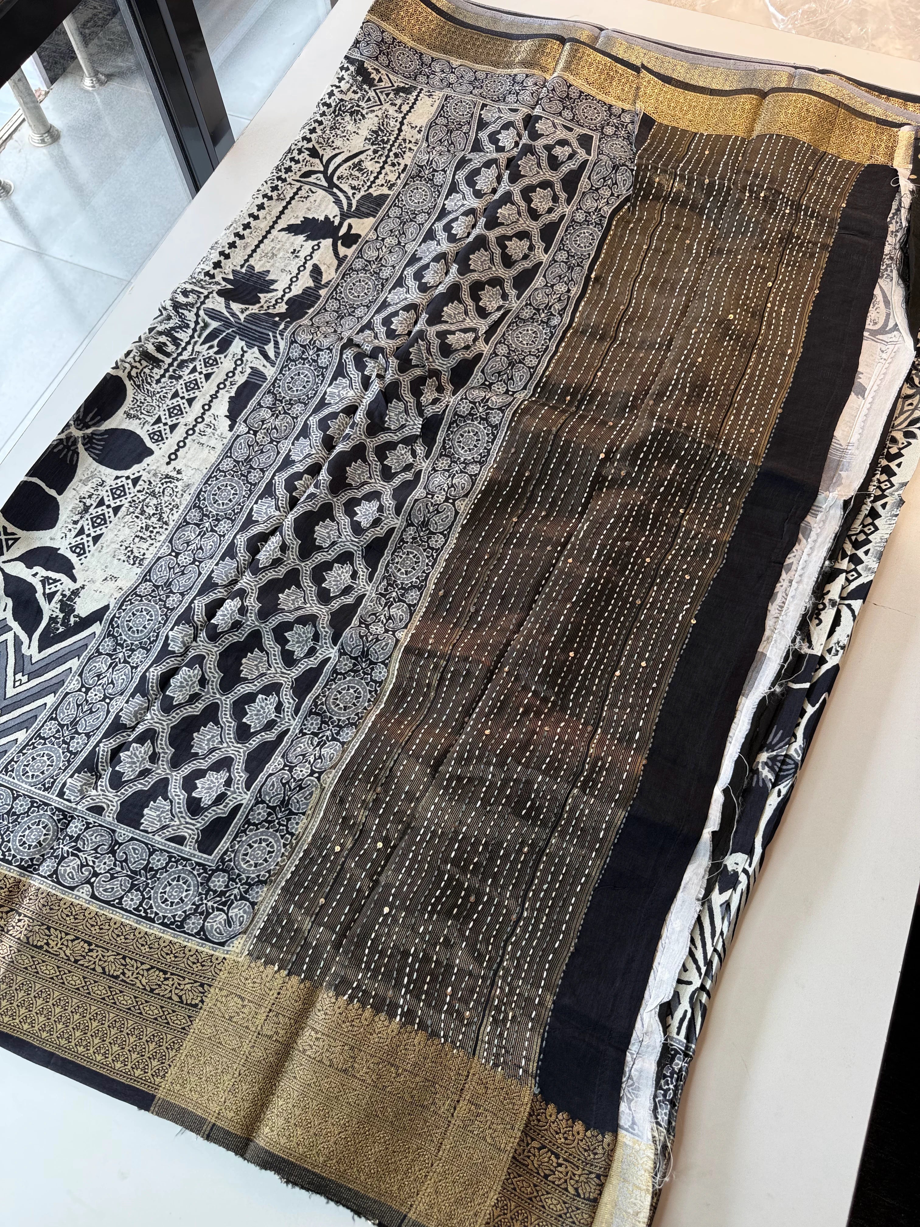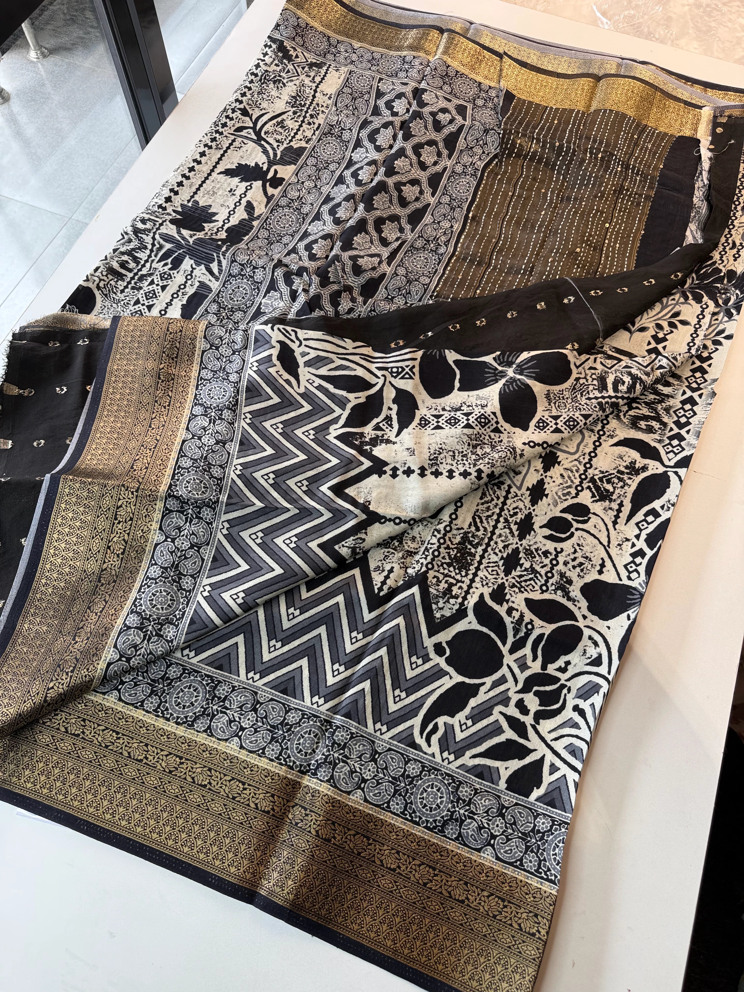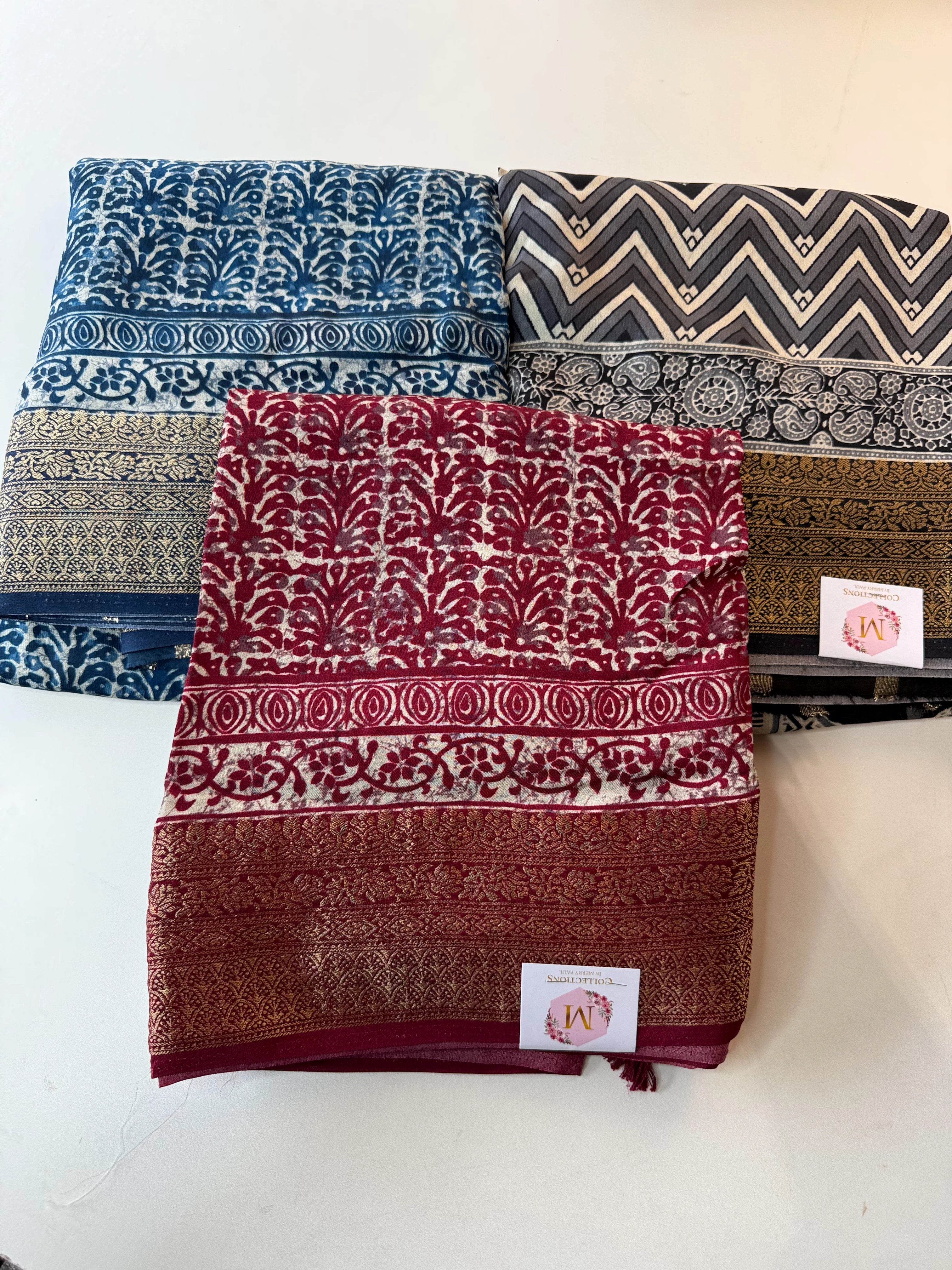 Georgette modal silk saree with a graceful Geri border. Lightweight, flowy, and elegant, making it perfect for both casual and festive wear. Comes with a matching running blouse piece in heavy Kantha work