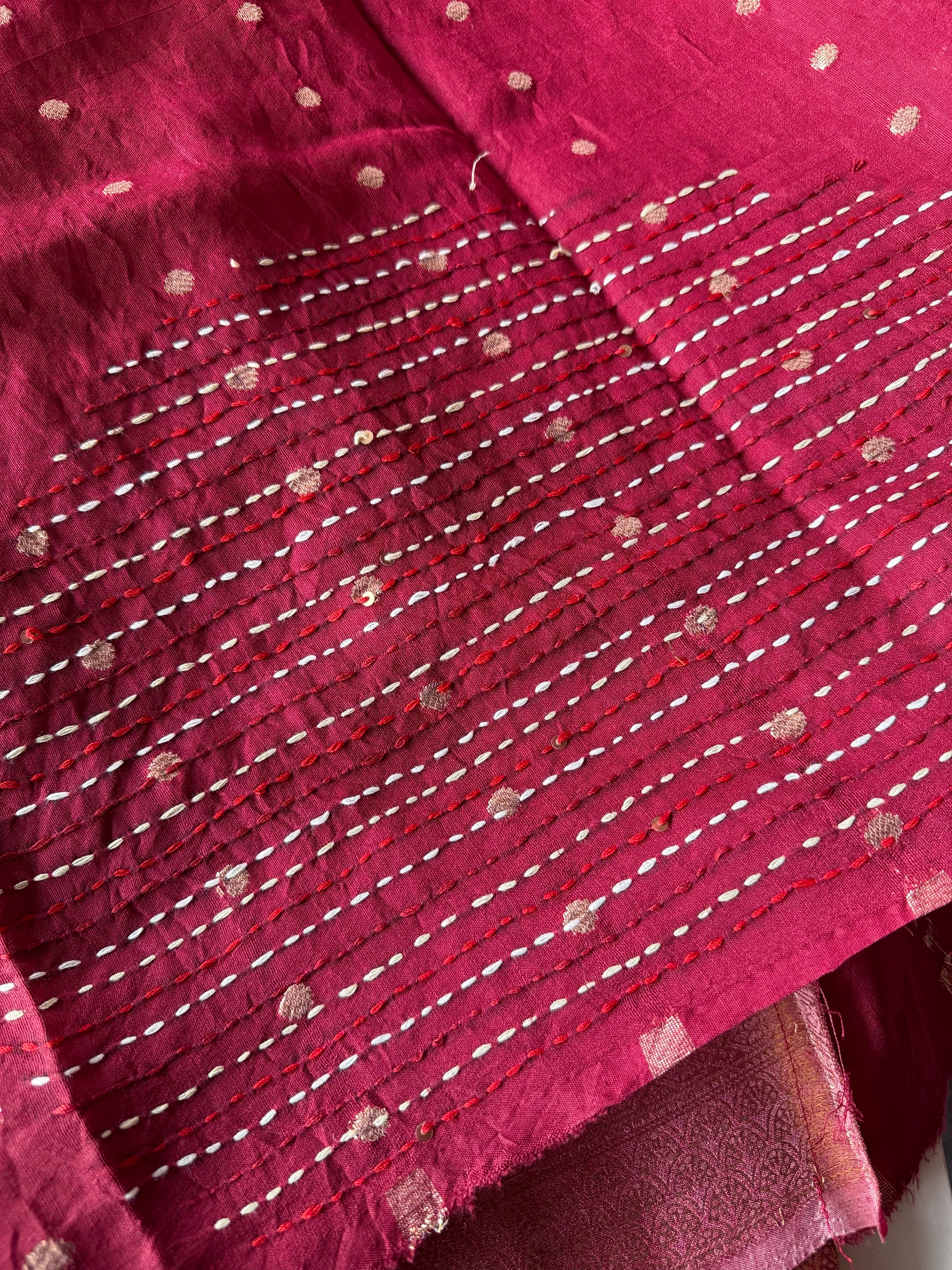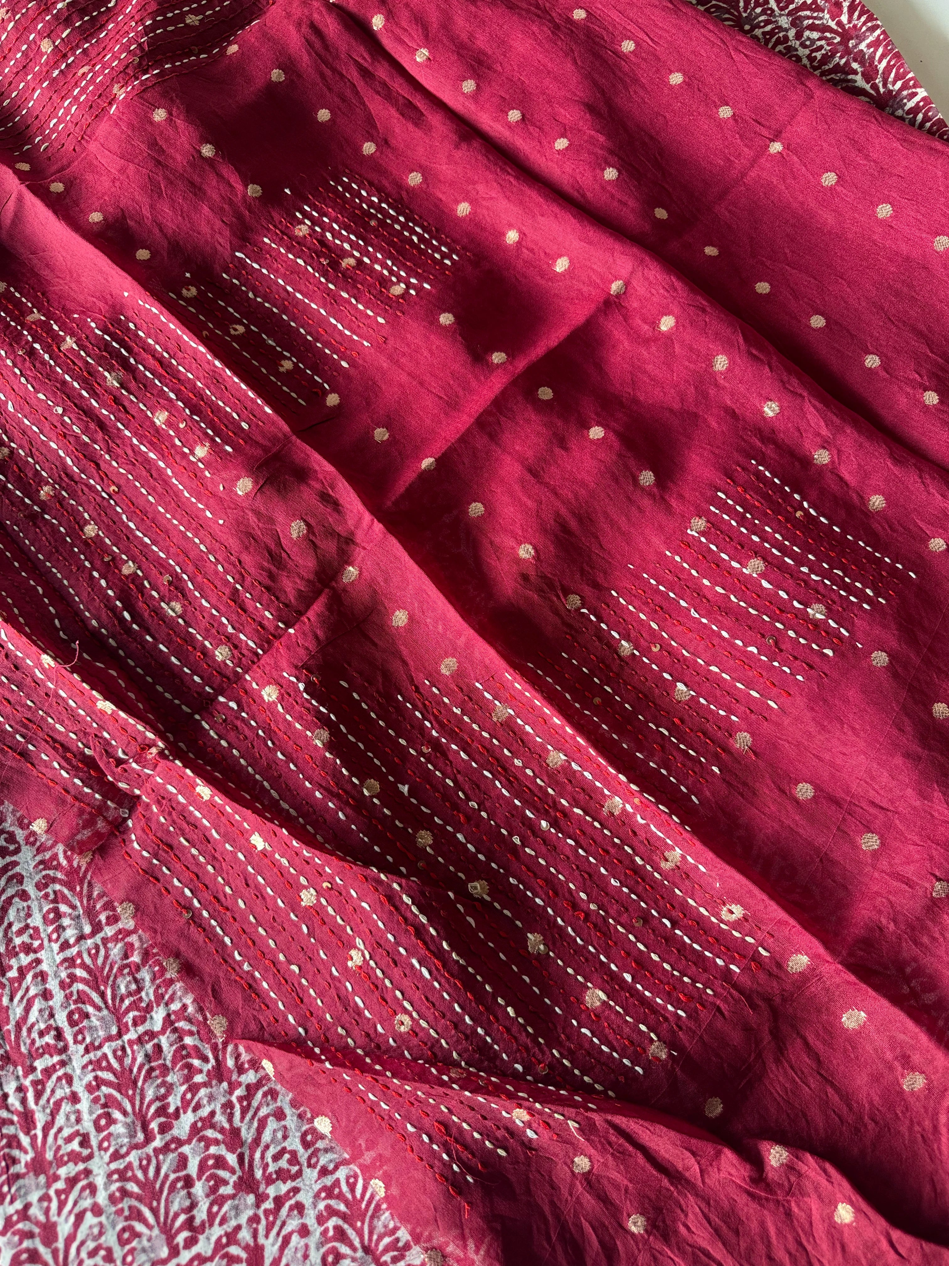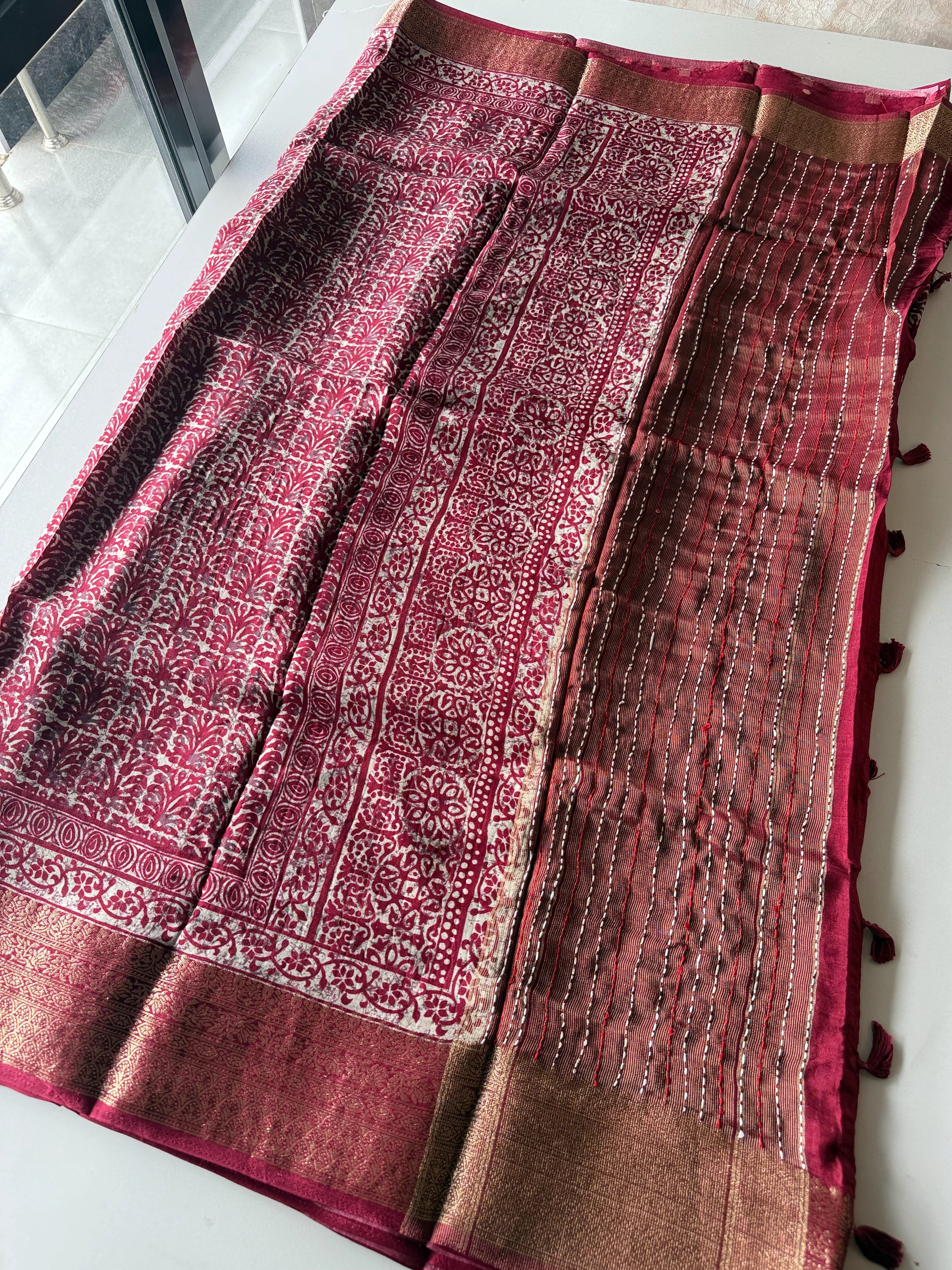 Georgette modal silk saree with a graceful Geri border. Lightweight, flowy, and elegant, making it perfect for both casual and festive wear. Comes with a matching running blouse piece in heavy Kantha work