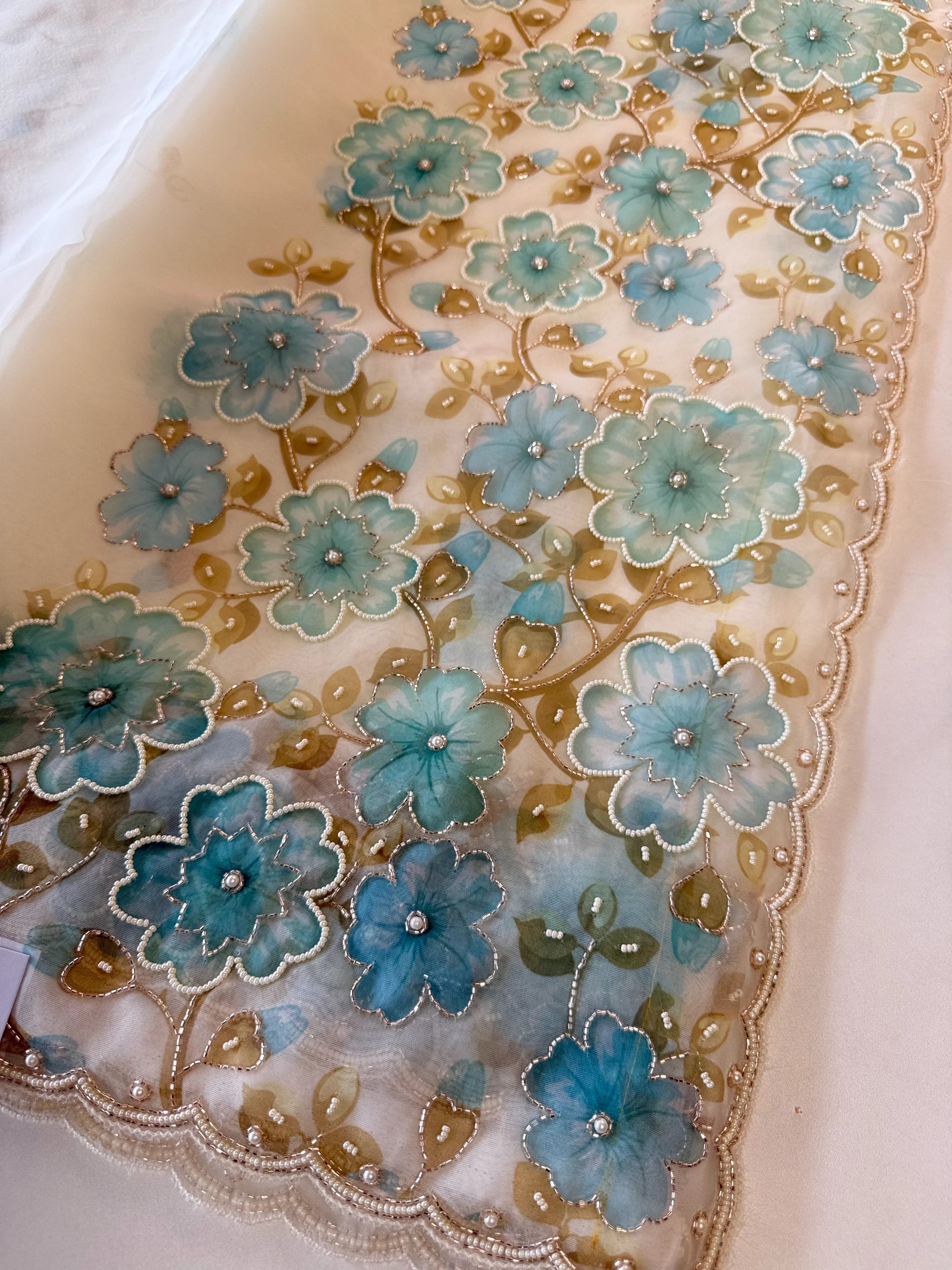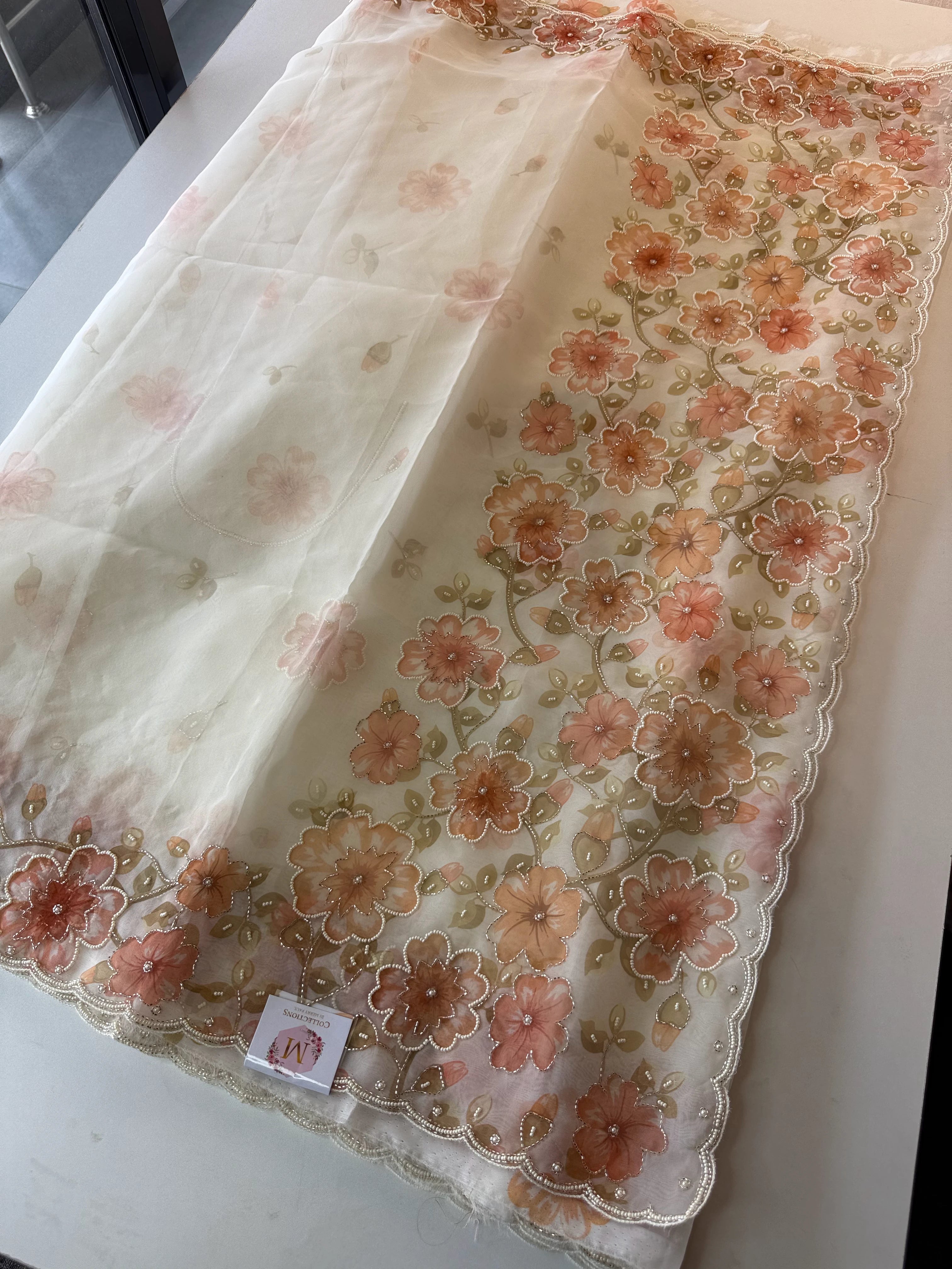 Pure organza saree adorned with elegant floral digital prints, beautifully enhanced with intricate cut bead, sugar bead, and sequin highlights. The florals flow gracefully along the pallu and borders, adding a subtle shimmer to the drape. Paired with a running blouse piece featuring floral sleeve-end detailing, also embellished with bead highlights. A refined choice, perfect for party wear