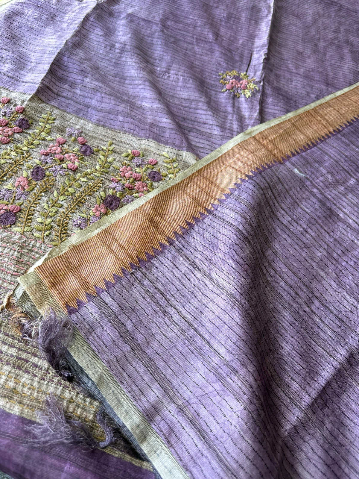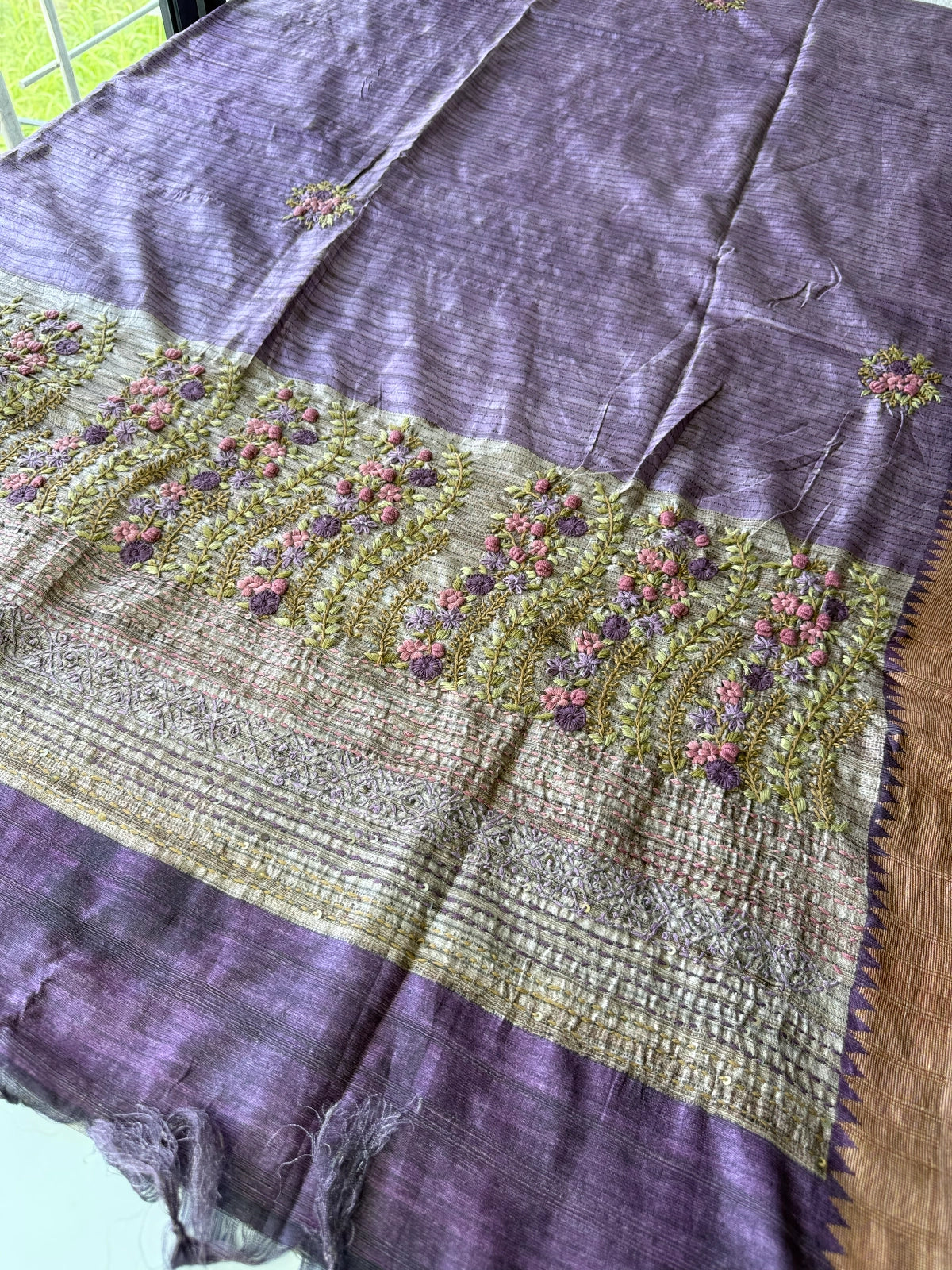A soft and non-transparent semi tussar saree featuring elegant handworked florals by the pallu and intricate Kantha work along the border. The body is adorned with delicate flower buttas spread evenly for a graceful look. Comes with a running blouse piece, enhanced with matching handwork on the sleeve ends. Perfect for graceful day wear or festive occasions. Screen Print body