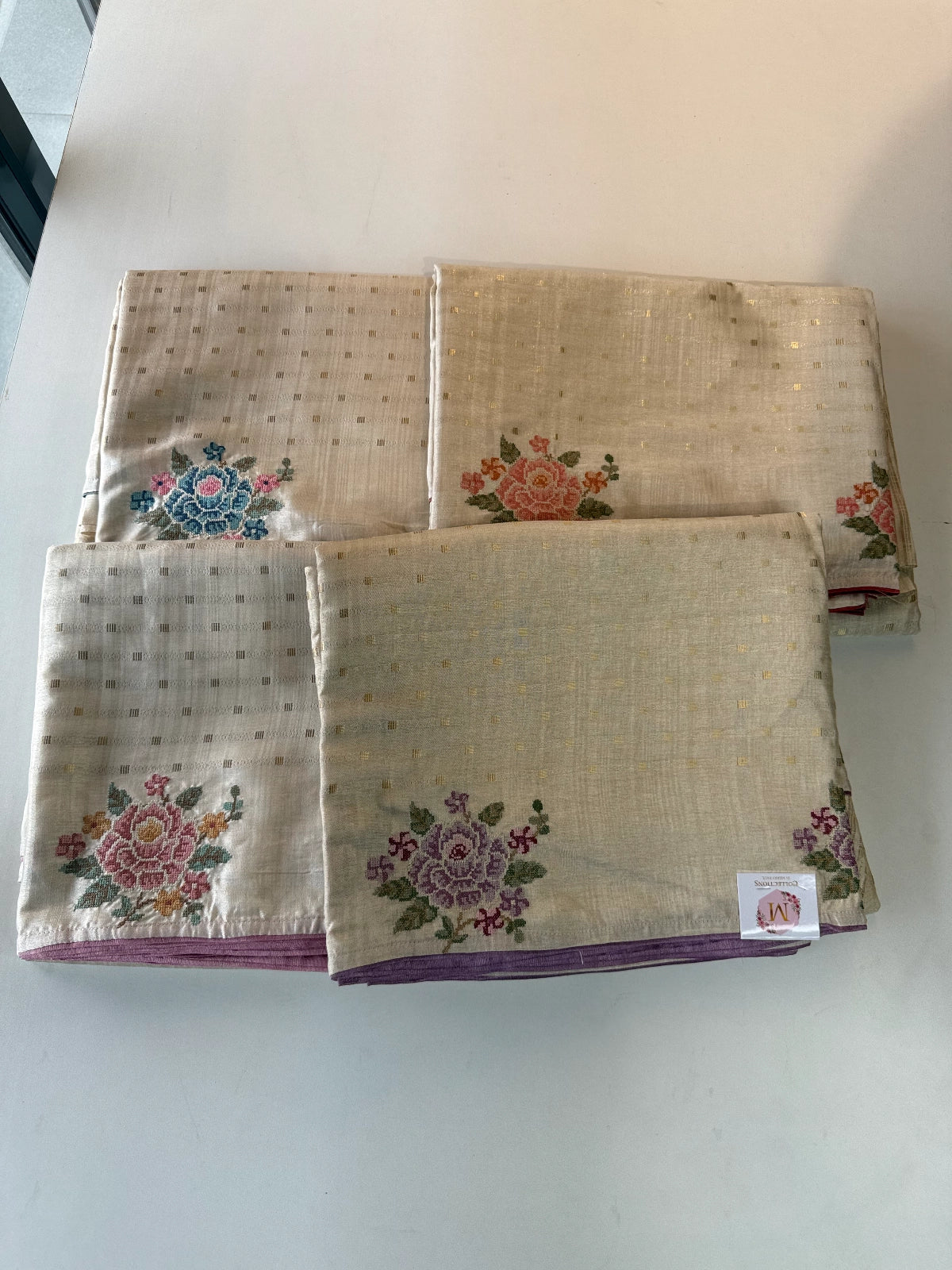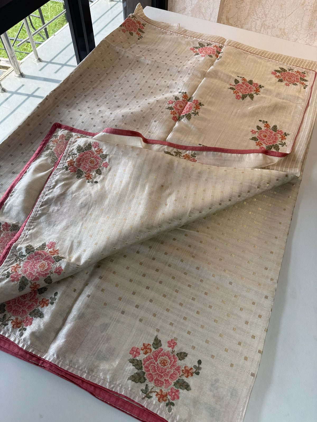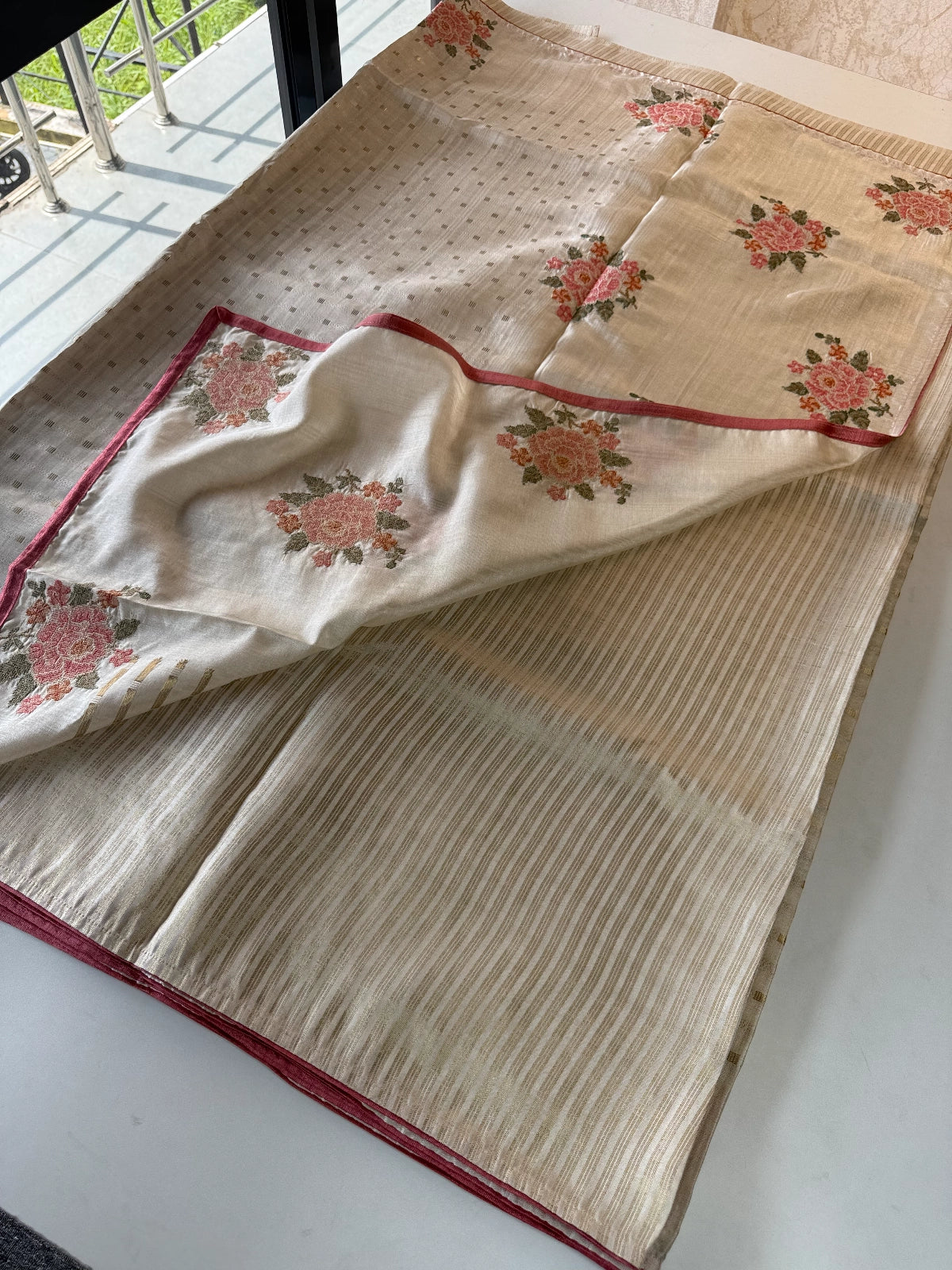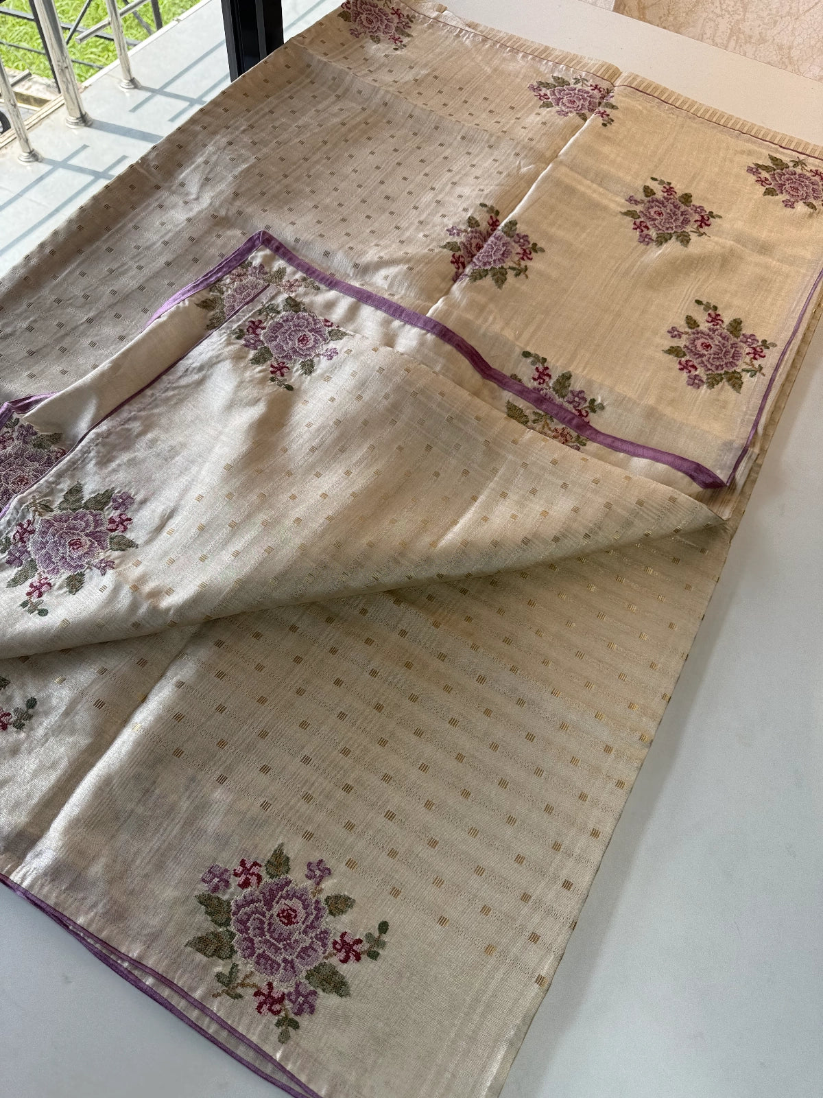Exquisite semi tussar saree adorned with cross-stitched floral patterns along the pallu and border. The body is elegantly detailed with golden zari weaving throughout, paired with a running blouse piece featuring a classic striped pattivira pattern. A graceful fusion of tradition and sophistication ✨
