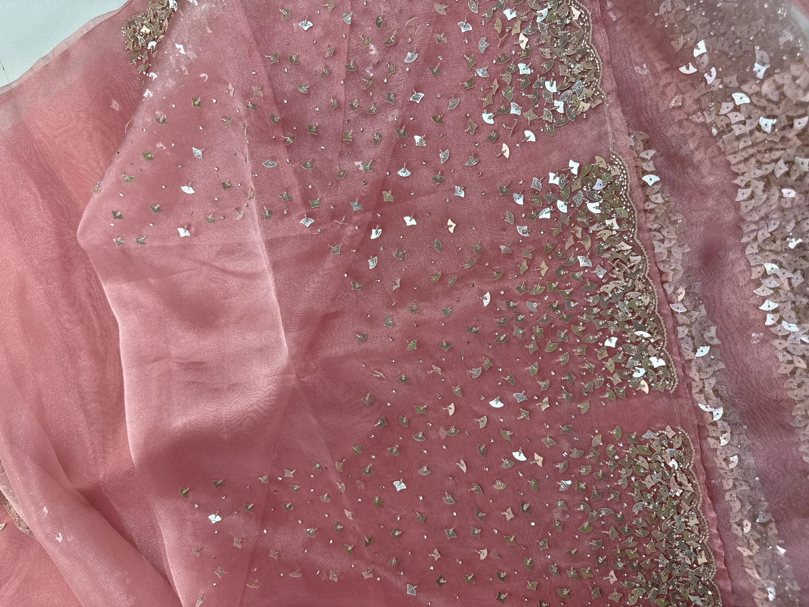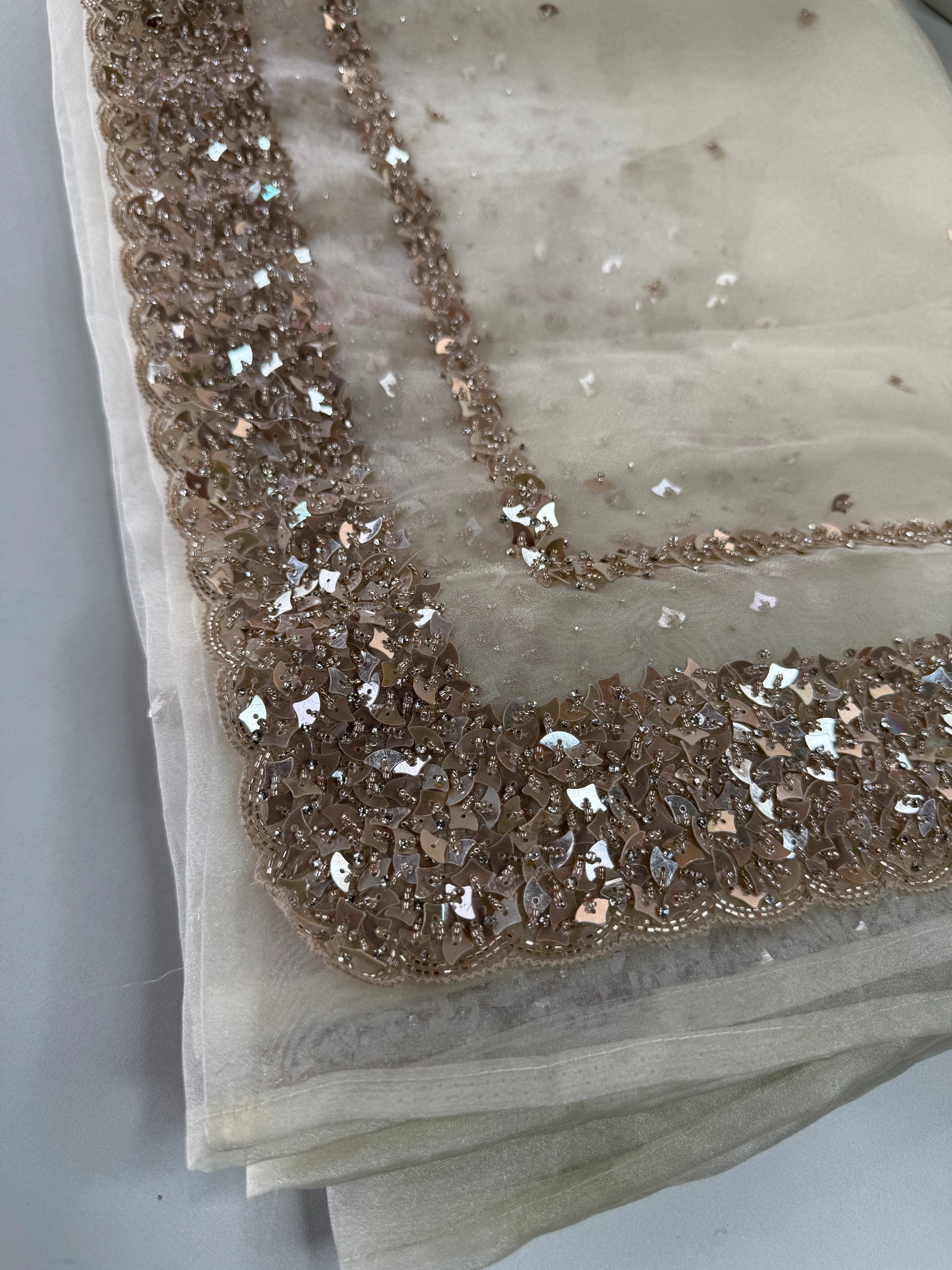 Elegant glass organza saree featuring a beautifully hand-worked sequin border that adds subtle sparkle and richness. The body is delicately highlighted with scattered hand embellishments, giving it a refined festive look.