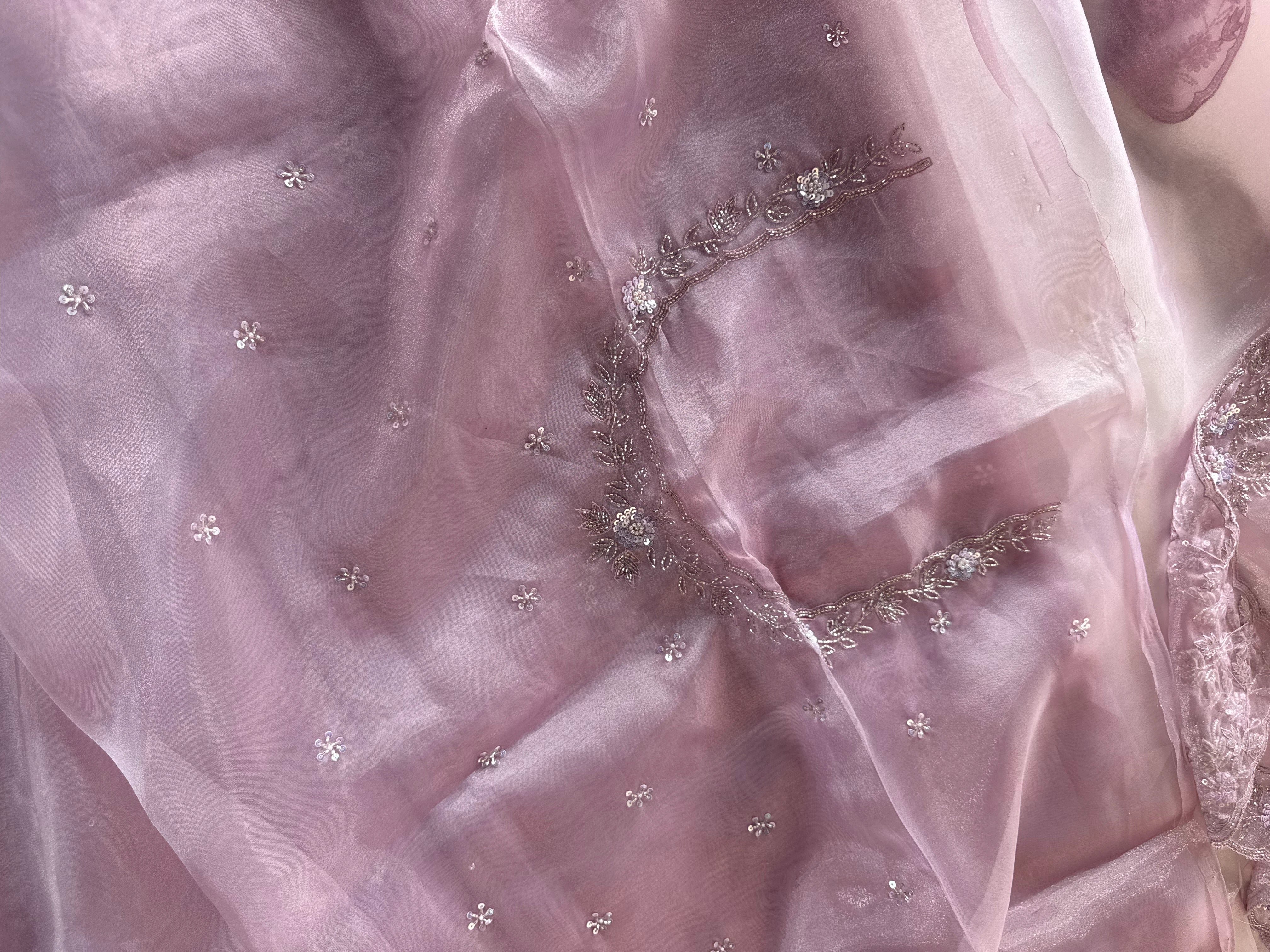 Glass Organza Saree – A stunning saree in rich crushed tissue fabric, highlighted with a beautifully hand-worked border. The blouse piece comes with intricate handwork on the sleeve ends and back neckline, adding a touch of elegance and exclusivity. A graceful choice for parties and special occasions.