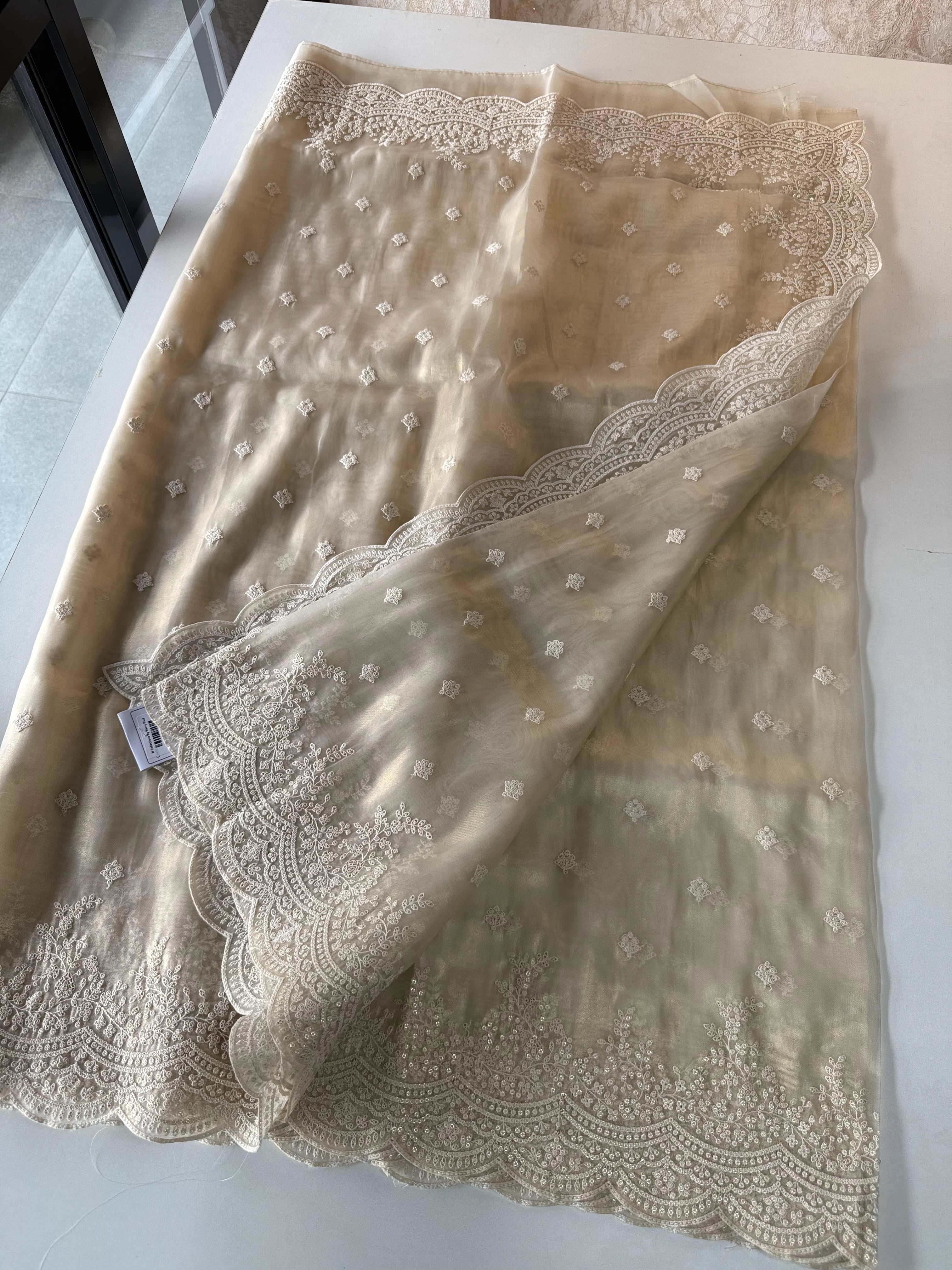 Graceful light beige tissue organza saree featuring intricate thread embroidery along the border, delicately enhanced with sequin detailing. The saree comes with a matching running blouse piece, highlighted with similar thread and sequin work on the sleeve end. Lightweight, sheer, and easy to drape — perfect for festive wear, receptions, and elegant occasions.