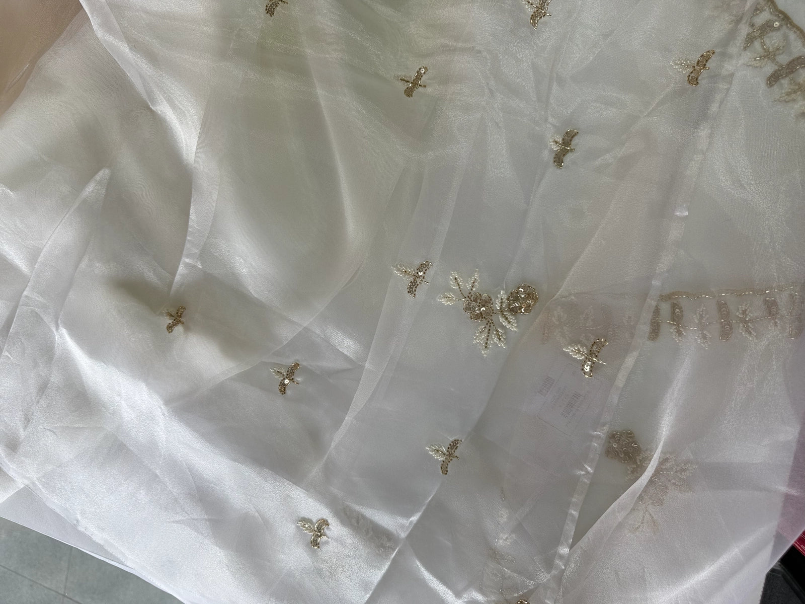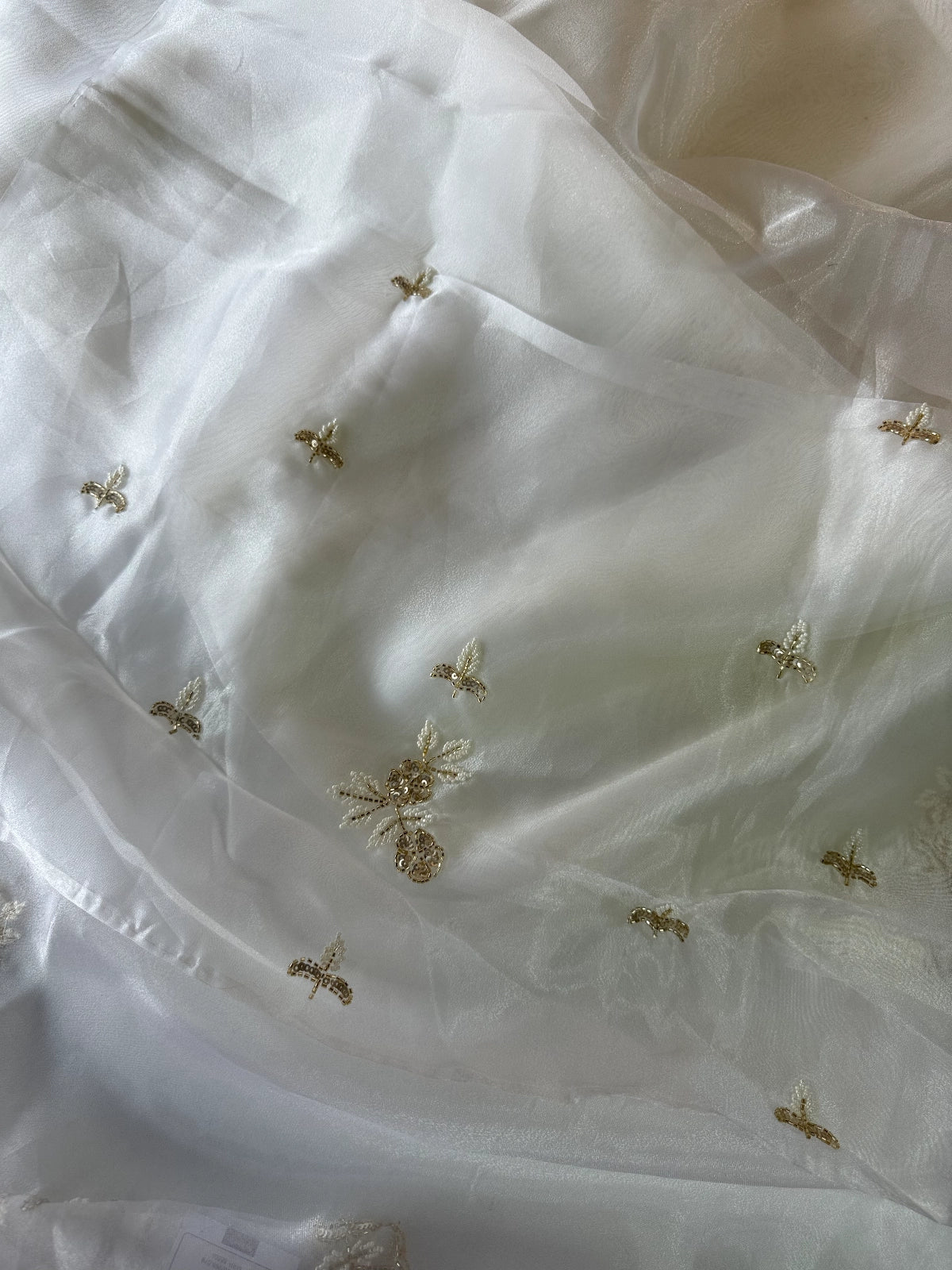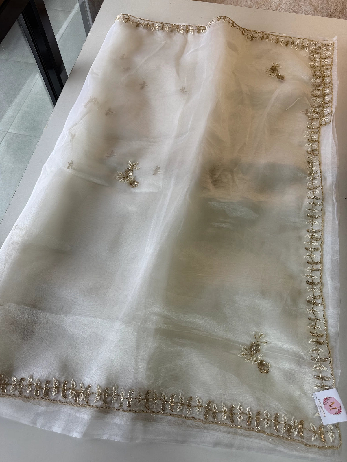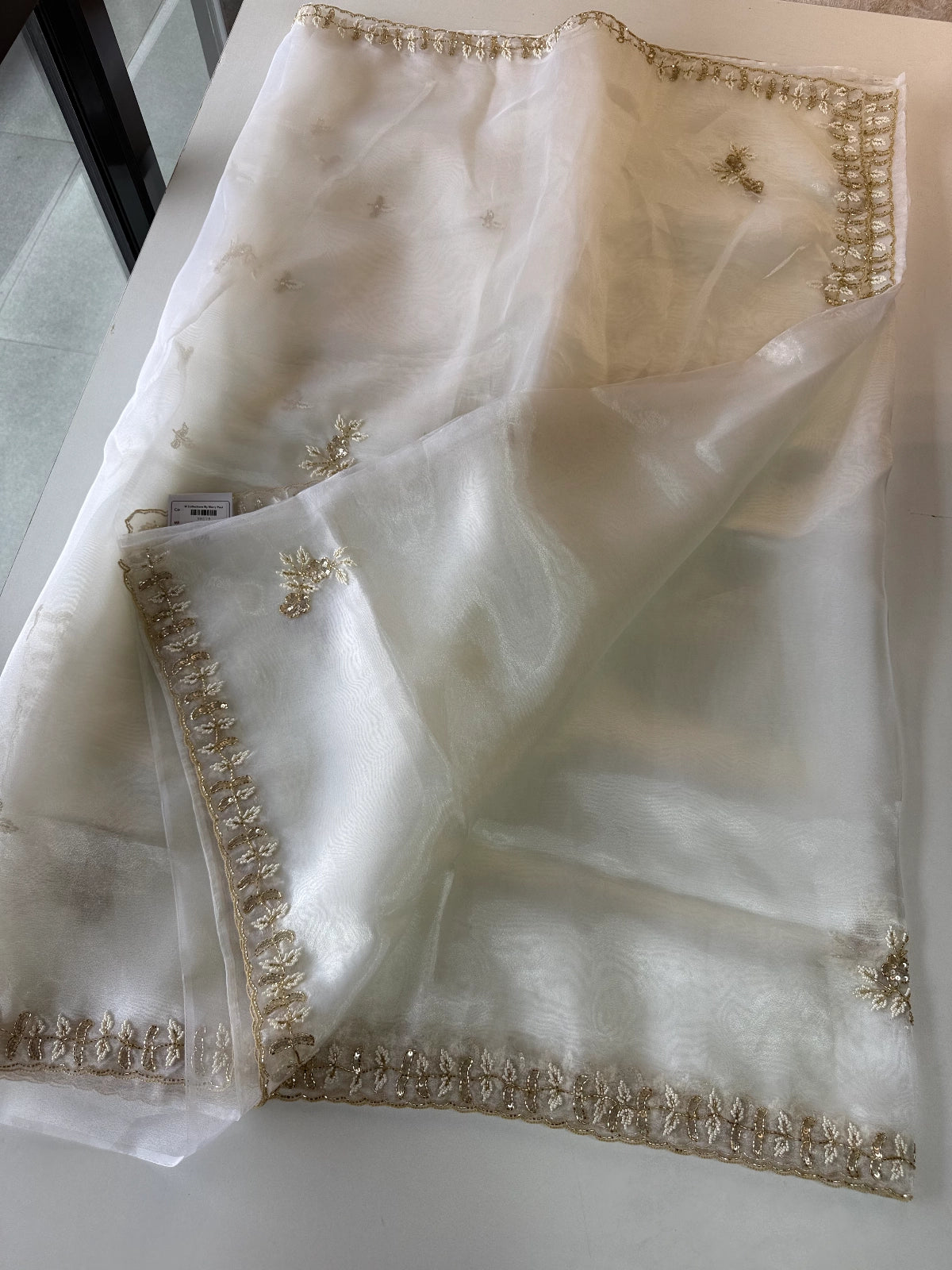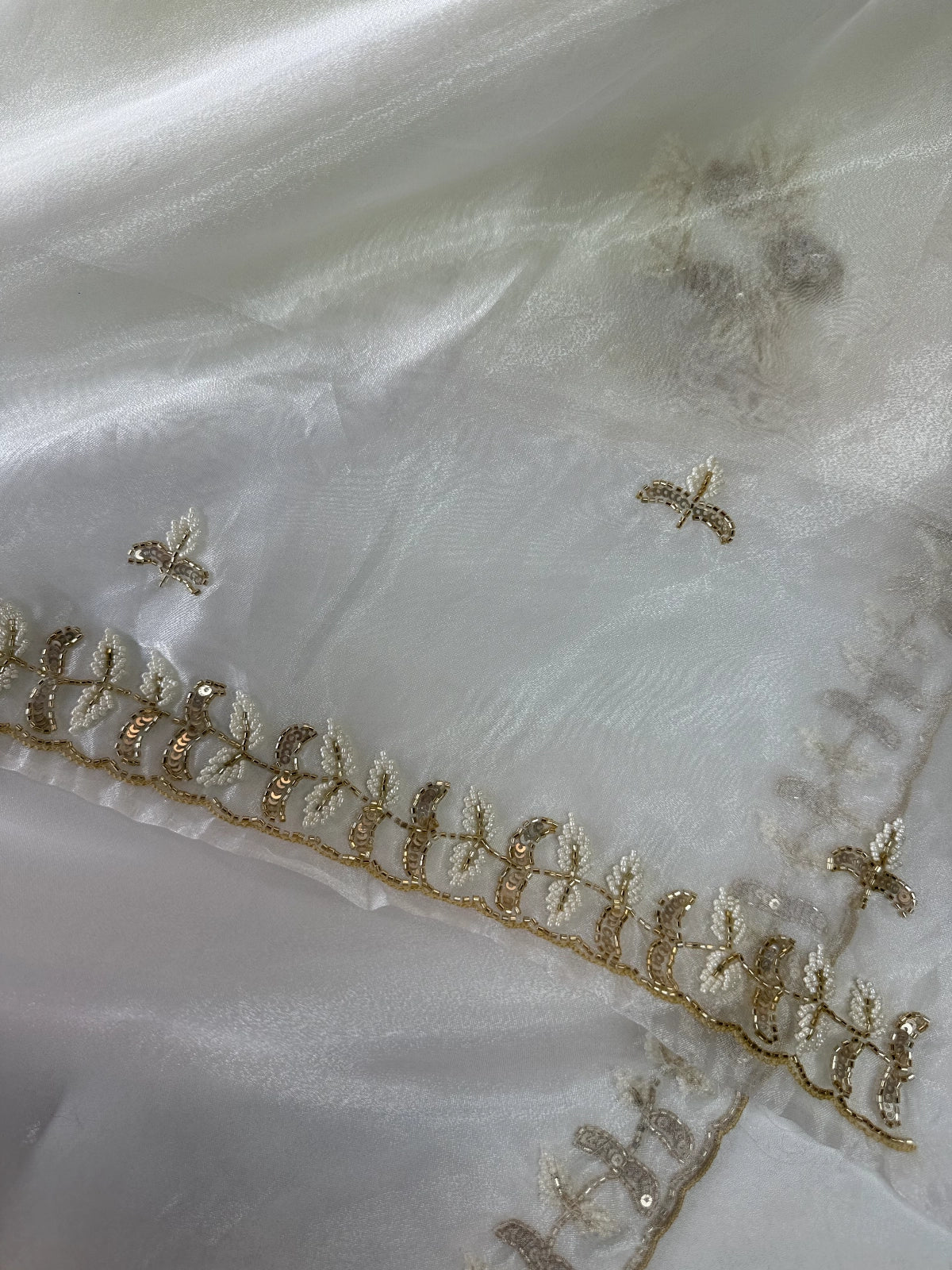 Glass organza saree adorned with intricate handwork along the borders. The blouse features matching handwork, with the same running border on the sleeve ends and beautifully spread handwork across the back. The saree body is embellished with delicate handworked buta motifs, adding to its charm and making it the highlight of the piece.