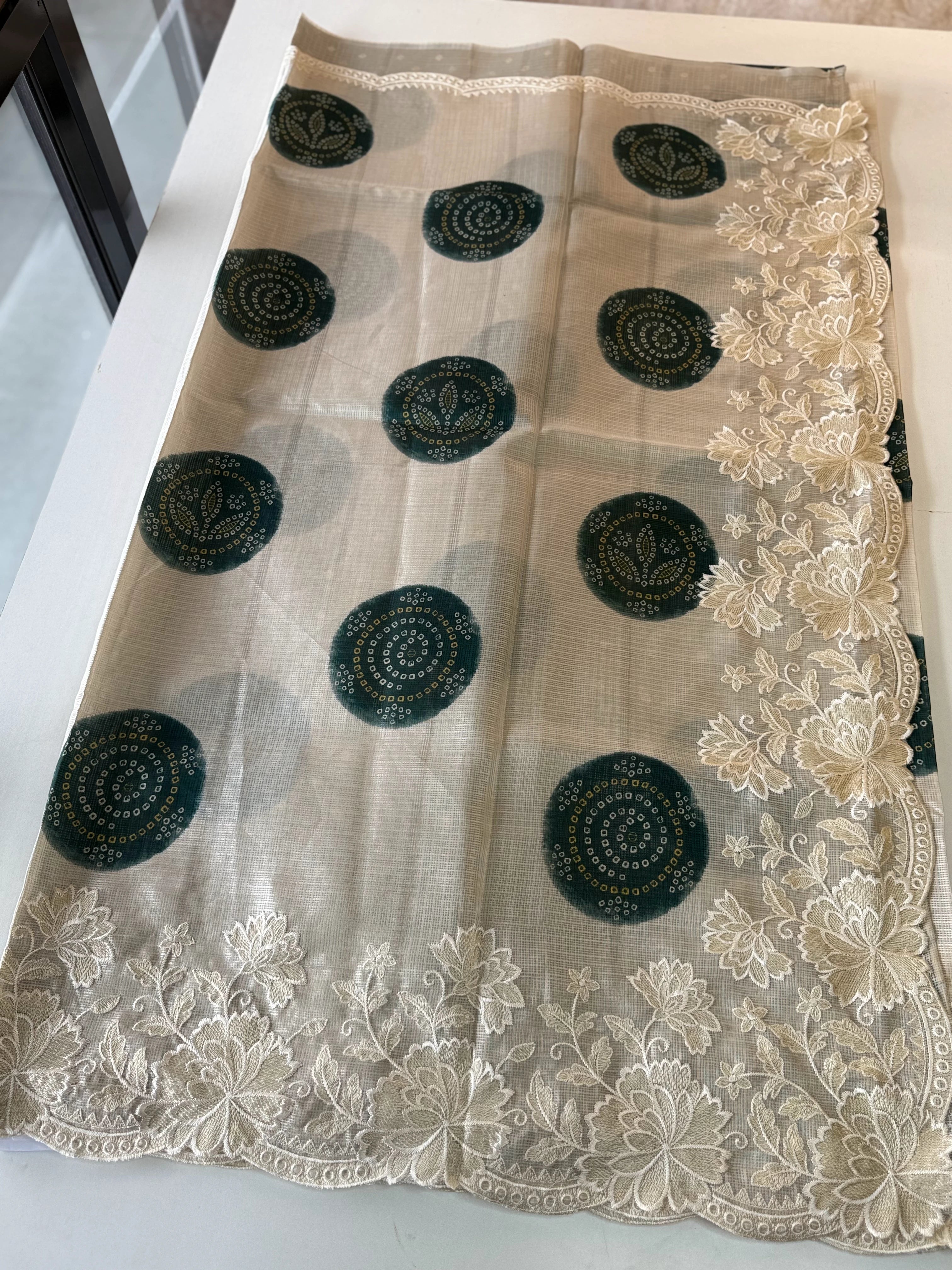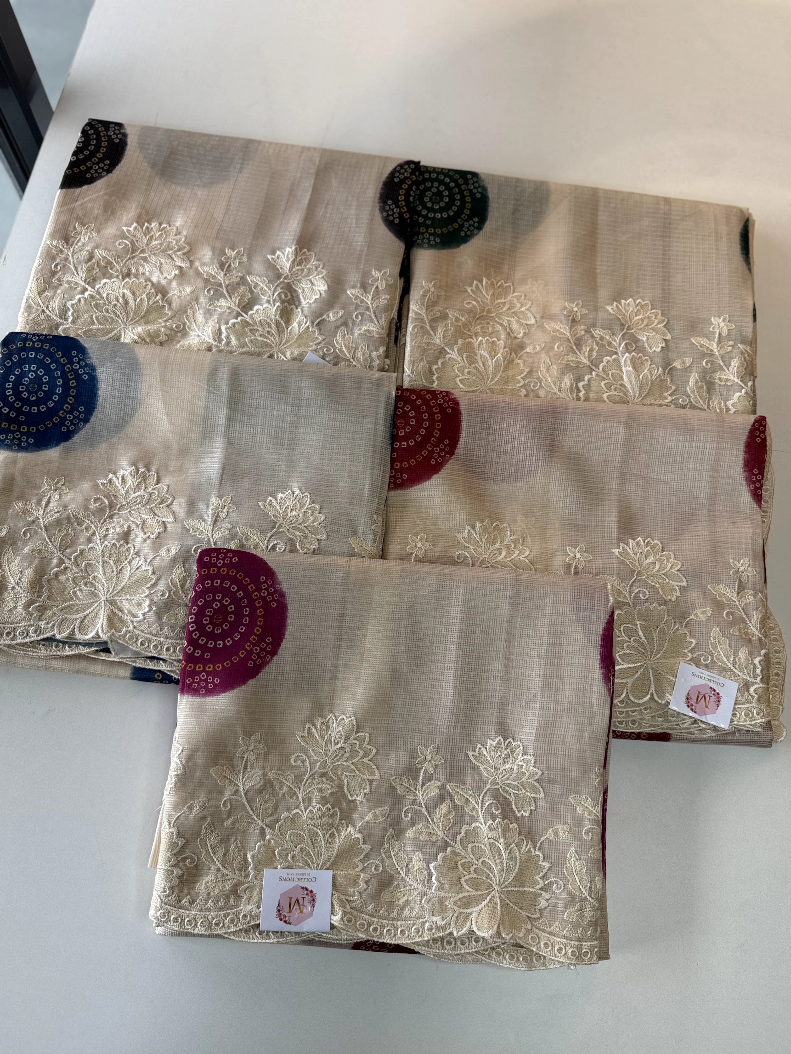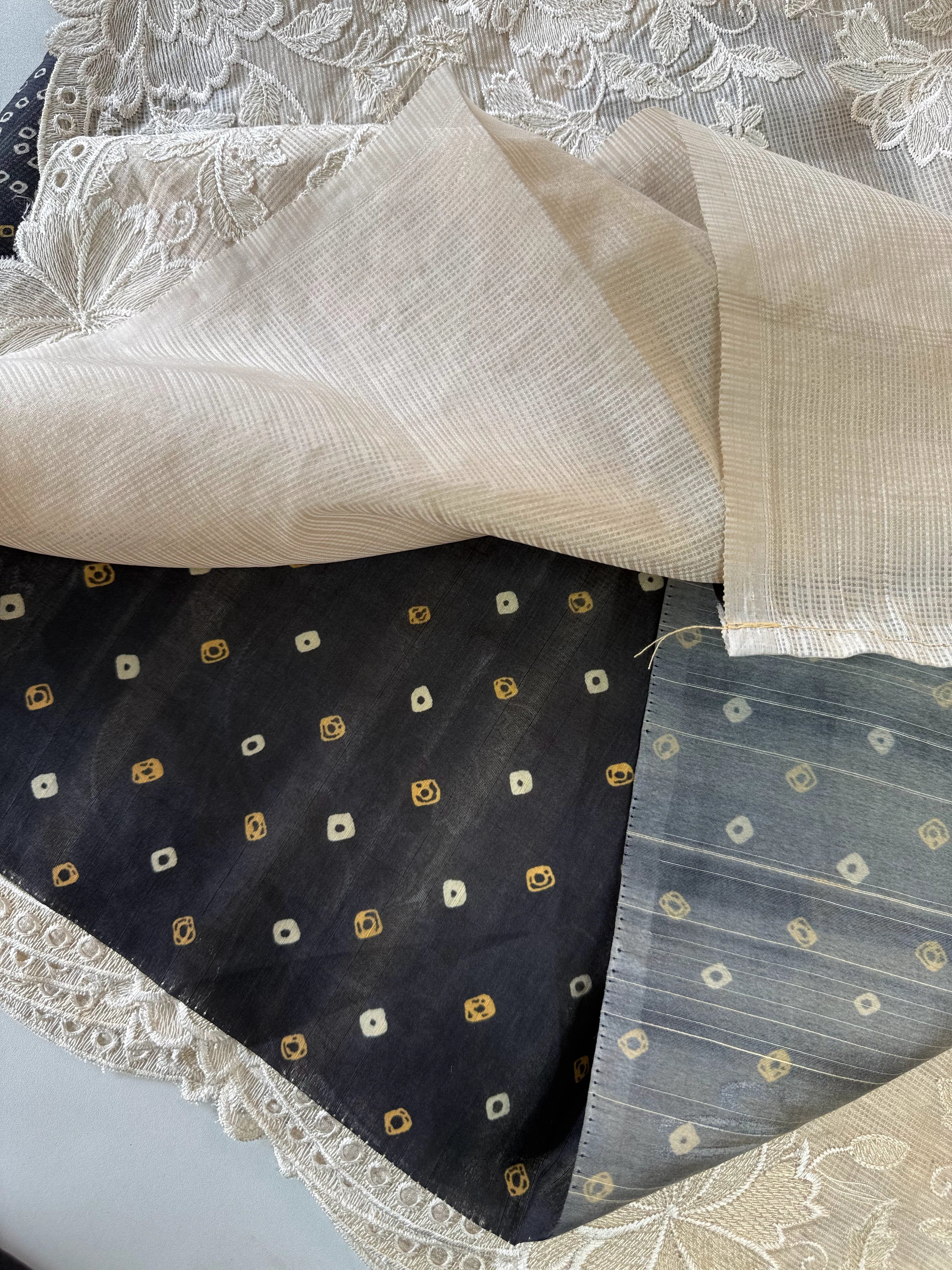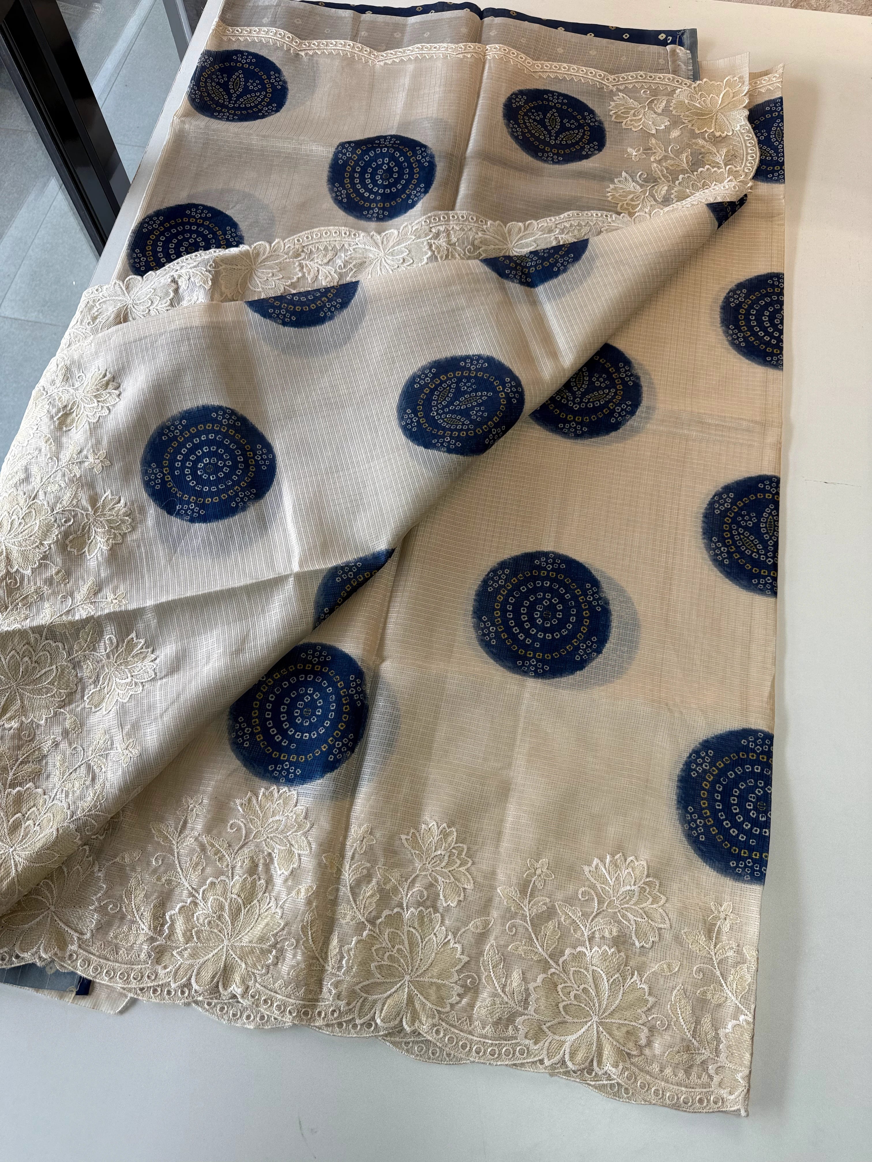 Silky Kotta Saree featuring a thread-worked border and elegant block Bandhani print across the body. Paired with a contrast semi-silk blouse piece, this saree blends traditional artistry with a graceful modern appeal — lightweight, flowy, and perfect for festive or semi-formal occasions.