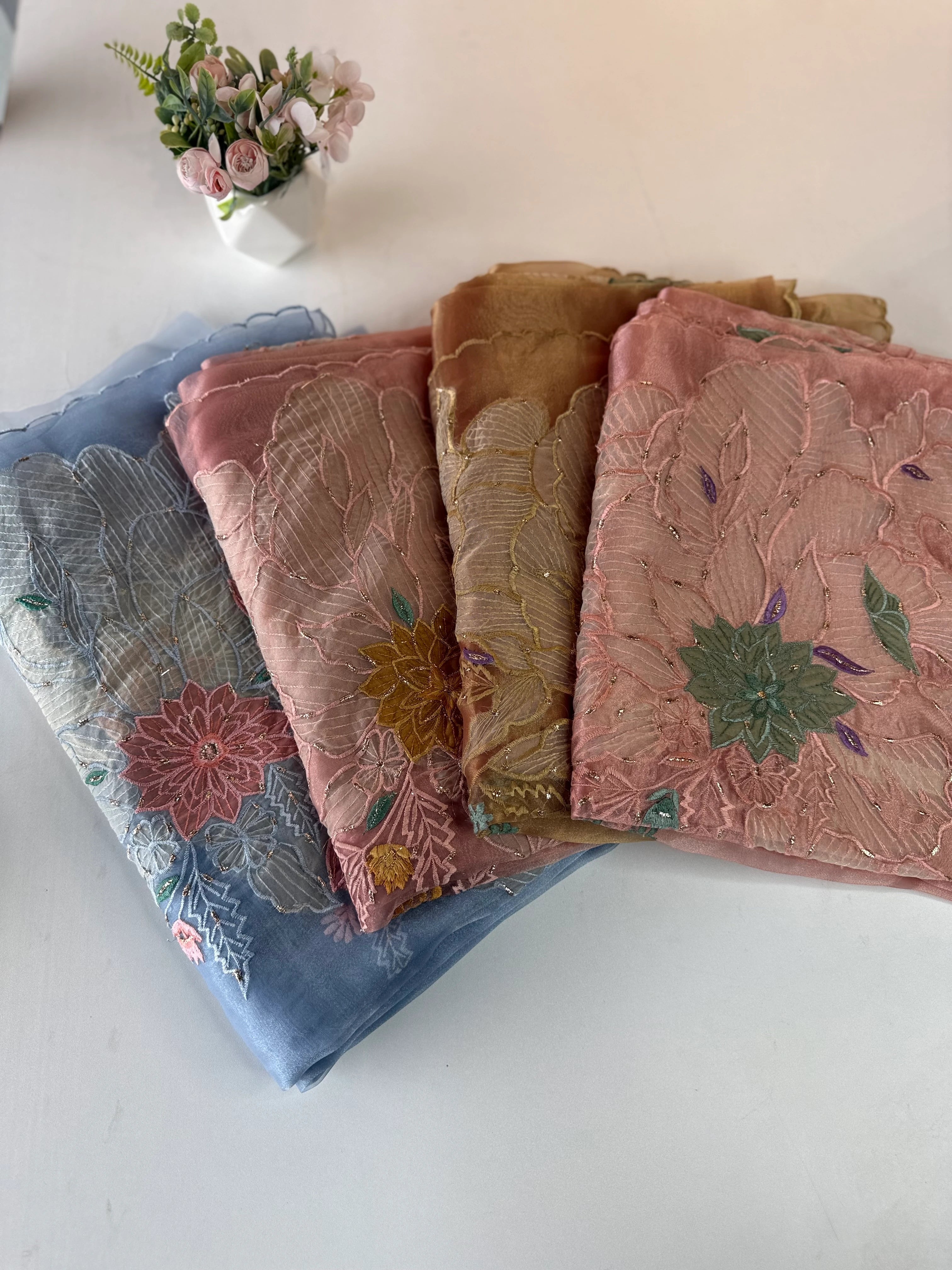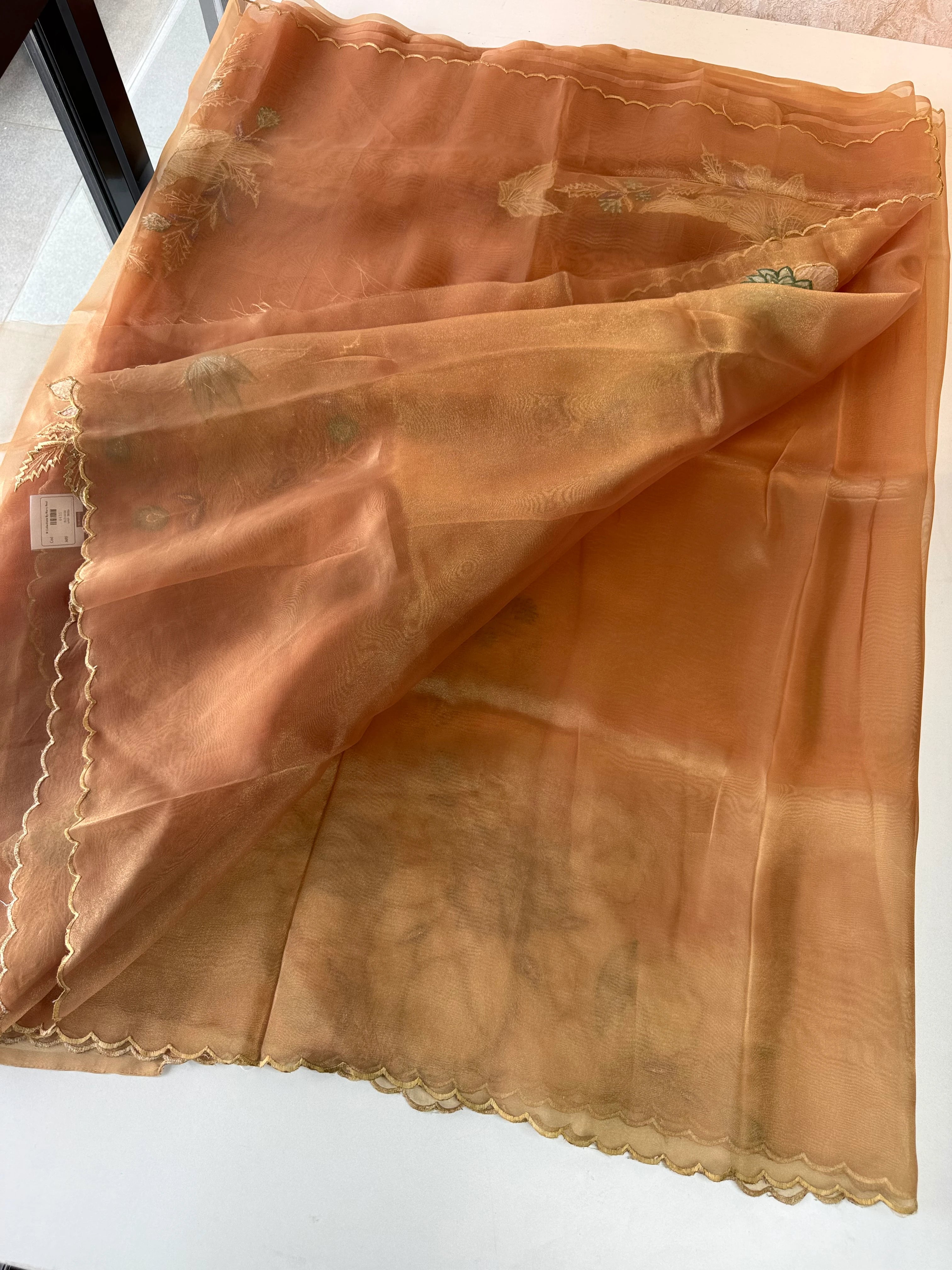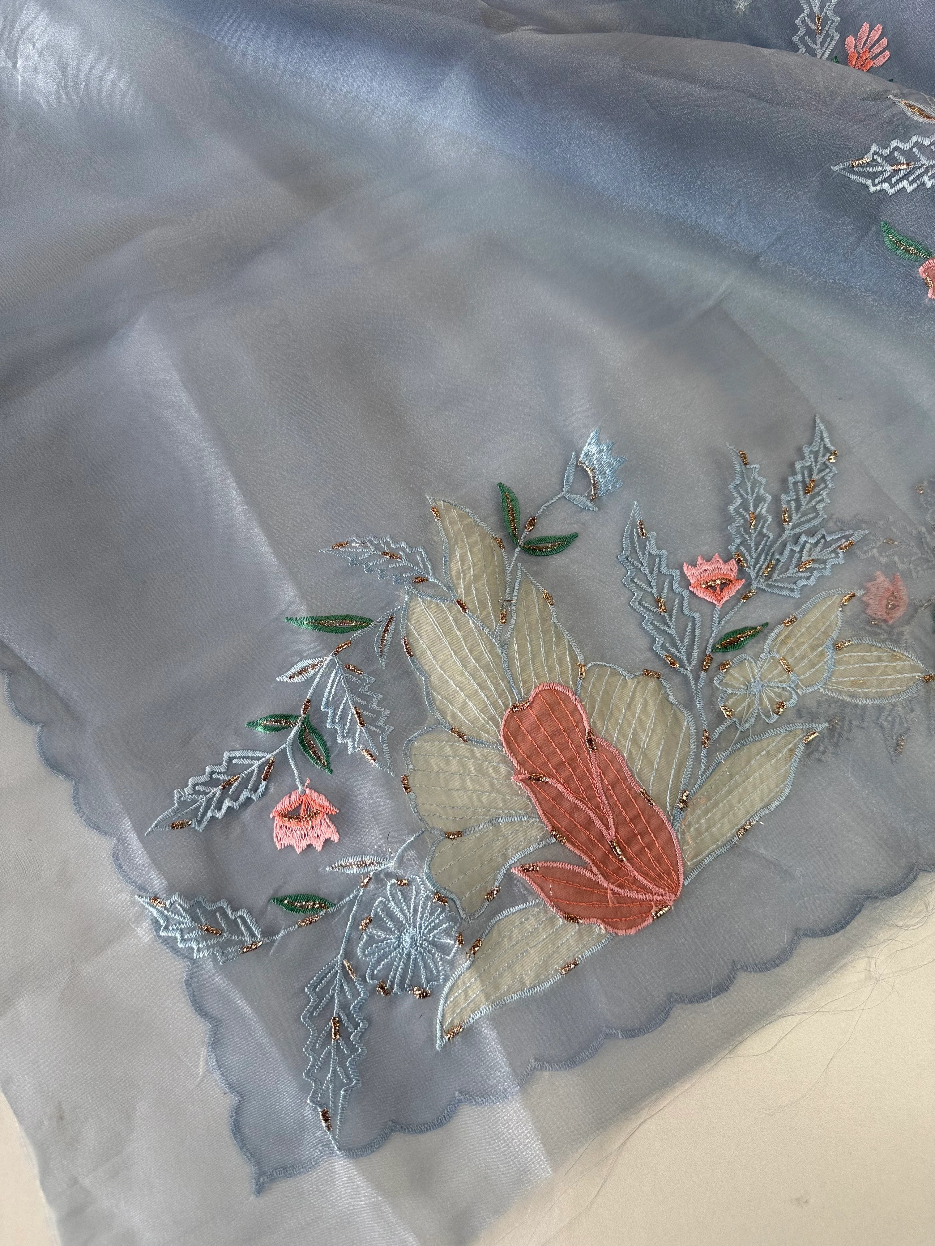 This saree is crafted from glass organza, a sheer and lightweight fabric known for its smooth, crisp texture and subtle shine. It holds its shape beautifully, giving a rich, structured drape that feels light and graceful. The slightly glossy finish adds an elegant touch, making it perfect for special occasions.