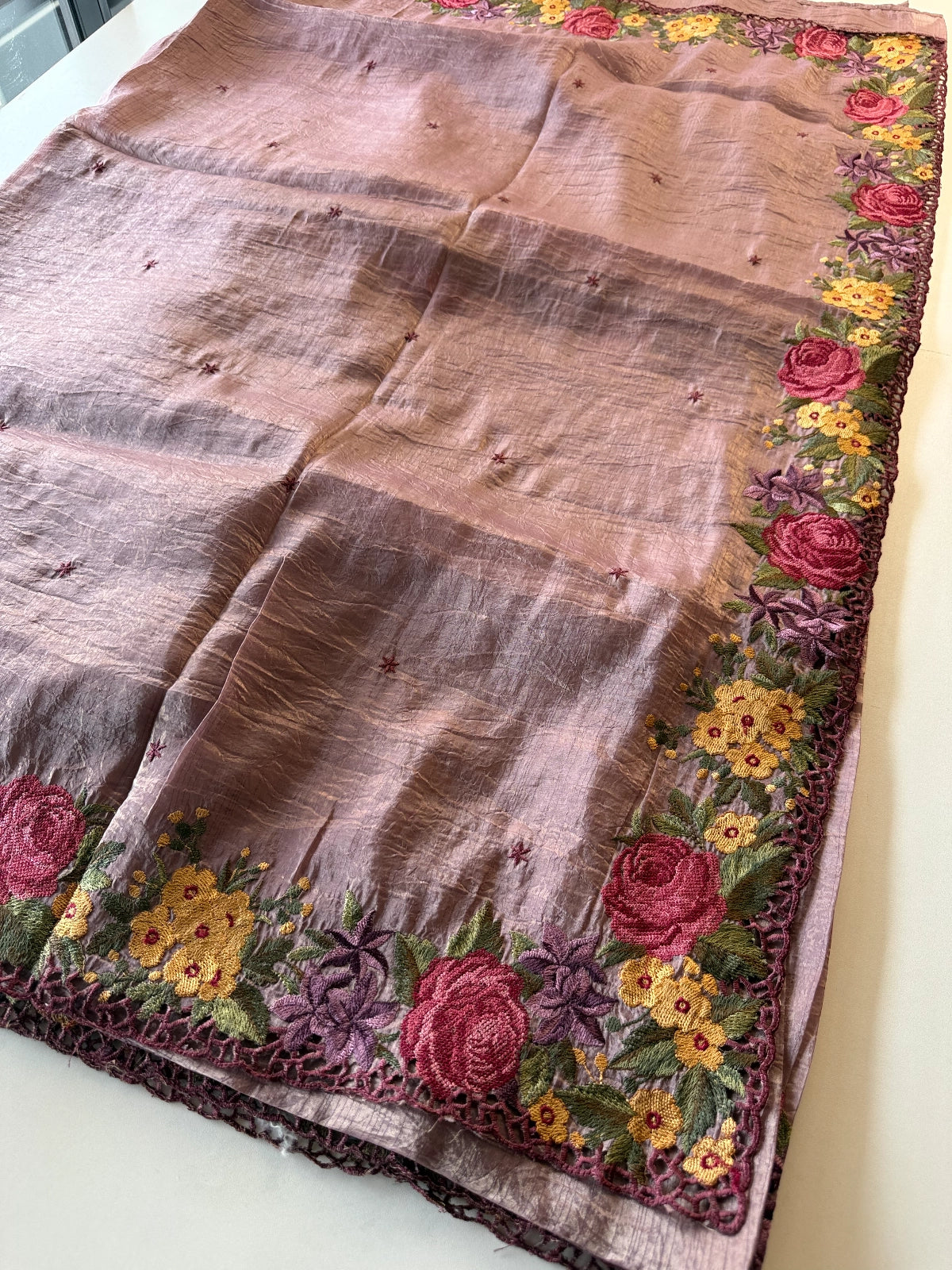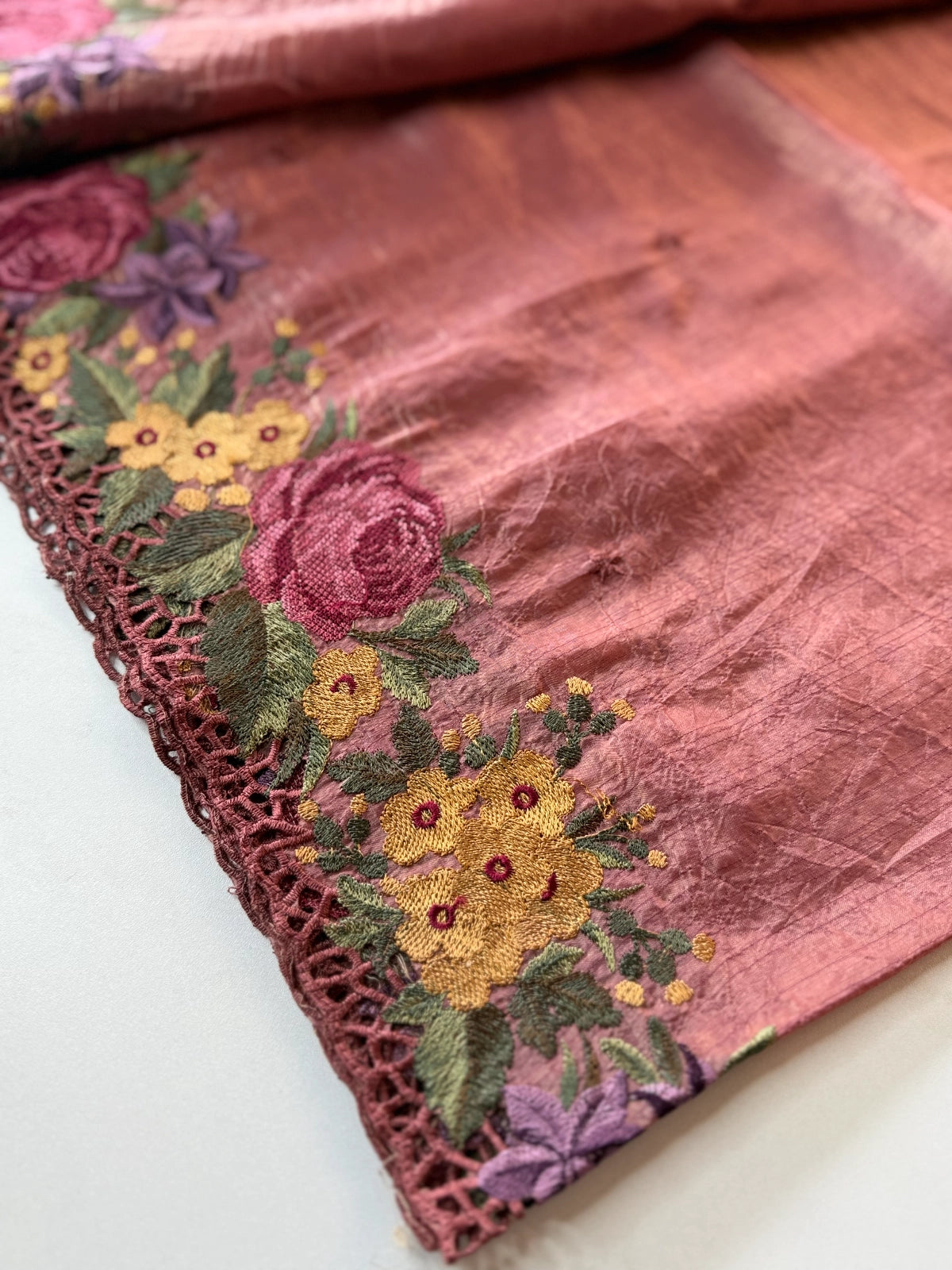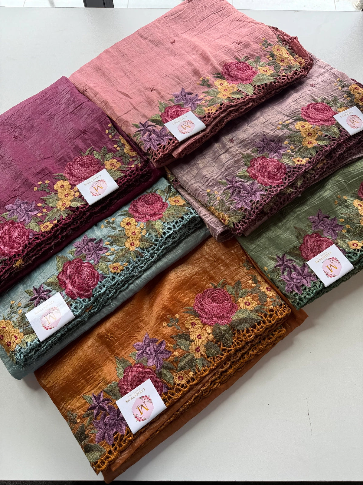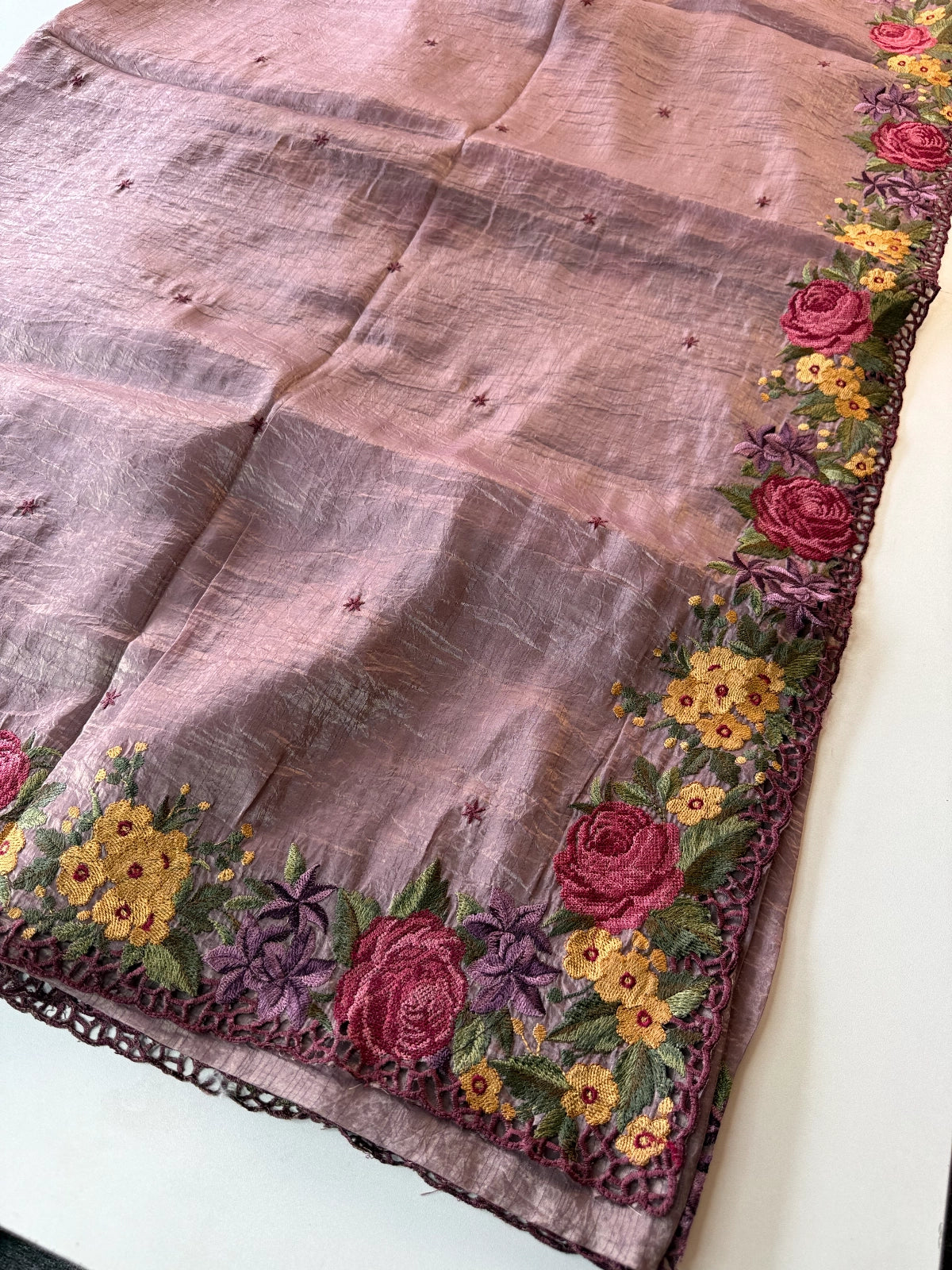 A graceful crushed organza saree featuring a delicate cutworked border adorned with threadworked floral patterns. Paired with a running blouse piece designed with matching sleeve work. Flowy, lightweight, and non-transparent — a perfect blend of elegance and comfort.