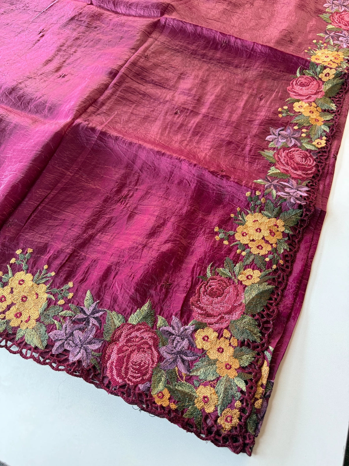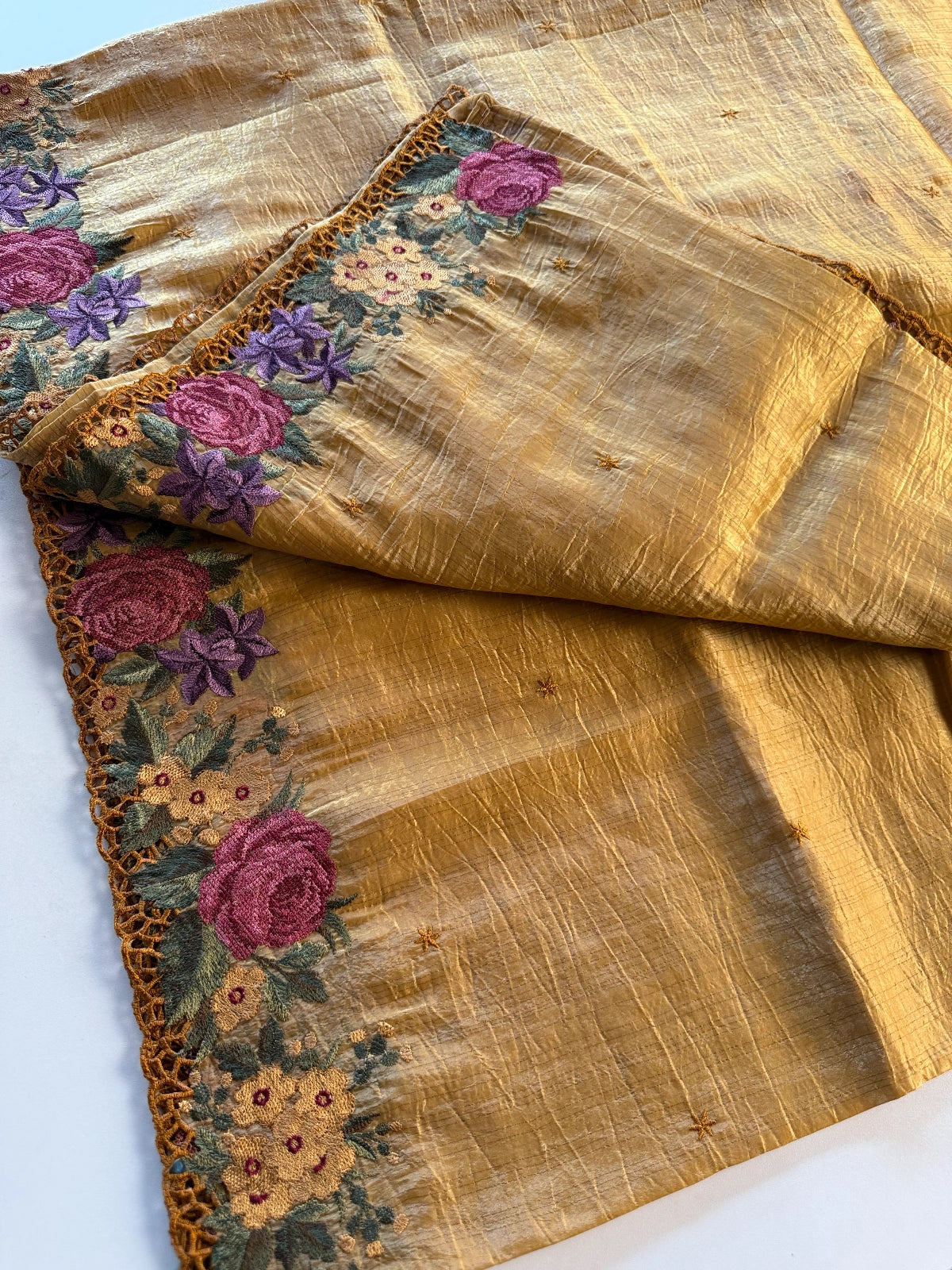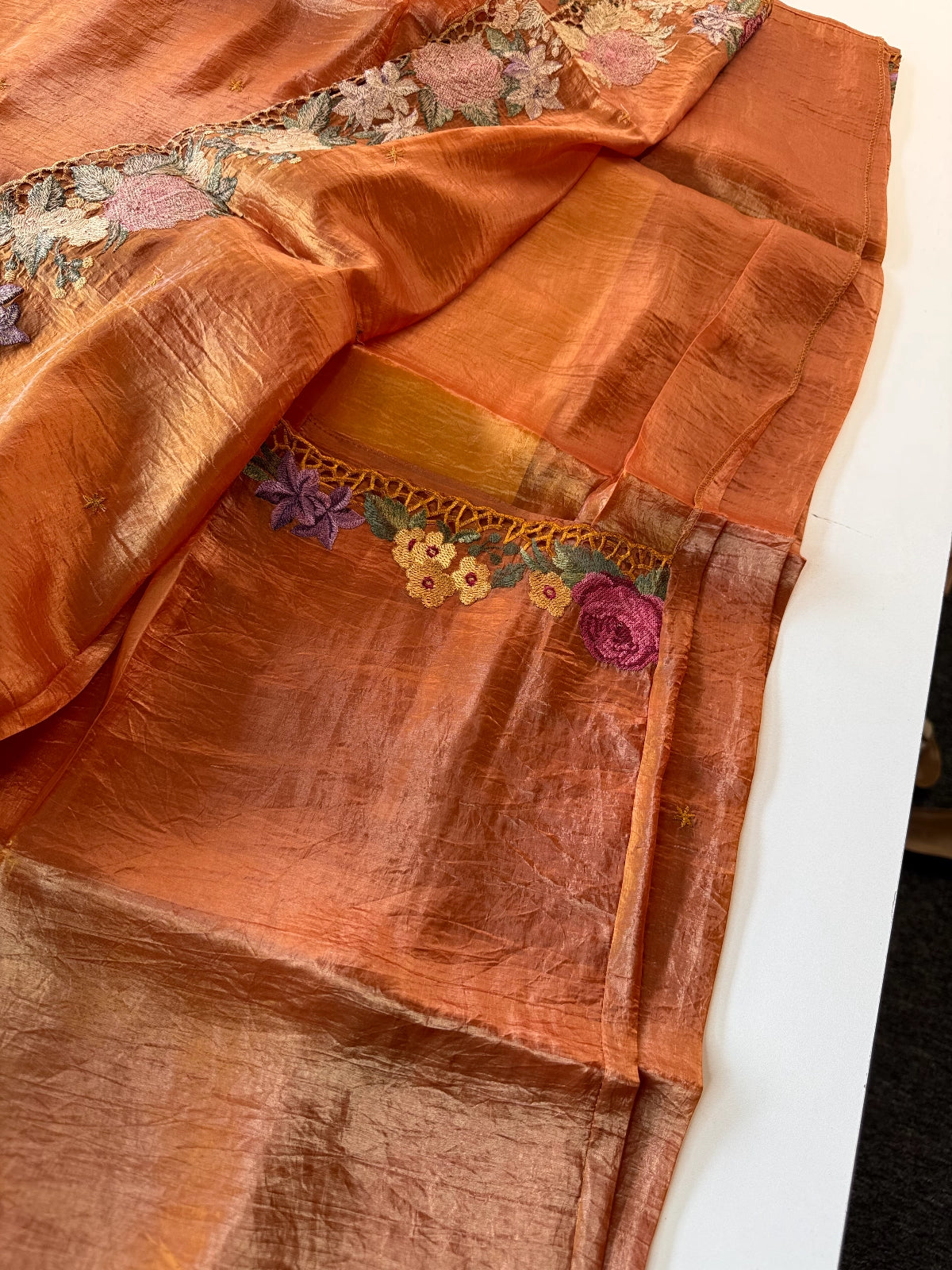 A graceful crushed organza saree featuring a delicate cutworked border adorned with threadworked floral patterns. Paired with a running blouse piece designed with matching sleeve work. Flowy, lightweight, and non-transparent — a perfect blend of elegance and comfort.