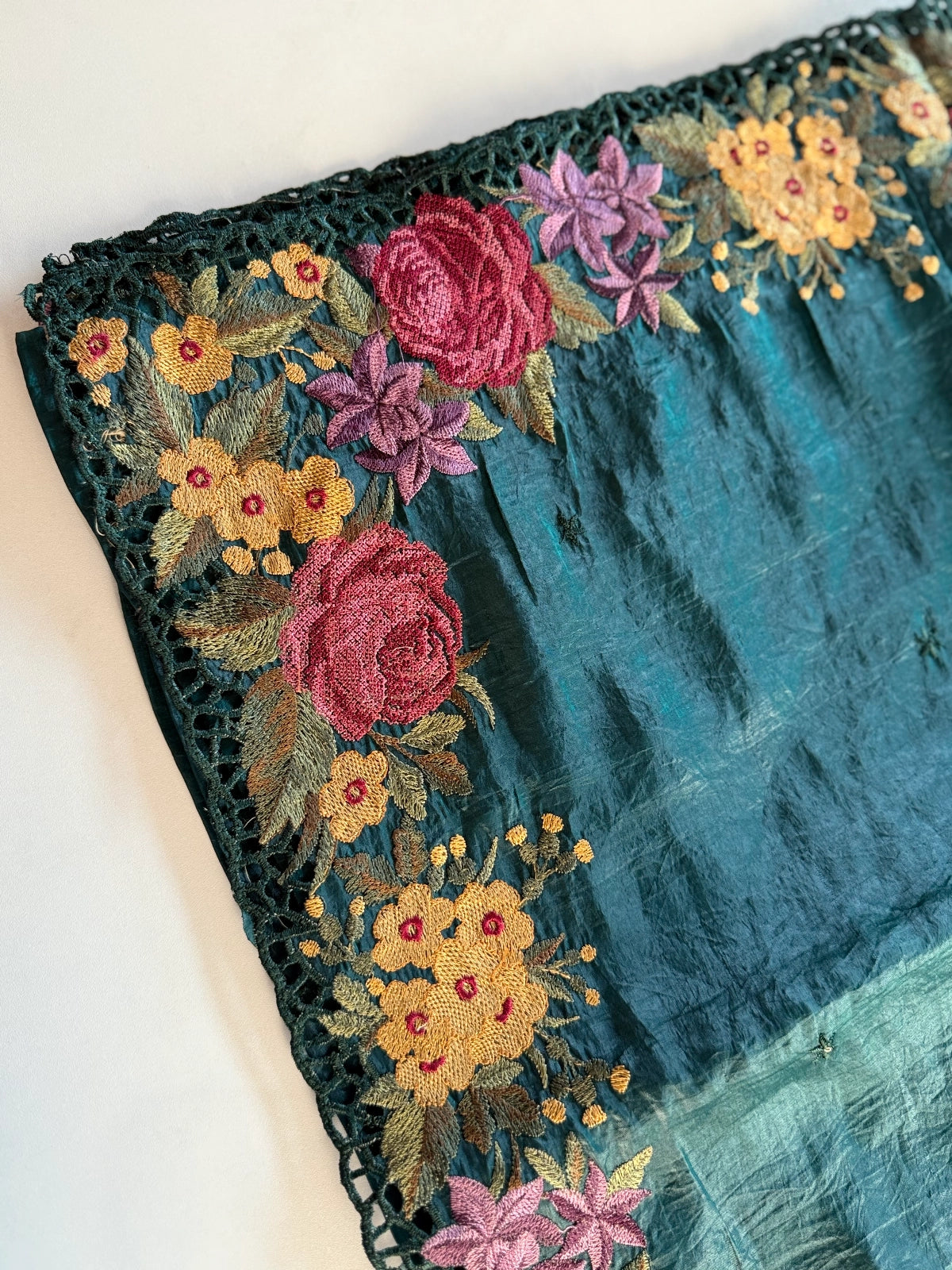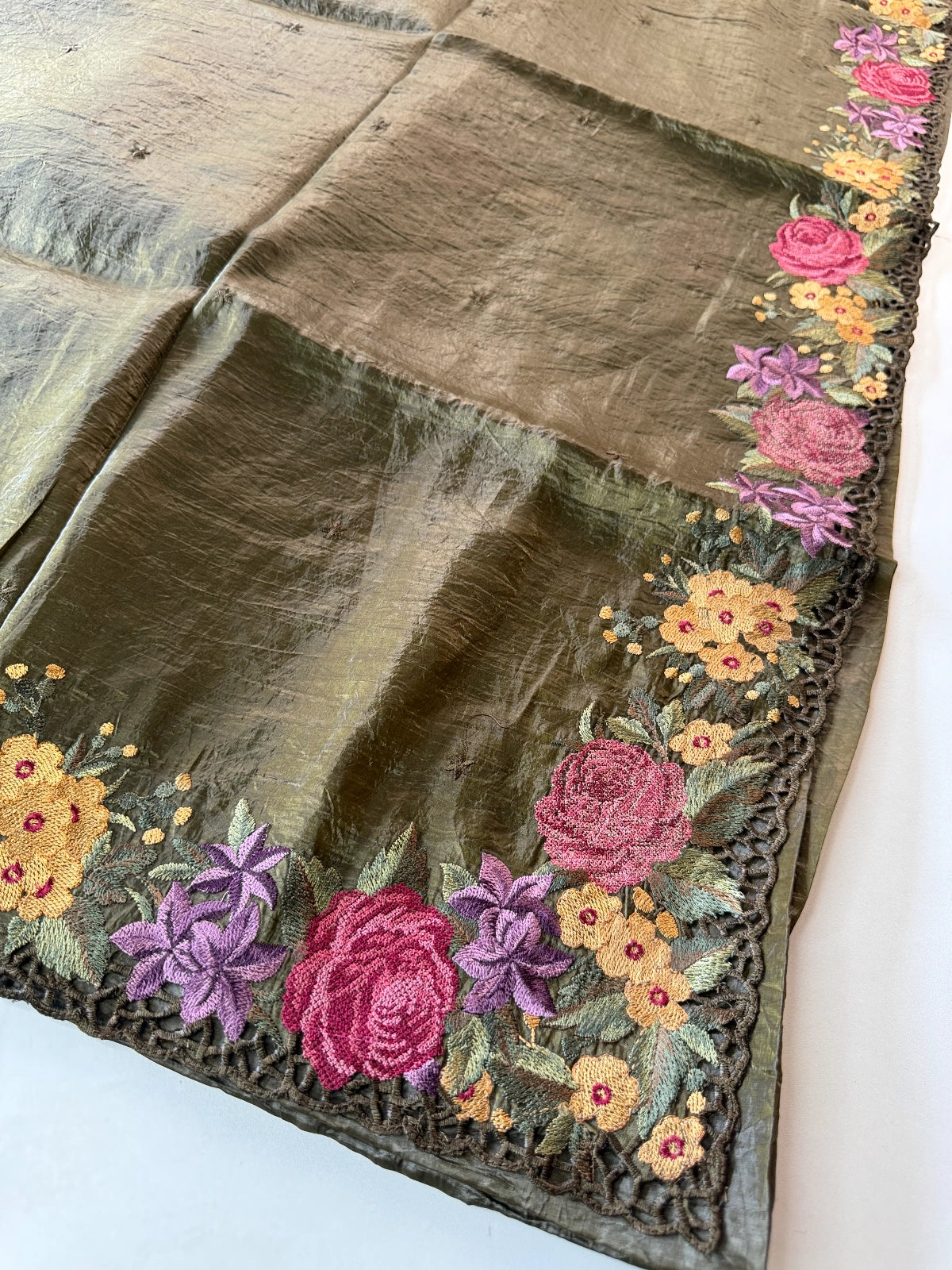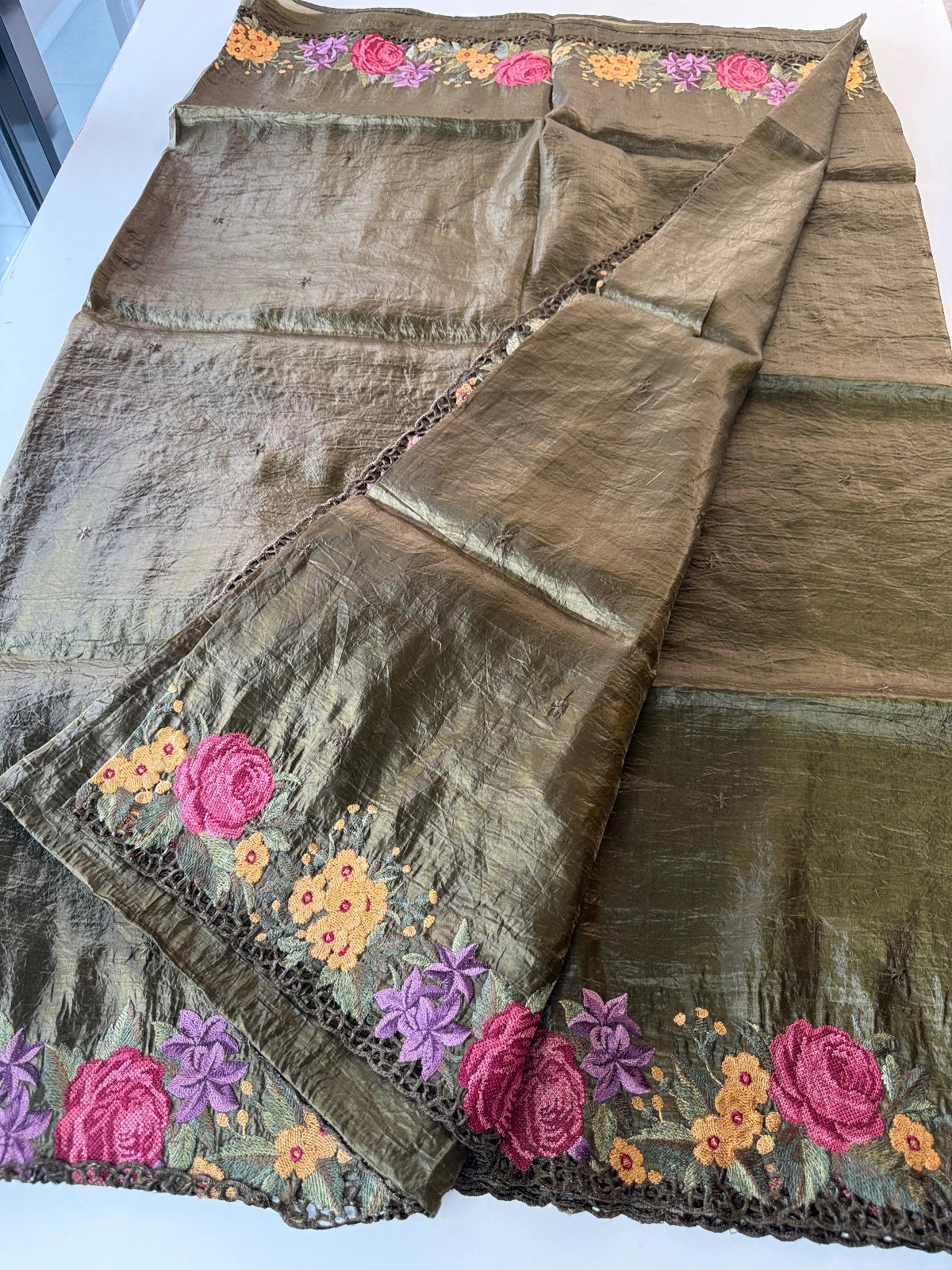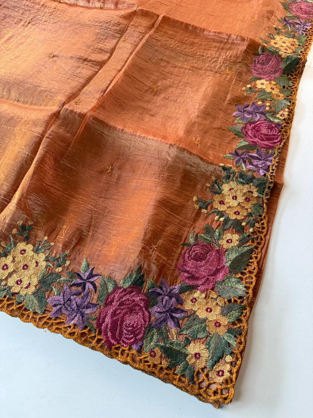 A graceful crushed organza saree featuring a delicate cutworked border adorned with threadworked floral patterns. Paired with a running blouse piece designed with matching sleeve work. Flowy, lightweight, and non-transparent — a perfect blend of elegance and comfort.