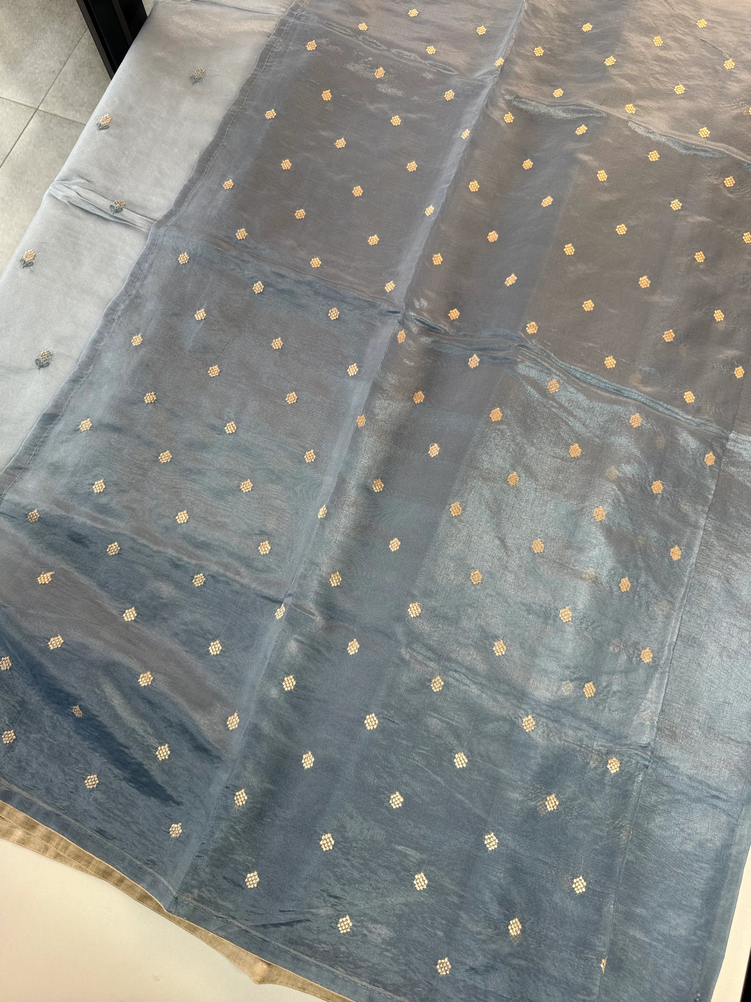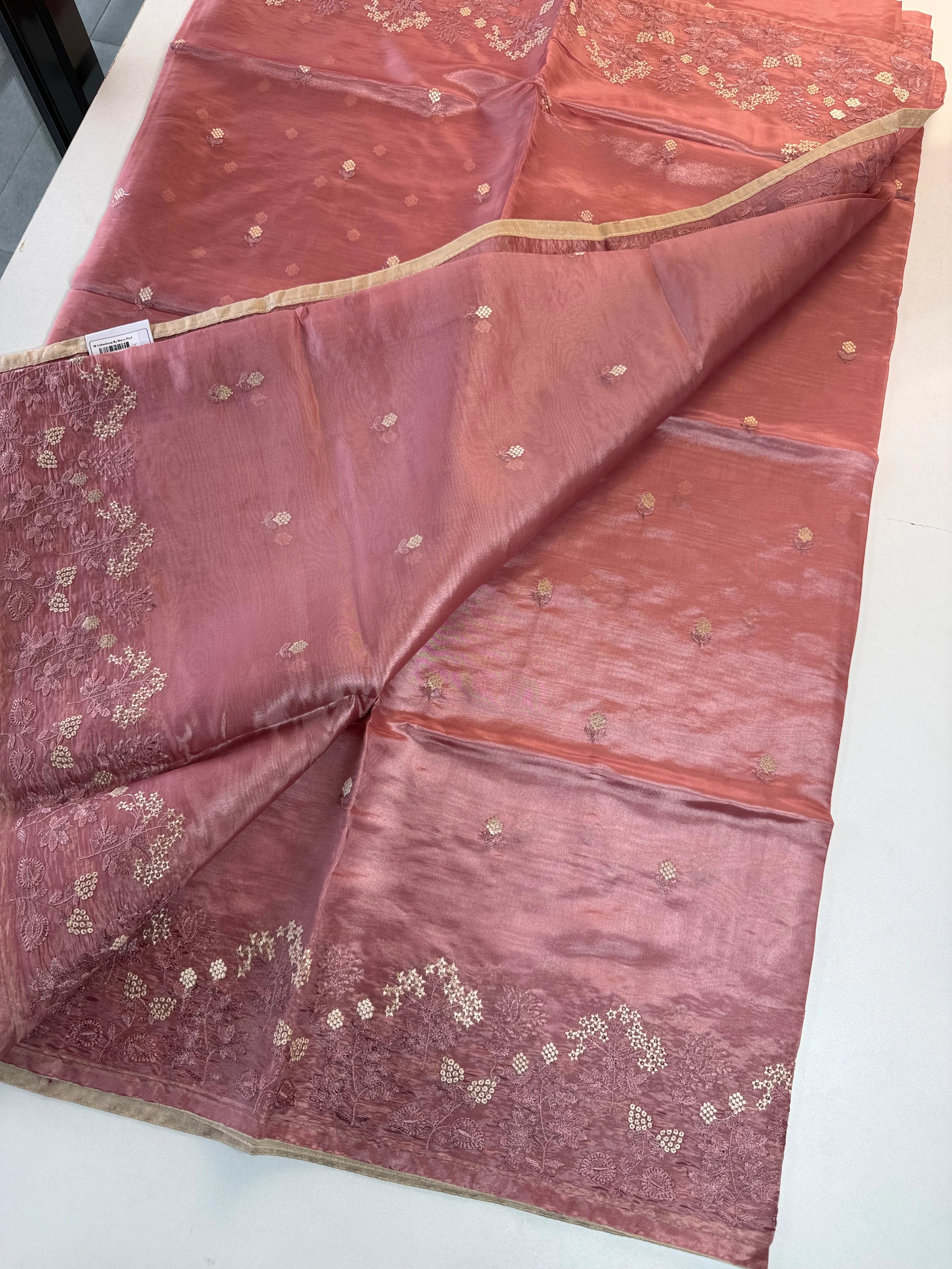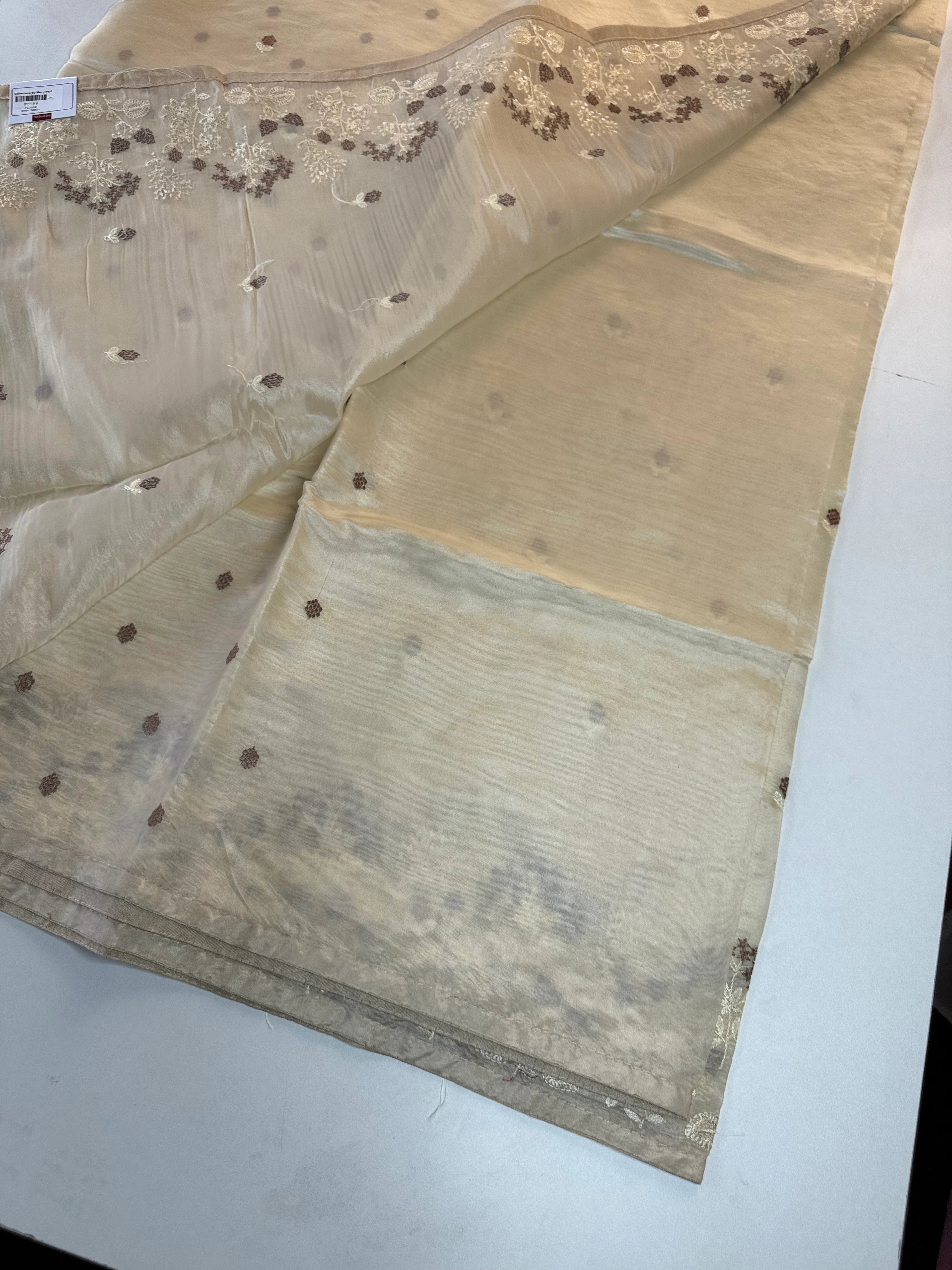 An elegant blended Uppada silk saree featuring delicate threadwork along the border and body, beautifully paired with a matching thread-worked blouse piece. The fabric carries a subtle shine and flow, making it a perfect drape for any occasion. Its lightly transparent texture adds a touch of allure while keeping the look graceful and sophisticated.