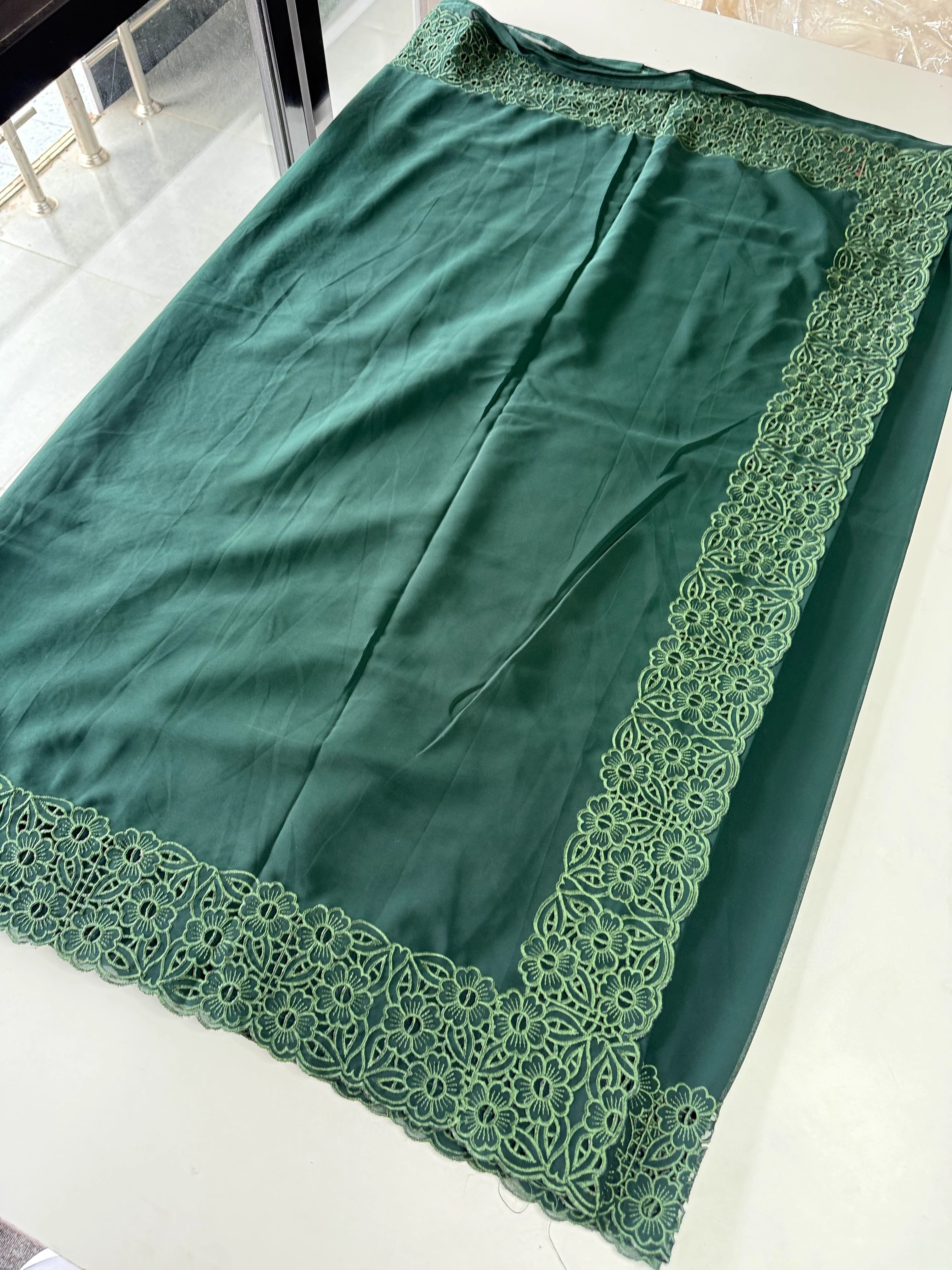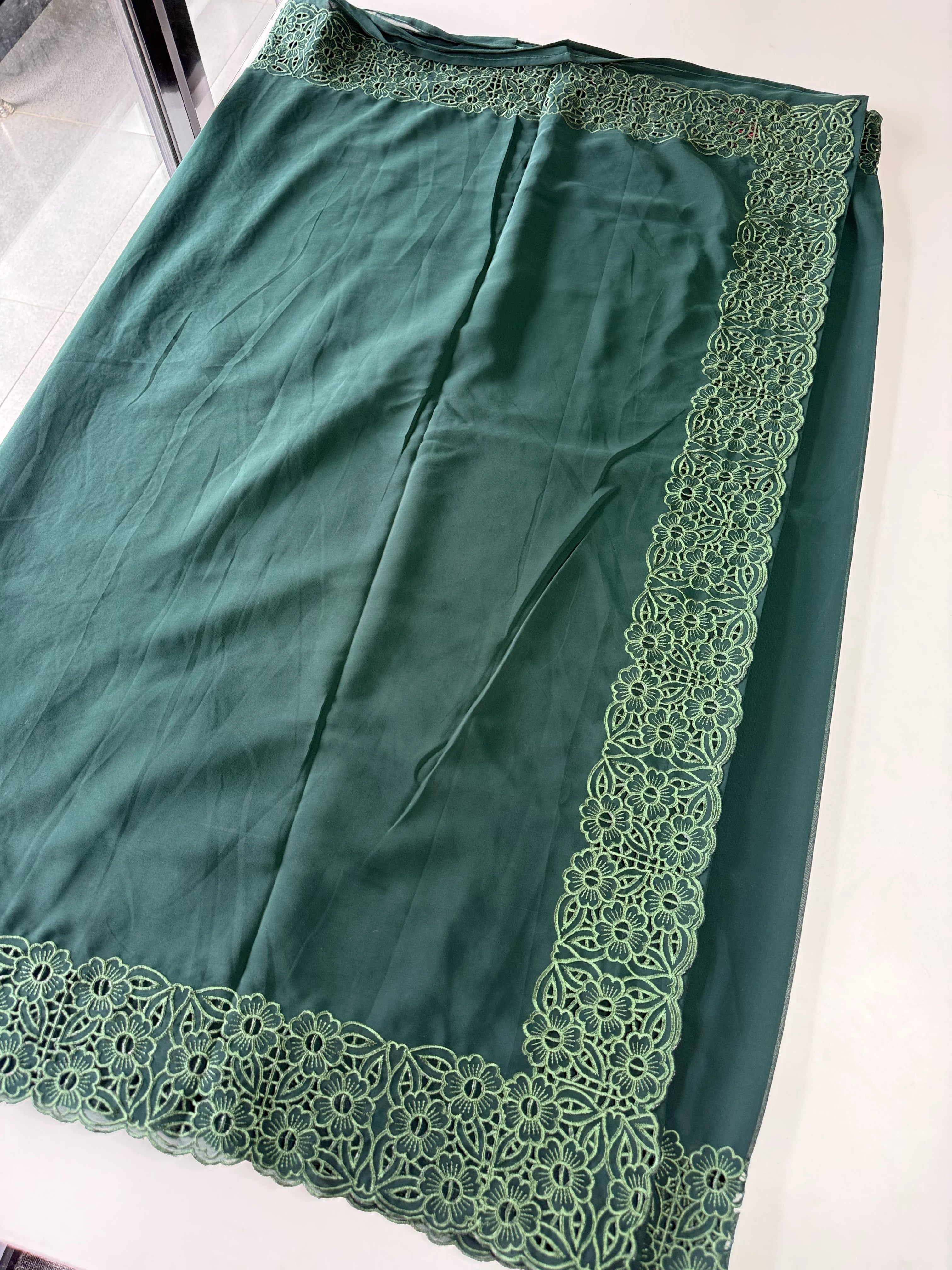 Georgette Saree – A flowy drape crafted in lightweight georgette, featuring cutwork precision edging along the borders. The saree comes with a running blouse piece, detailed with matching sleeve-end work to complete the elegant look.
