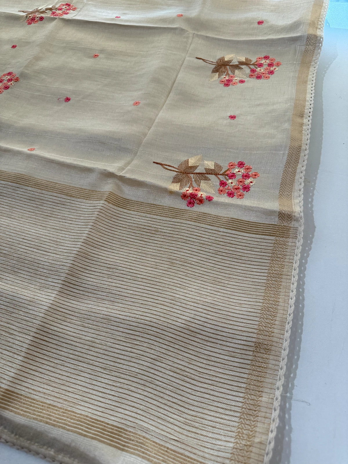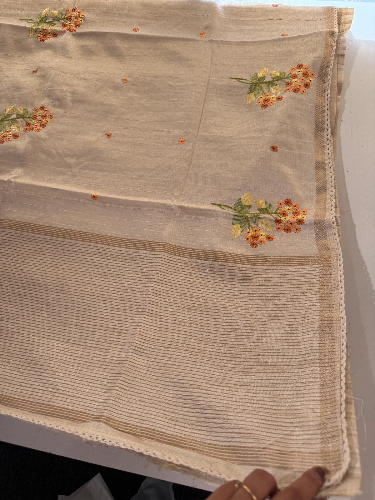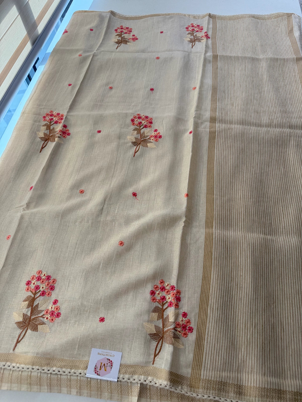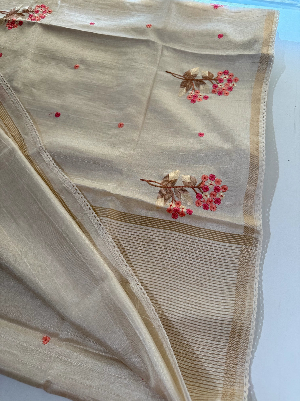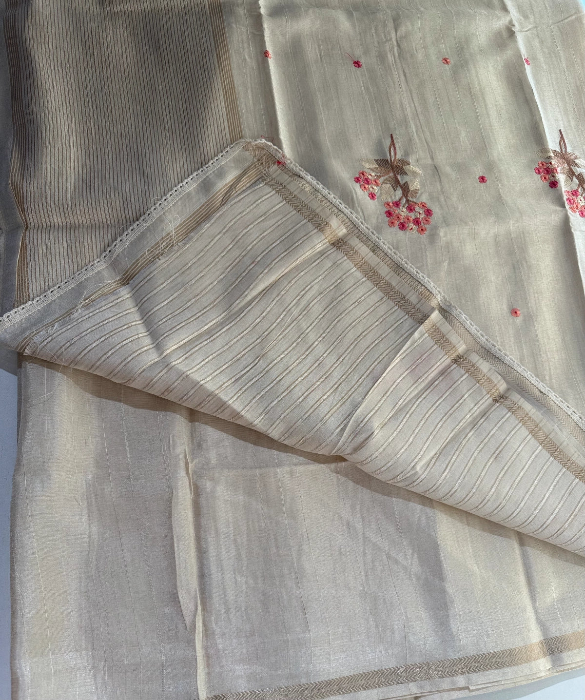 Elegant and charming, this Semi-Tussar Saree features beautifully spread floral threadworked motifs across the body, adding a touch of sophistication. The saree is paired with a semi-jute pallu for a subtle textured contrast and comes with a striped blouse piece in matching semi-tussar fabric. Lightweight, non-transparent, and effortlessly graceful — perfect for party wear and special occasions.