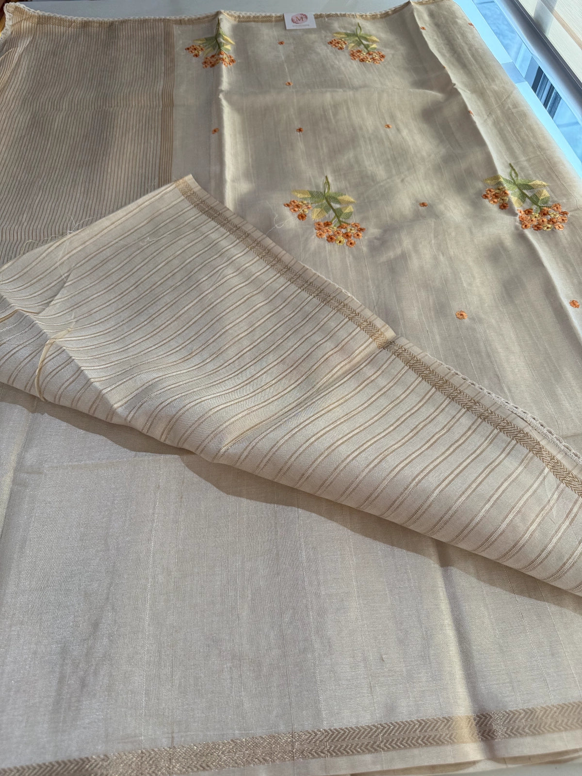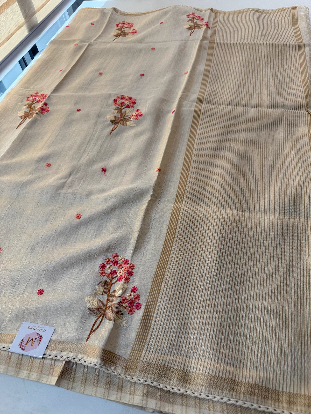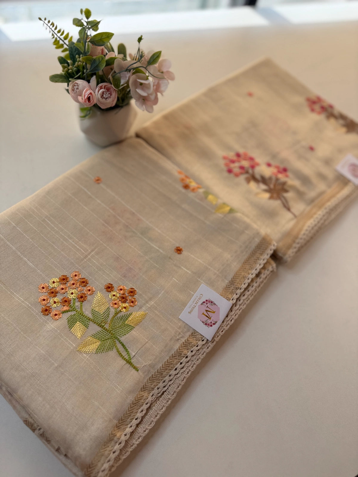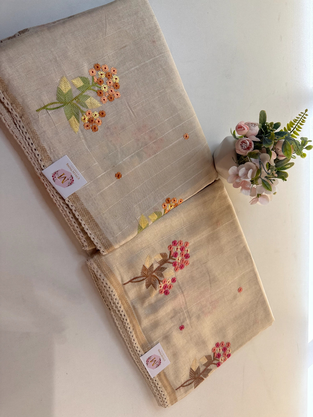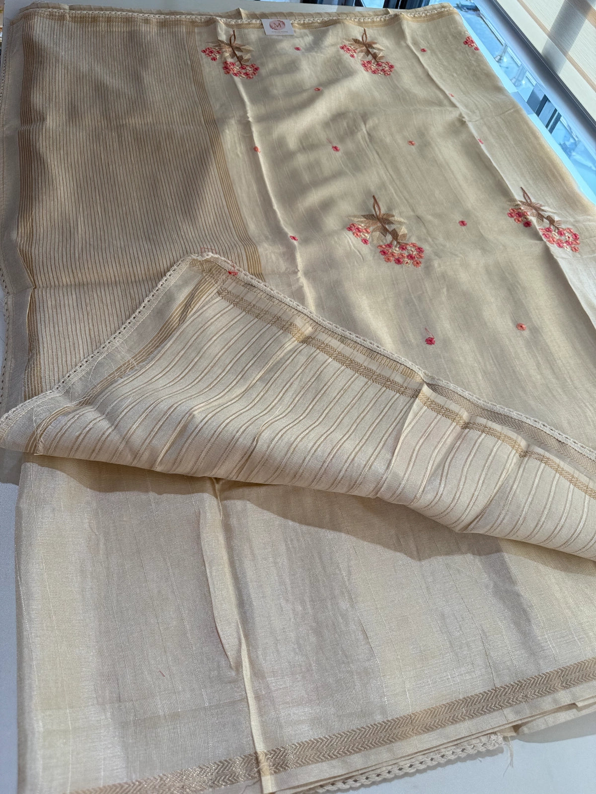 Elegant and charming, this Semi-Tussar Saree features beautifully spread floral threadworked motifs across the body, adding a touch of sophistication. The saree is paired with a semi-jute pallu for a subtle textured contrast and comes with a striped blouse piece in matching semi-tussar fabric. Lightweight, non-transparent, and effortlessly graceful — perfect for party wear and special occasions.