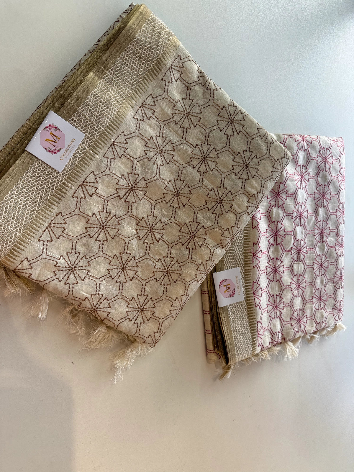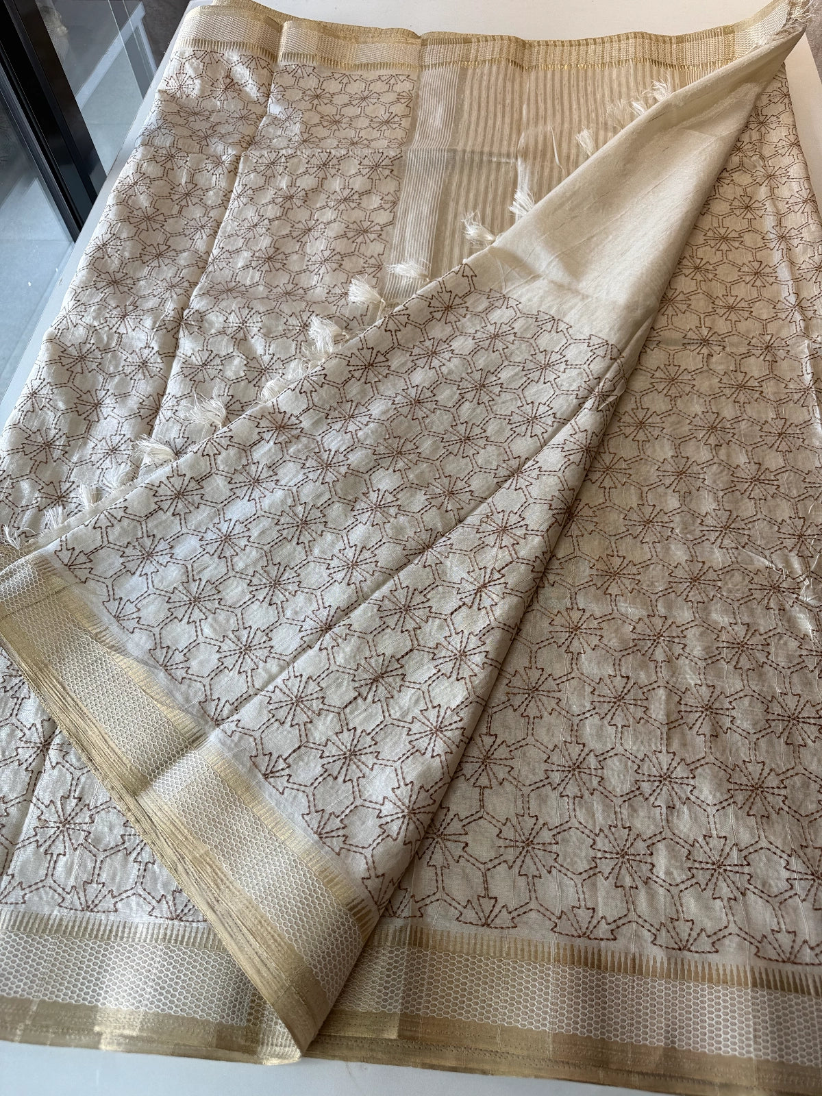 A graceful Semi Tussar Saree featuring intricate threadwork detailing across the body, enhanced with an elegant golden weaved border that adds a touch of richness. The saree comes with a striped blouse piece crafted in the same semi-Tessa fabric and a beautifully woven semi-jute pallu, completing the traditional yet contemporary look. Perfect for festive wear or elegant gatherings.