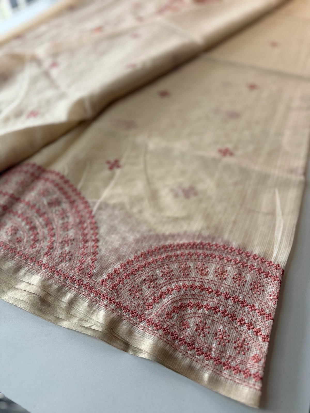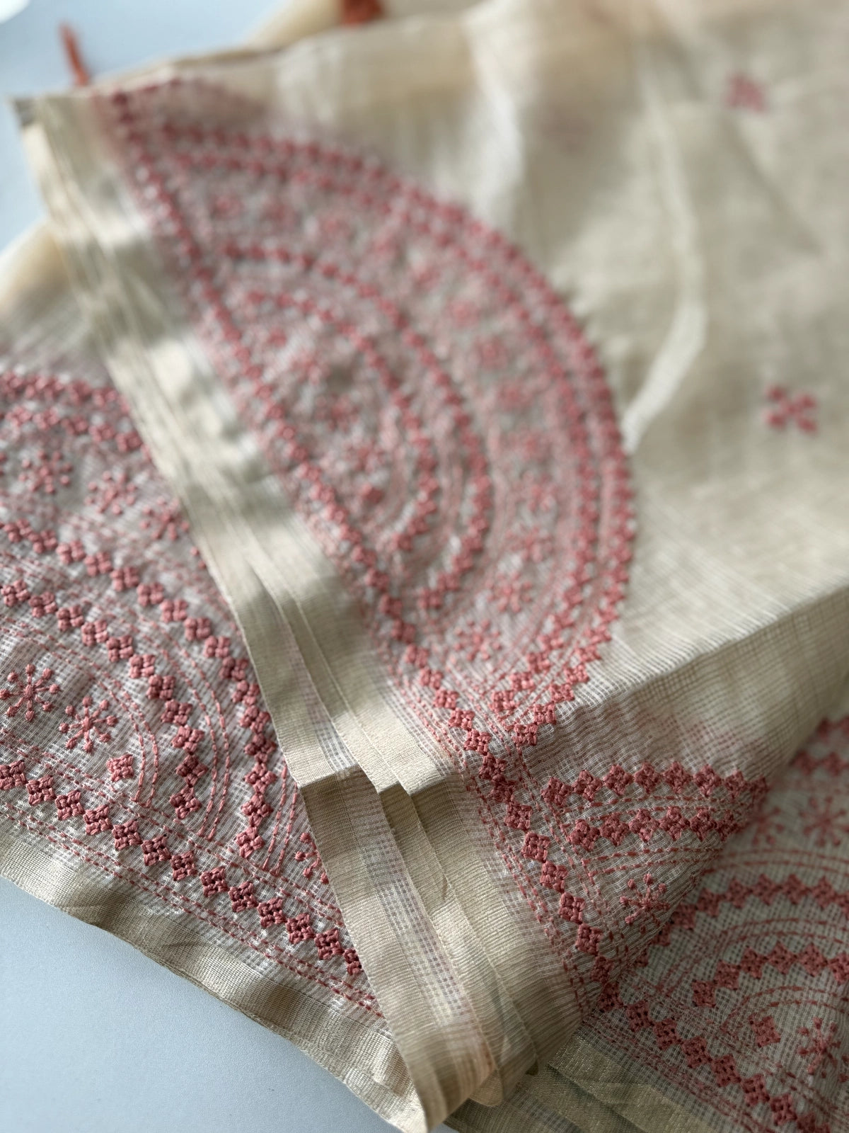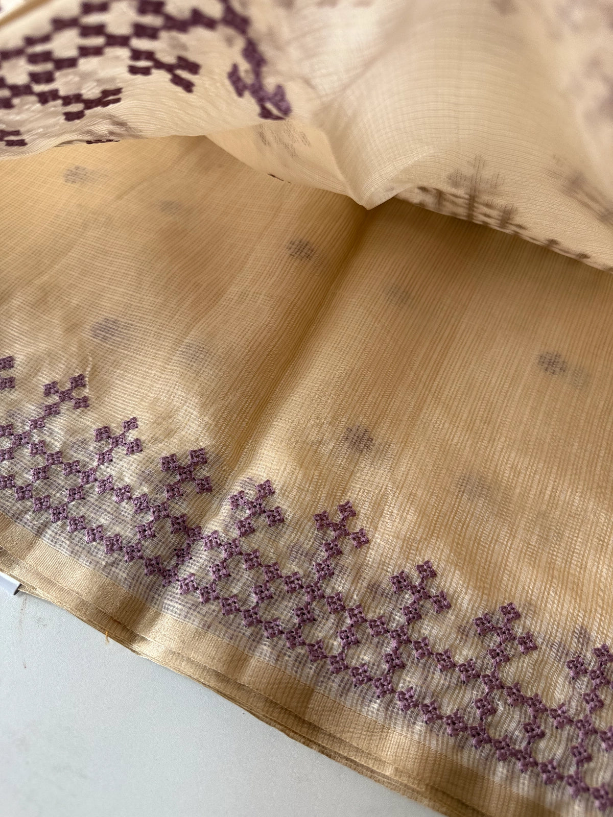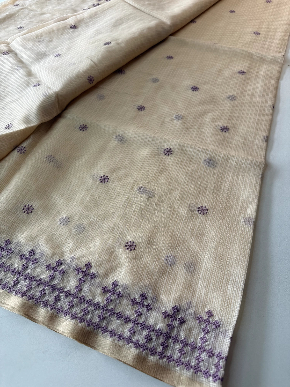 An elegant silky kotta saree adorned with detailed Kutch embroidery along the borders and scattered motifs across the body. The saree comes with a running blouse piece featuring delicate sleeve-end work, adding a refined handcrafted touch. Lightweight, semi-transparent, and perfect for graceful festive or occasion wear.