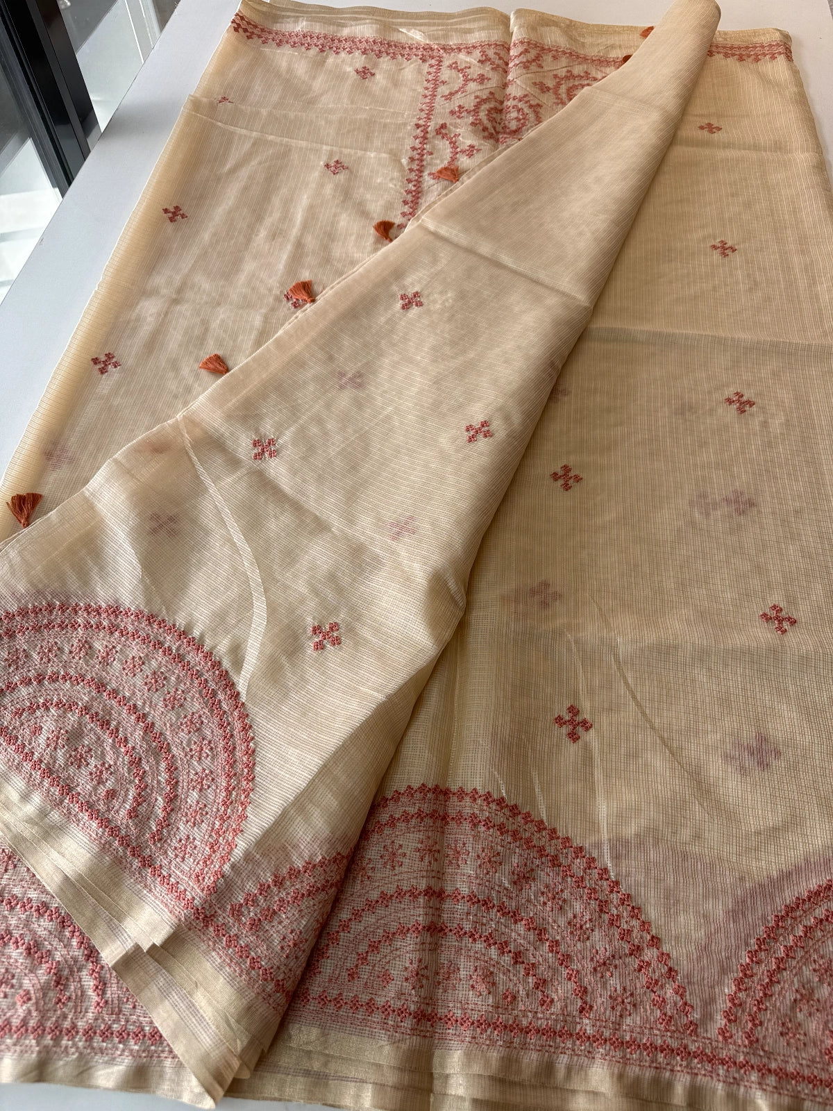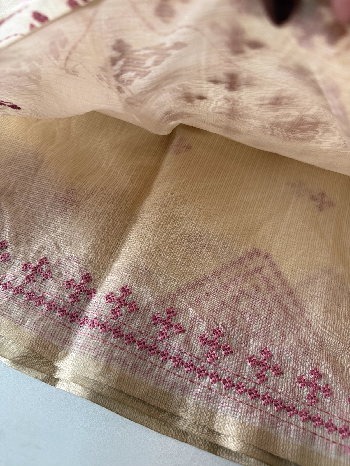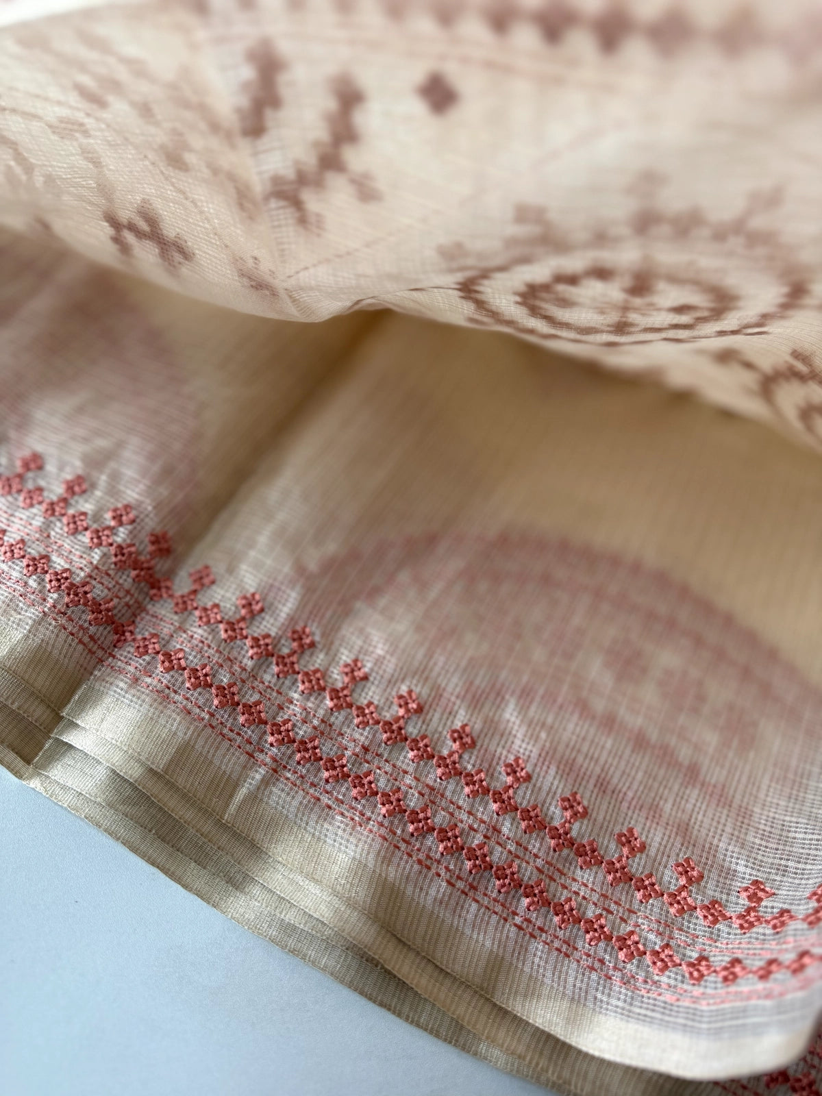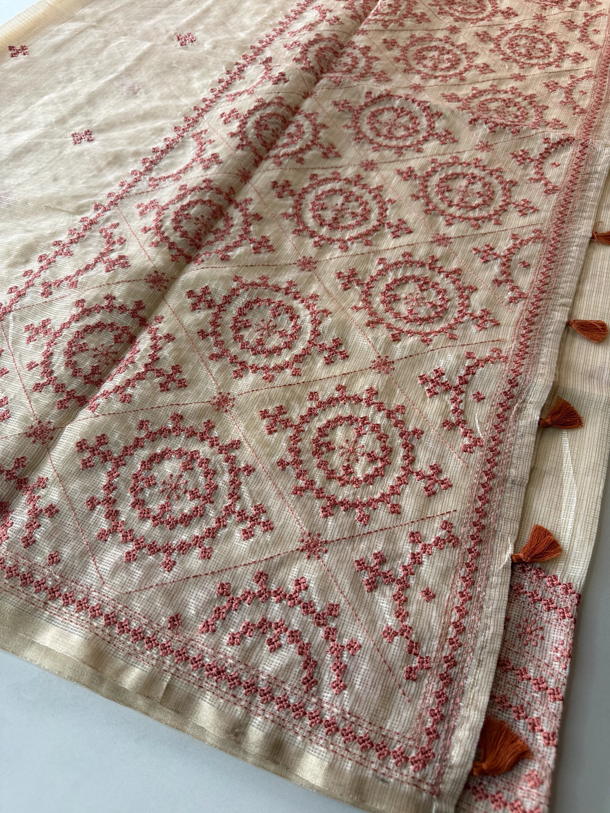 An elegant silky kotta saree adorned with detailed Kutch embroidery along the borders and scattered motifs across the body. The saree comes with a running blouse piece featuring delicate sleeve-end work, adding a refined handcrafted touch. Lightweight, semi-transparent, and perfect for graceful festive or occasion wear.