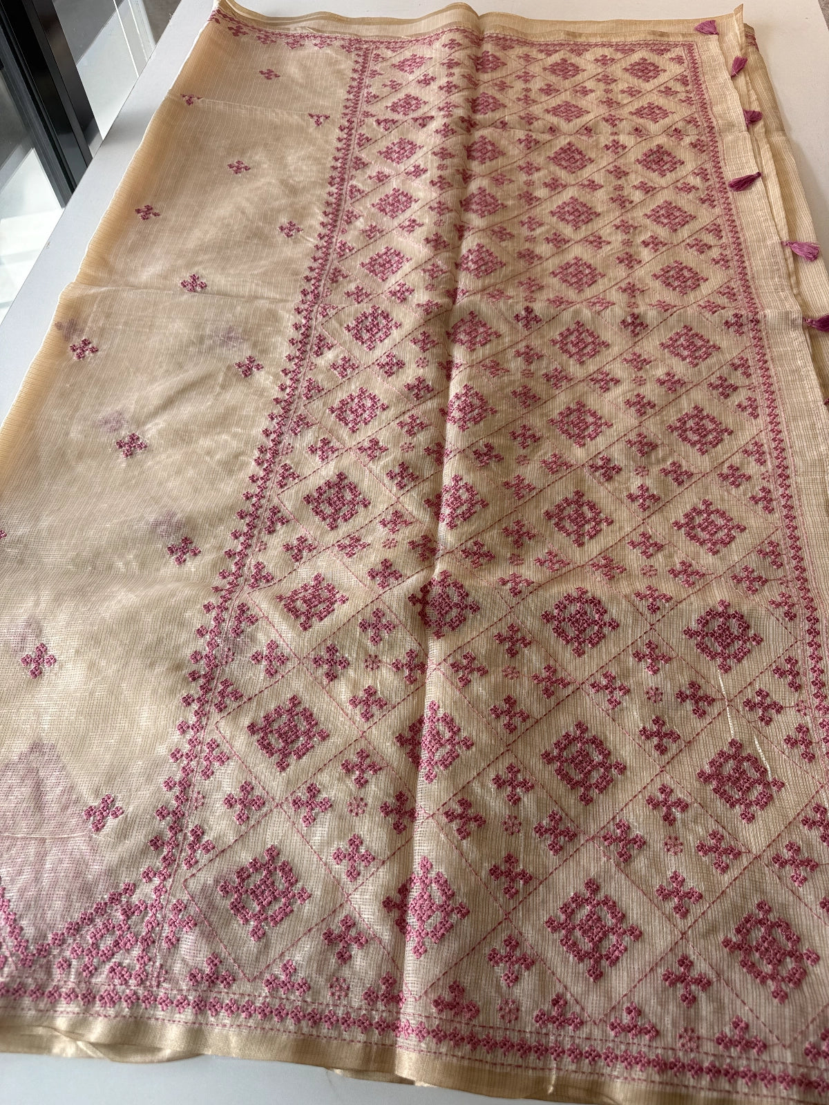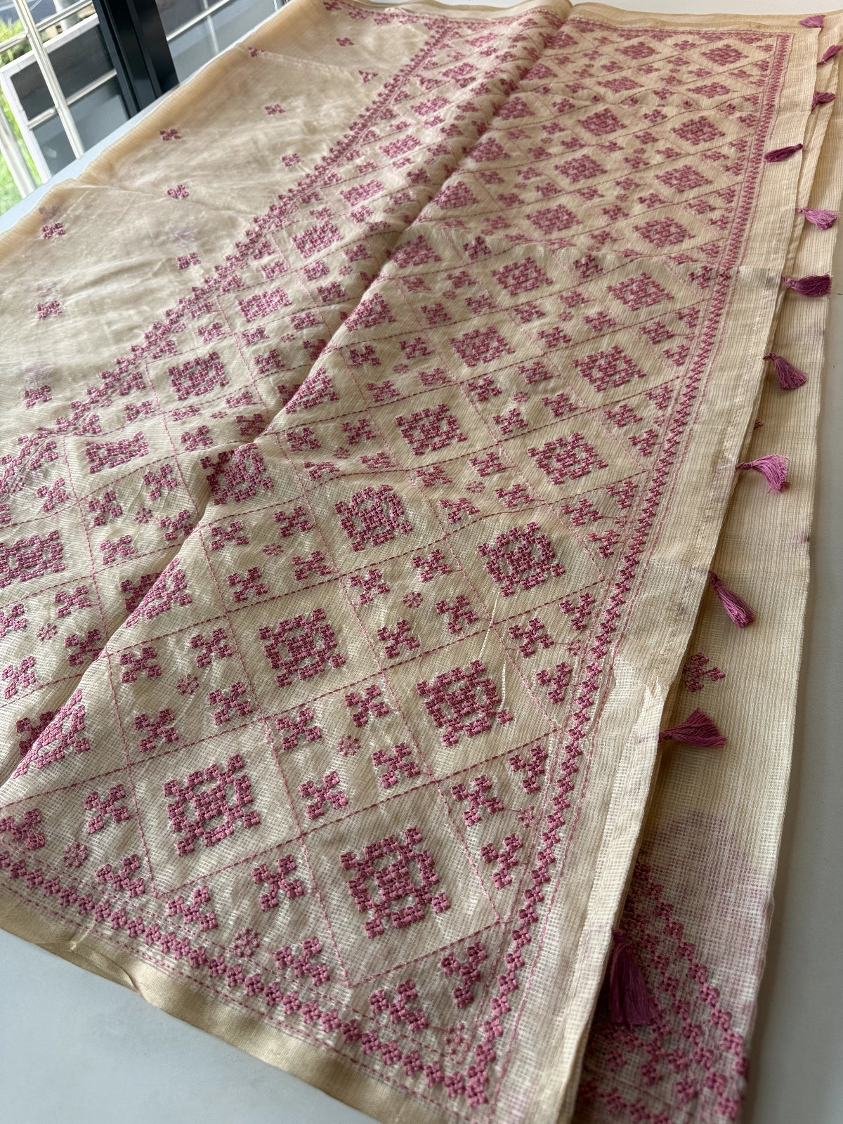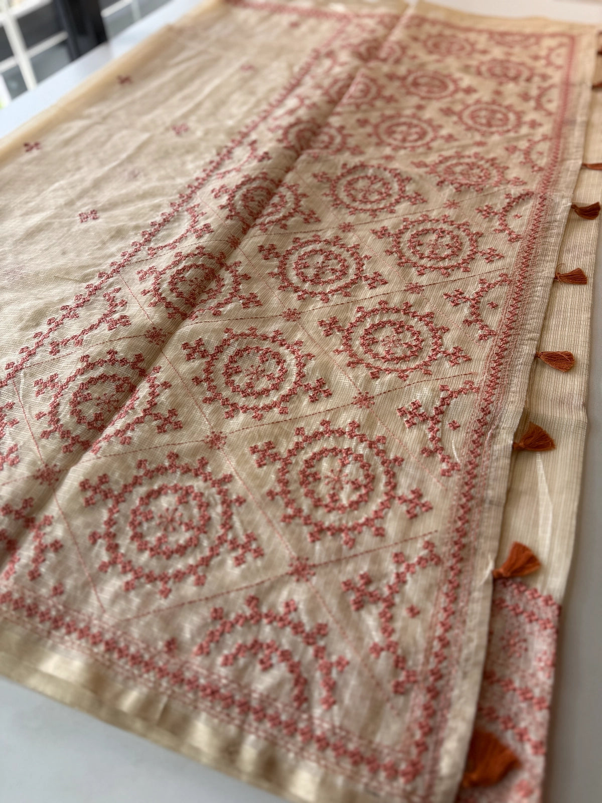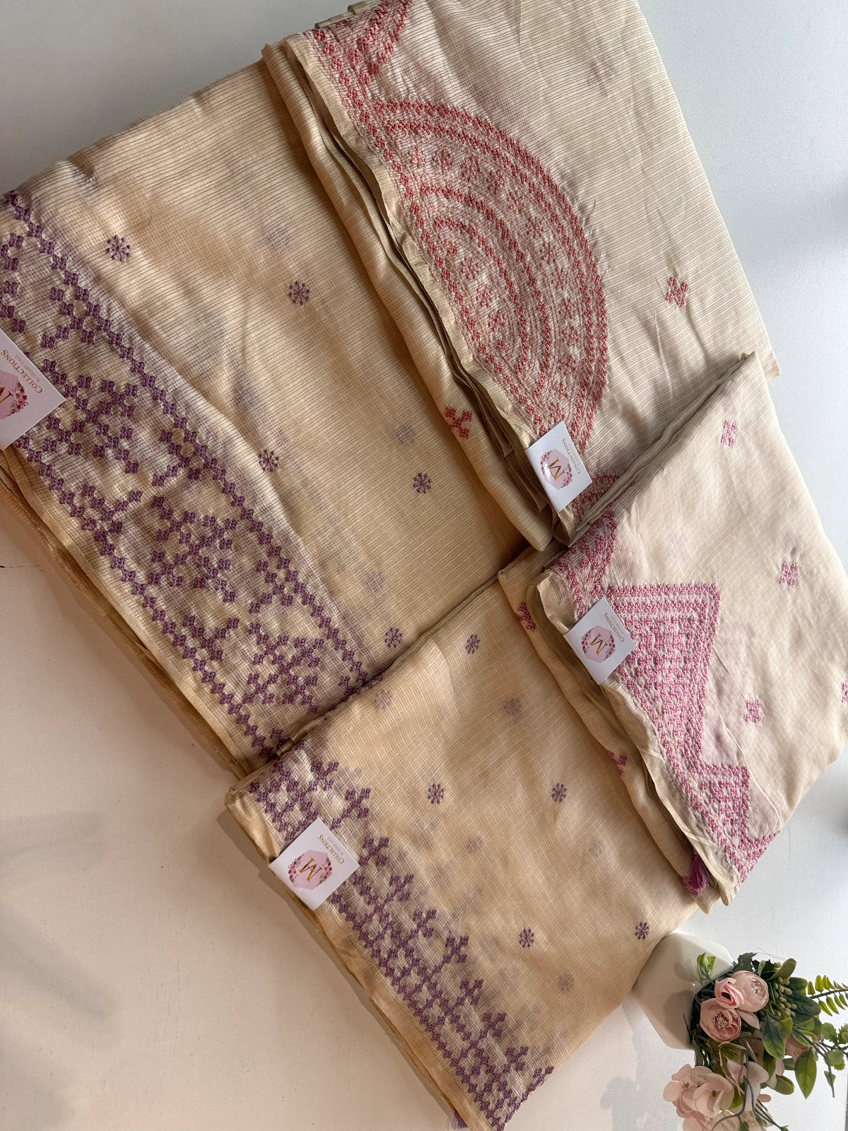 An elegant silky kotta saree adorned with detailed Kutch embroidery along the borders and scattered motifs across the body. The saree comes with a running blouse piece featuring delicate sleeve-end work, adding a refined handcrafted touch. Lightweight, semi-transparent, and perfect for graceful festive or occasion wear.