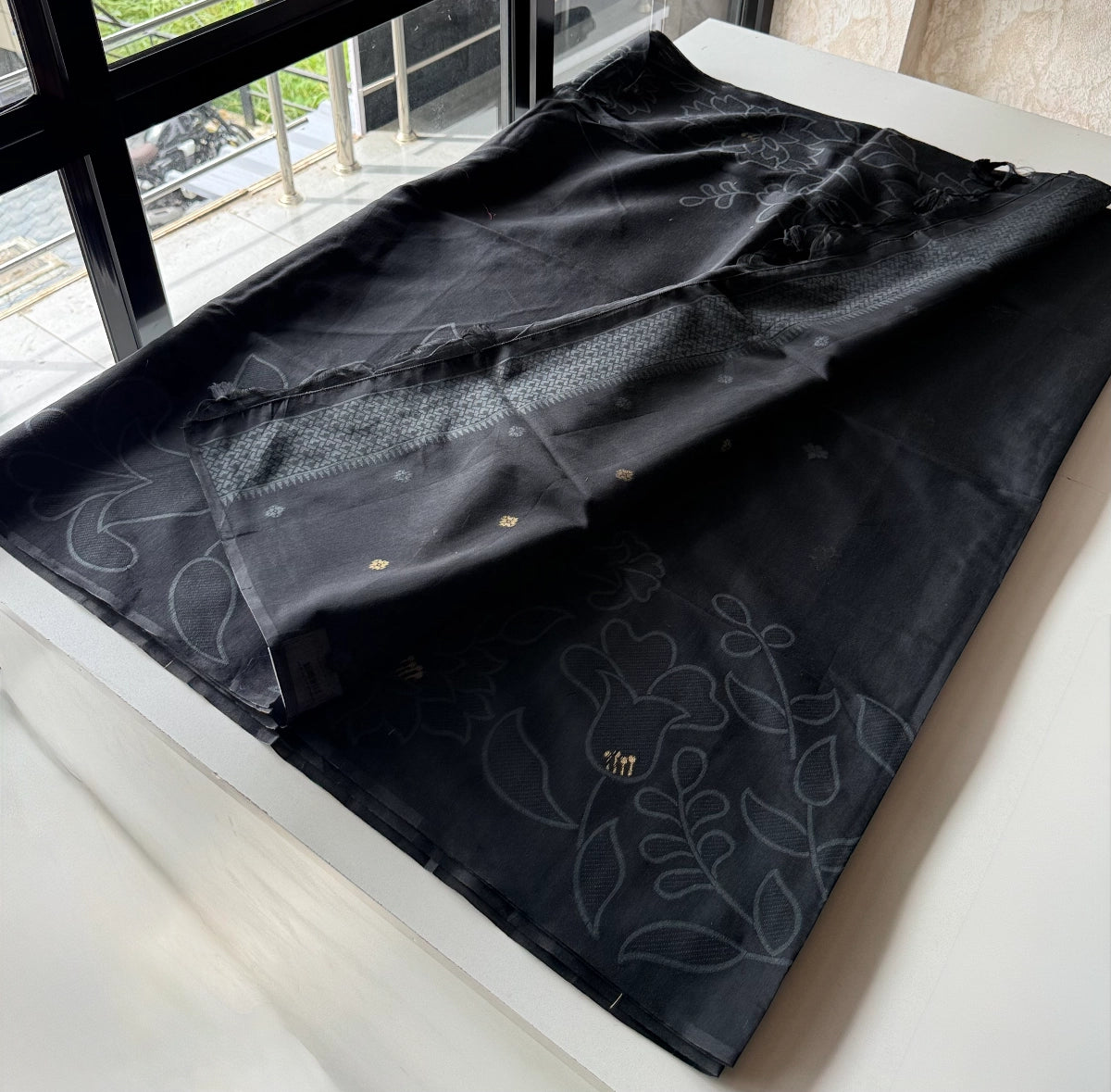 Grace meets tradition in this elegant Chanderi Cotton Saree, featuring intricate golden woven buttas across the body and a hand-paint inspired floral surface design. The fabric carries a natural sheen with a lightweight, semi-transparent drape that flatters every silhouette. Paired with a running blouse piece that includes woven detailing at the sleeve ends, this saree is perfect for festive occasions or elegant daytime wear.