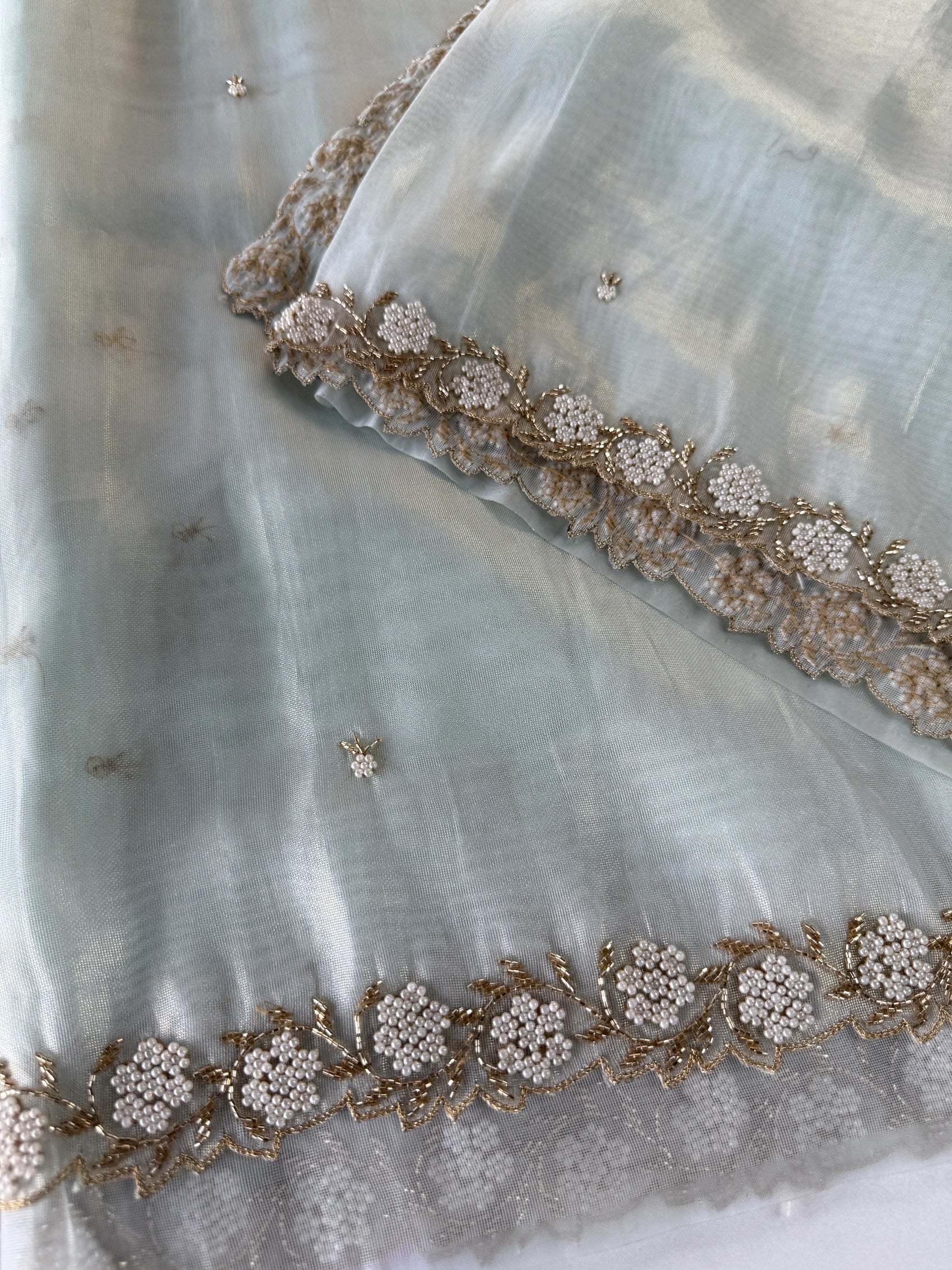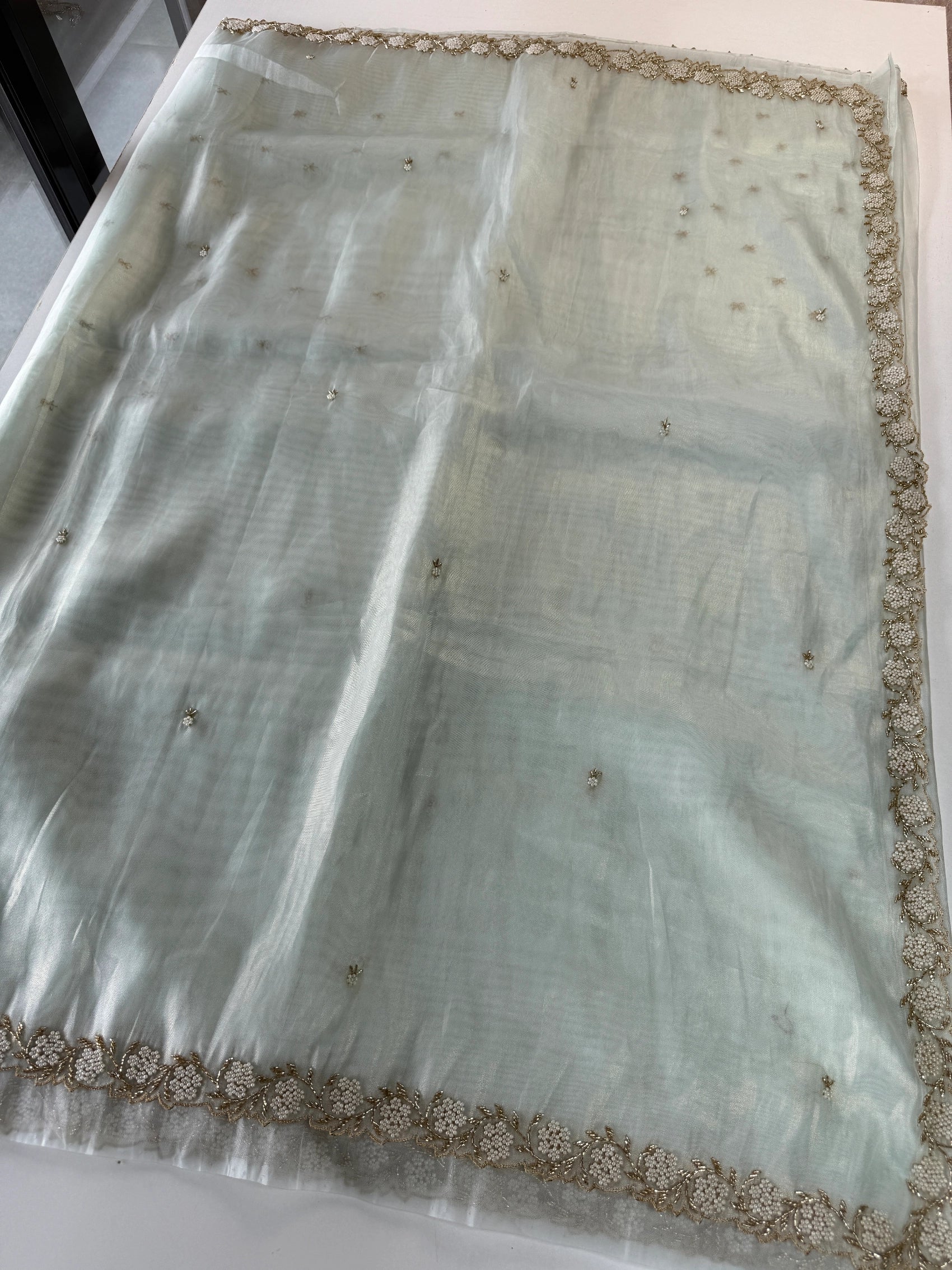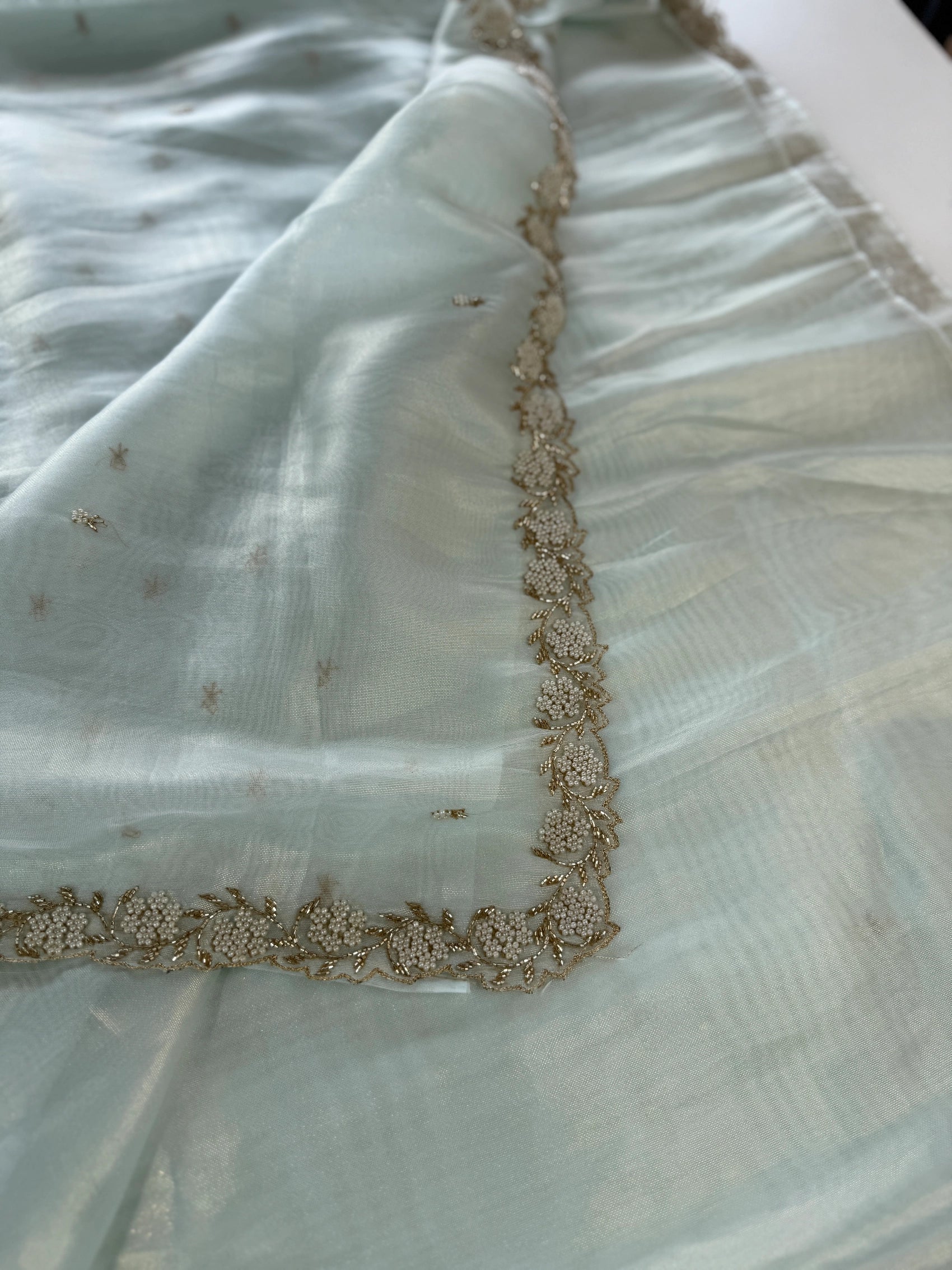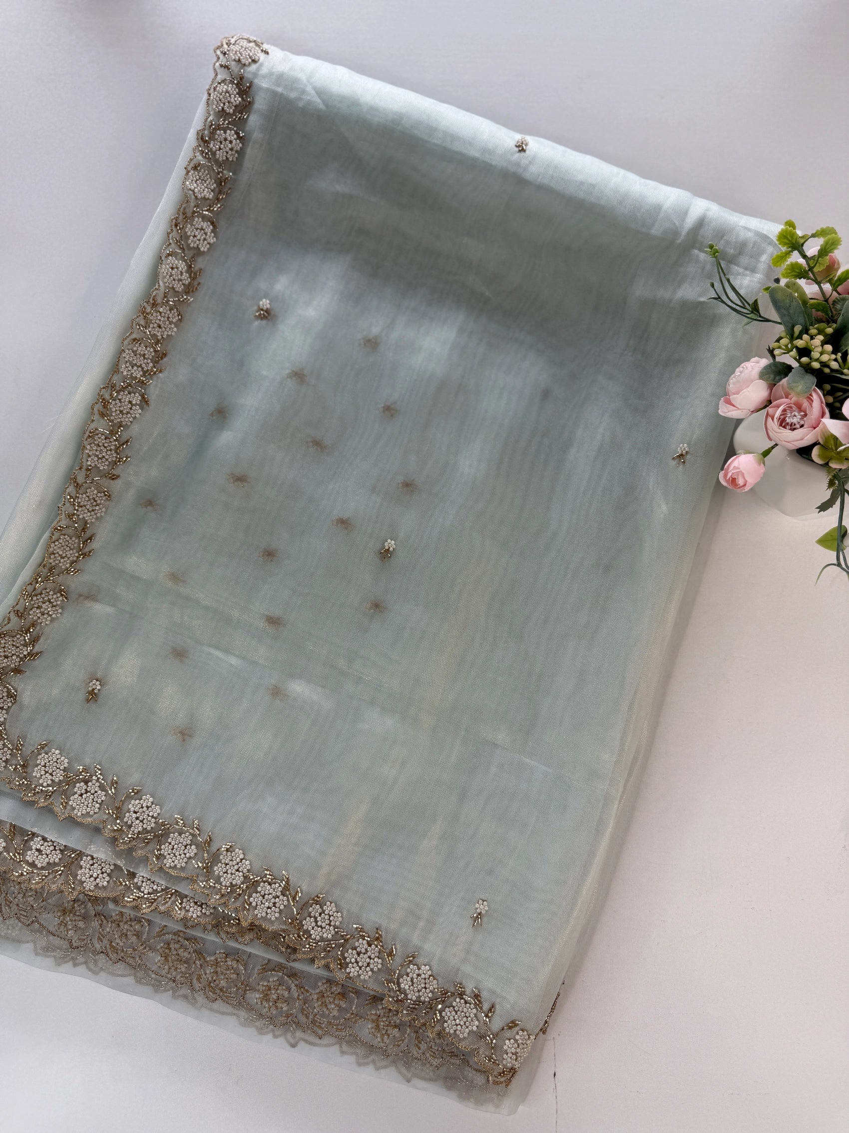 A graceful tissue organza saree crafted in a soothing pastel tone, highlighted with an elegant handworked floral border. The saree body features delicate spread hand embellishments, adding subtle sparkle without overpowering the softness of the fabric. Light, airy, and effortlessly elegant, this saree is perfect for refined festive and occasion wear.