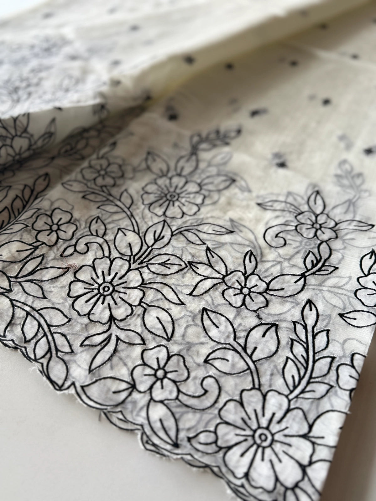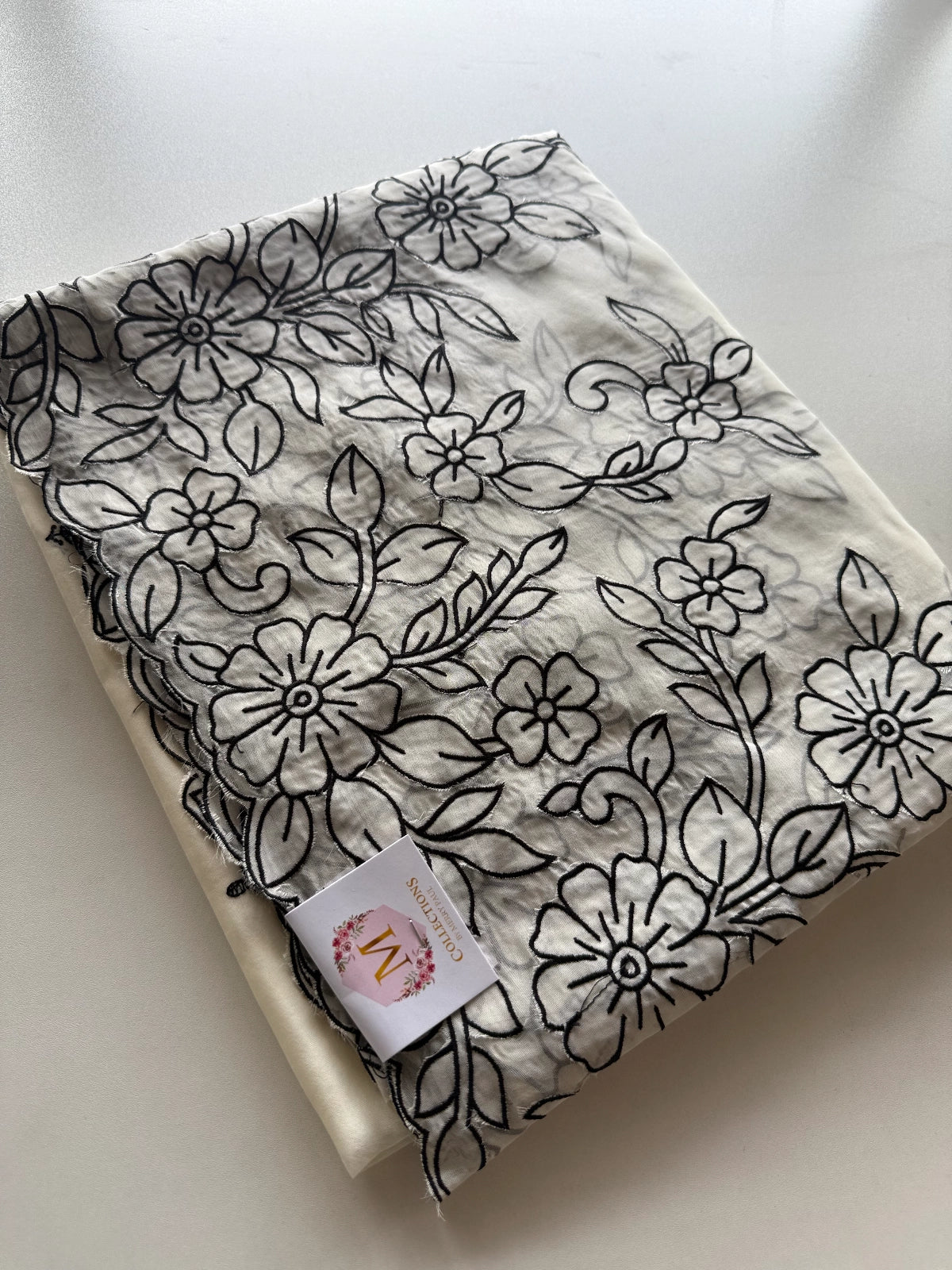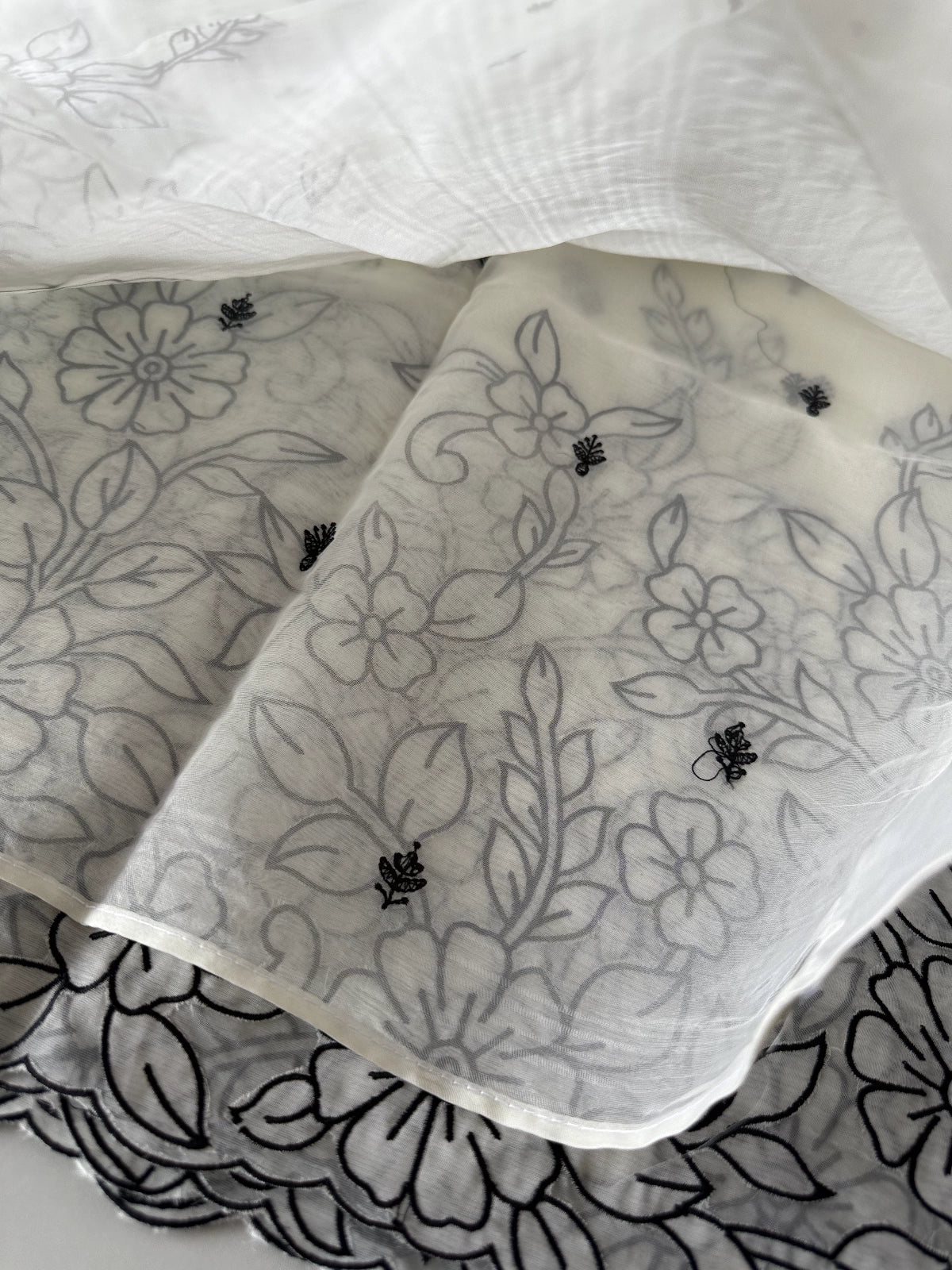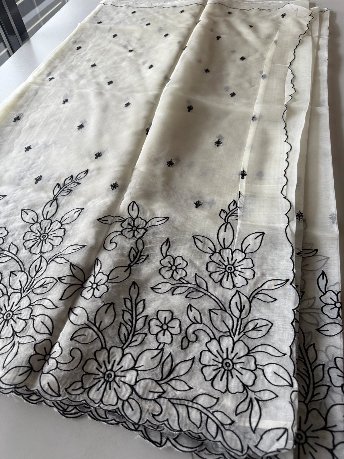 A statement of refined elegance, this viscose organza saree features a soft ivory base adorned with black threadworked furrowed patterns beautifully spread across the pallu and bottom pleats. The saree is bordered with delicate scalloped edges, adding a graceful finish. It comes with a matching blouse piece detailed with subtle scattered threadwork motifs, perfectly complementing the saree’s design.