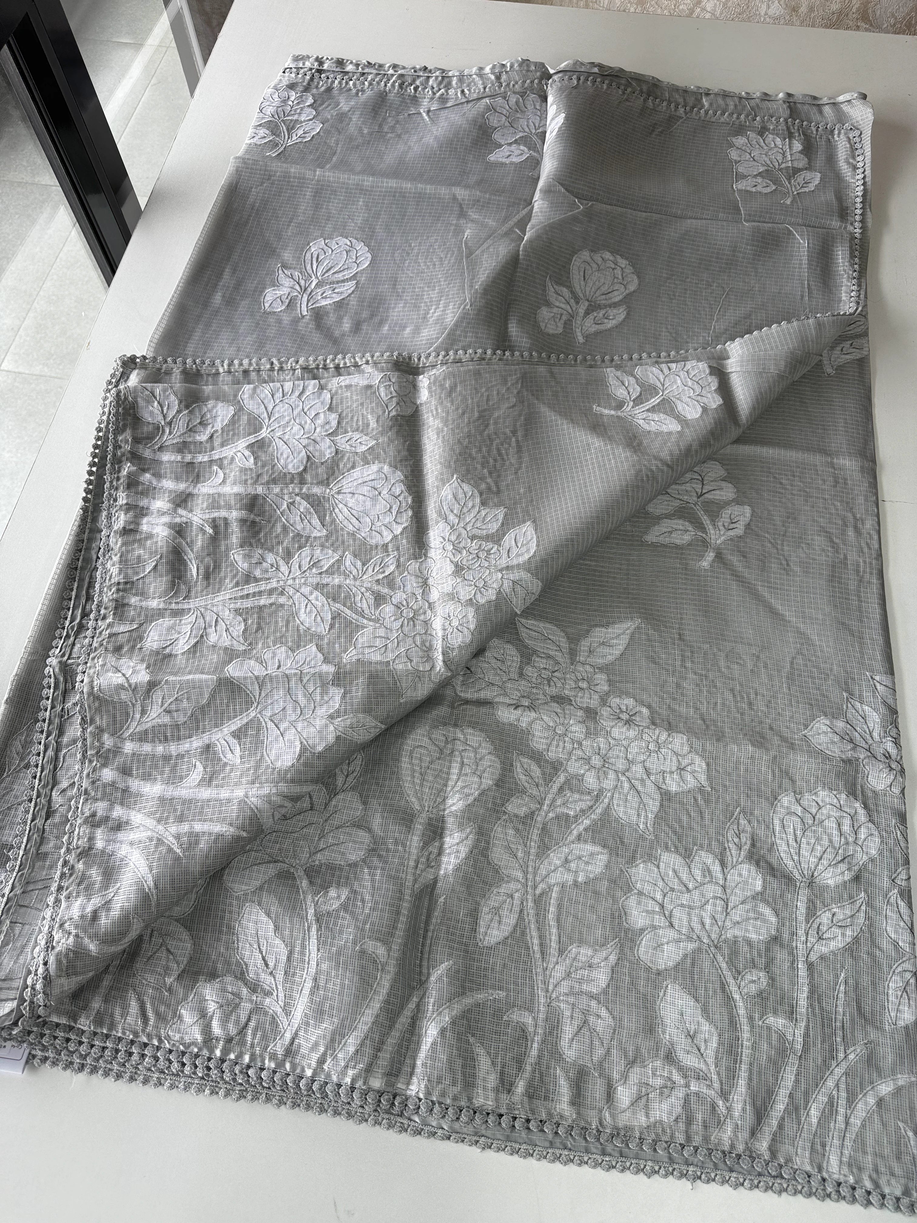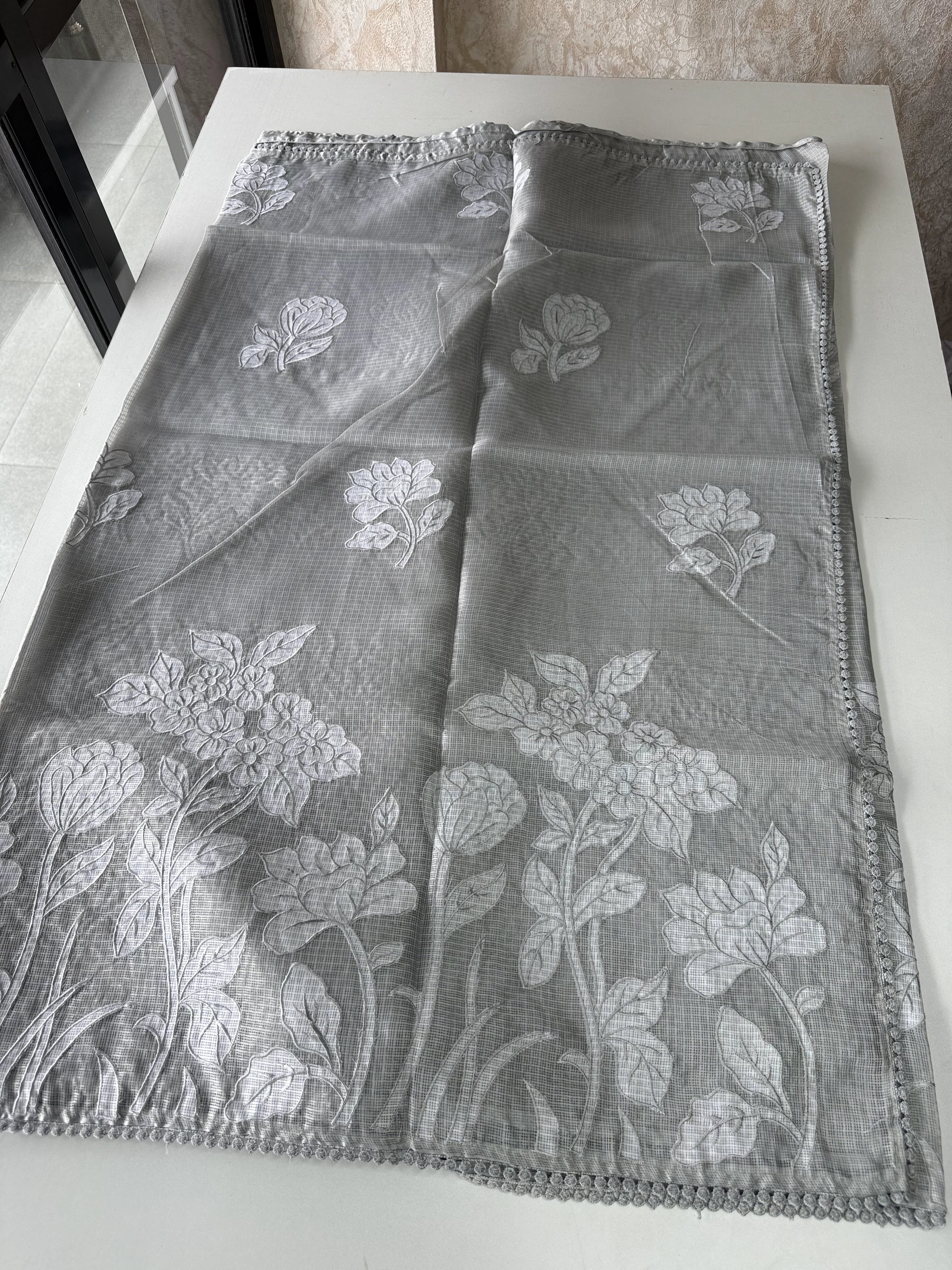 A luxurious Silky Kota Saree from our premium range, adorned with delicate appliqué work gracefully spread across the pallu and bottom pleats. Lightweight and effortlessly elegant, this saree drapes beautifully and comes with a matching running blouse piece — perfect for refined occasions and timeless style.