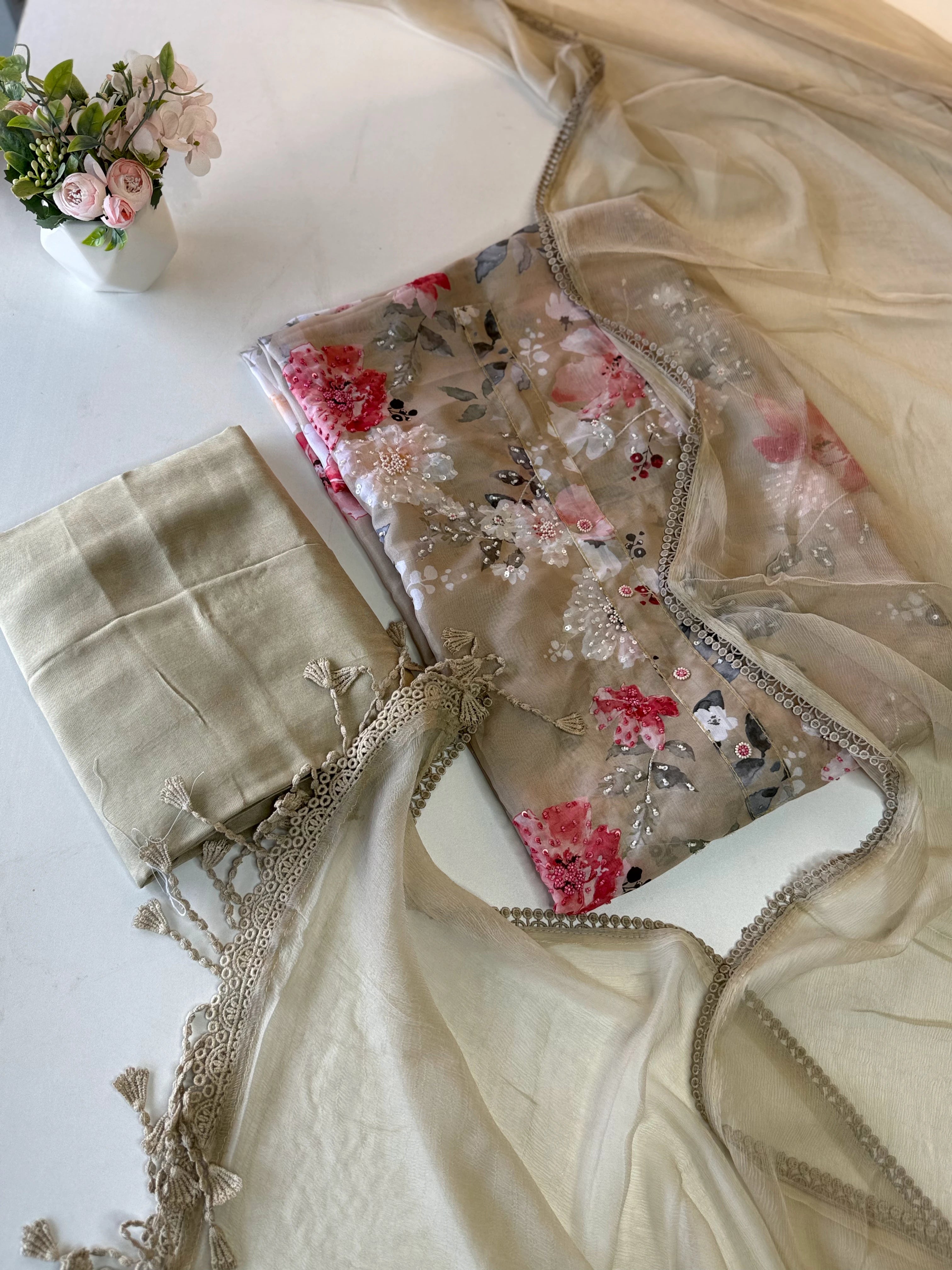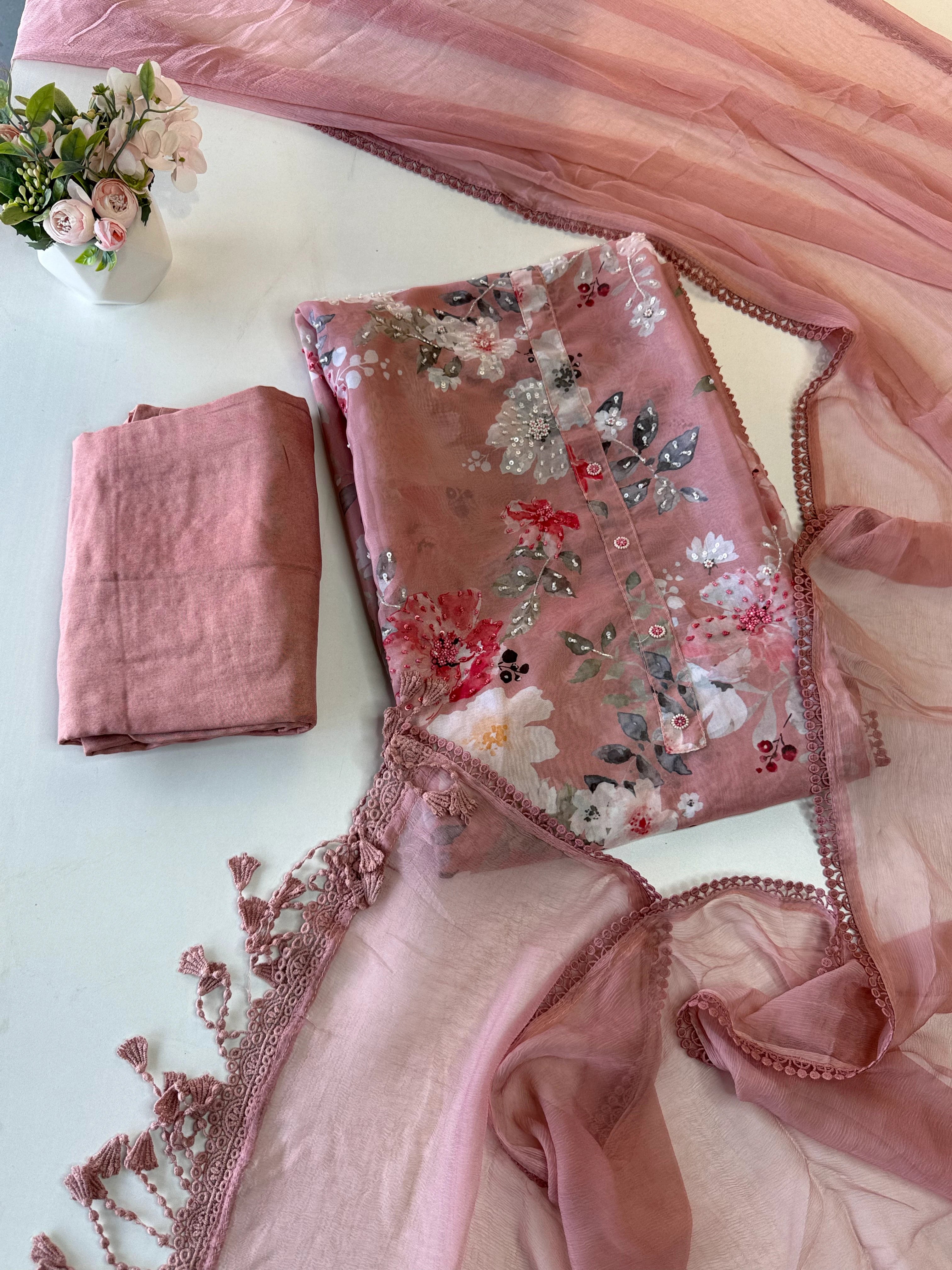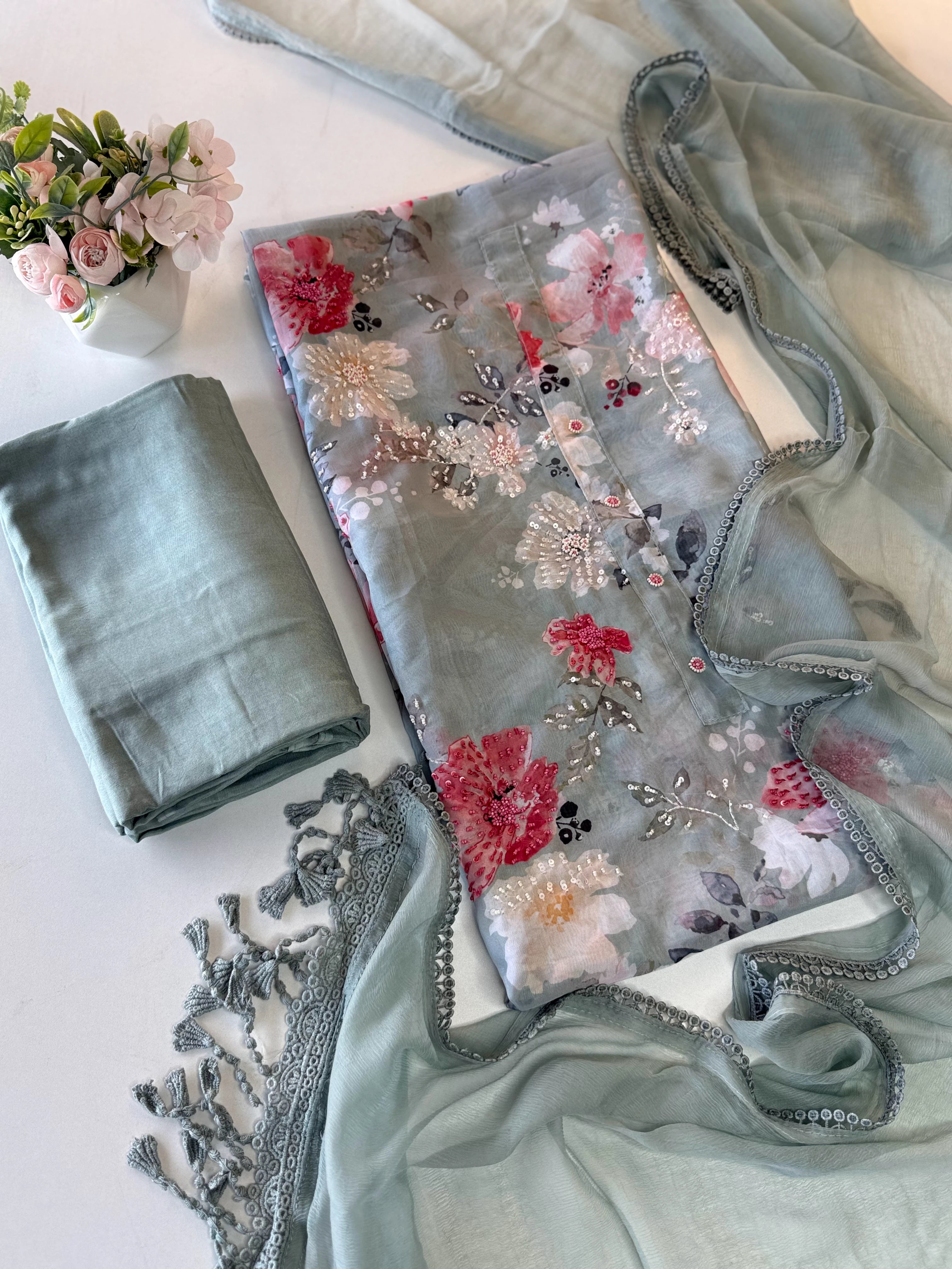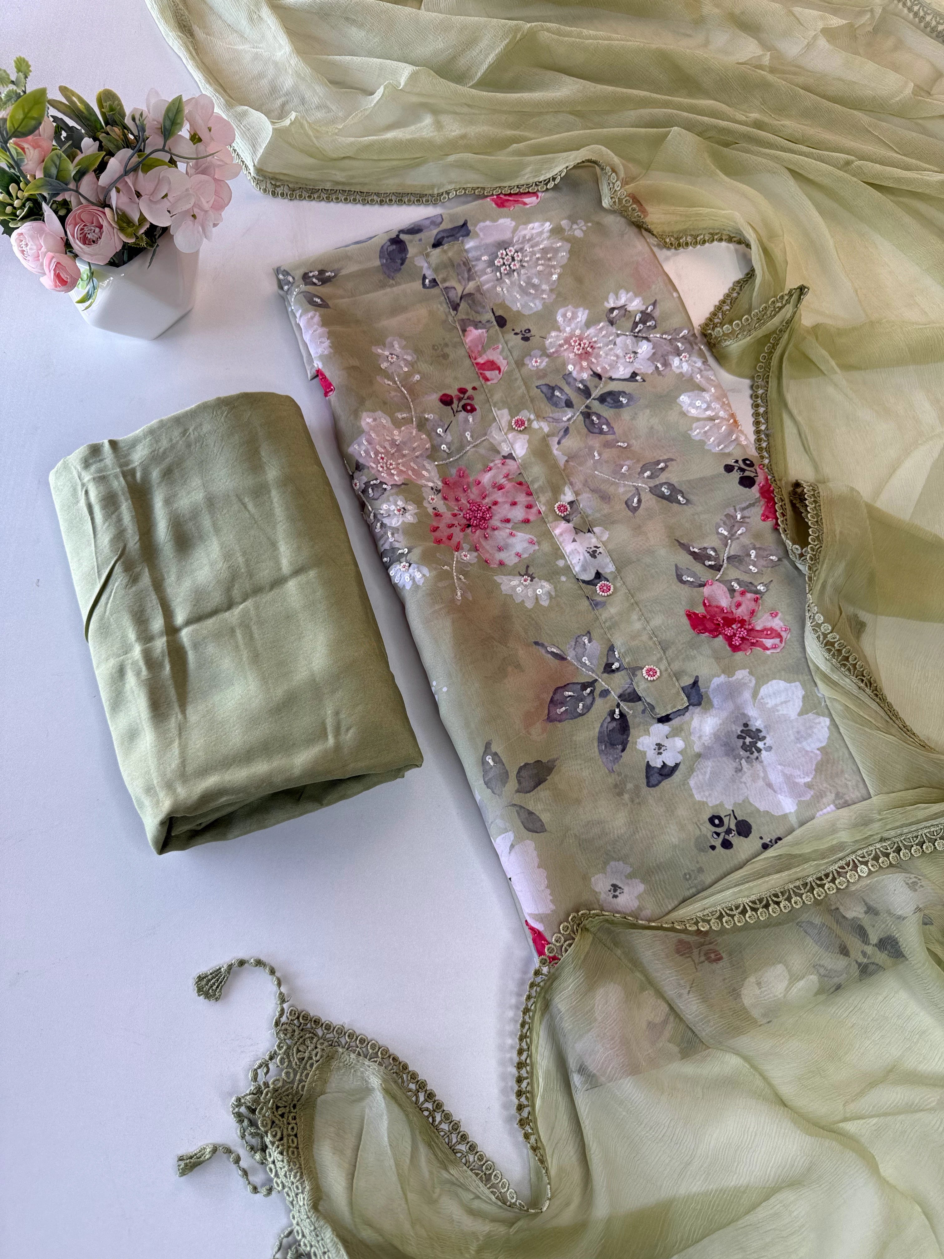 Georgette salwar top material with hand work highlighting and lace boarder , paired with dupatta and cotton bottom material