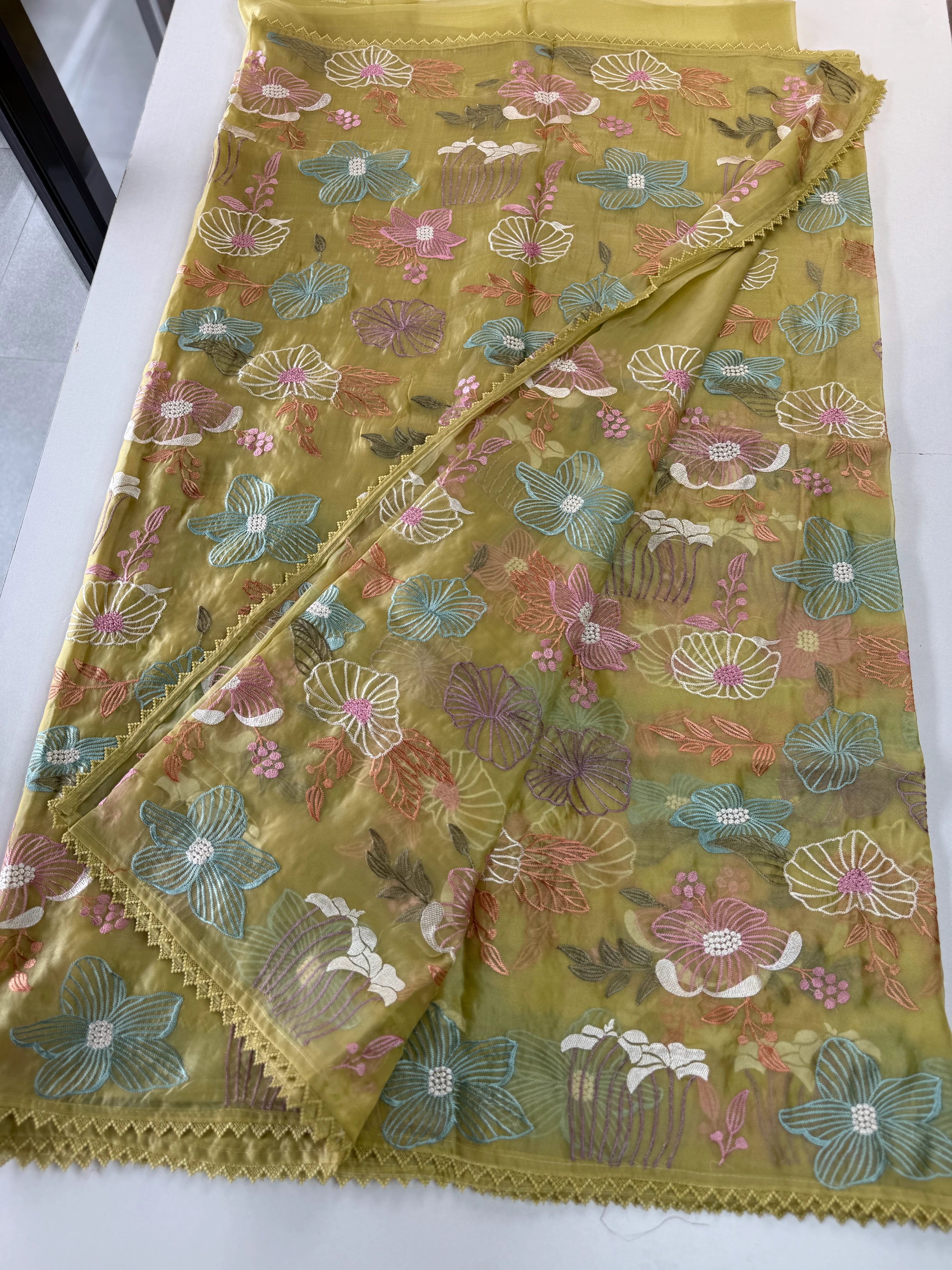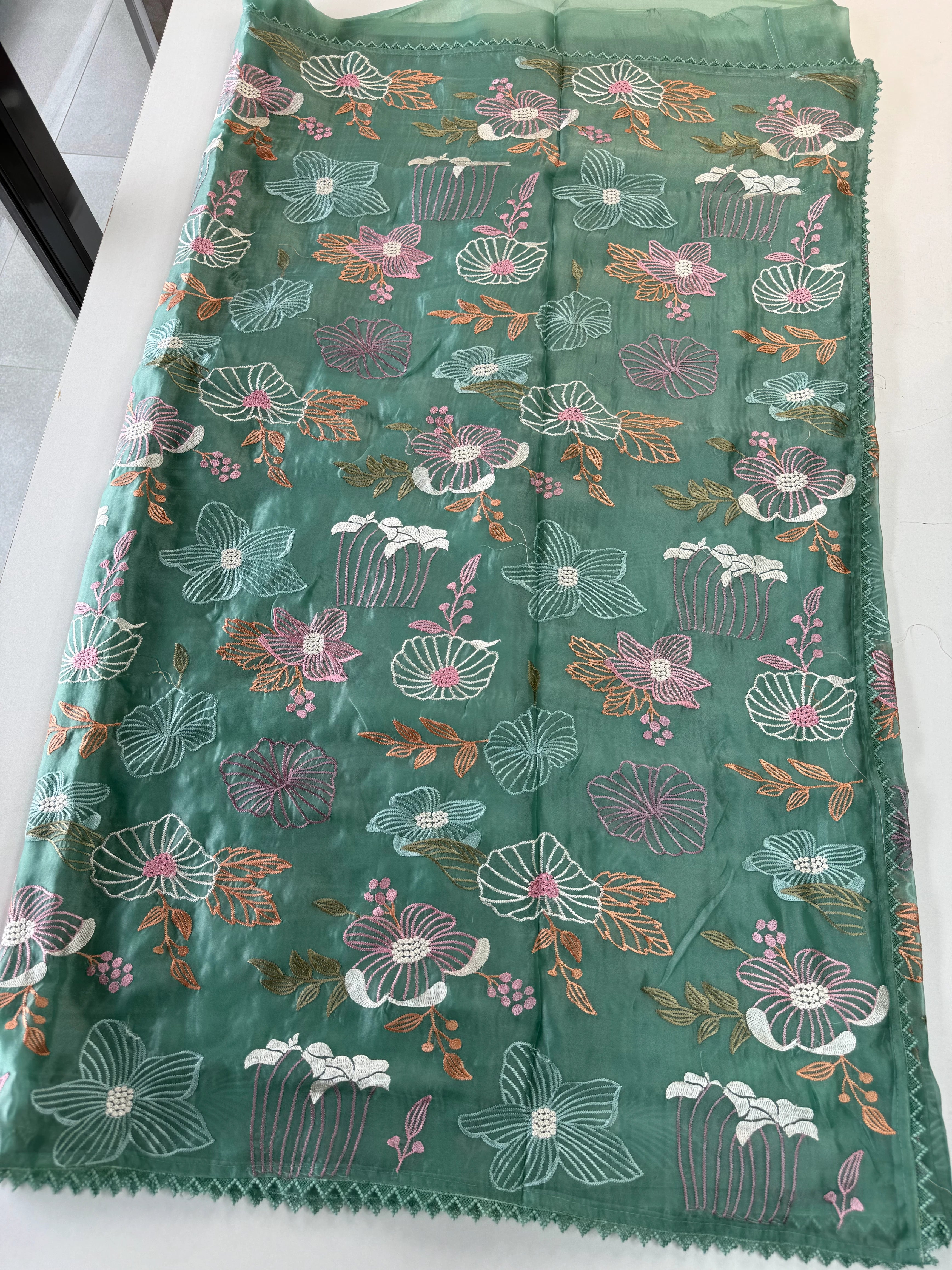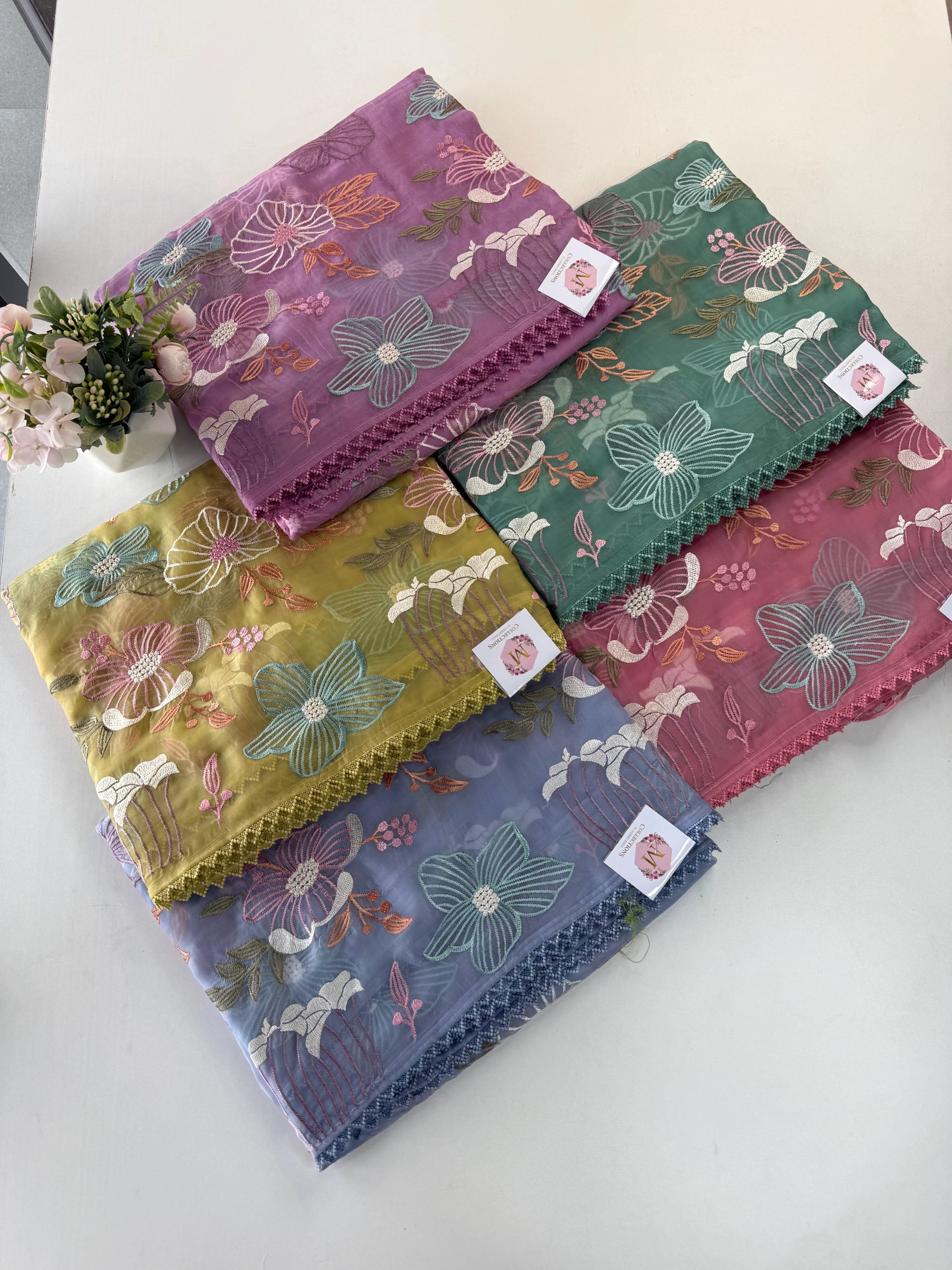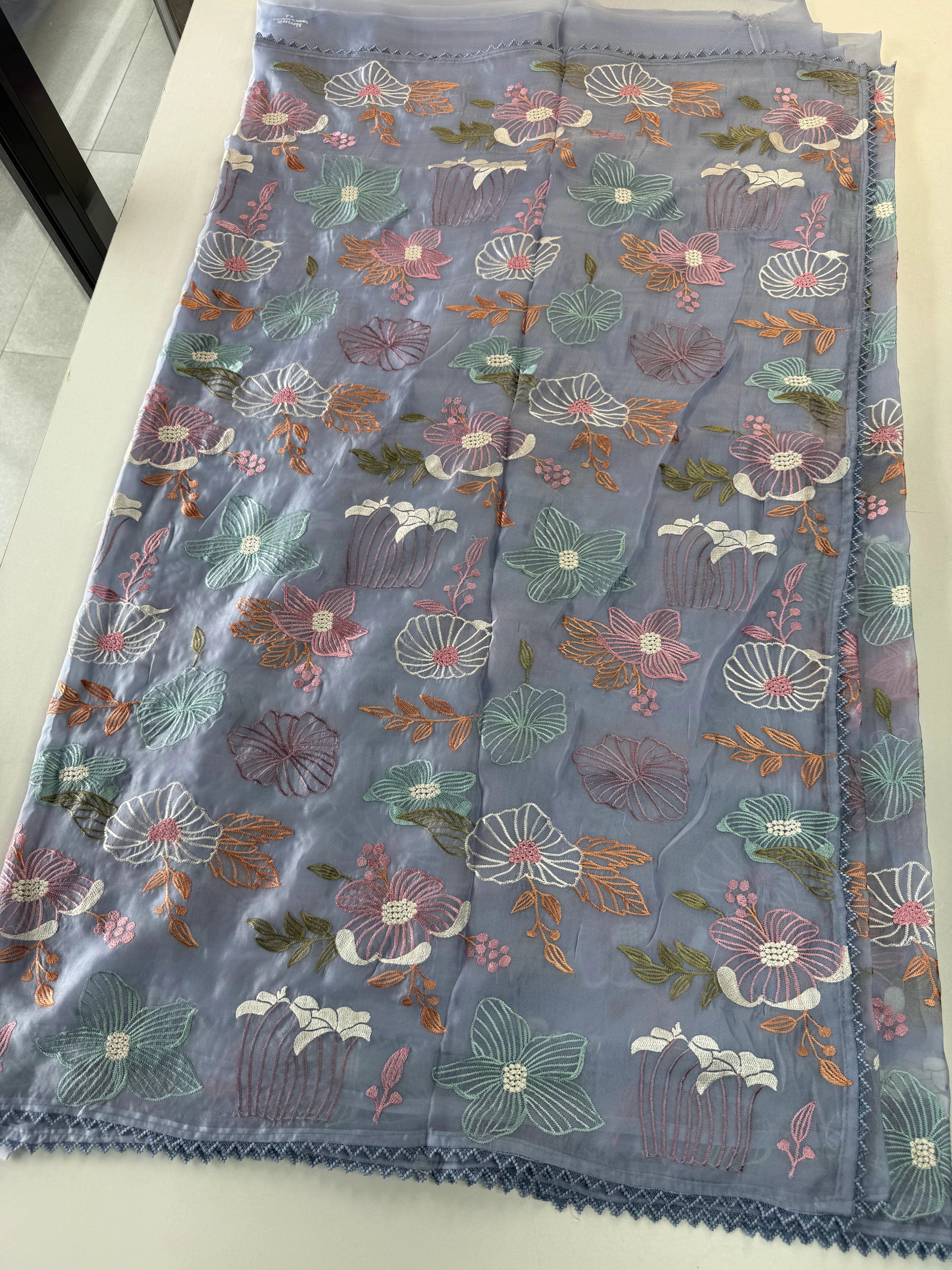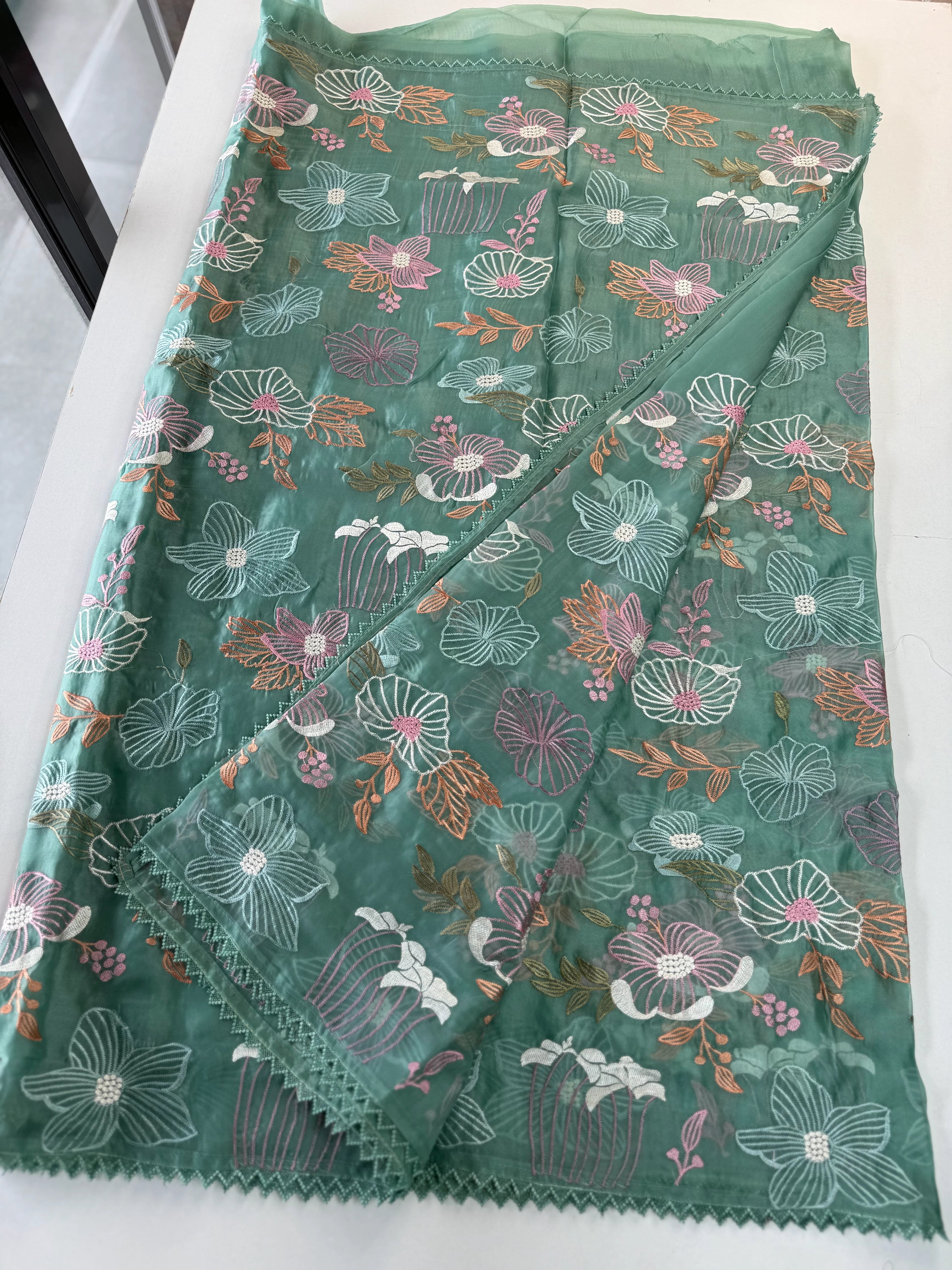 An elegant shimmer georgette saree featuring delicate thread work spread beautifully across the body, creating a graceful floral appeal. The saree is enhanced with subtle lace highlighting along the borders, adding a refined finishing touch. Lightweight, flowy, and easy to drape, this saree offers a soft sheen that makes it perfect for festive occasions, parties, and special gatherings. It comes with a running plain blouse piece, complemented with lace detailing on the sleeve ends for a coordinated and polished look.