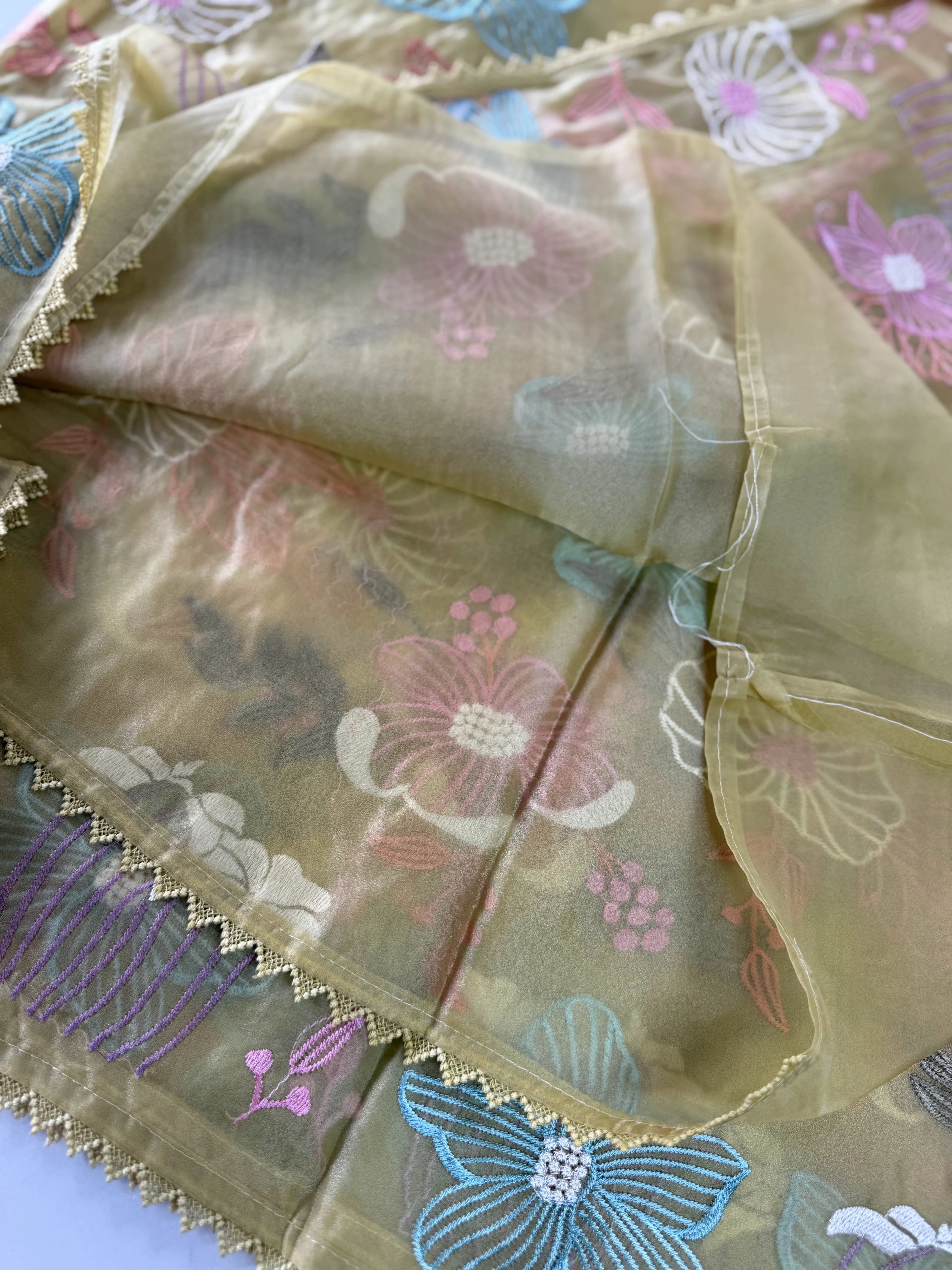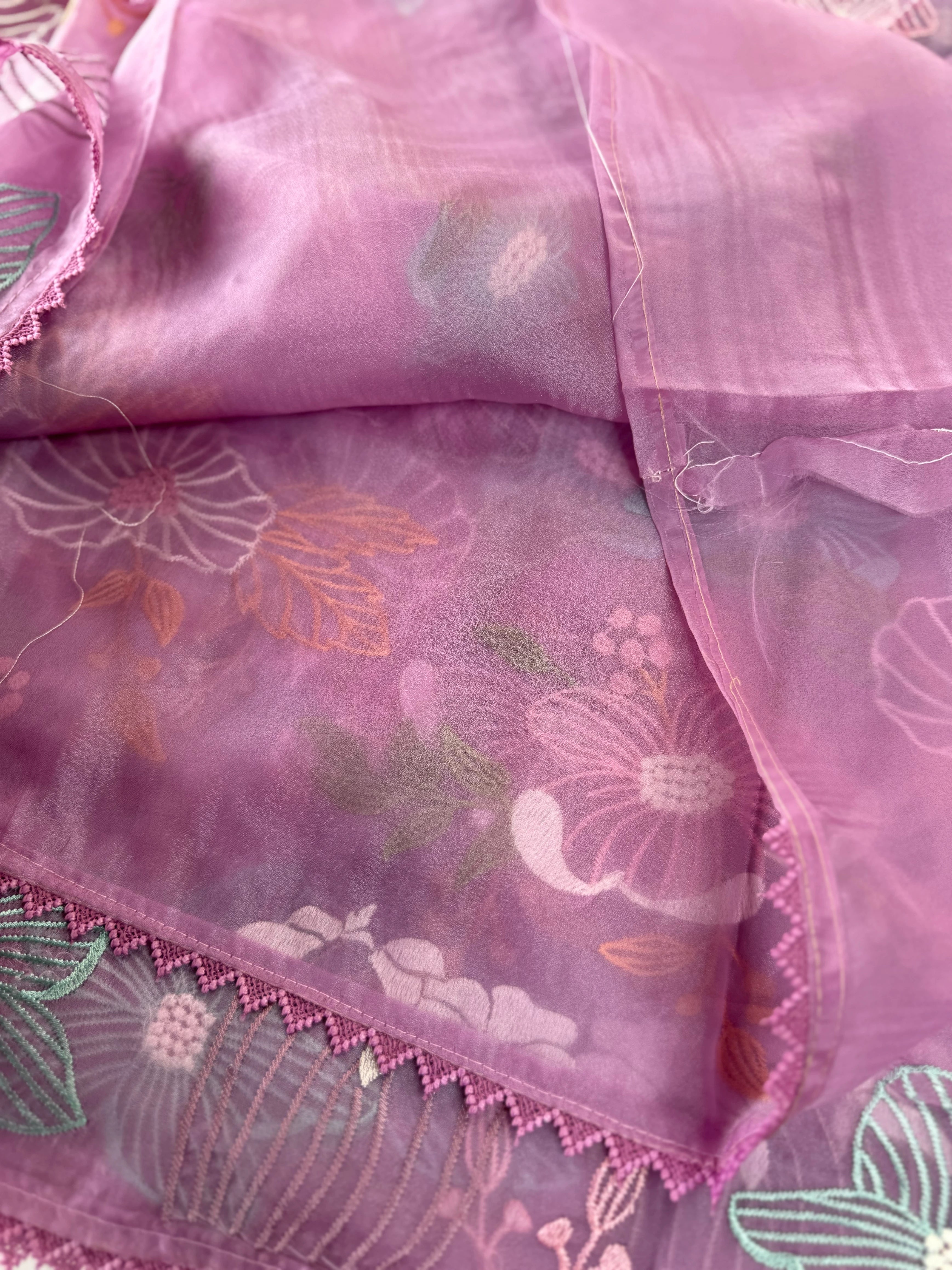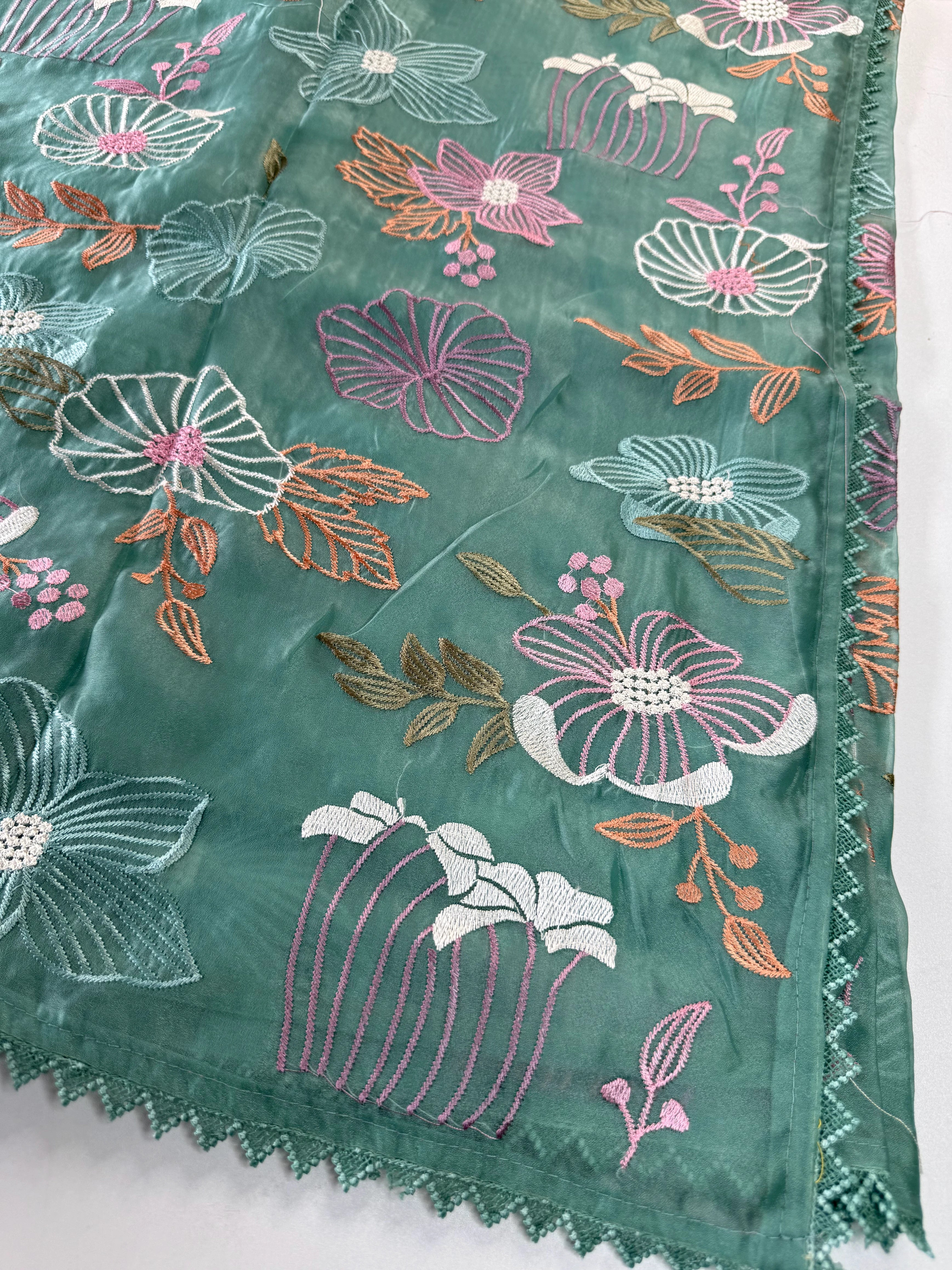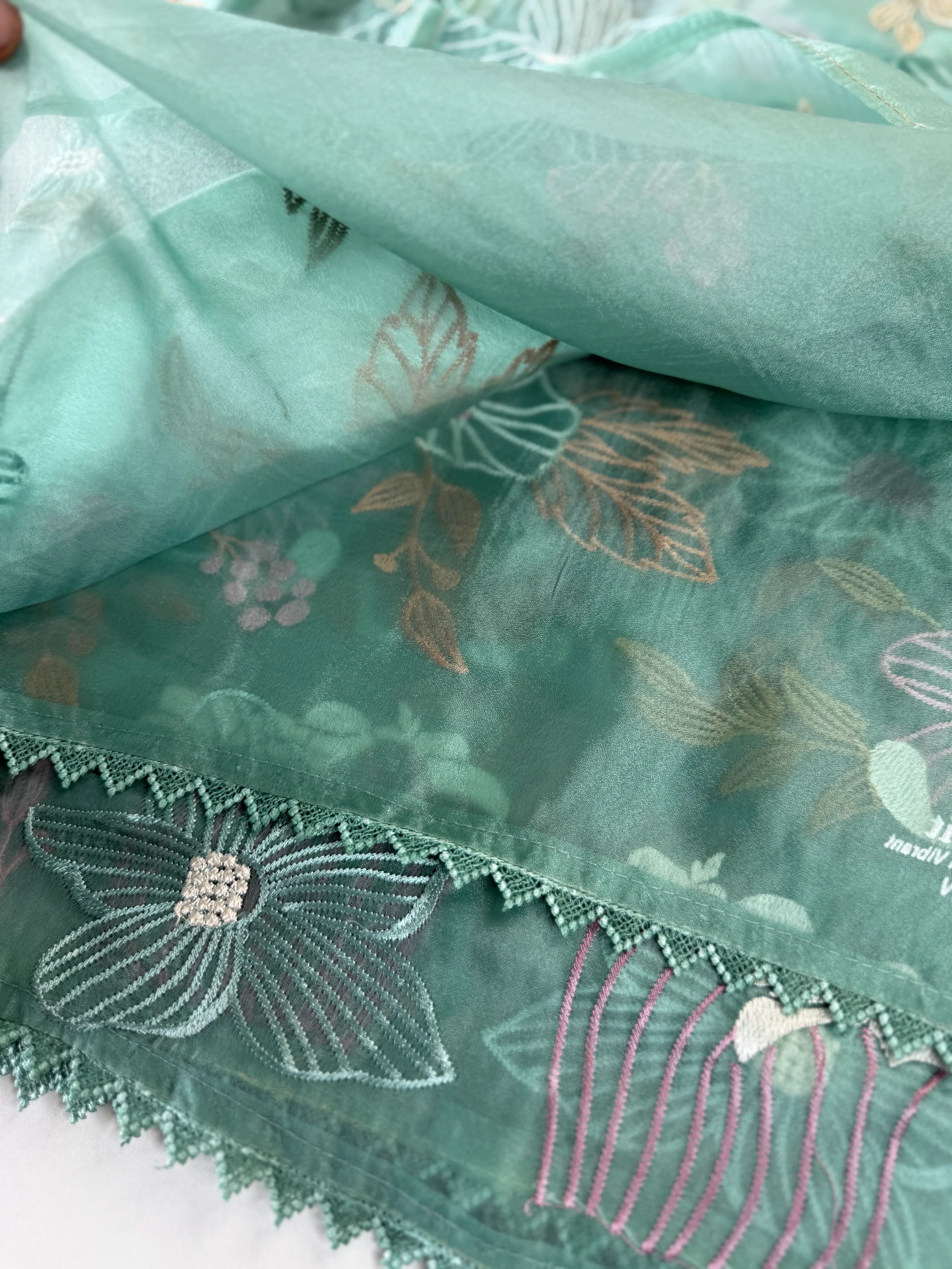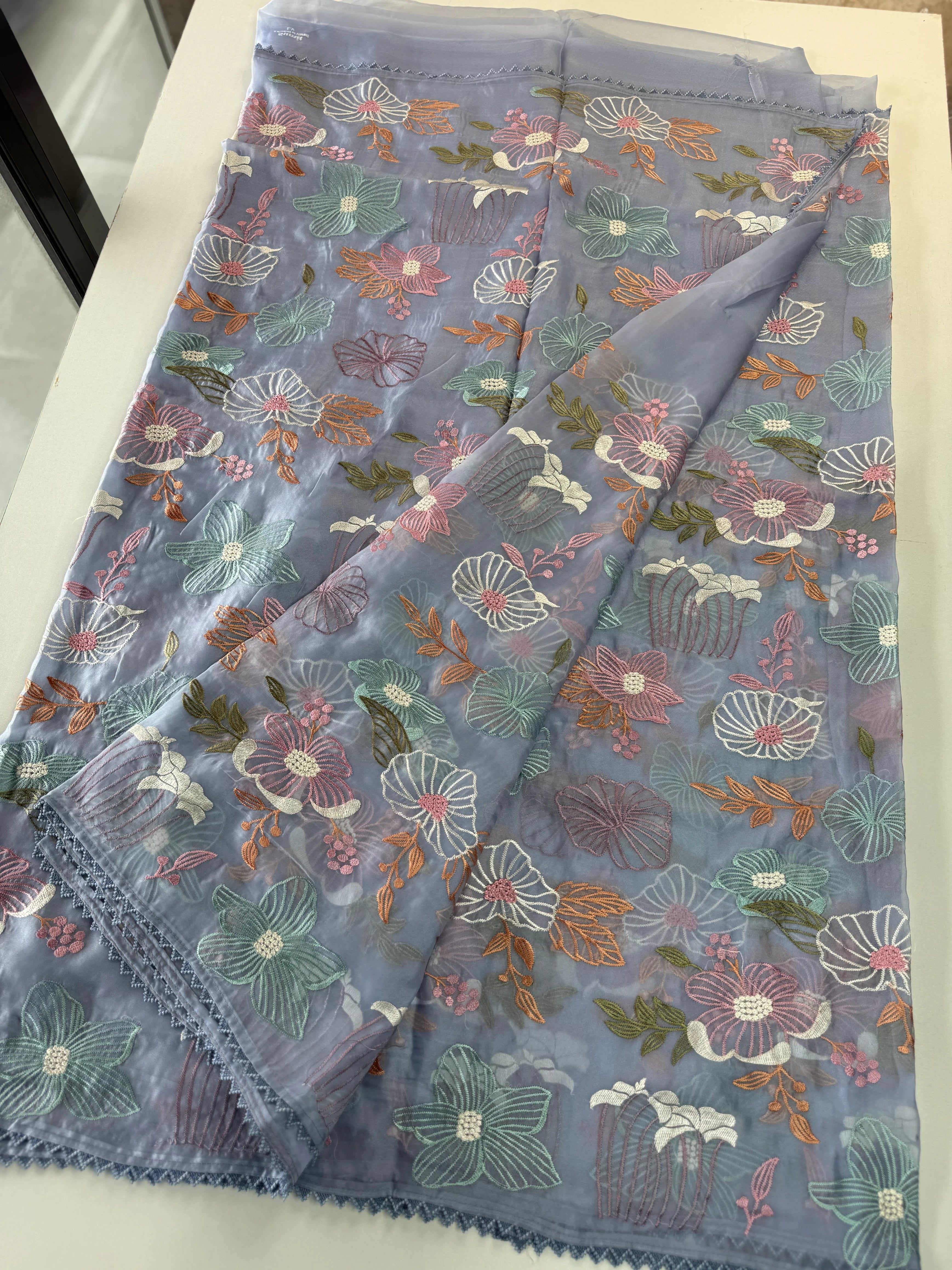 An elegant shimmer georgette saree featuring delicate thread work spread beautifully across the body, creating a graceful floral appeal. The saree is enhanced with subtle lace highlighting along the borders, adding a refined finishing touch. Lightweight, flowy, and easy to drape, this saree offers a soft sheen that makes it perfect for festive occasions, parties, and special gatherings. It comes with a running plain blouse piece, complemented with lace detailing on the sleeve ends for a coordinated and polished look.