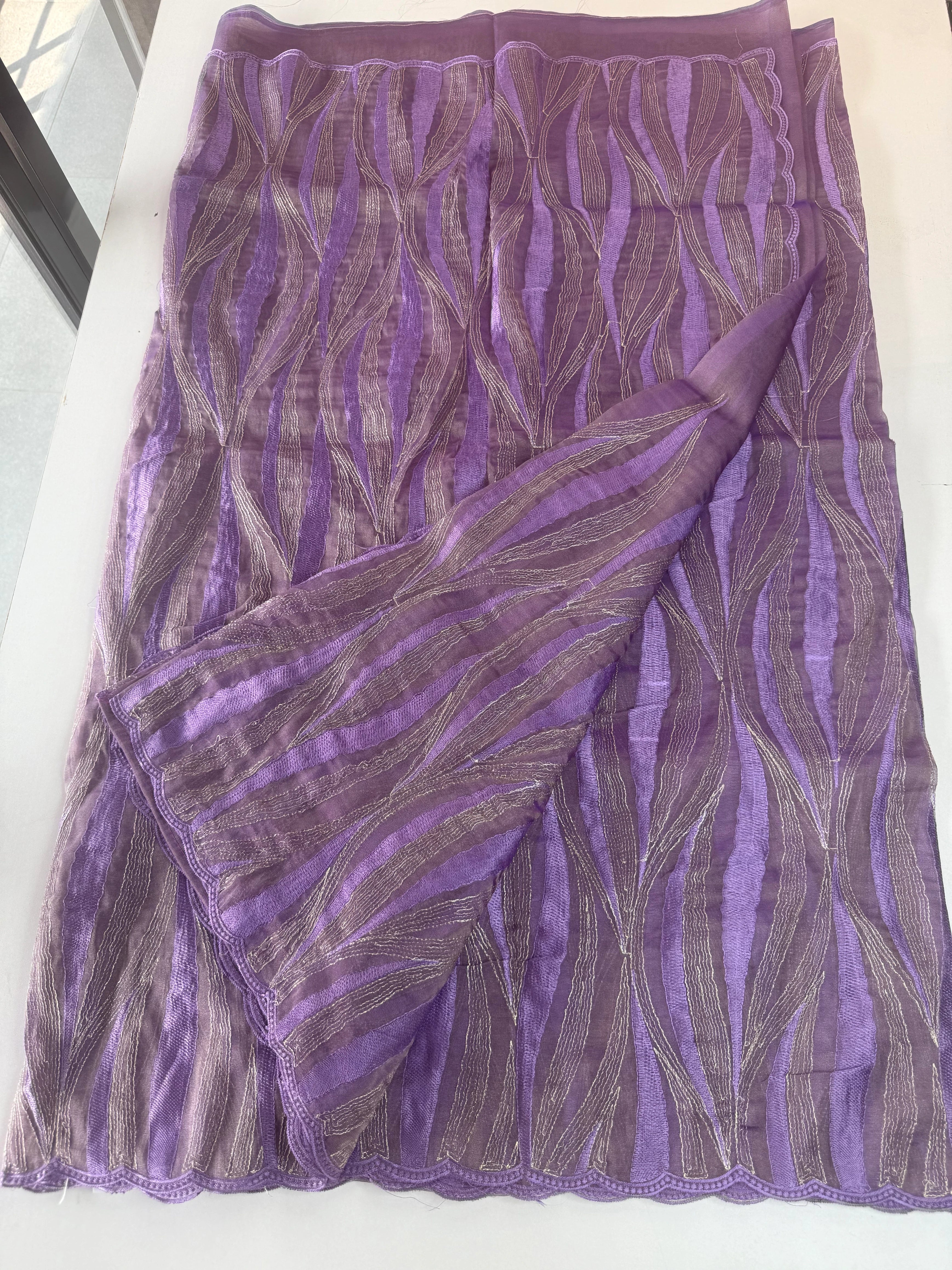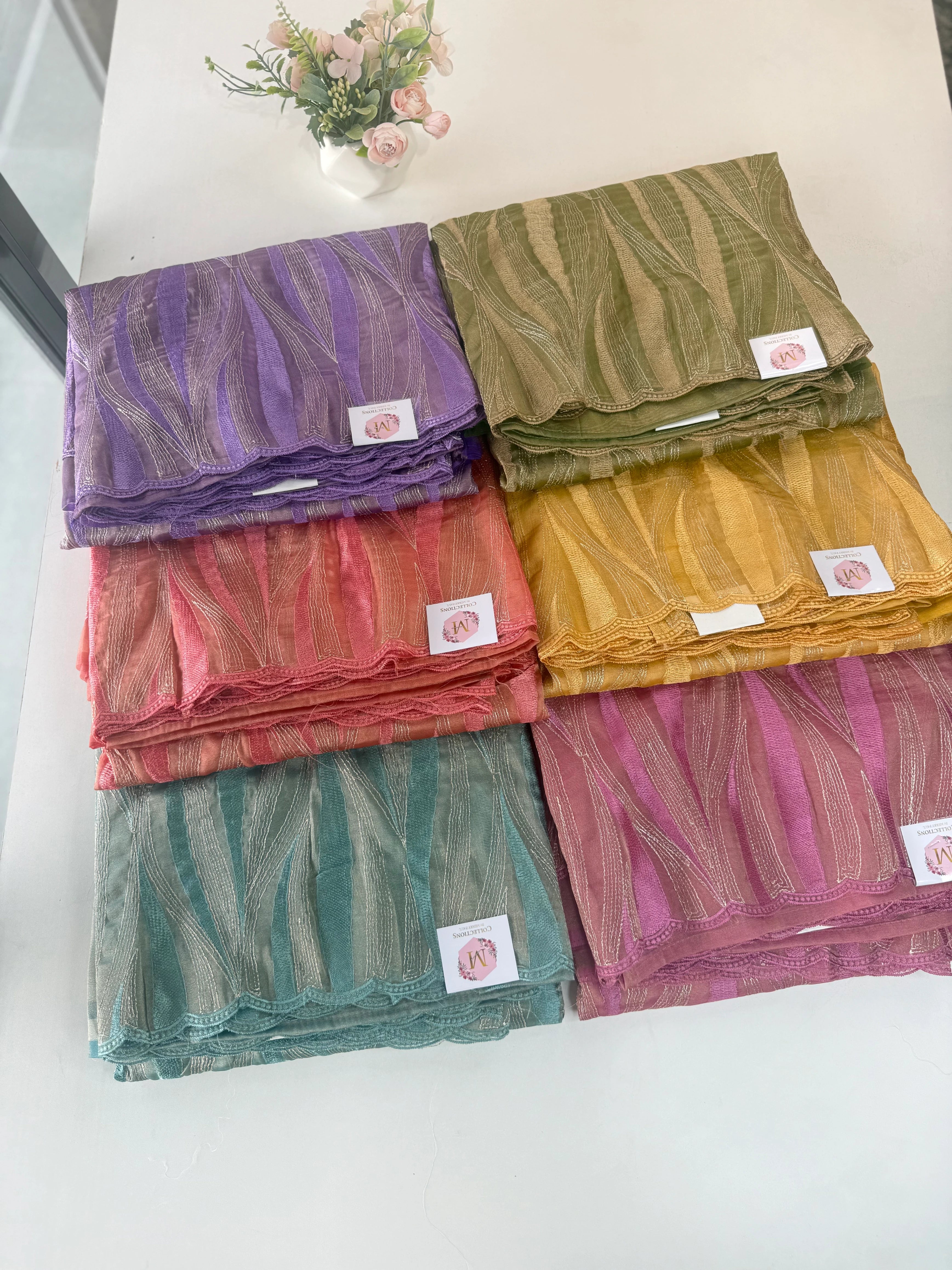 A beautiful shimmered organza-blend saree featuring full-body threadwork that gracefully resembles the look of Turkish organza while keeping its own soft, lightweight charm. The intricate weaving adds a subtle shine and texture, complemented by a delicate scallop-detailed border. It comes with a running plain blouse piece, making it easy to style for any party or occasion.