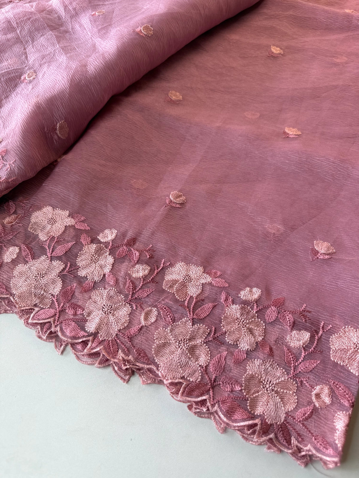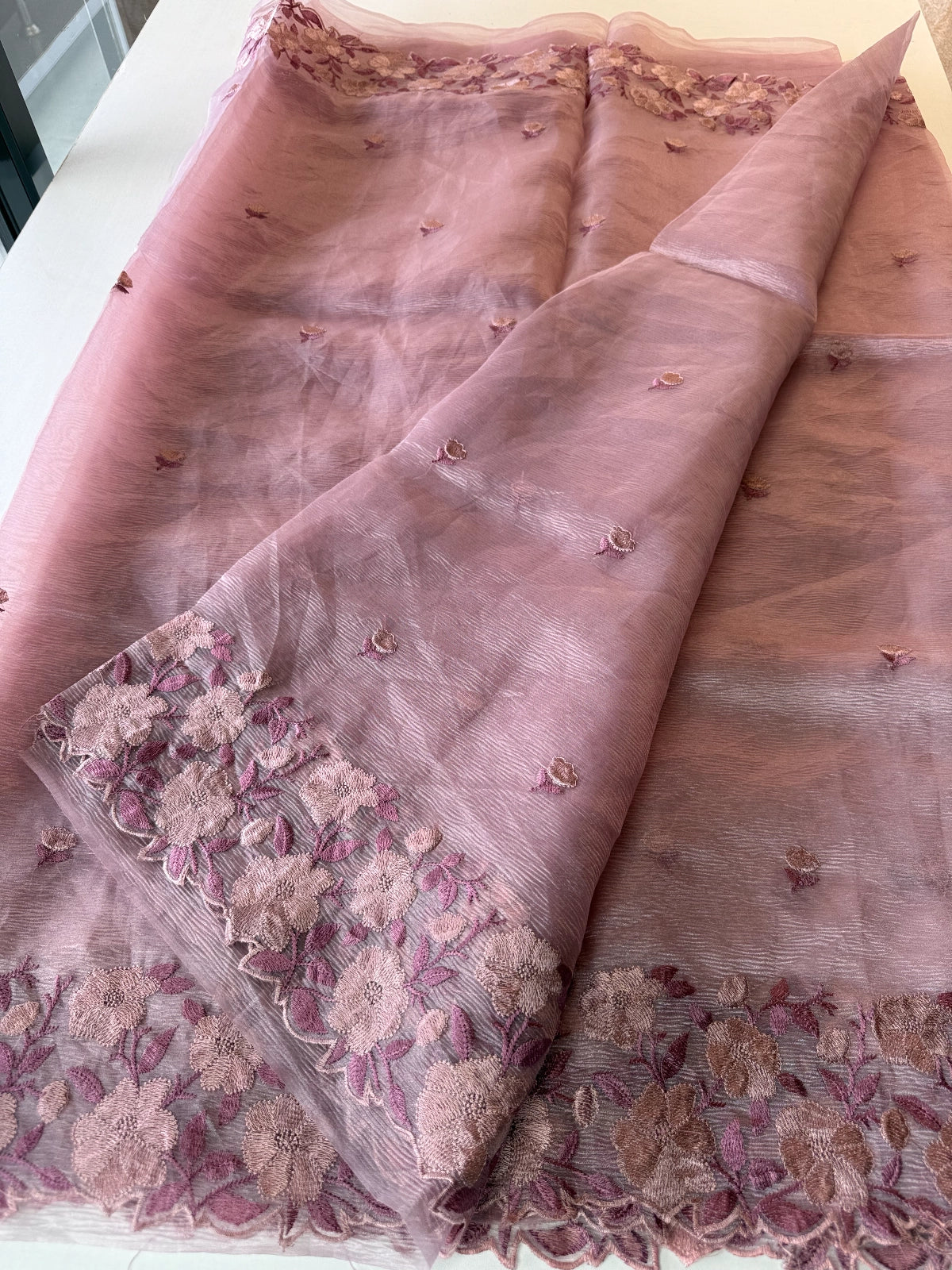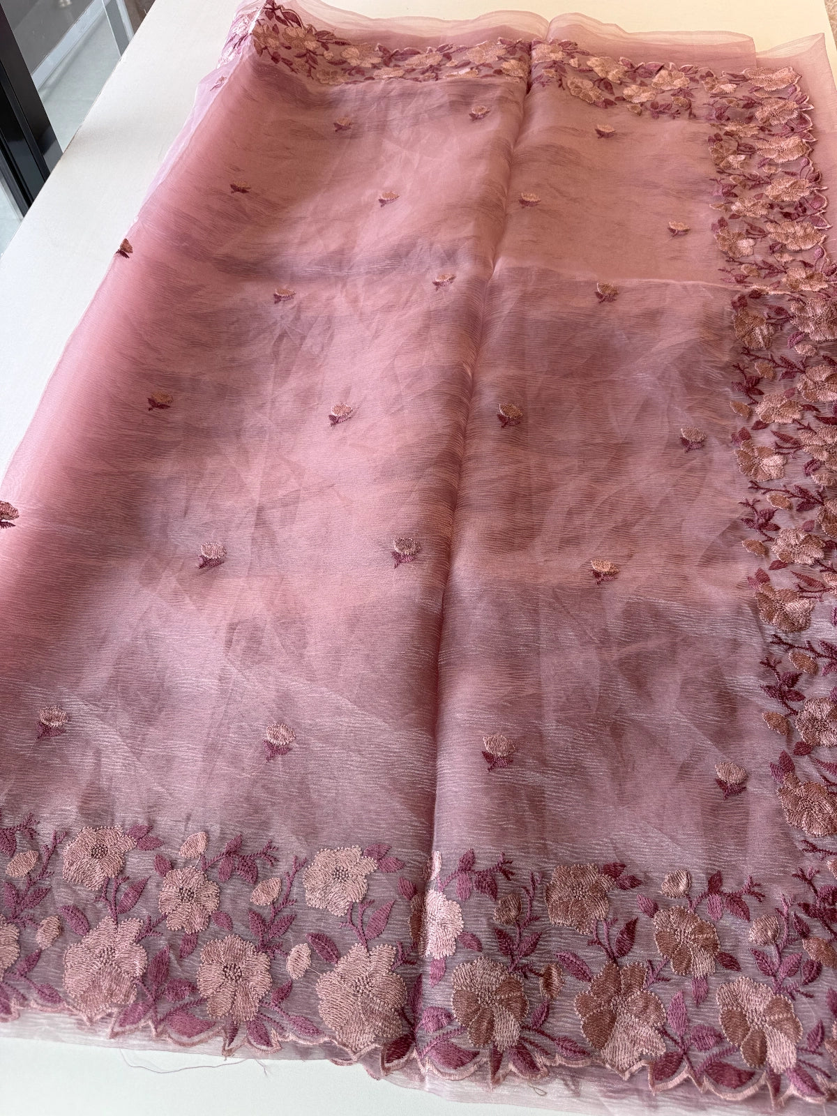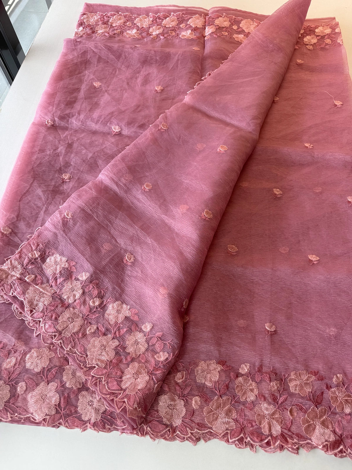 Crushed Tissue Saree – Crafted in elegant crushed tissue fabric available in a range of colors. The saree features a finely detailed threadwork border and comes with a matching running blouse piece adorned with sleeve and border work. Medium-stiff with a slight transparency, it drapes beautifully, giving a very classy look. Perfect choice for party wear and one of our hot-selling collections.