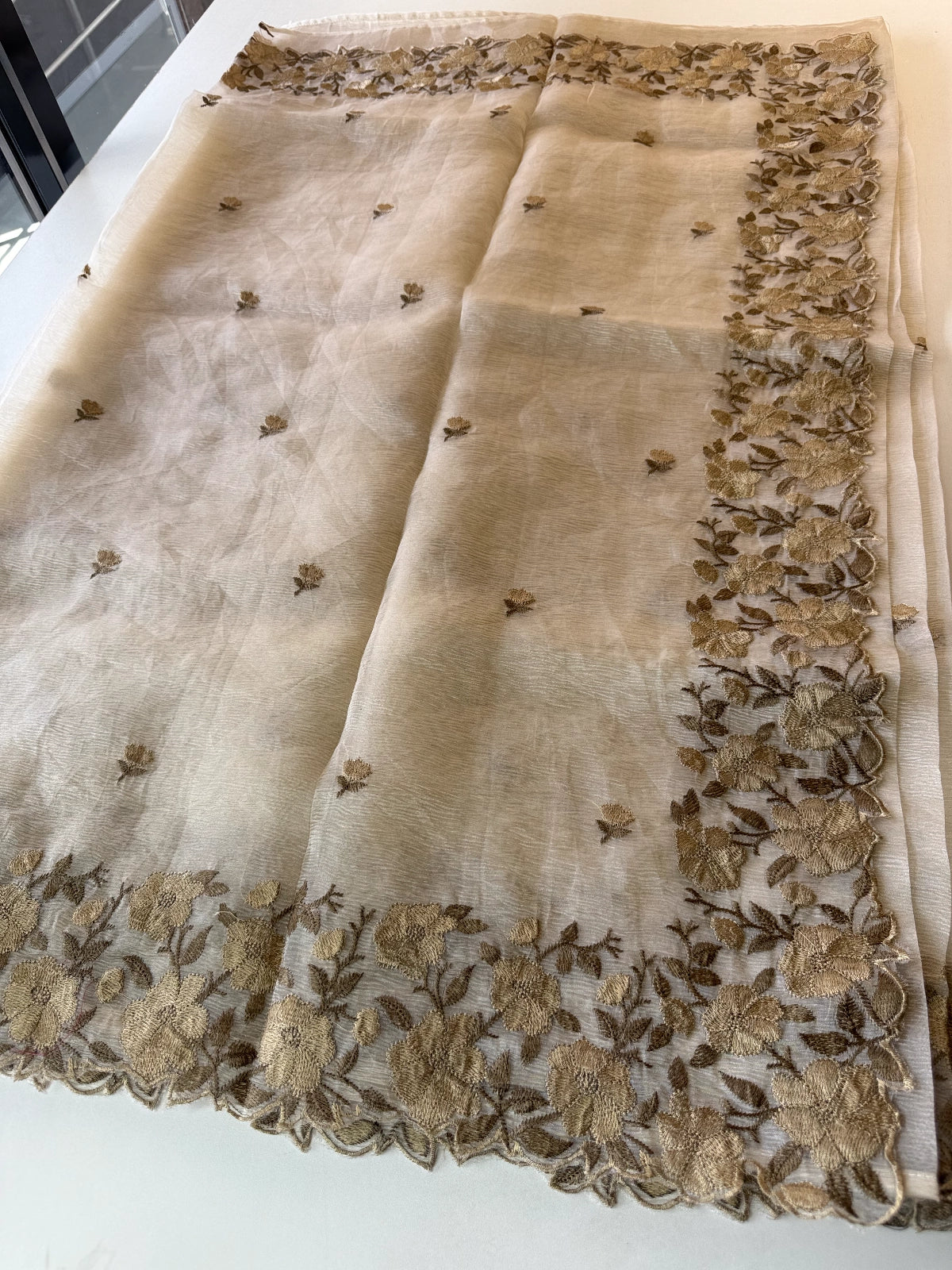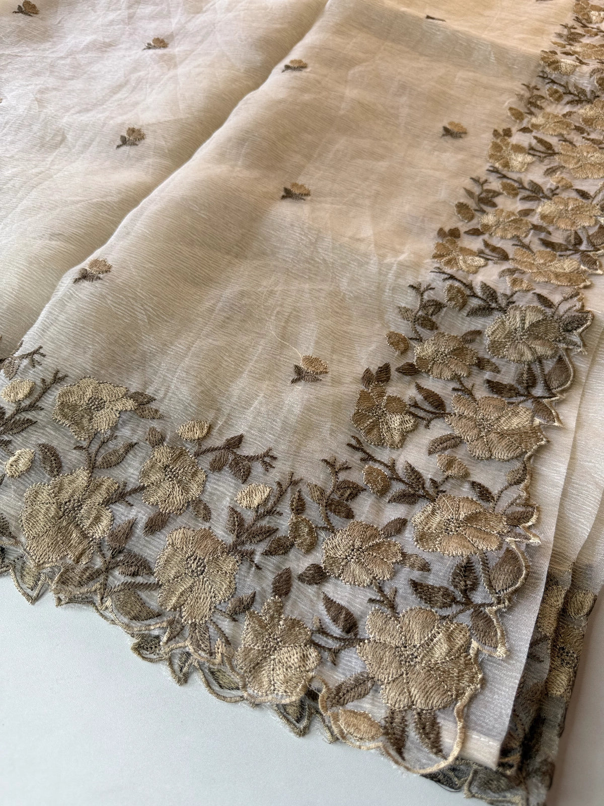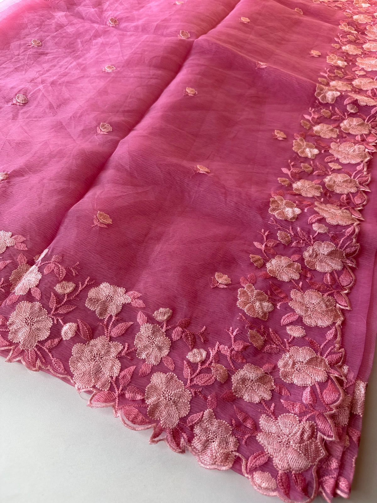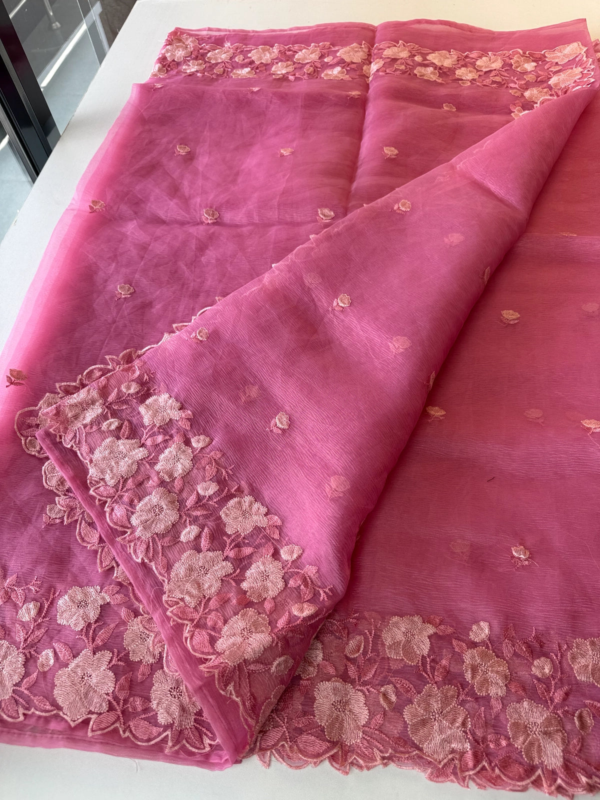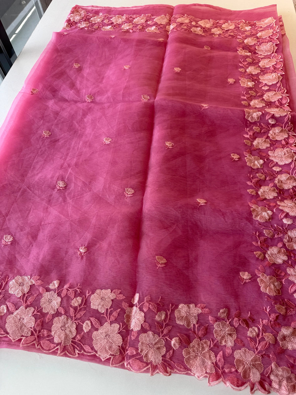 Crushed Tissue Saree – Crafted in elegant crushed tissue fabric available in a range of colors. The saree features a finely detailed threadwork border and comes with a matching running blouse piece adorned with sleeve and border work. Medium-stiff with a slight transparency, it drapes beautifully, giving a very classy look. Perfect choice for party wear and one of our hot-selling collections.