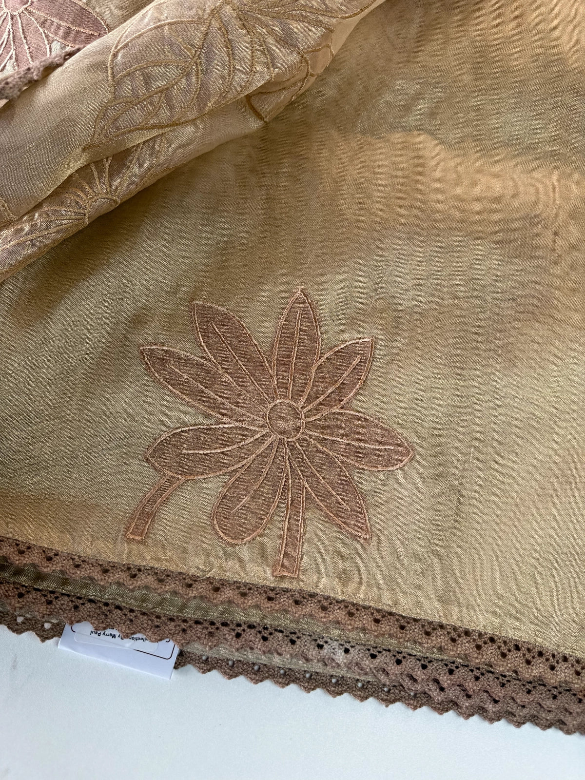 Tissue saree with appliqué worked floral design through out saree ,comes with running blouse piece with sleeve end work with matching crochet boarder .