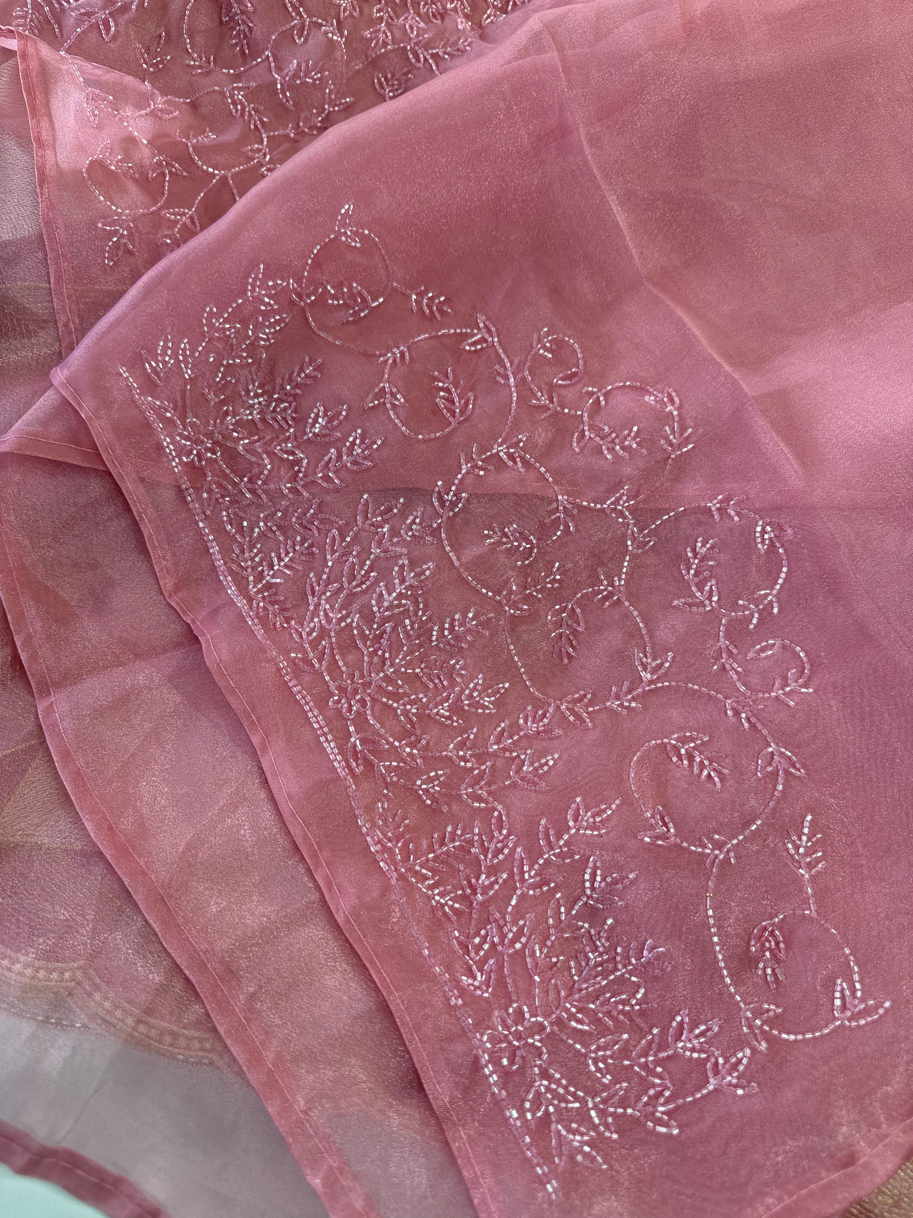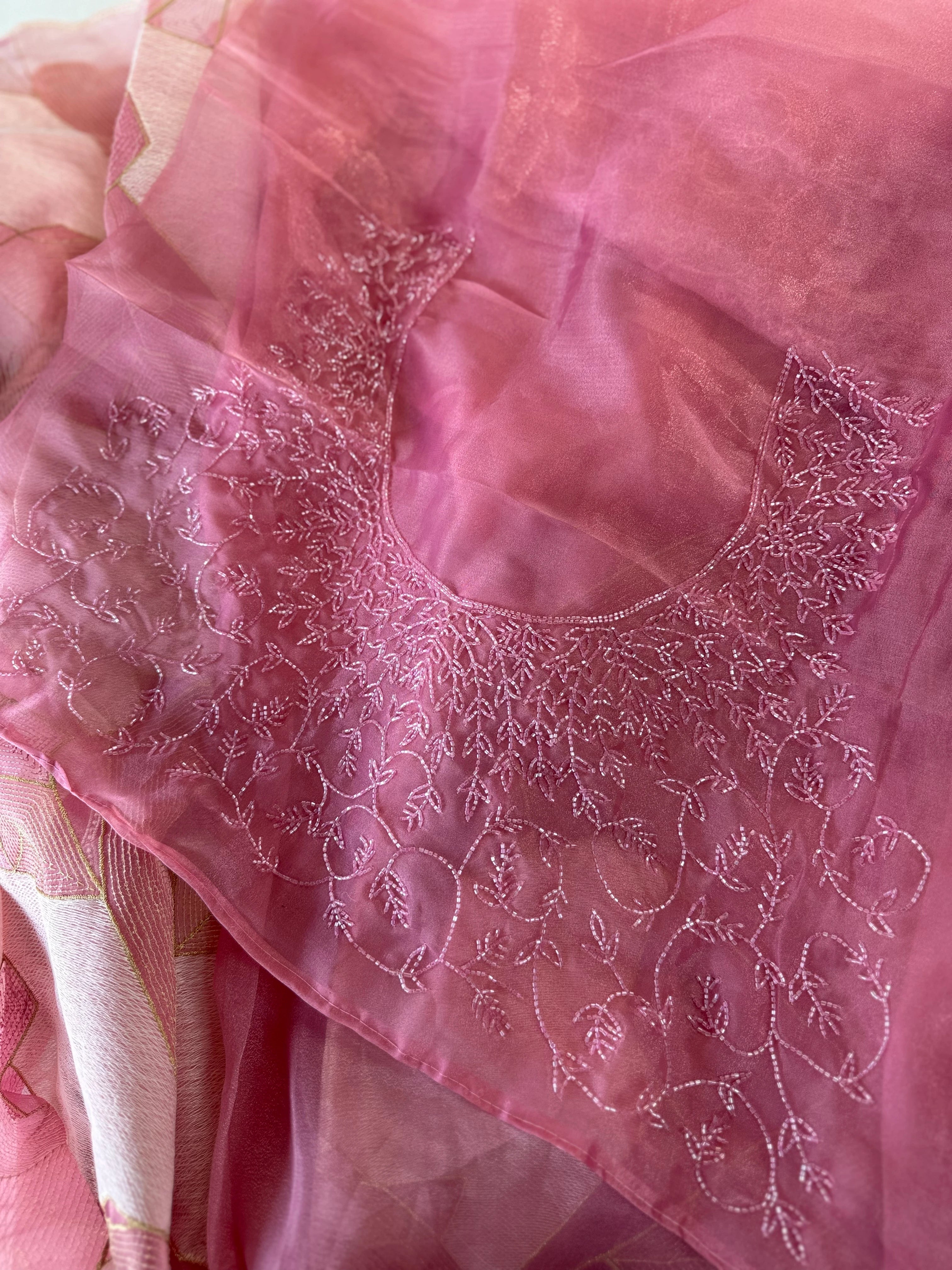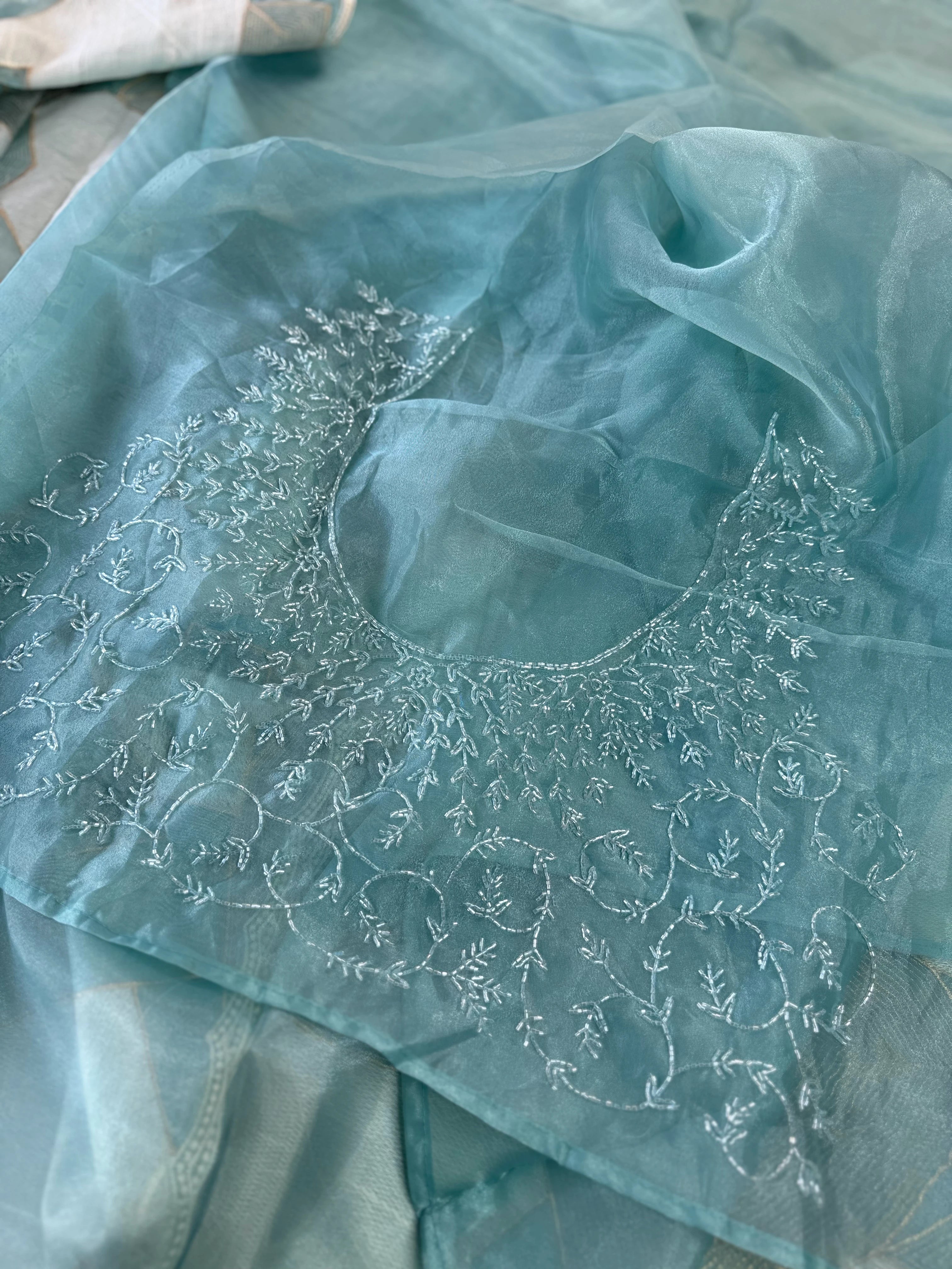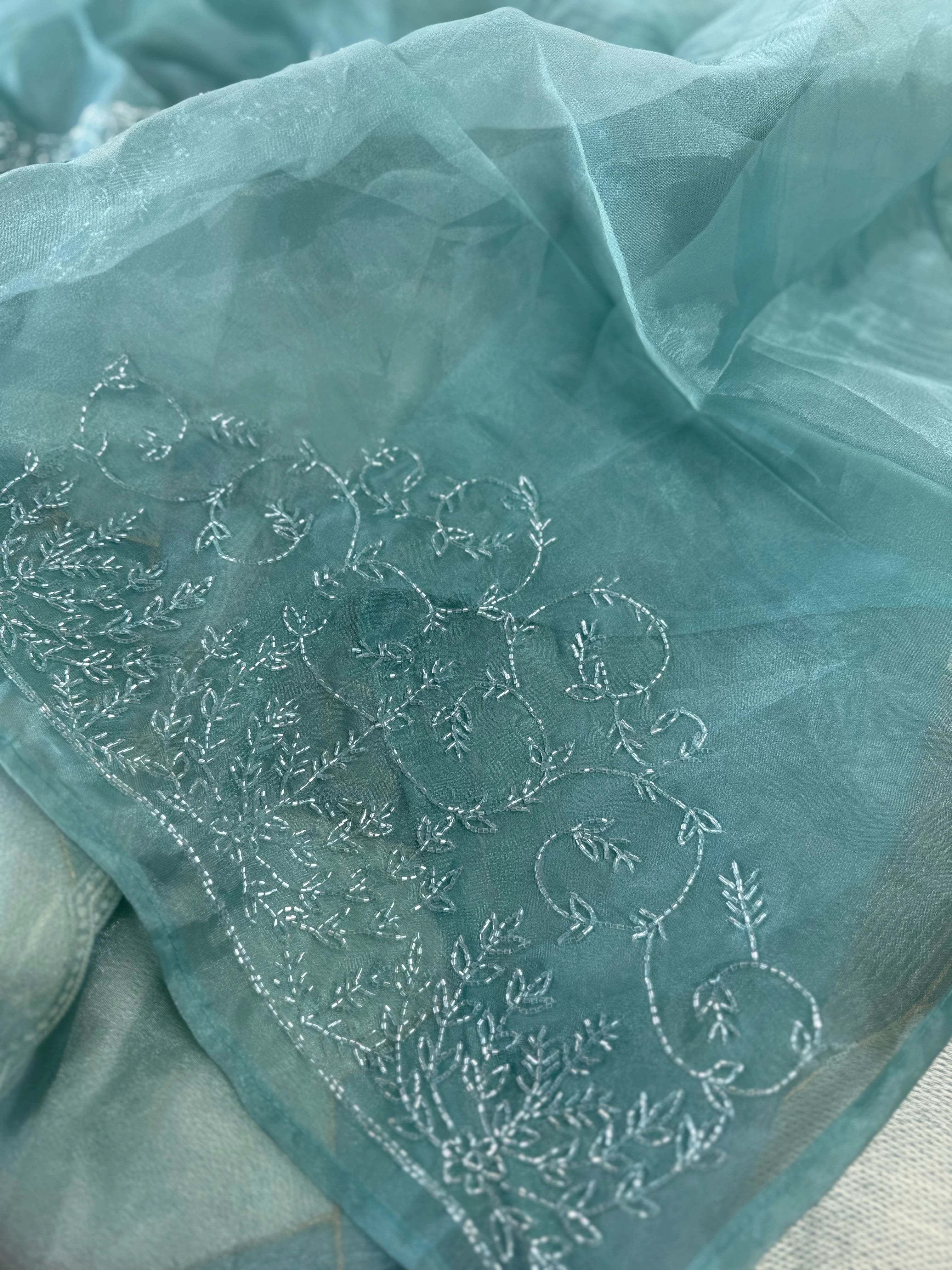 A beautiful shimmered soft organza saree featuring full-body threadwork that gracefully resembles the look of Turkish organza while keeping its own soft, lightweight charm. The intricate weaving adds a subtle shine and texture, complemented by a delicate scallop-detailed border. It comes with heavy hand worked blouse piece, making it easy to style for any party or occasion.