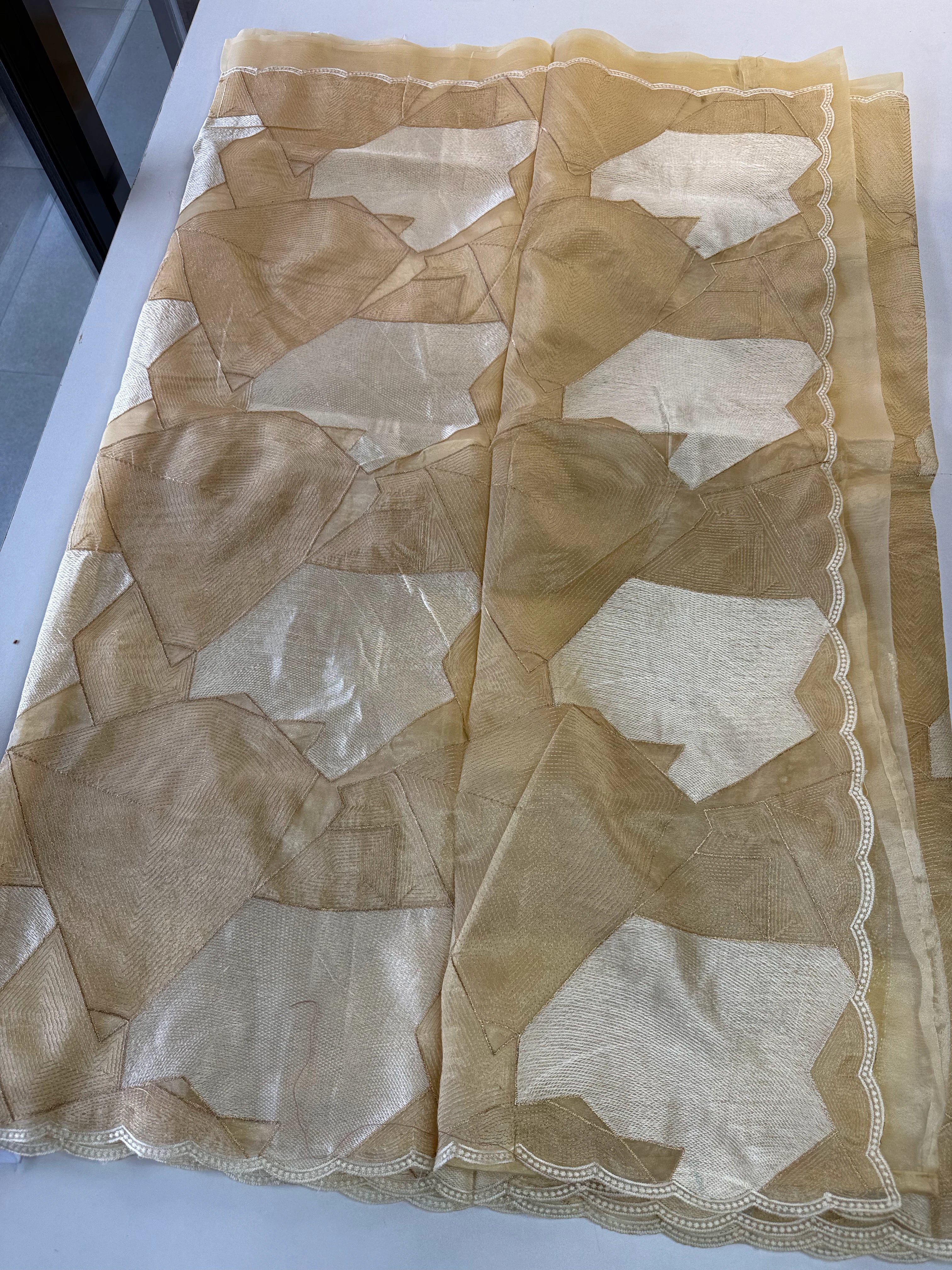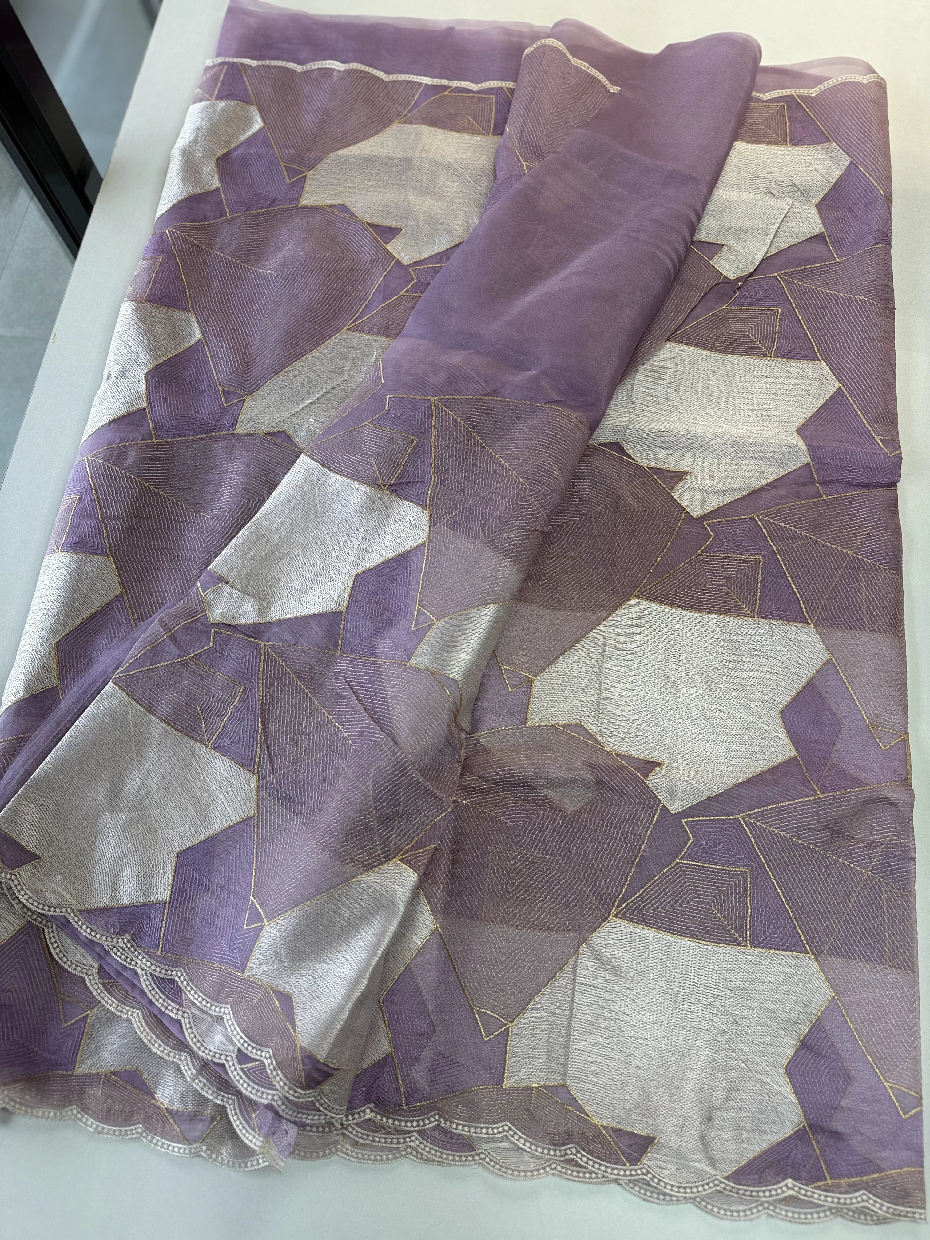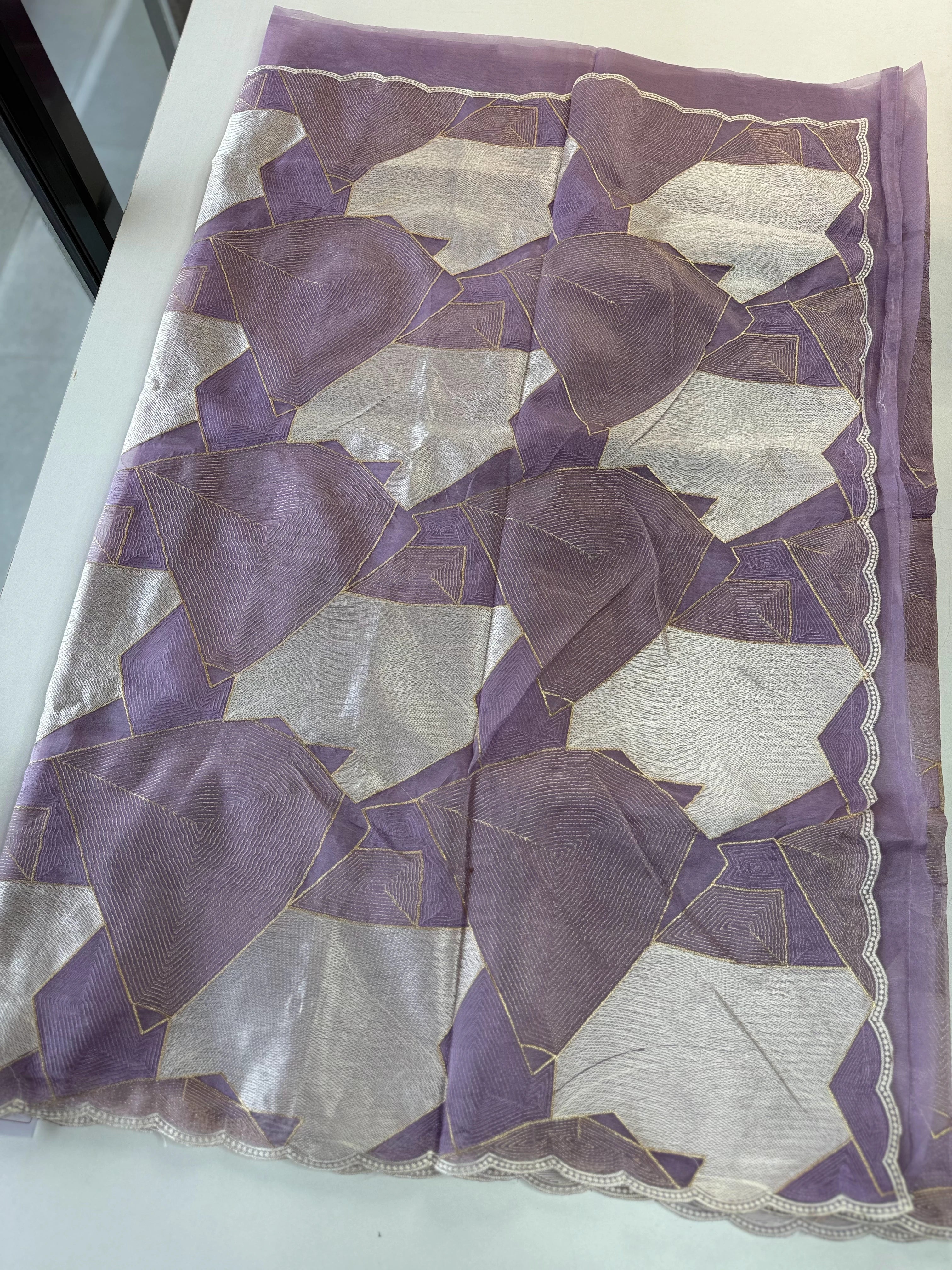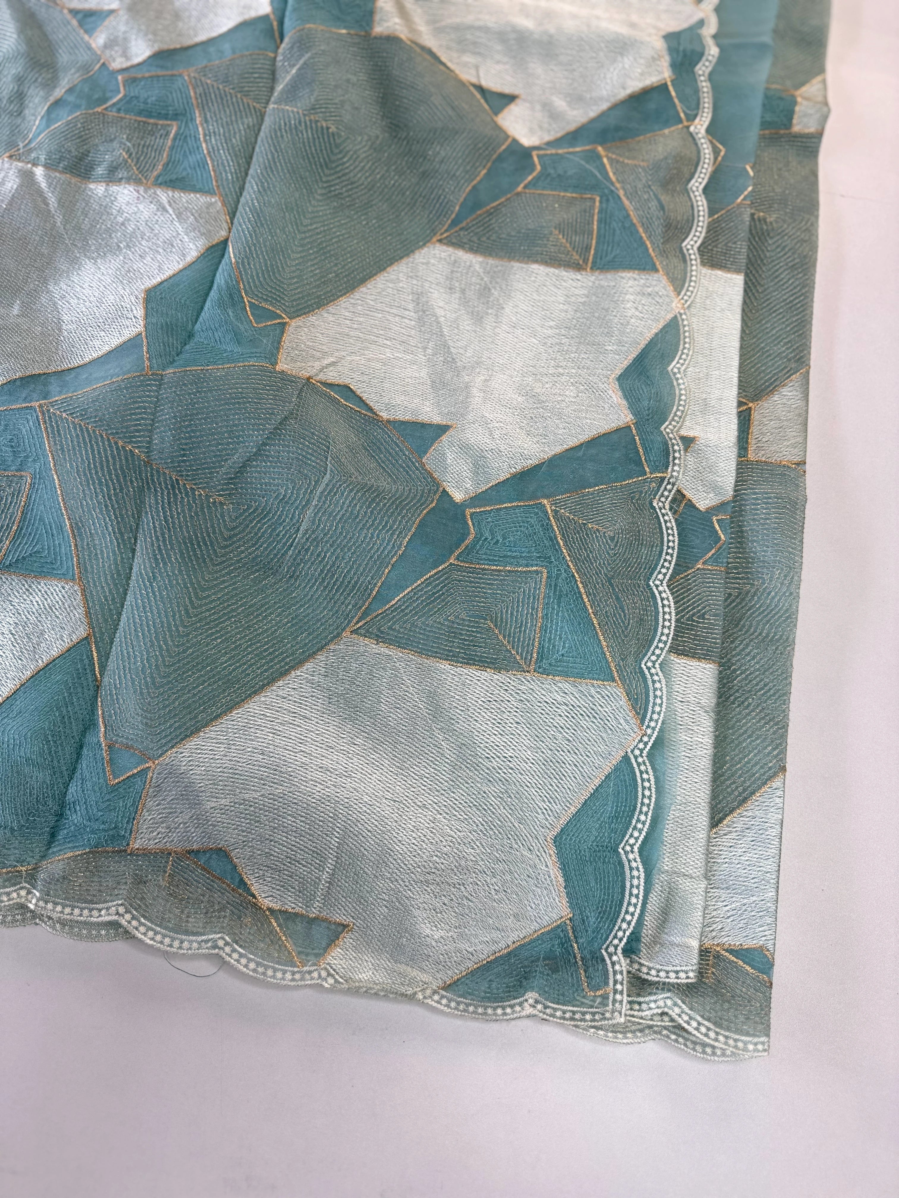 A beautiful shimmered soft organza saree featuring full-body threadwork that gracefully resembles the look of Turkish organza while keeping its own soft, lightweight charm. The intricate weaving adds a subtle shine and texture, complemented by a delicate scallop-detailed border. It comes with heavy hand worked blouse piece, making it easy to style for any party or occasion.