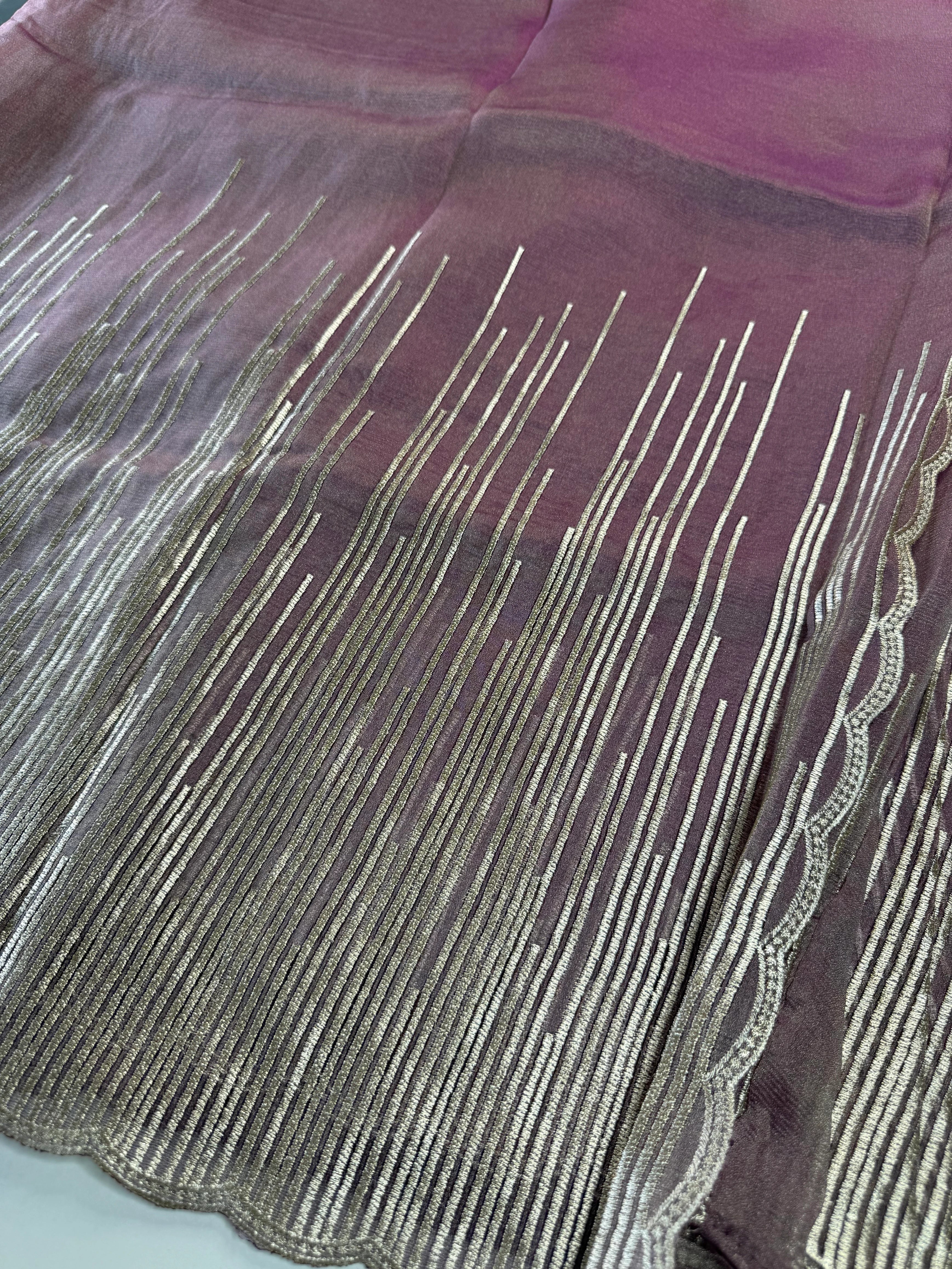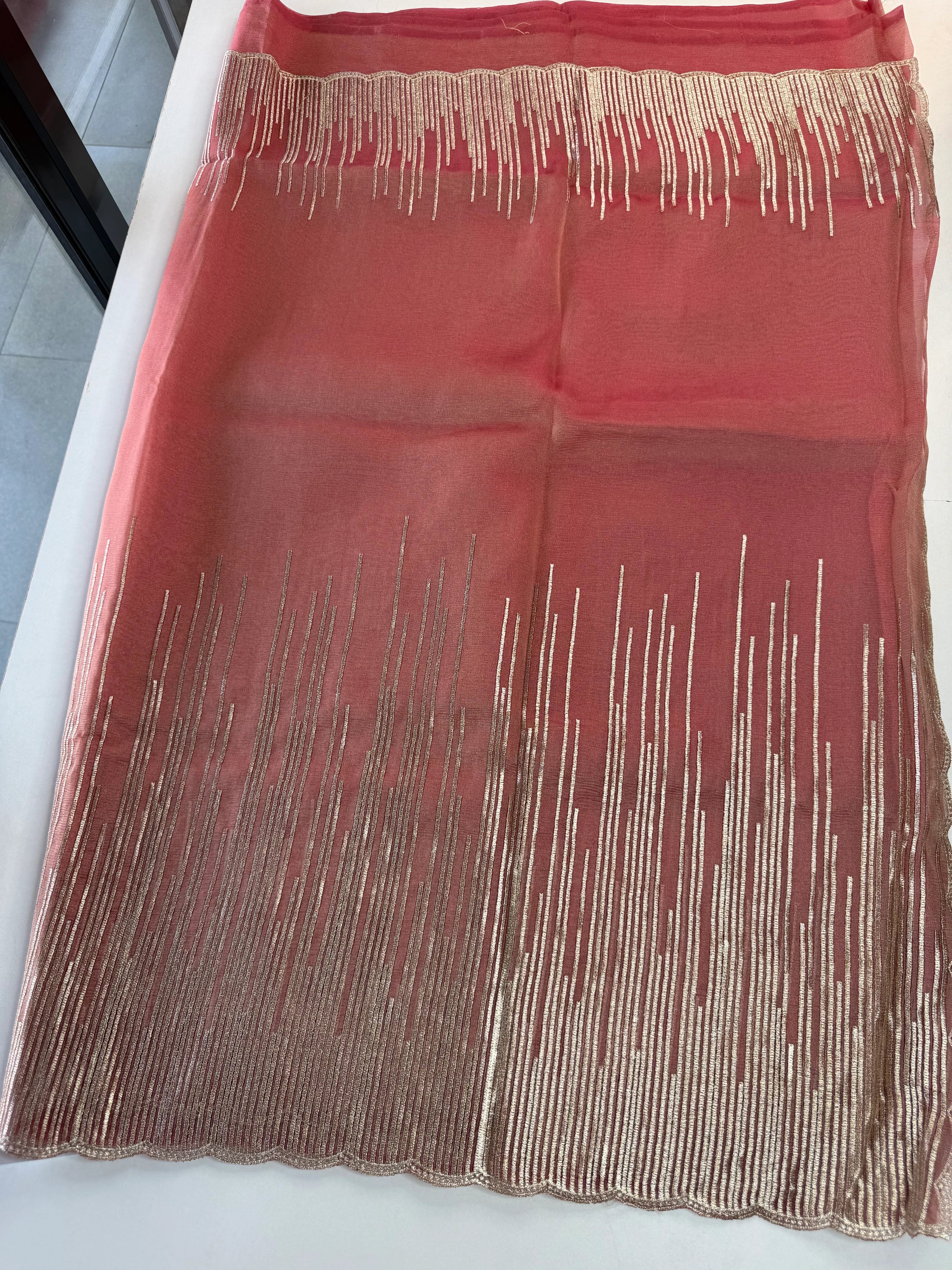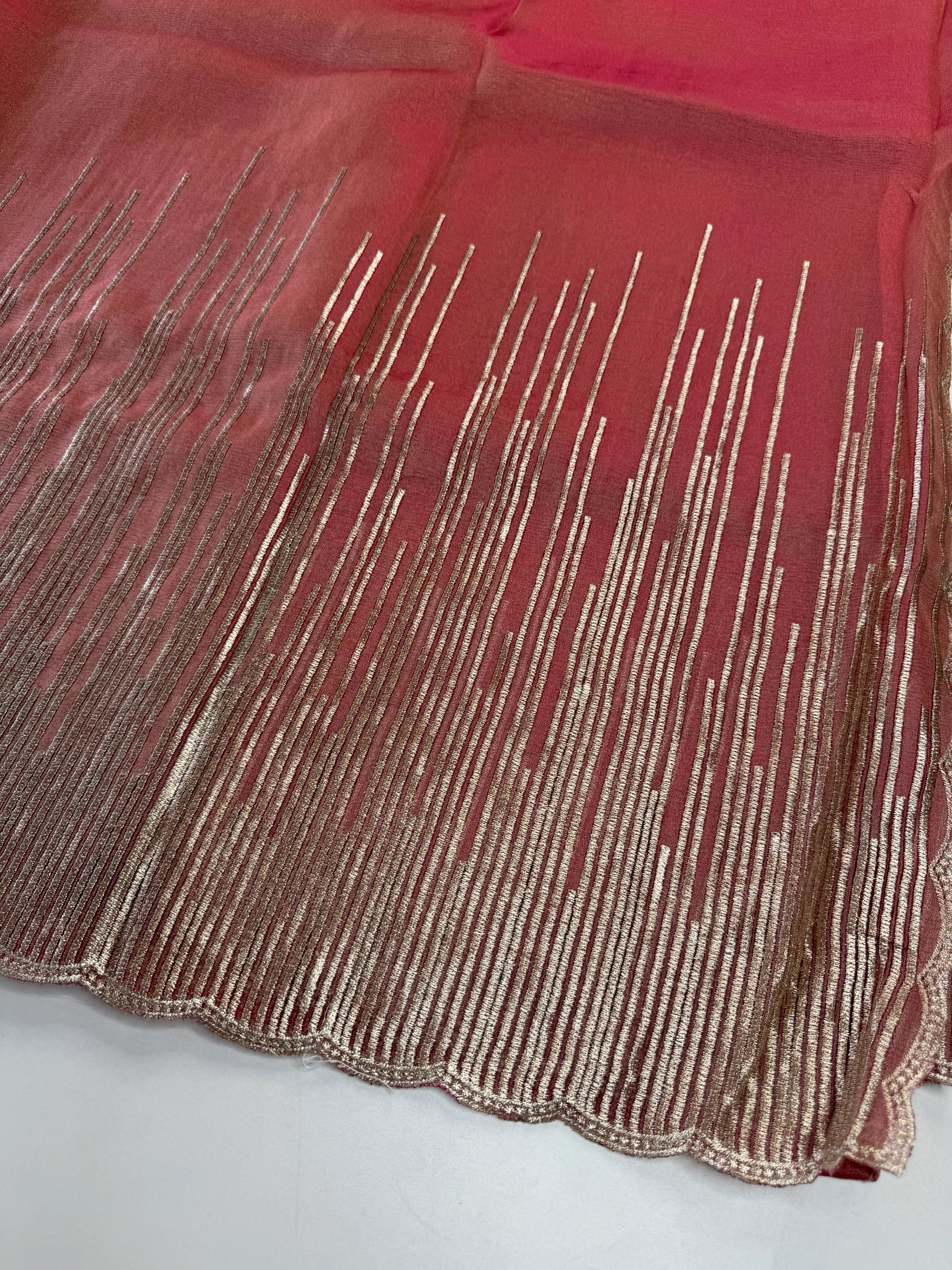Elevate your festive and party wardrobe with this fancy shimmer georgette saree, designed to make a graceful statement. Crafted in flowy shimmer georgette fabric, this saree features a beautifully detailed Geri-style thread worked border with a scalloped finish, adding a refined and contemporary touch.