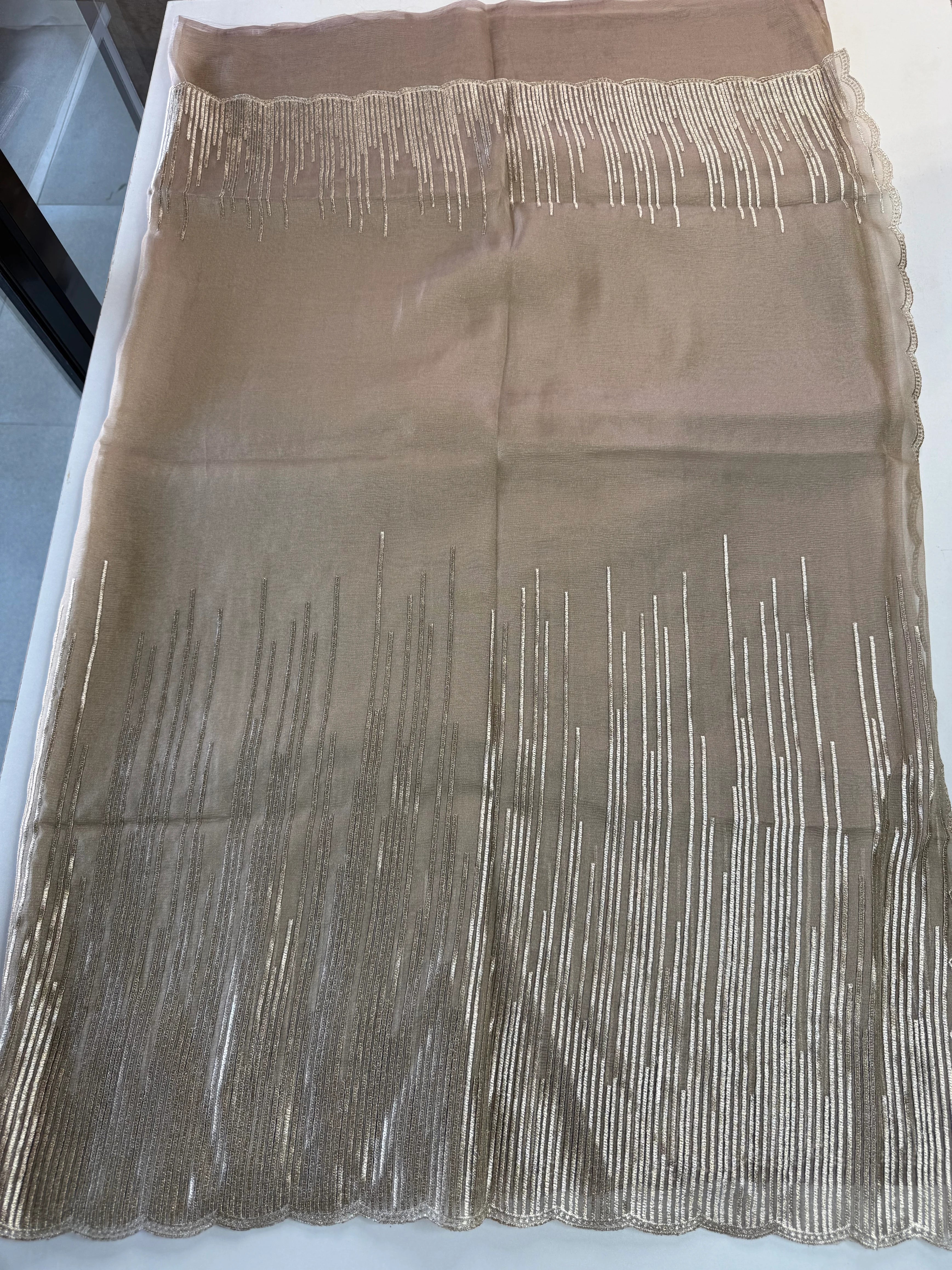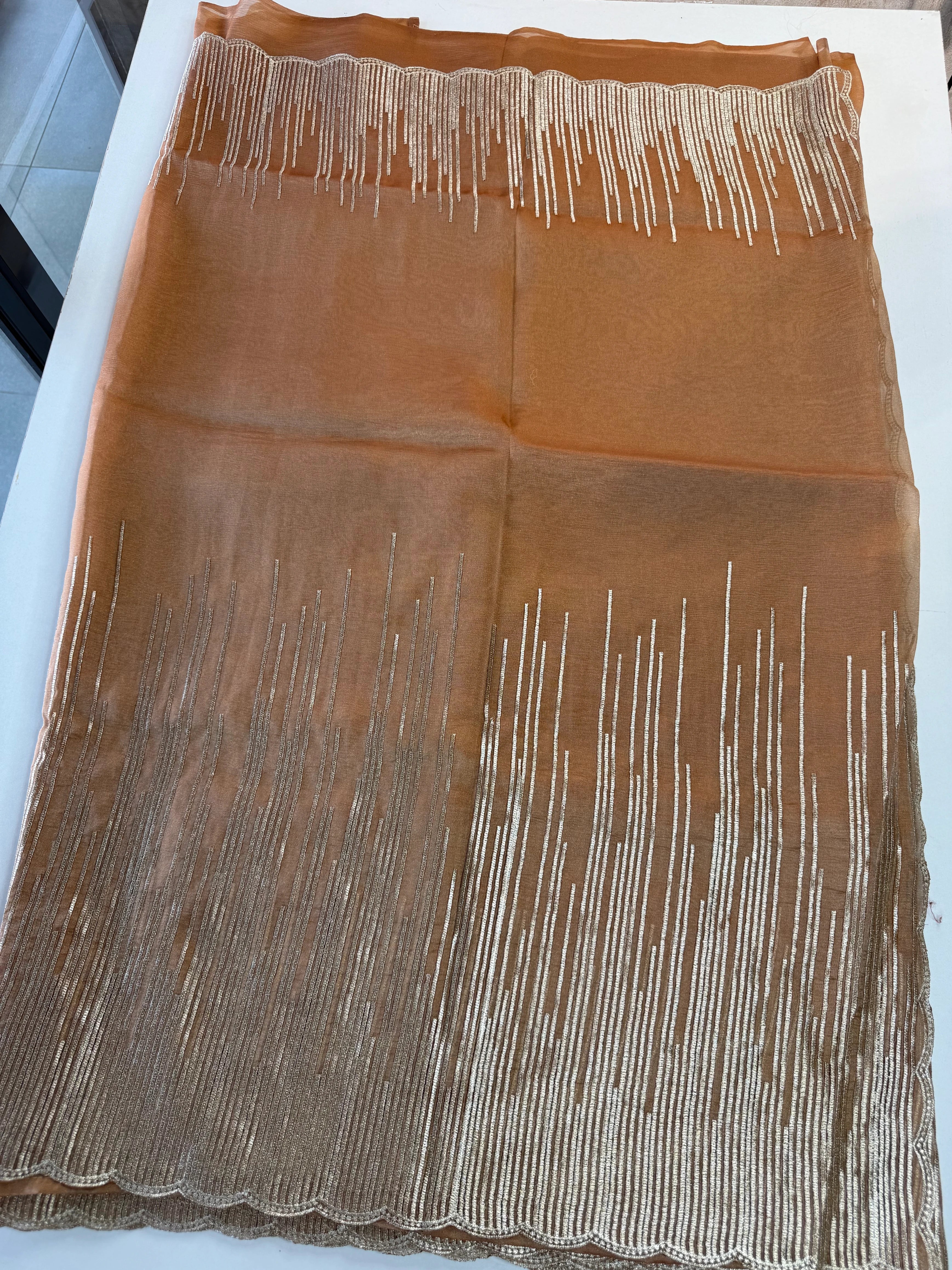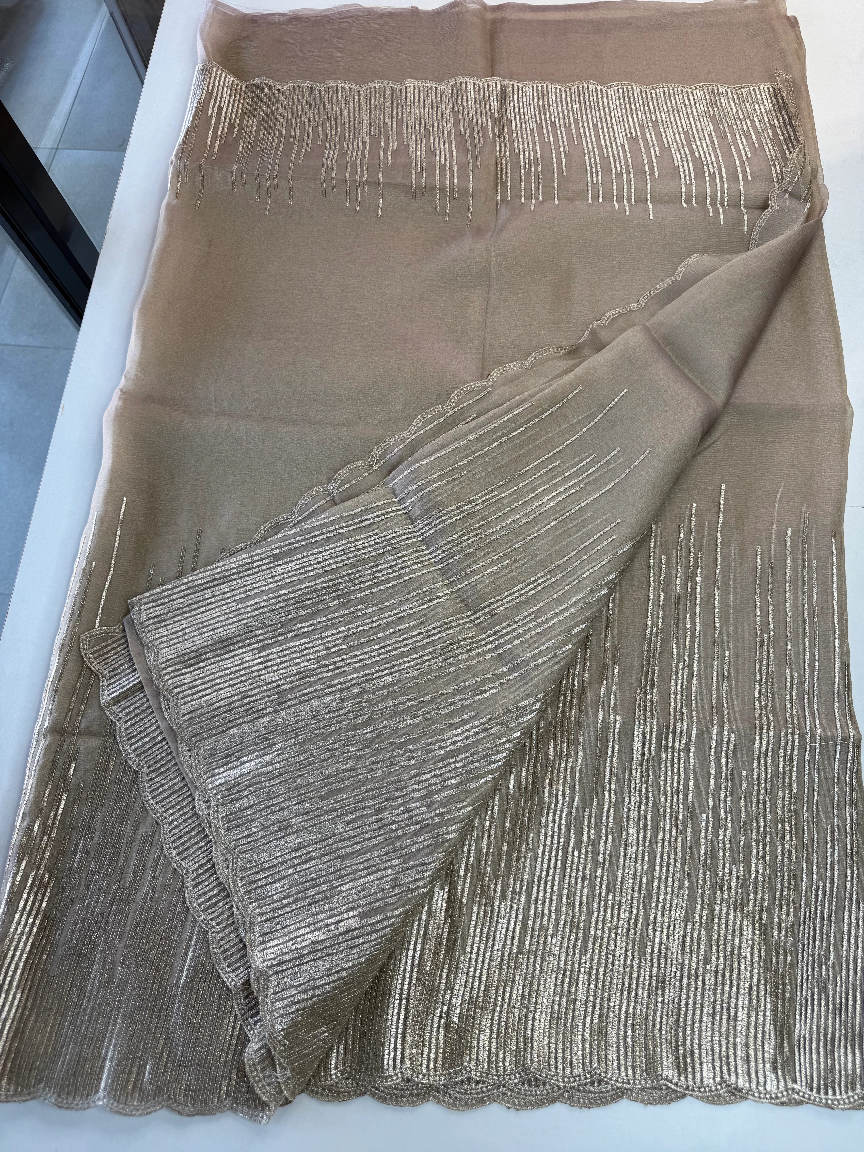 Elevate your festive and party wardrobe with this fancy shimmer georgette saree, designed to make a graceful statement. Crafted in flowy shimmer georgette fabric, this saree features a beautifully detailed Geri-style thread worked border with a scalloped finish, adding a refined and contemporary touch.