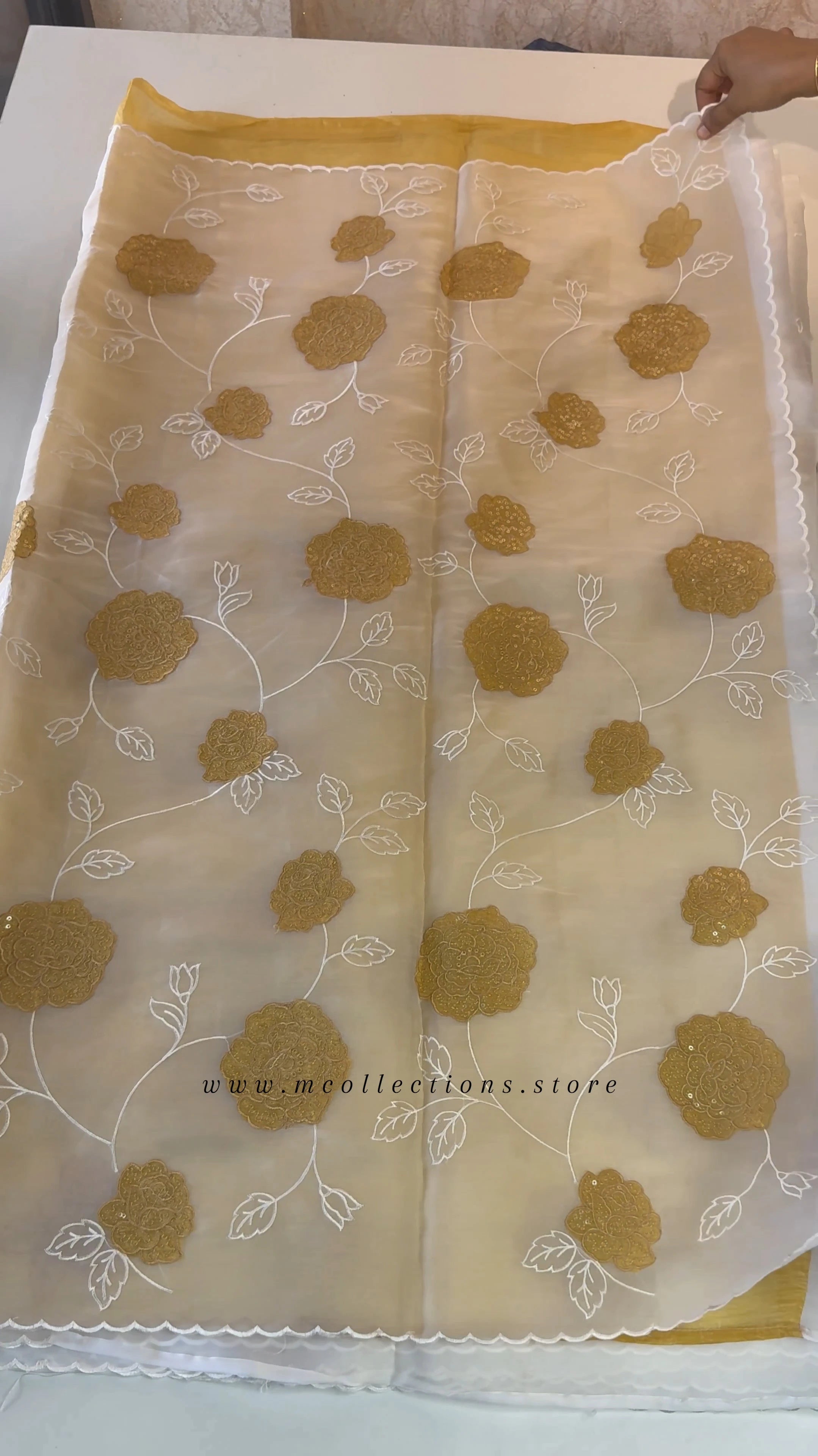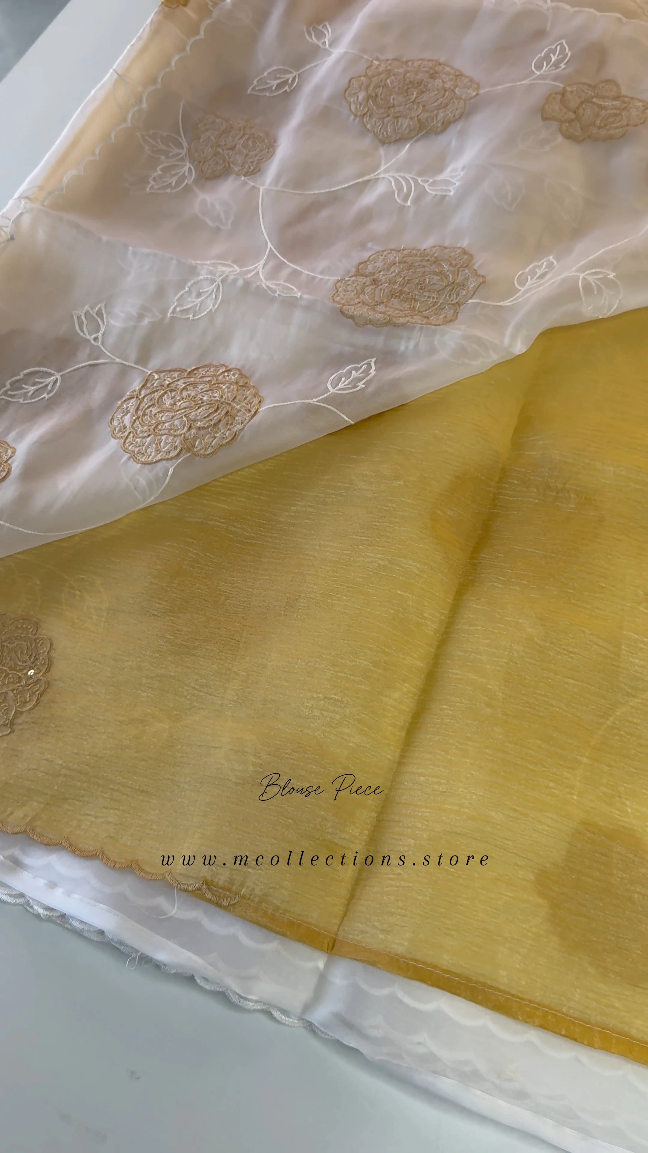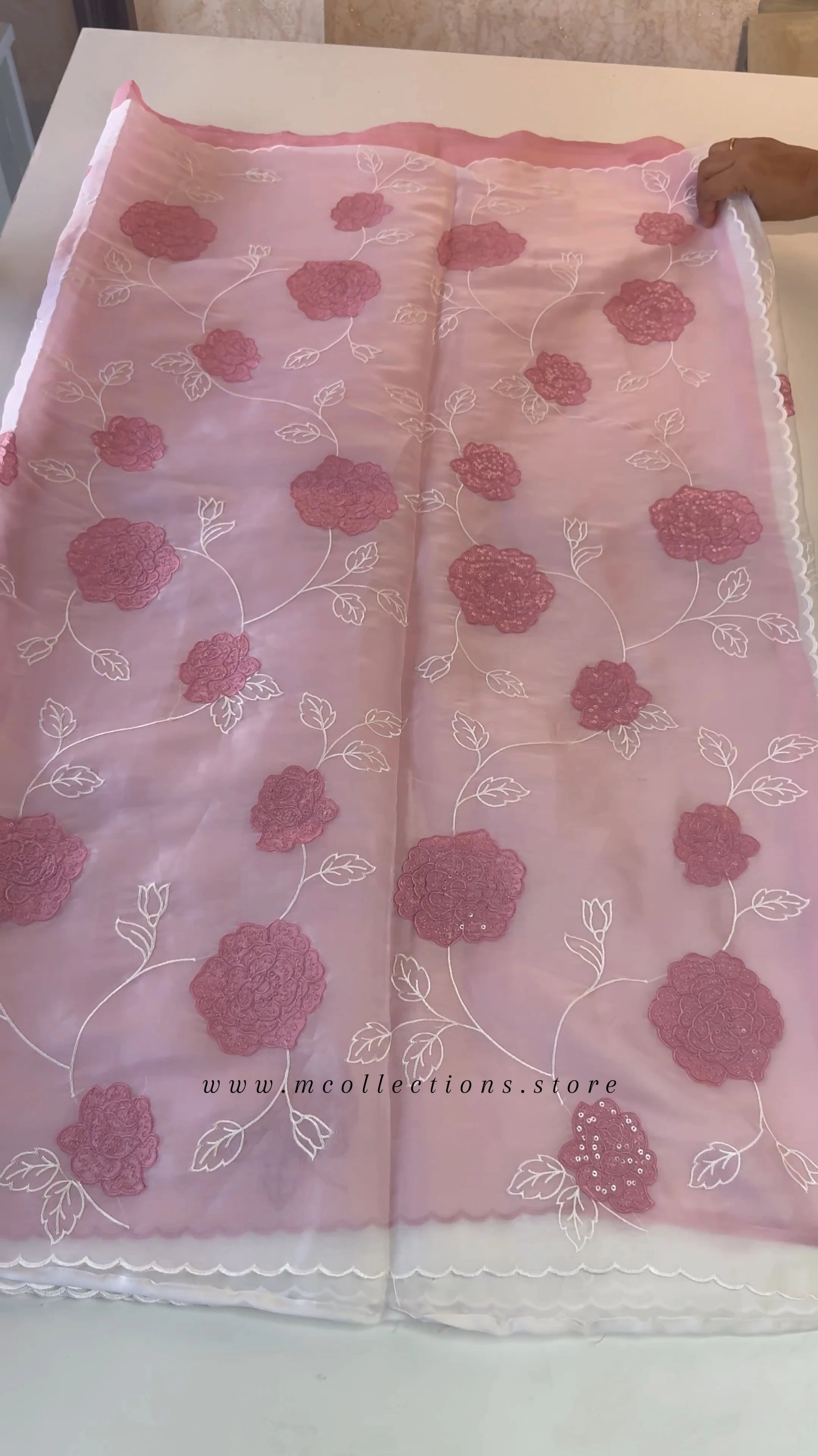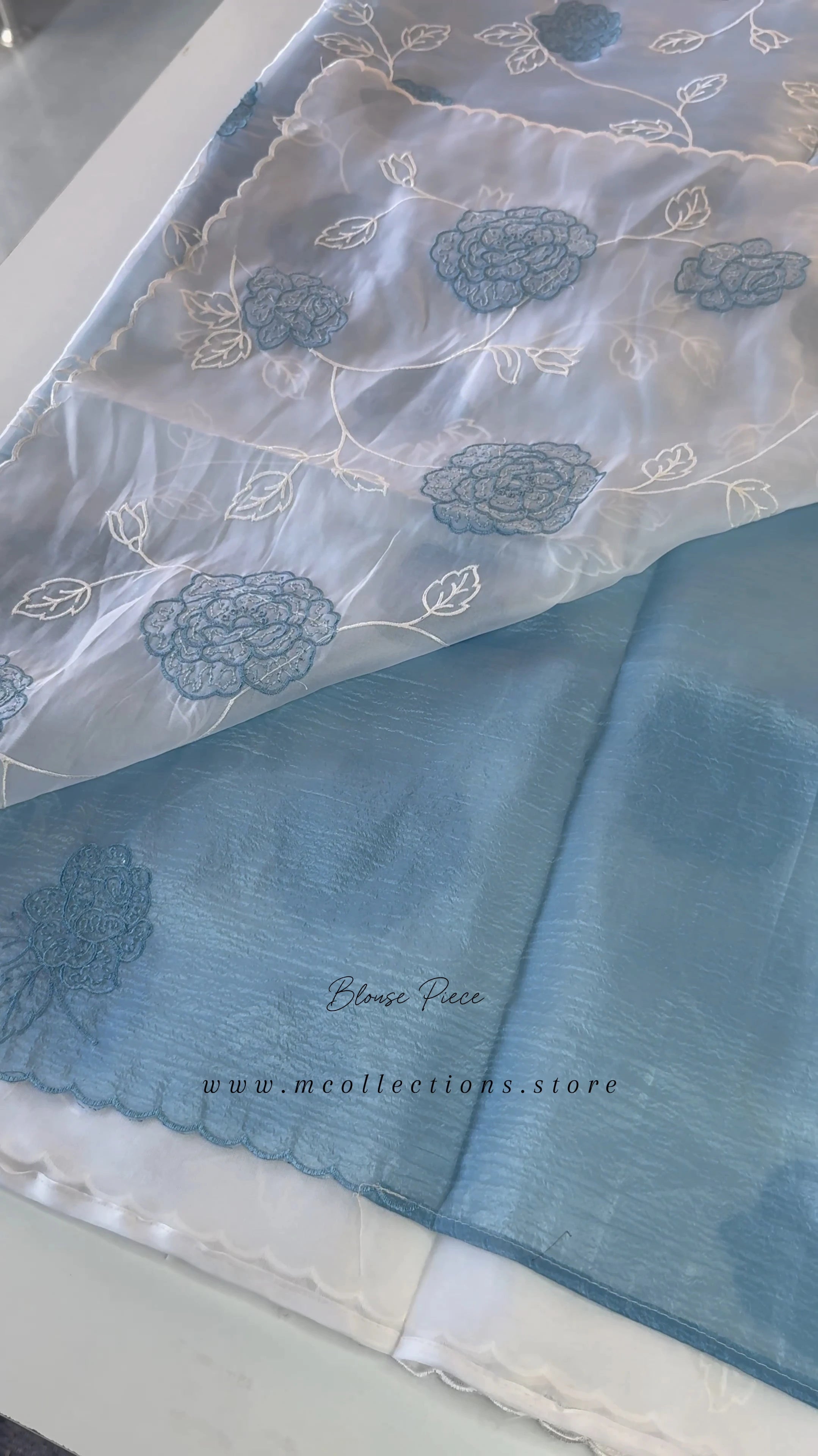 Graceful soft organza saree adorned with appliqué floral patterns delicately highlighted with fine sequin work, adding a subtle shimmer to its elegant drape. The saree comes with a running crushed crepe blouse piece, featuring matching floral appliqué detailing on the sleeve ends for a perfectly coordinated look. The fabric is lightweight, flowy, and mildly sheer, offering a blend of sophistication and comfort — ideal for festive and special occasions.