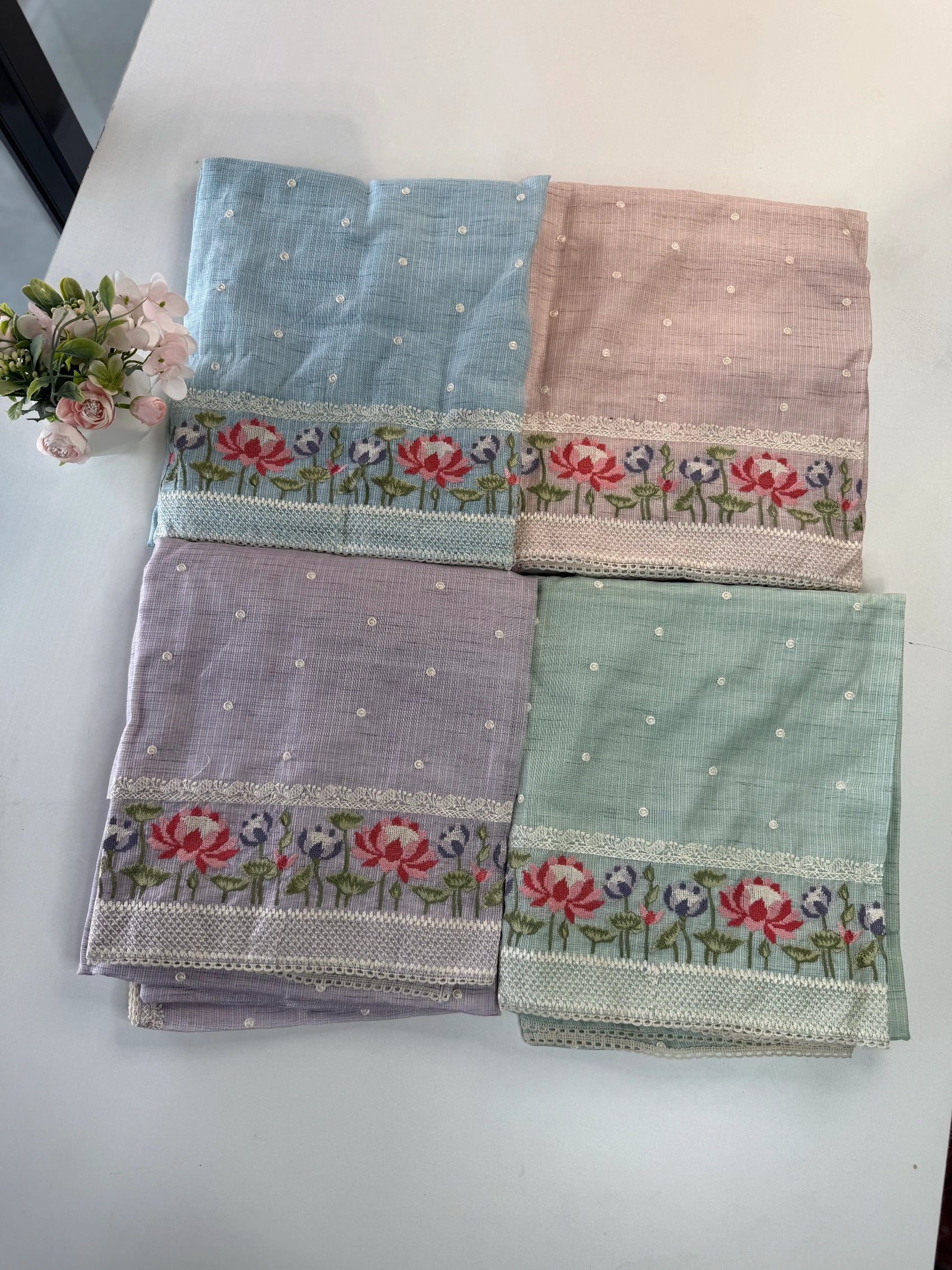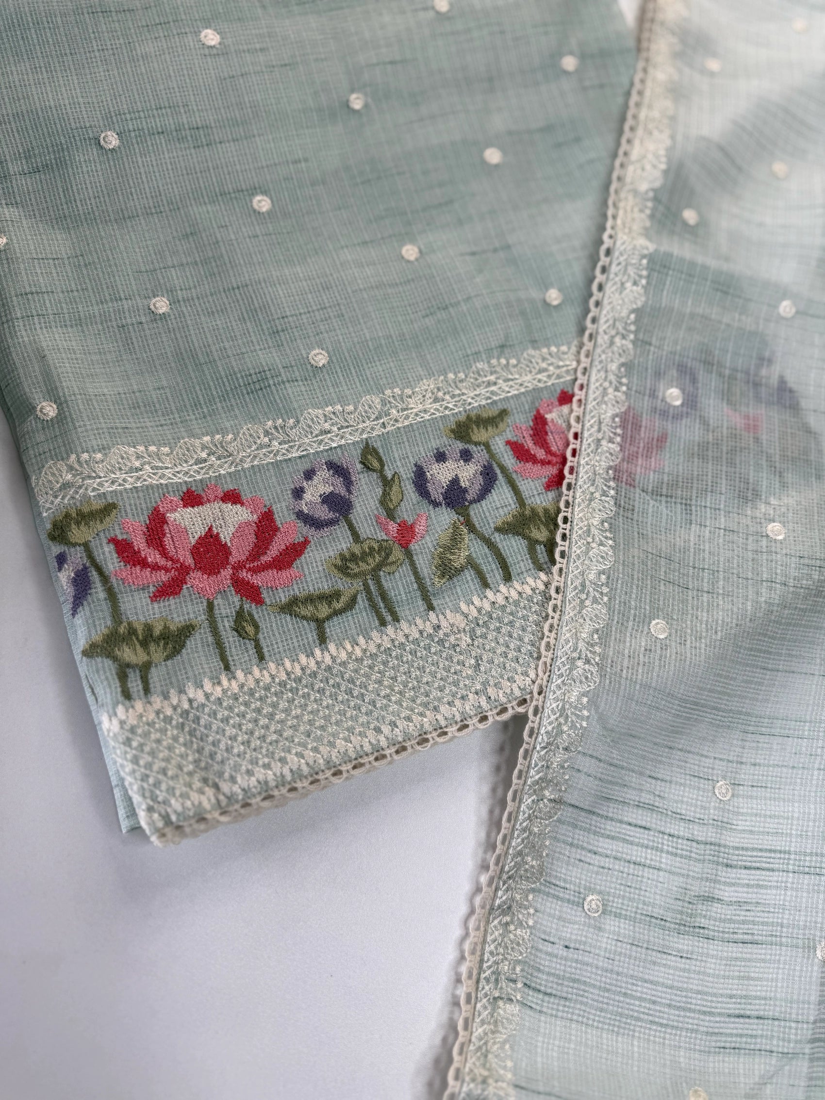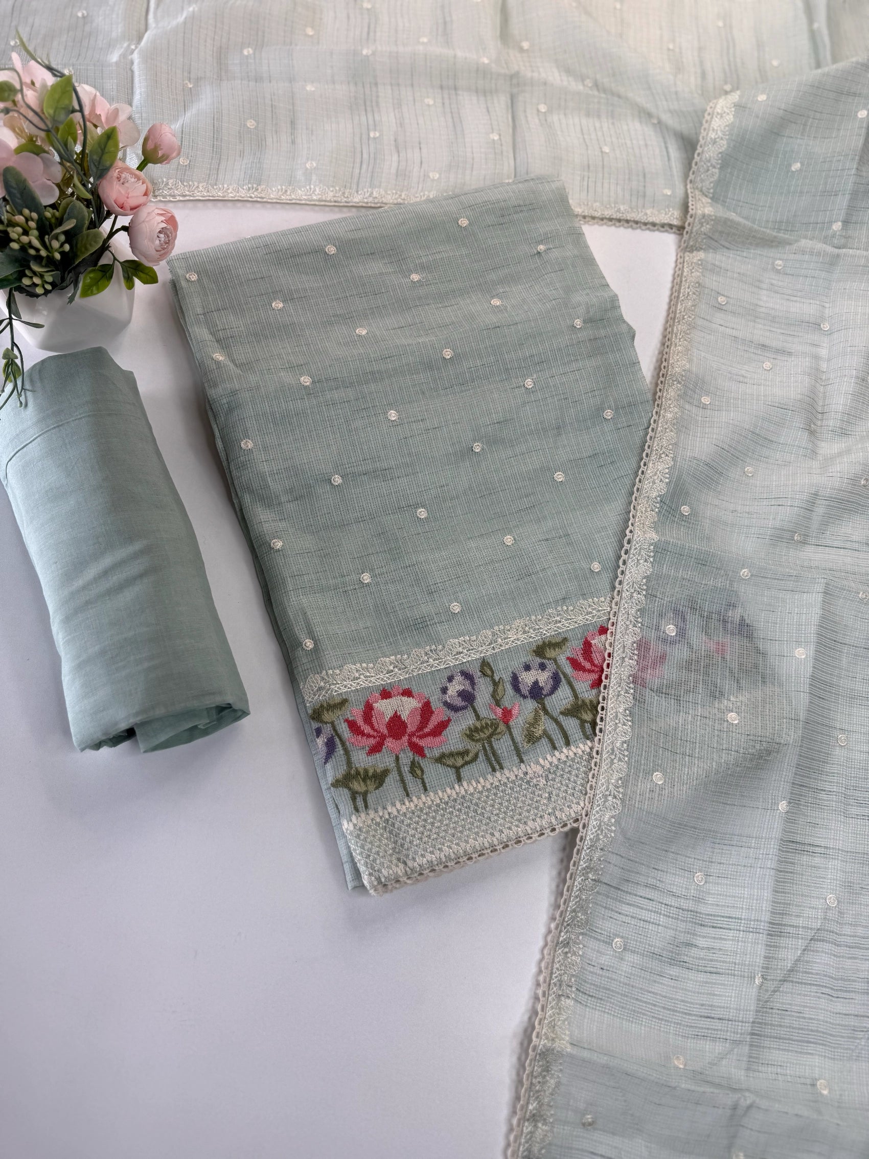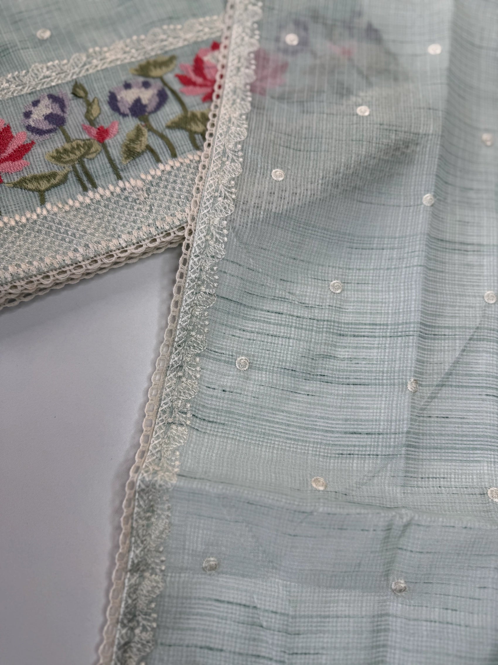 This elegant silky Kota salwar set features a beautifully detailed cross-stitch floral design placed along the bottom top portion, adding a graceful handcrafted touch to the overall look. The body is enhanced with subtle dotted detailing, maintaining a light, airy, and refined appeal.